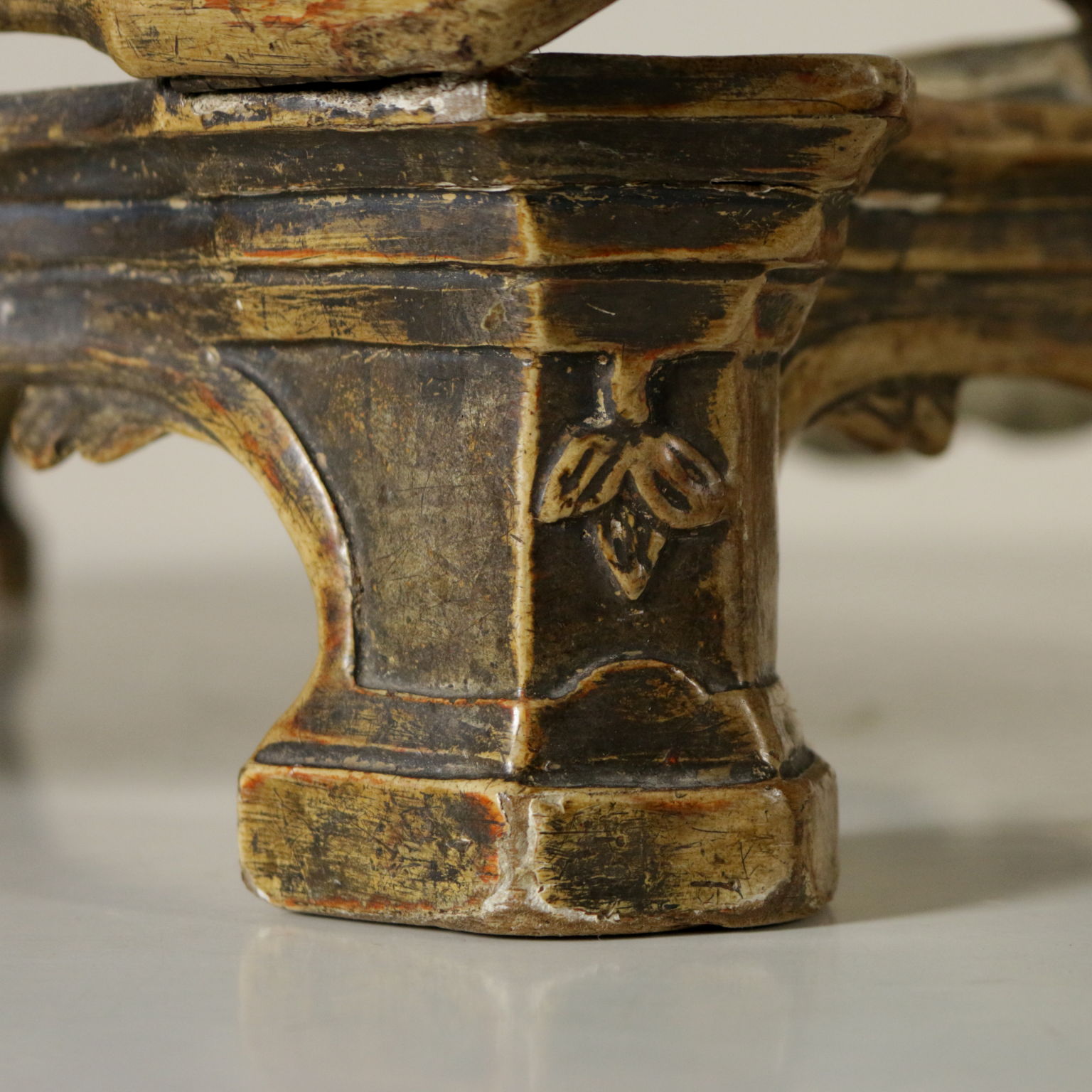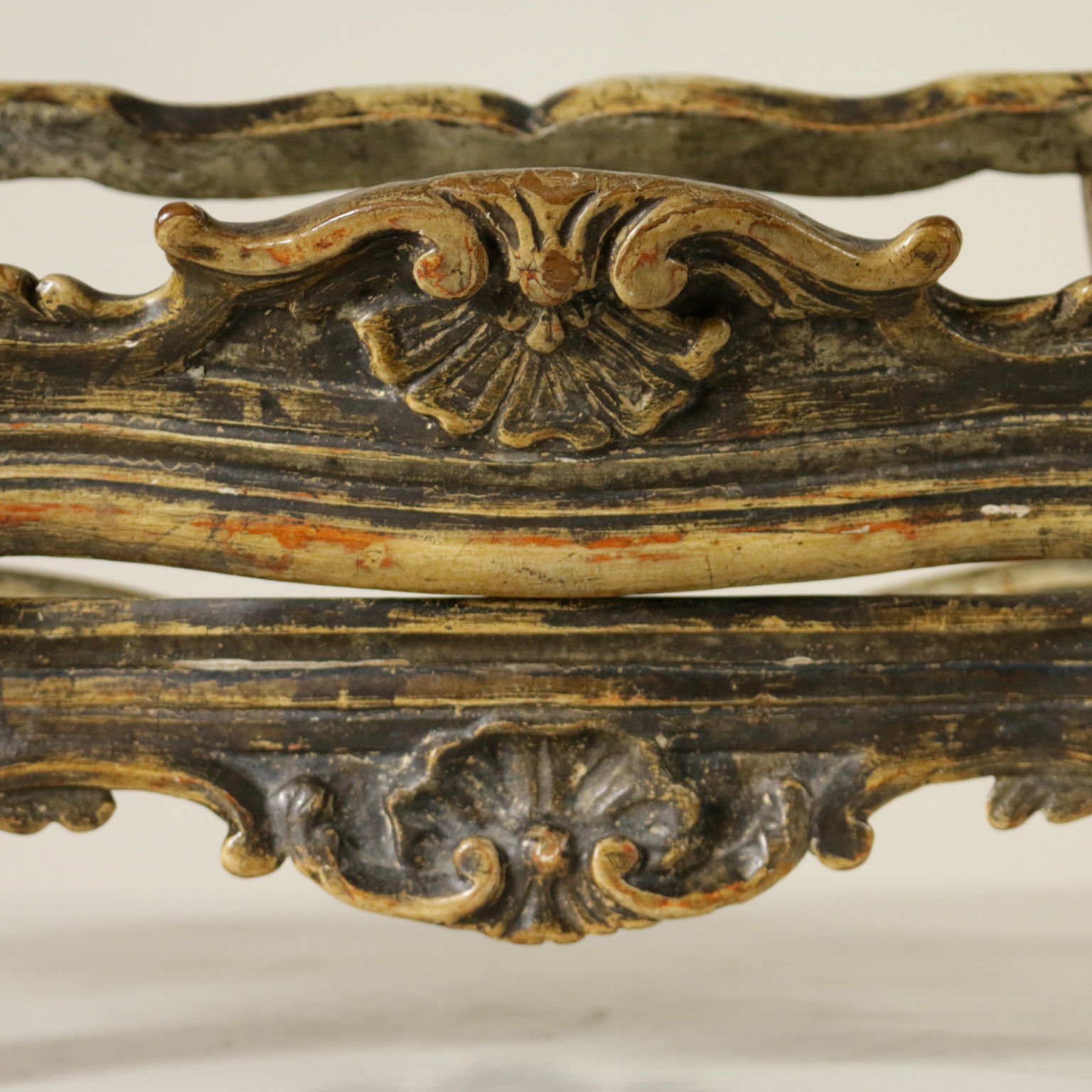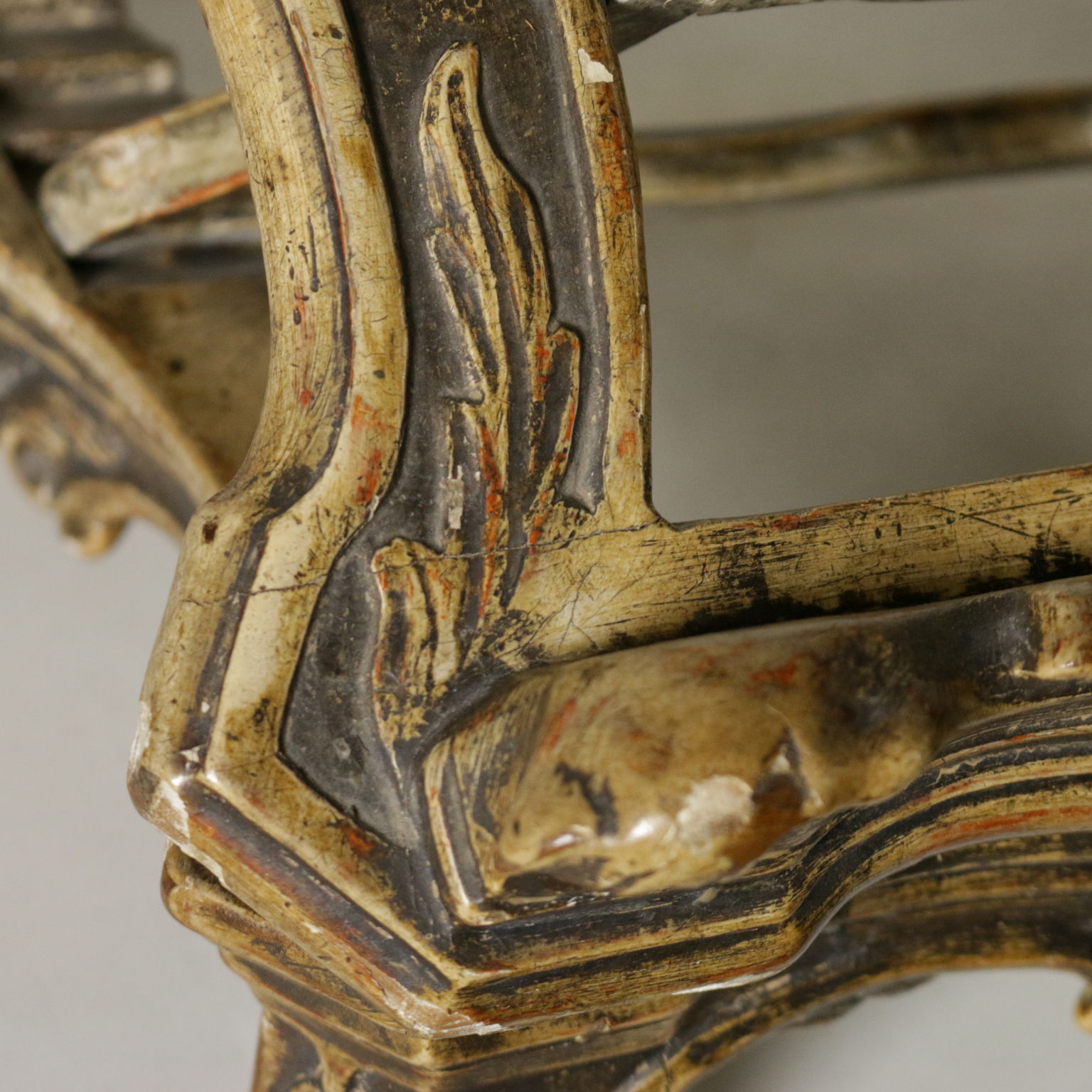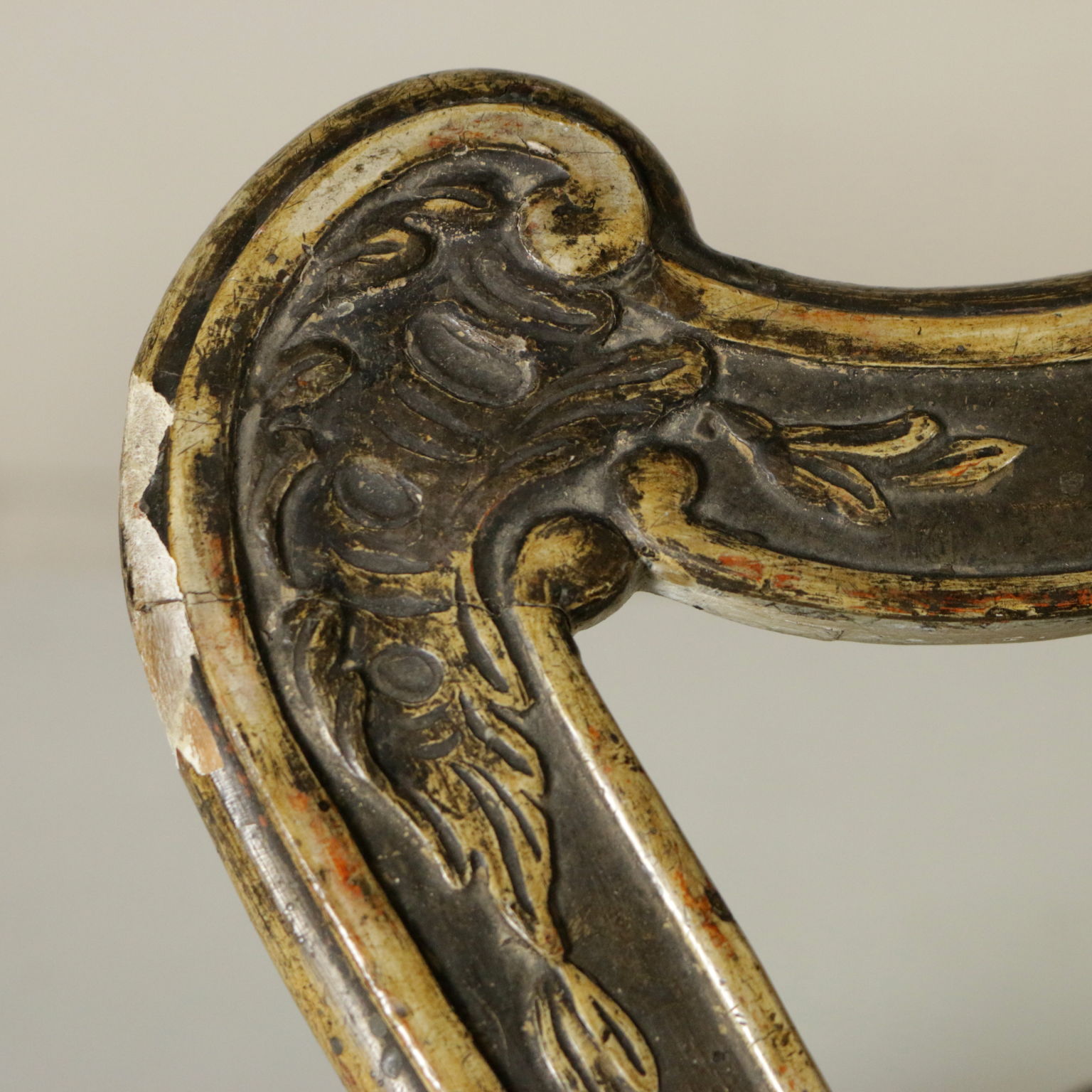Leggio da tavolo ripiegabile in legno intagliato e argentato a mecca, a linea mossa con decori fogliacei e conchiglie.