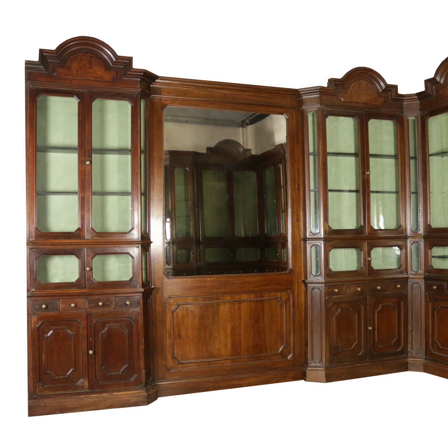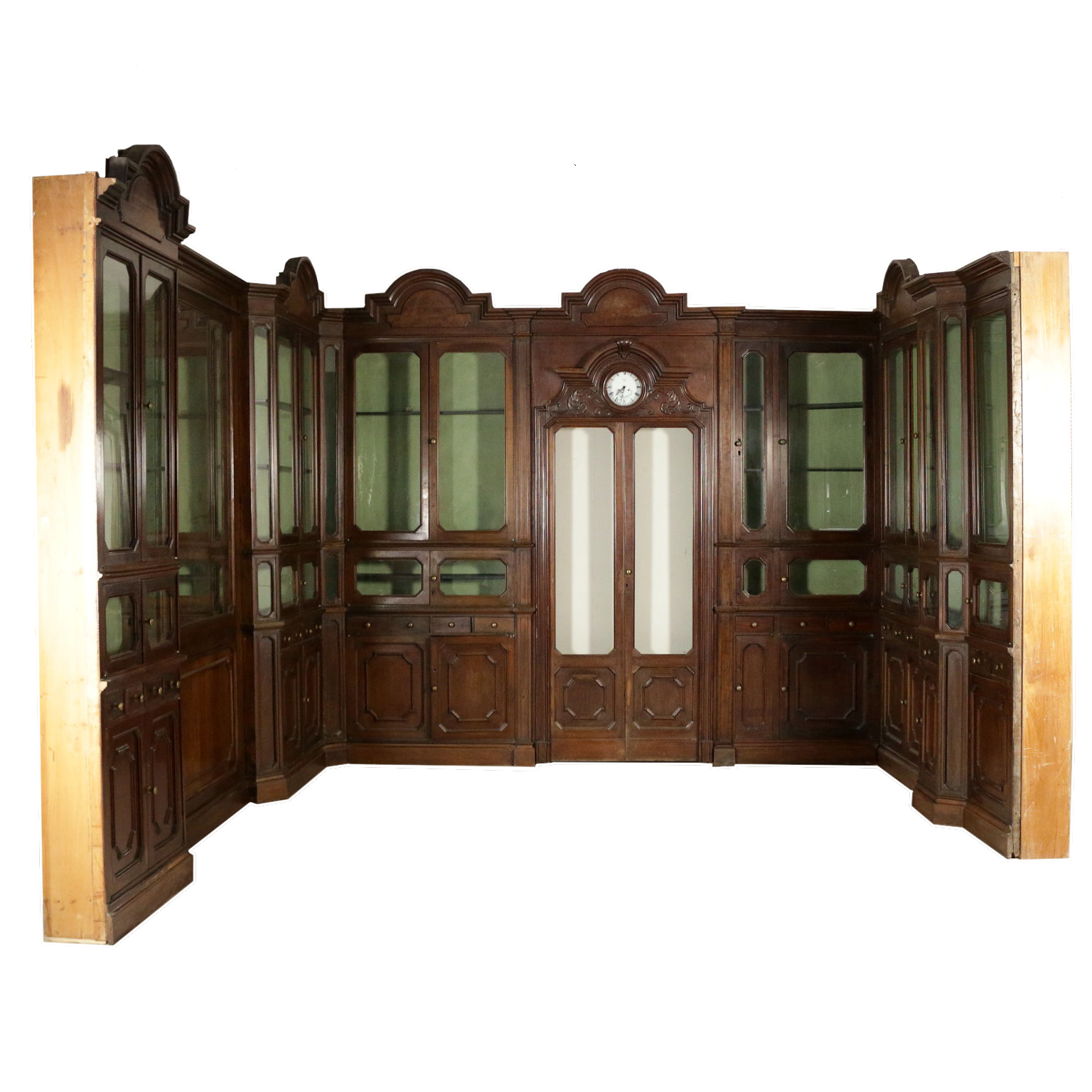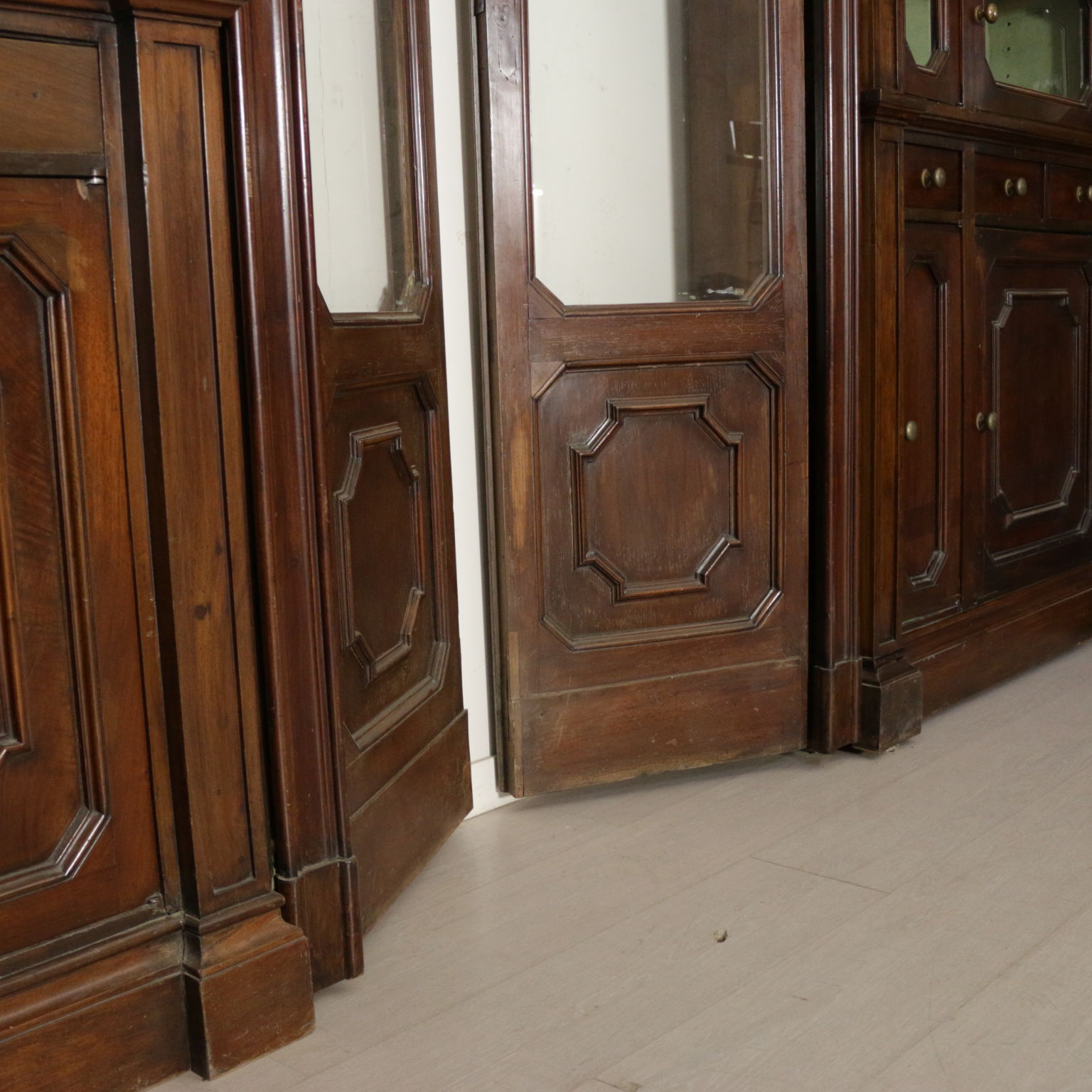 Grande boiserie umbertina, presenta nella base serie di ante con pannelli racchiusi da cornici e serie di cassetti allineati e simpatiche antine di piccole dimensioni. Nella parte superiore ante con vetri antichi. Cimasa con formelle sagomate in radica di noce . Schienale modificato in epoca successiva. Componibili in diverse soluzioni.