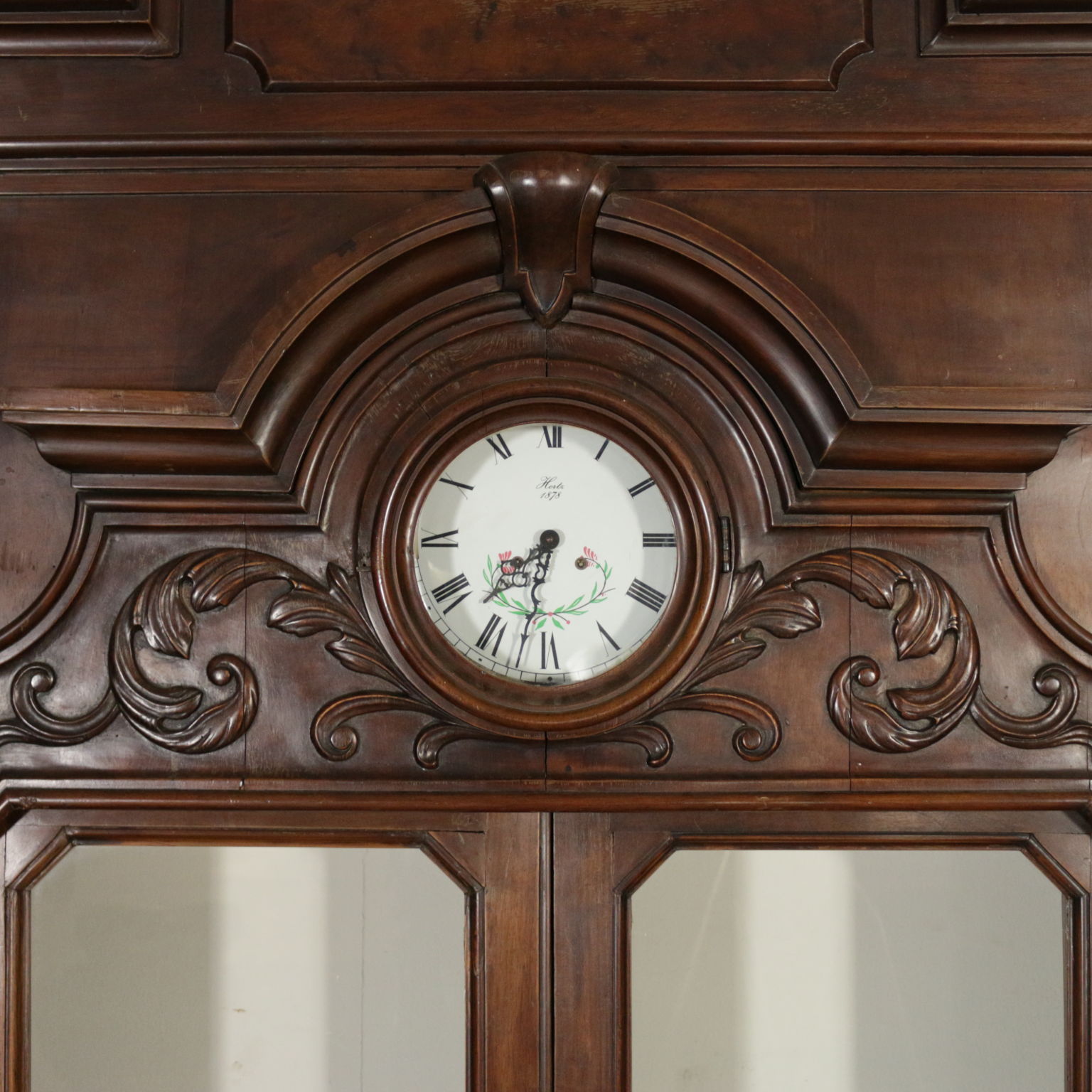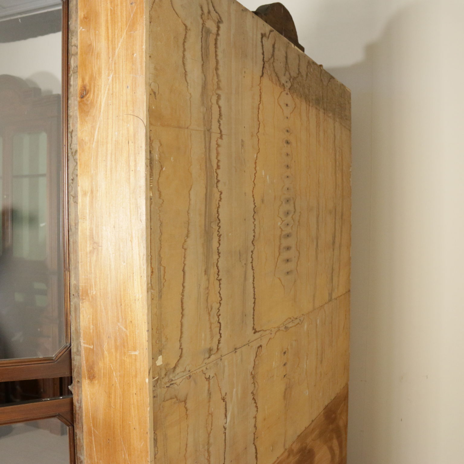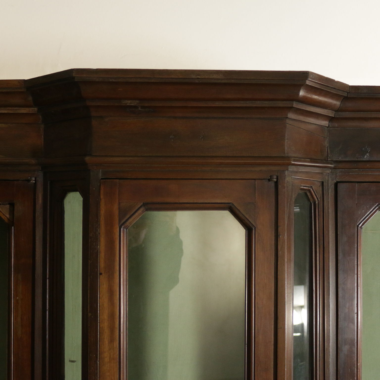 Grande boiserie umbertina, presenta nella base serie di ante con pannelli racchiusi da cornici e serie di cassetti allineati e simpatiche antine di piccole dimensioni. Nella parte superiore ante con vetri antichi. Cimasa con formelle sagomate in radica di noce . Schienale modificato in epoca successiva. Componibili in diverse soluzioni.