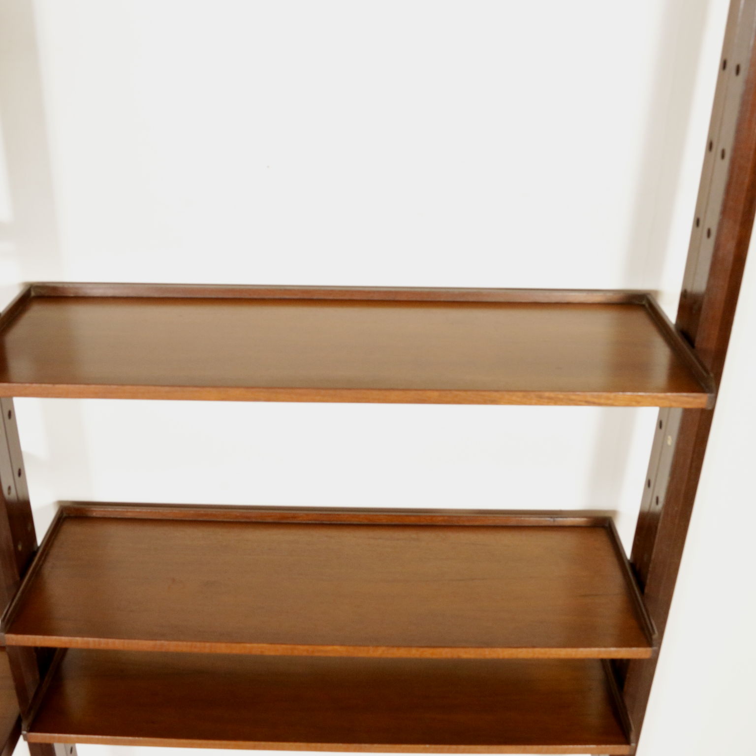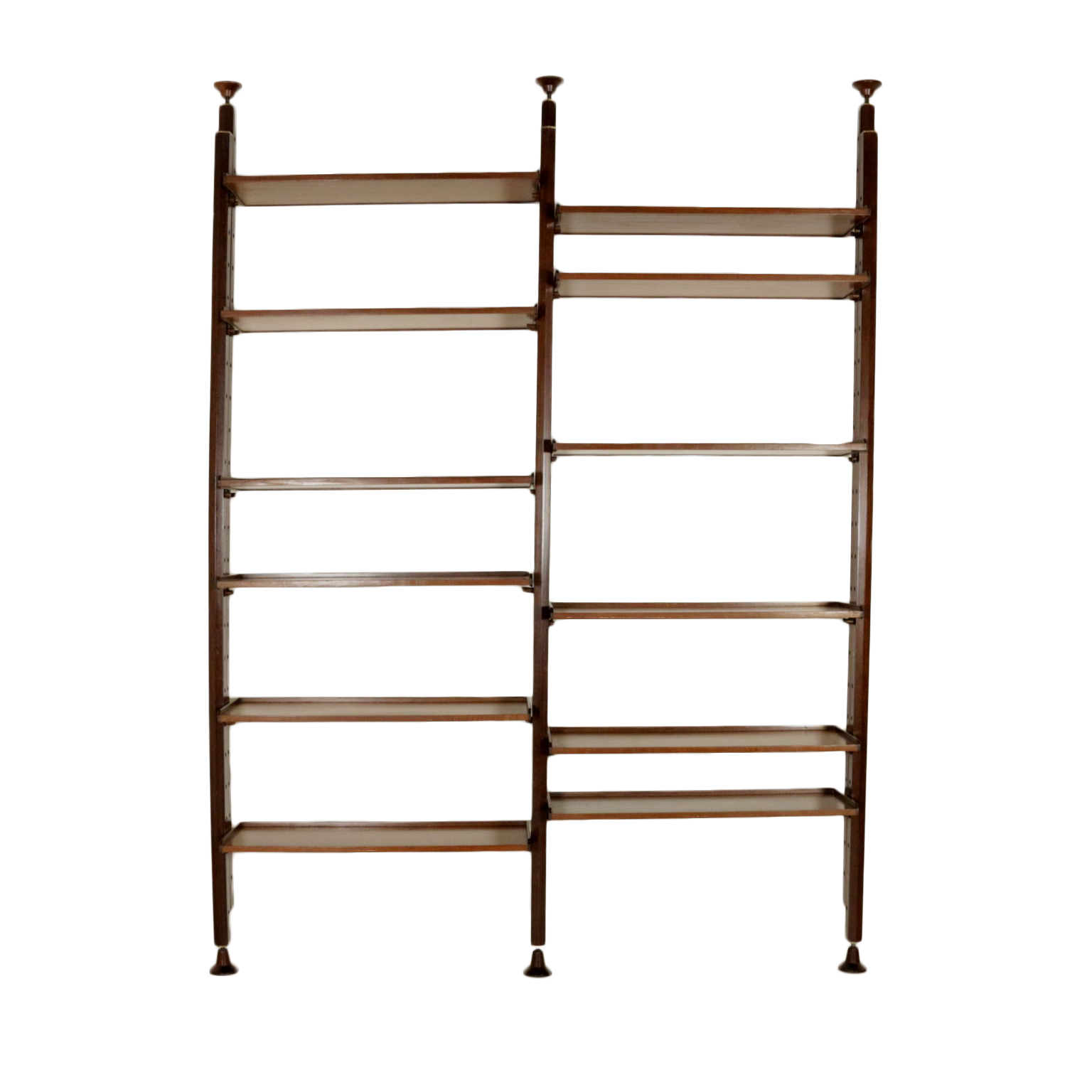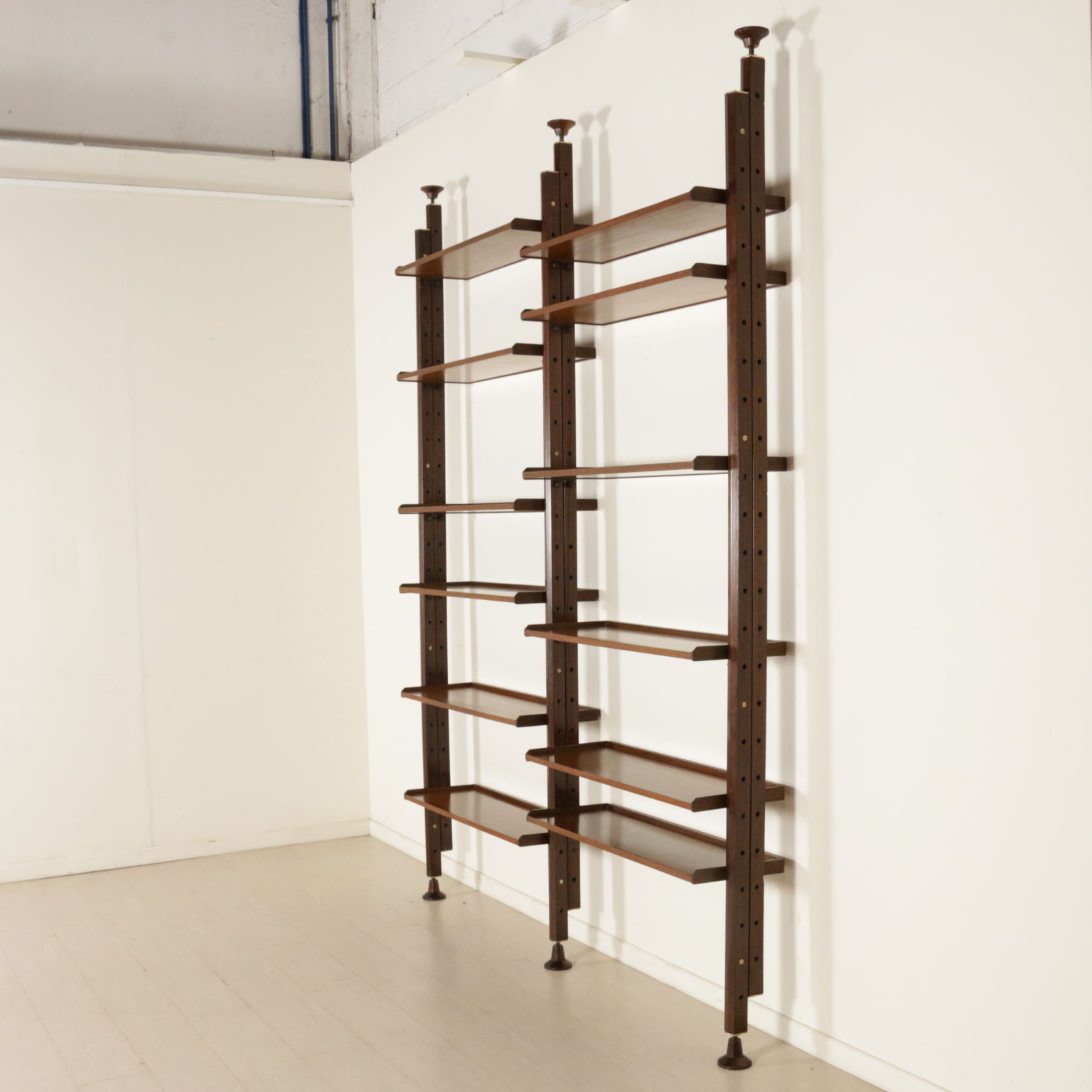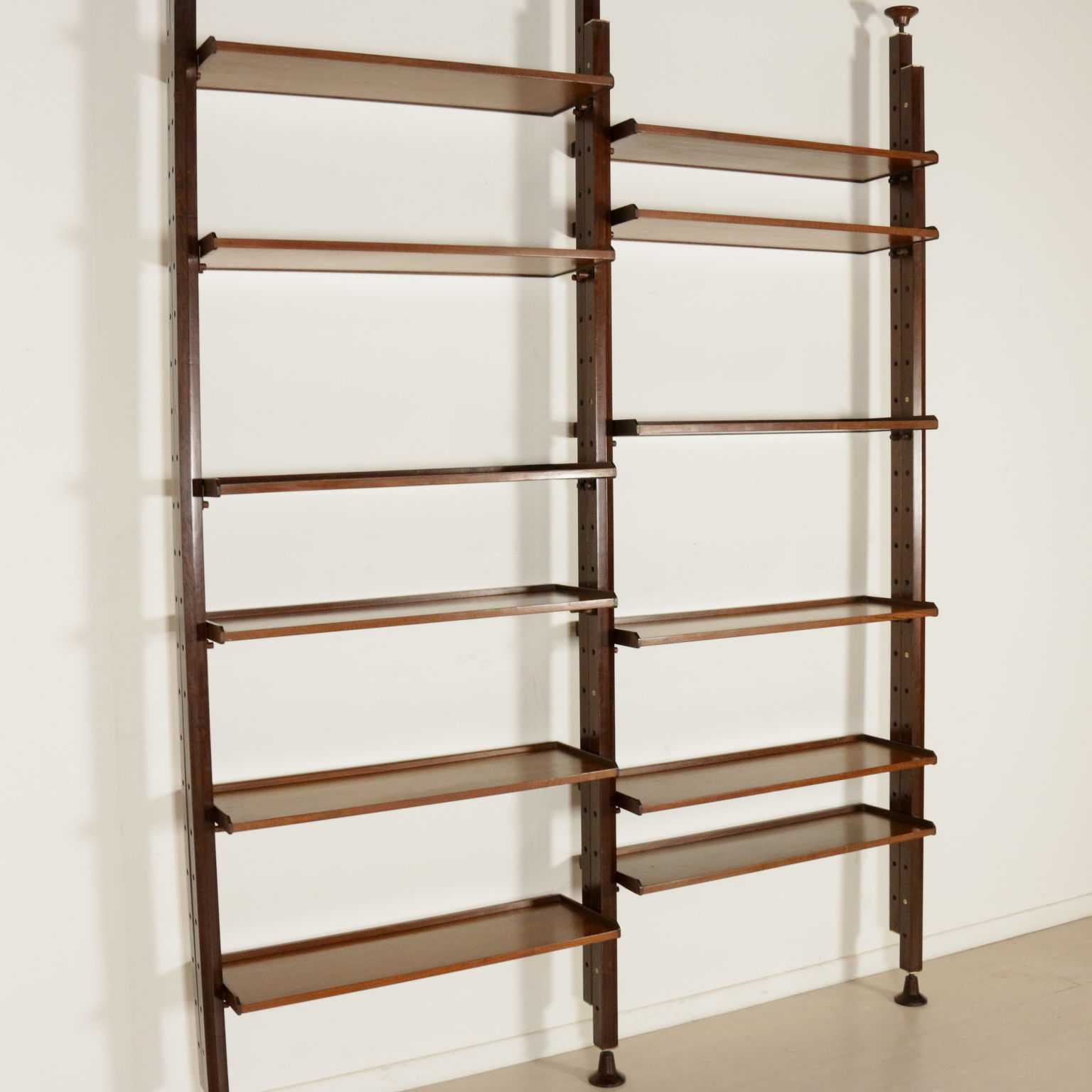 Libreria a soffitto con ripiani regolabili e montanti estensibili. Legno impiallacciato mogano e montanti in palissandro.
