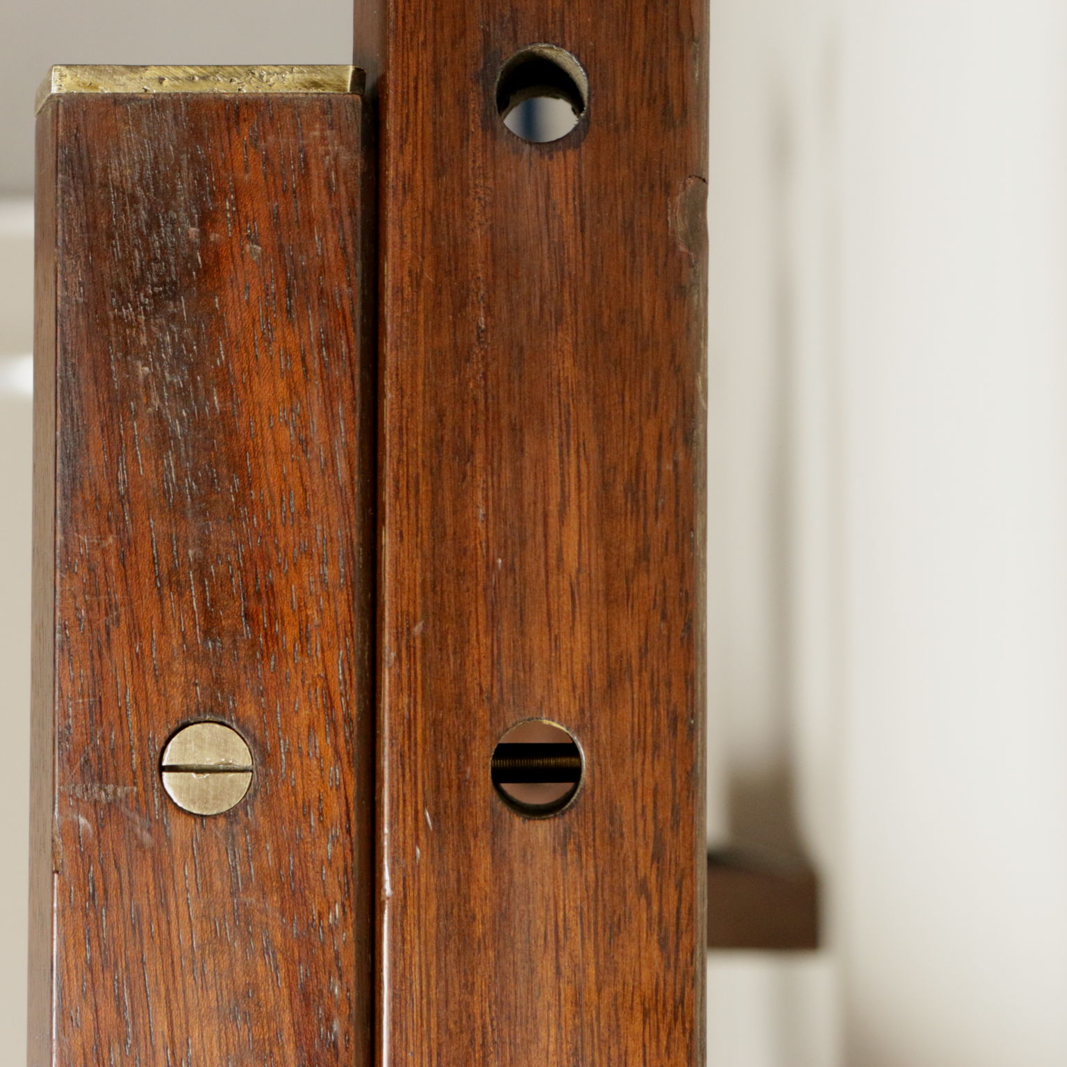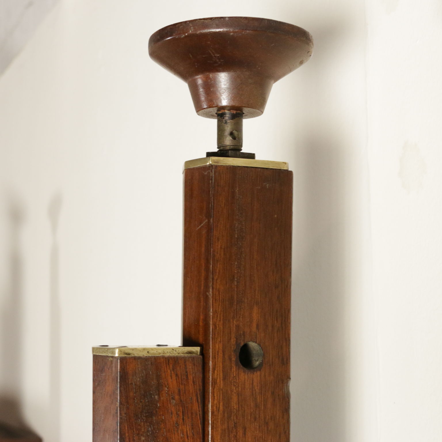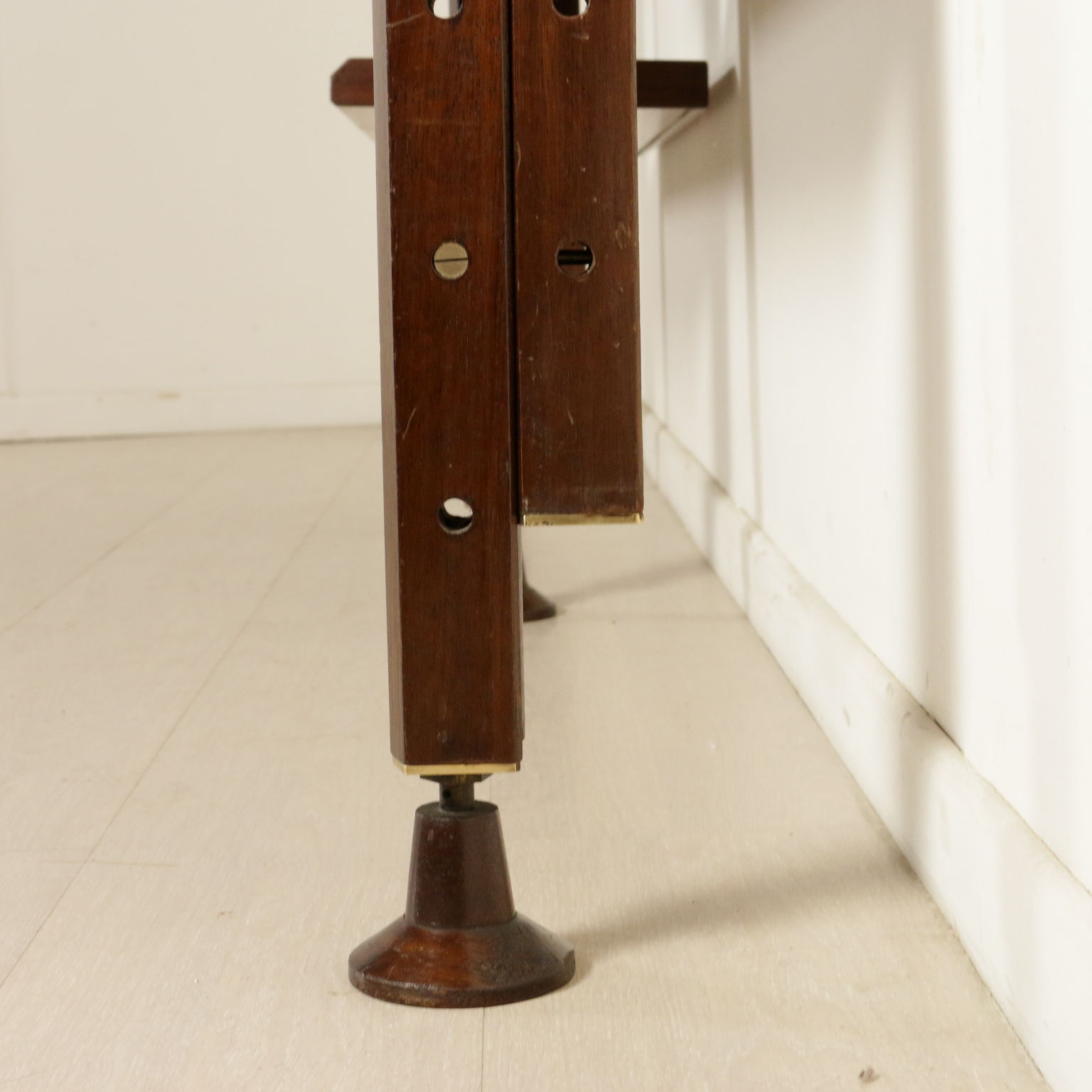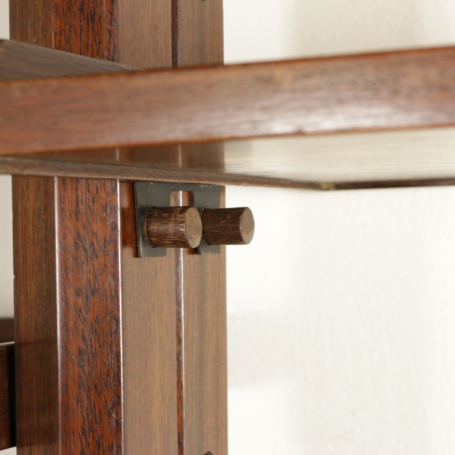 Libreria a soffitto con ripiani regolabili e montanti estensibili. Legno impiallacciato mogano e montanti in palissandro.