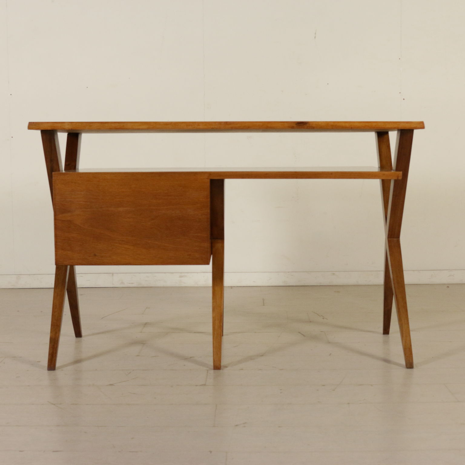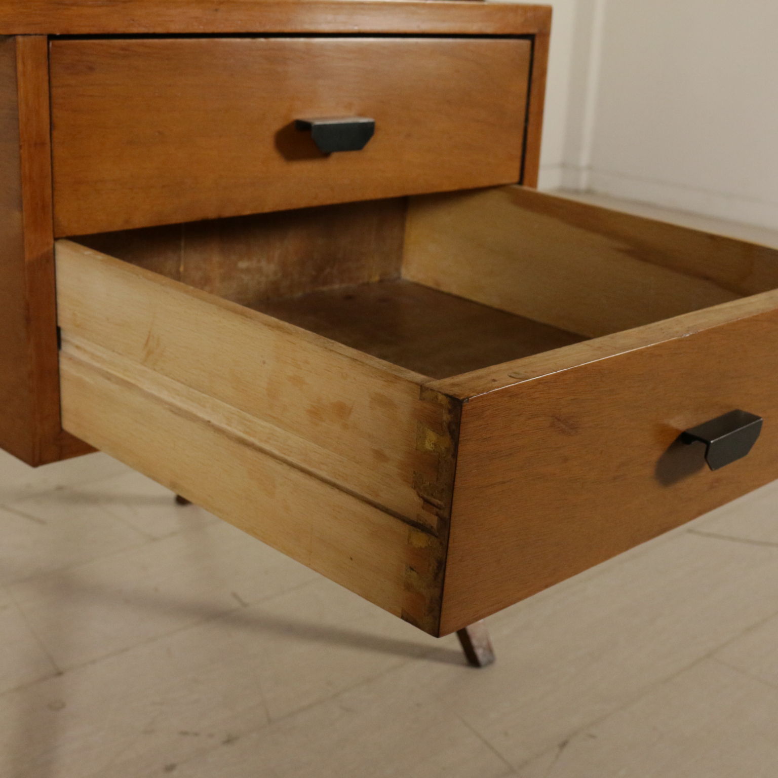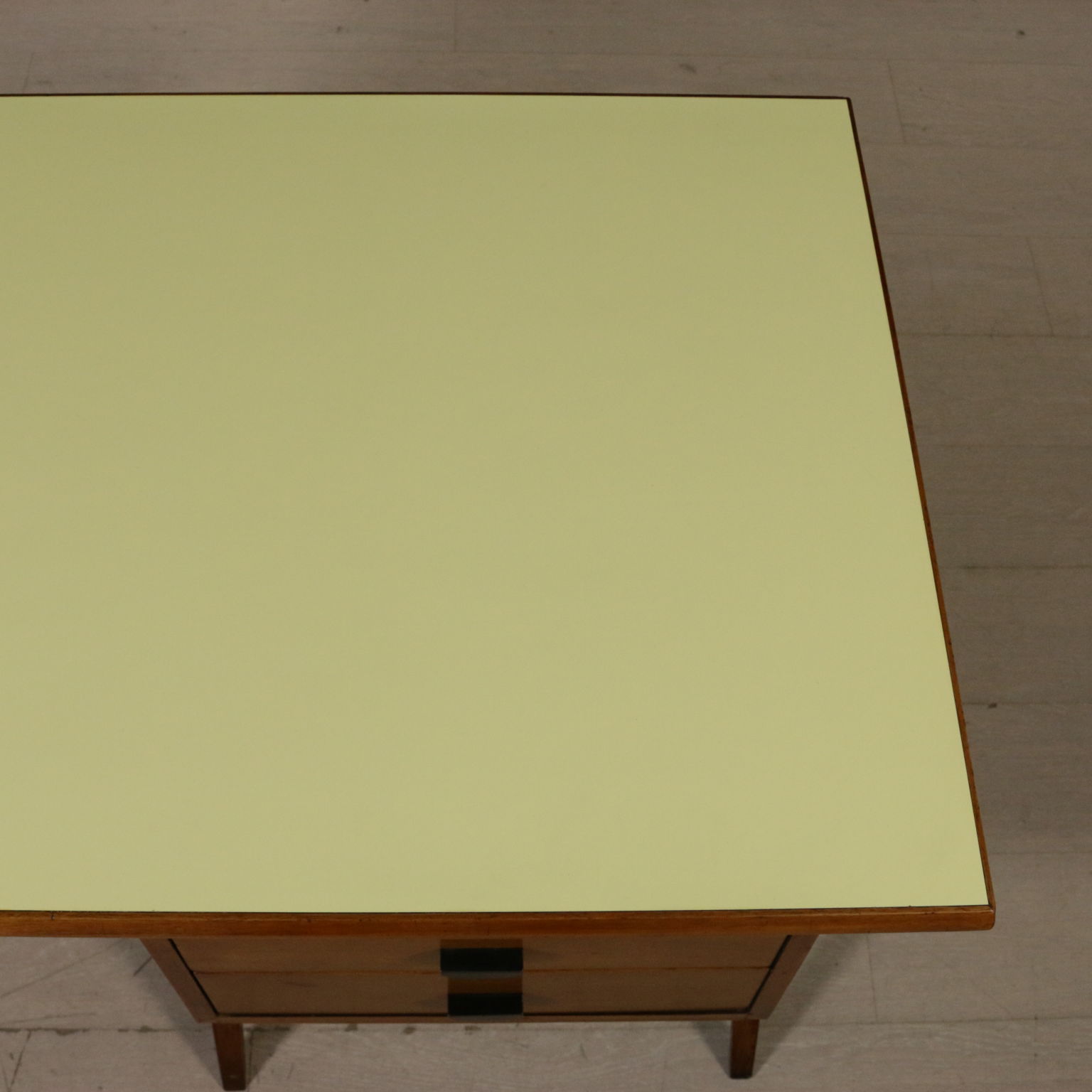 Scrittoio con cassetti; legno impiallacciato e massello di noce, piano ricoperto in formica.