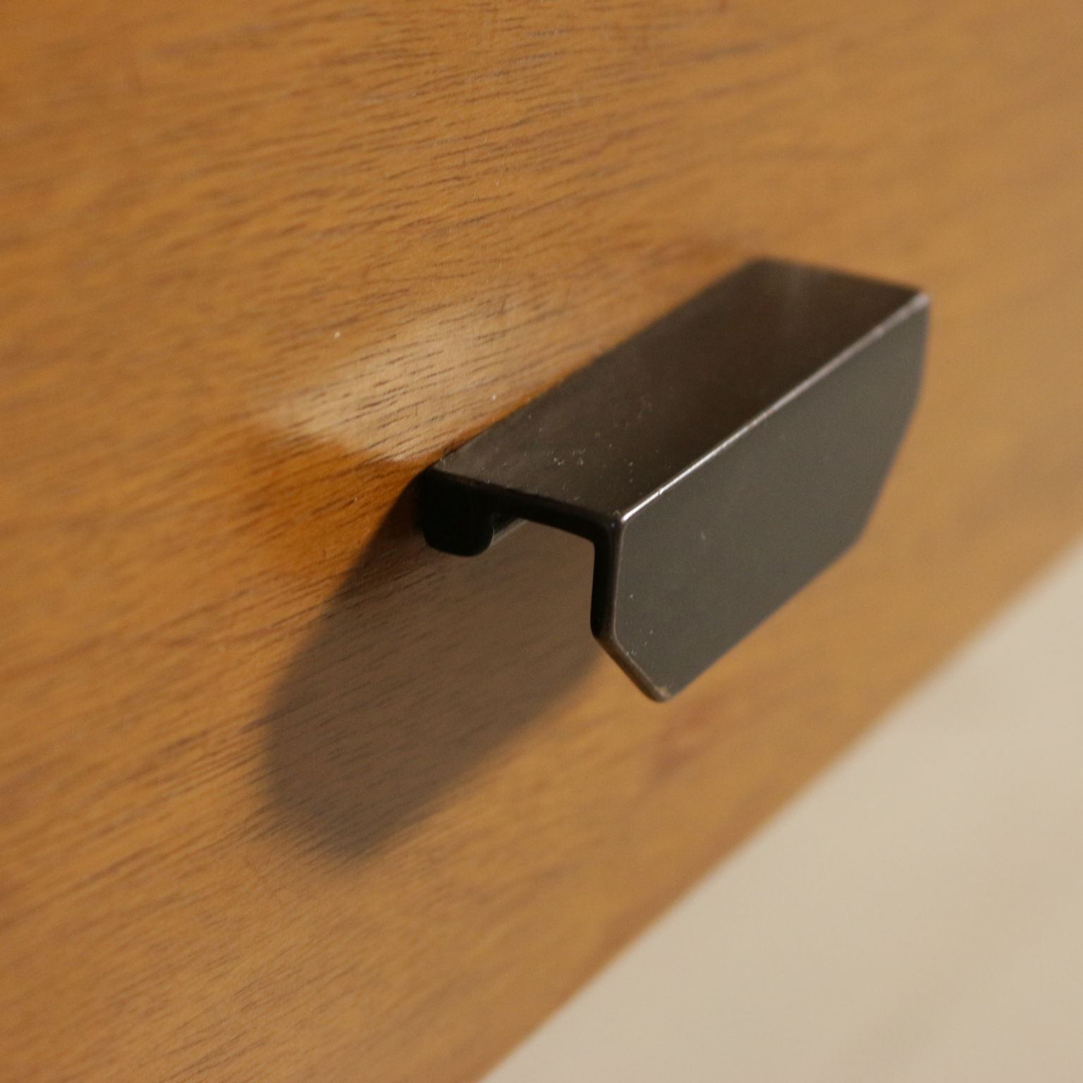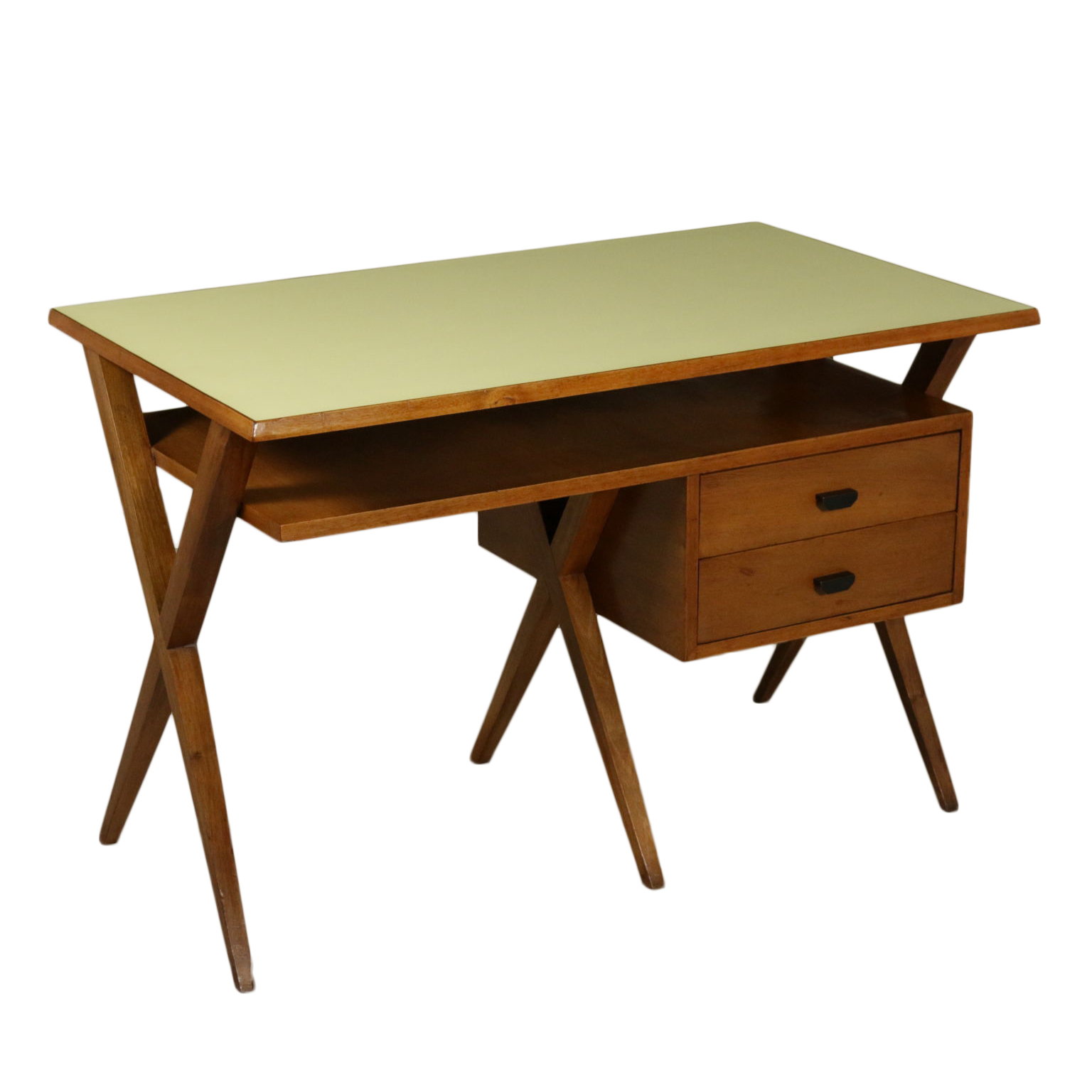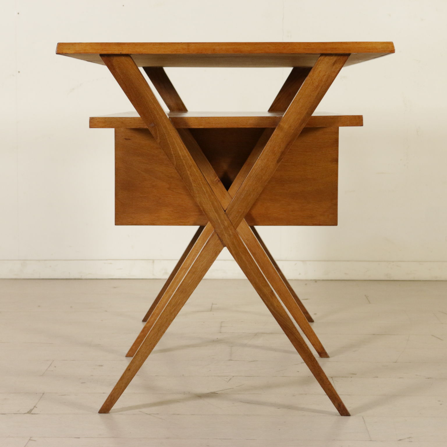 Scrittoio con cassetti; legno impiallacciato e massello di noce, piano ricoperto in formica.