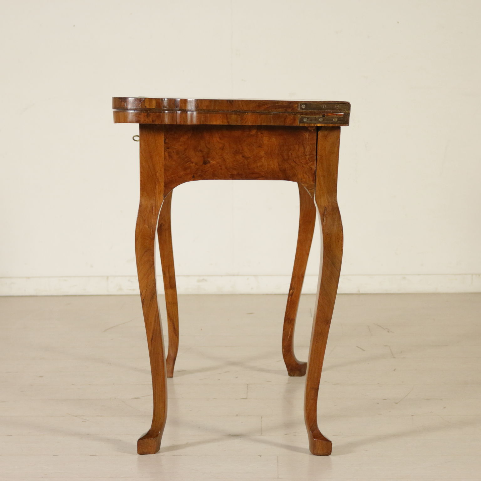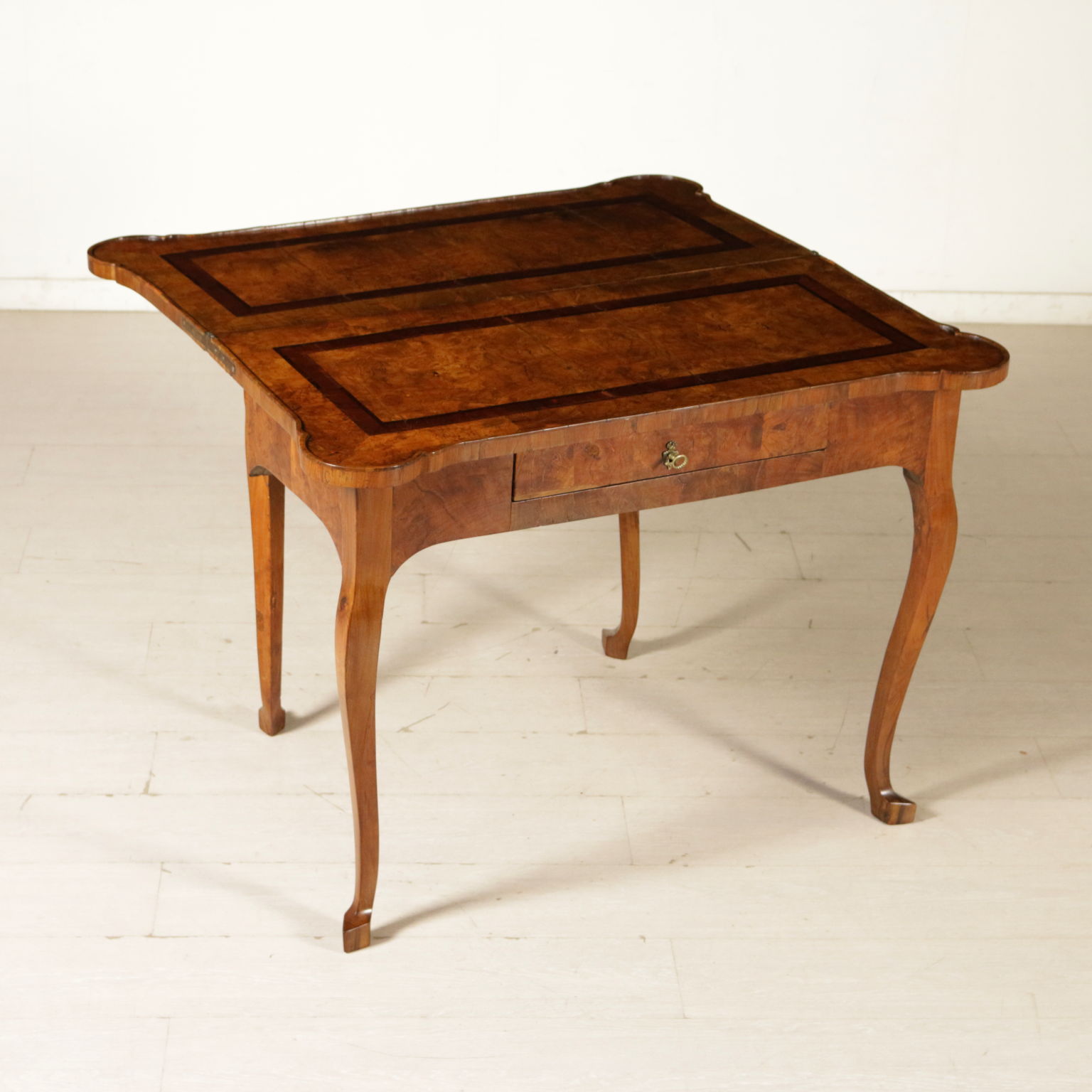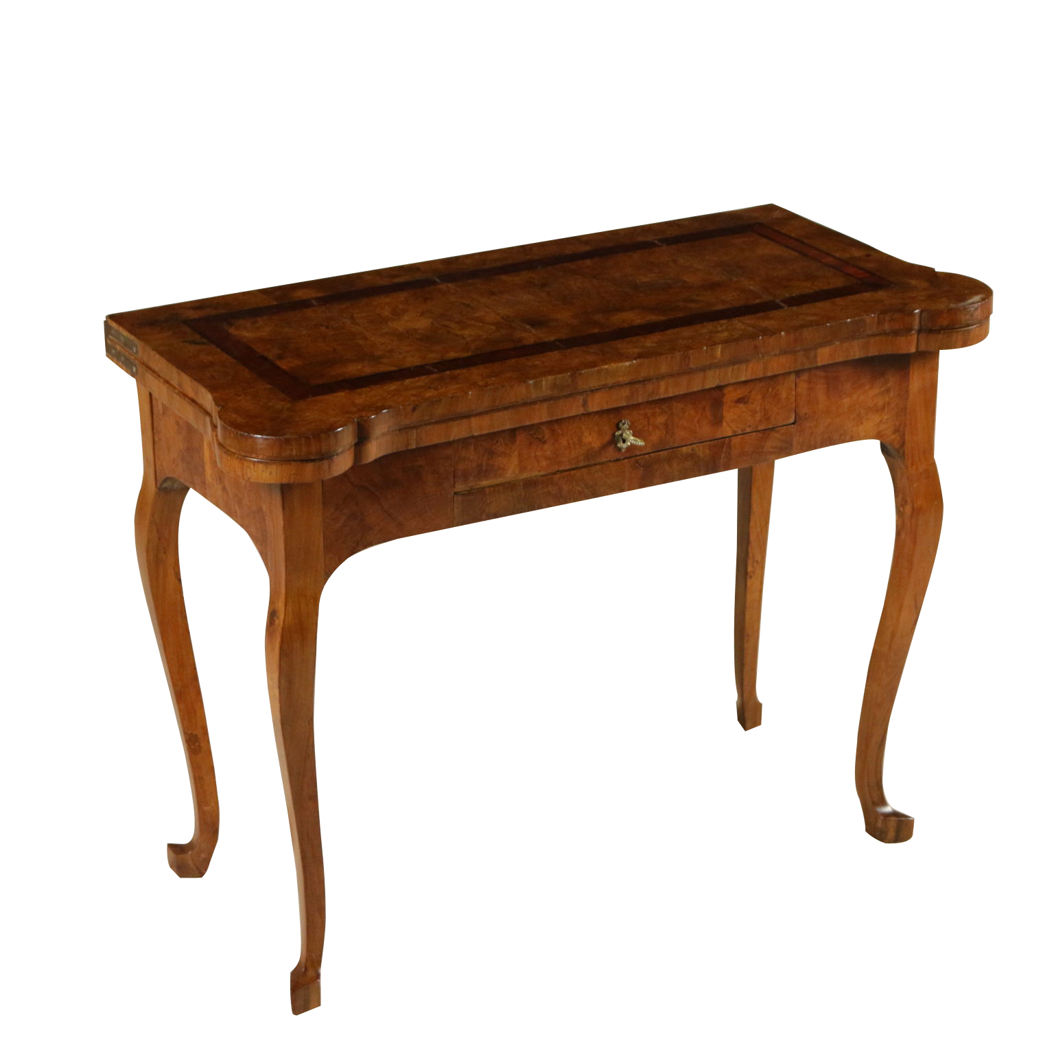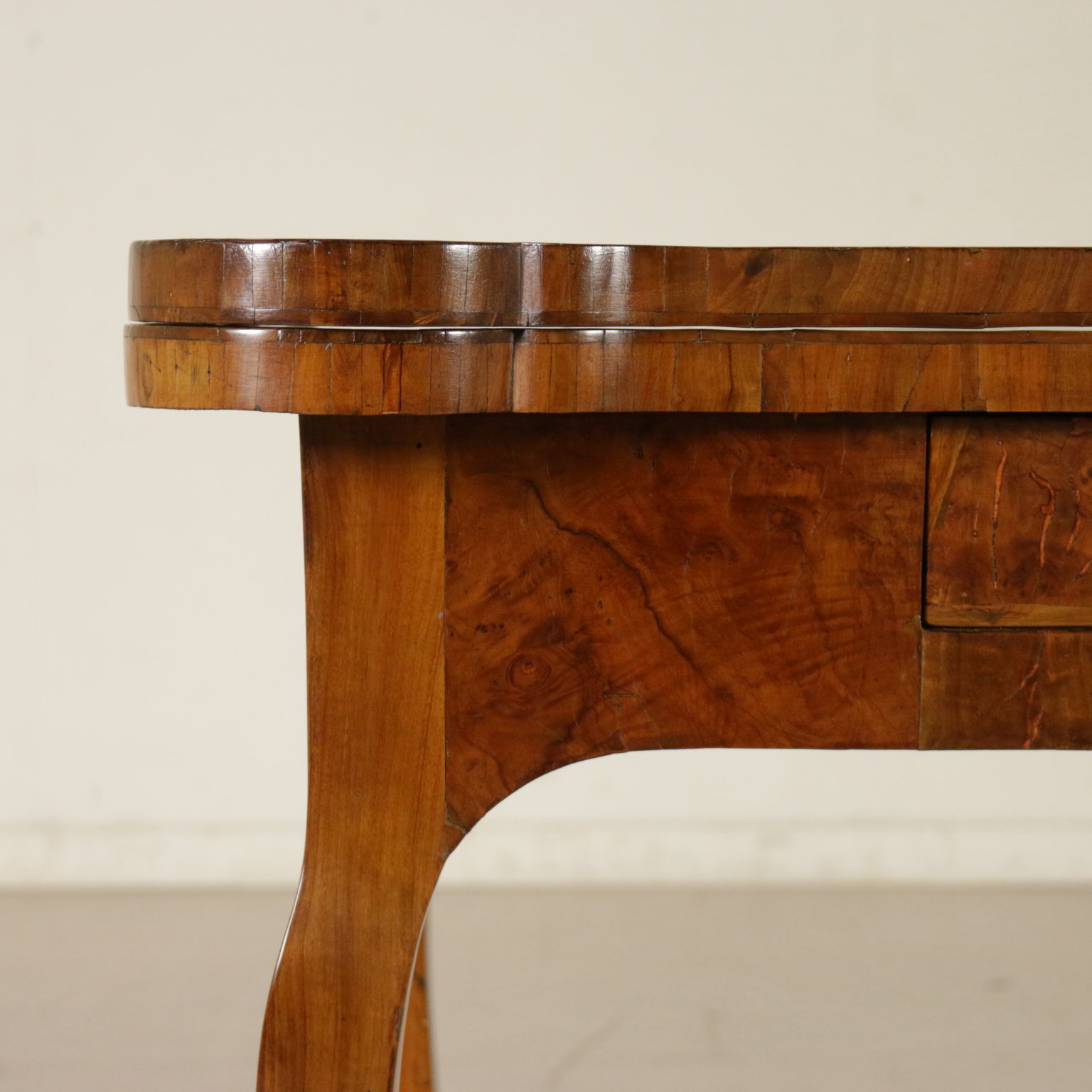 Elegante tavolo da gioco retto da gambe mosse terminanti con piede a biscia. Un cassetto nella fascia. Piano sagomato apribile. Gambe posteriori apribili a cancello a reggere anta apribile. Sul piano filettatura intarsiata in palissandro e legni esotici.