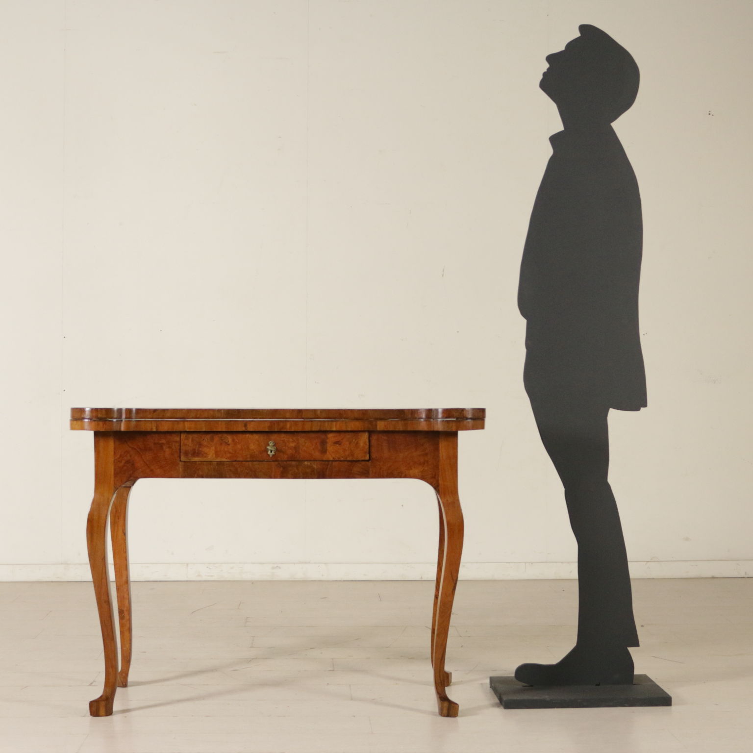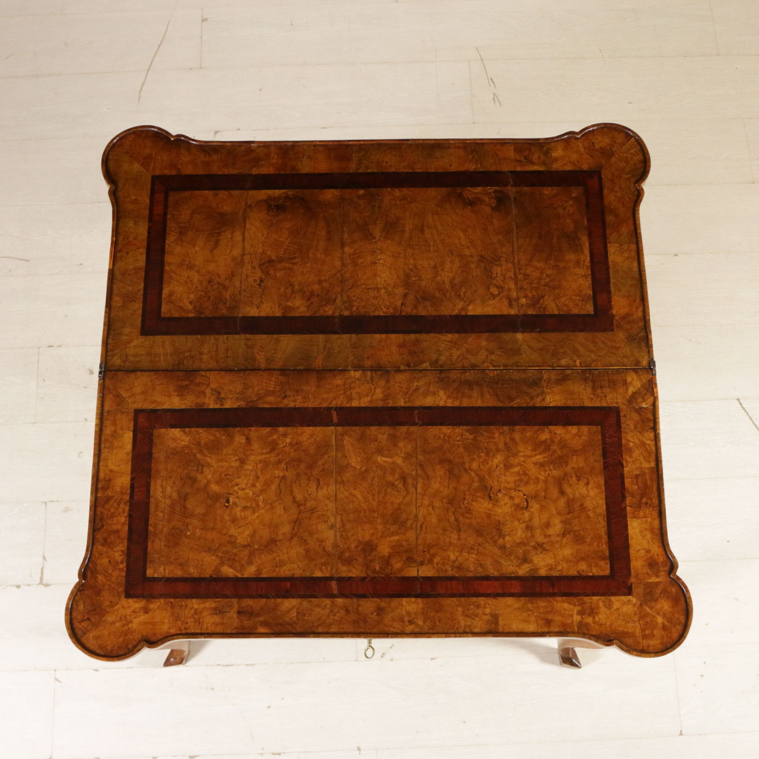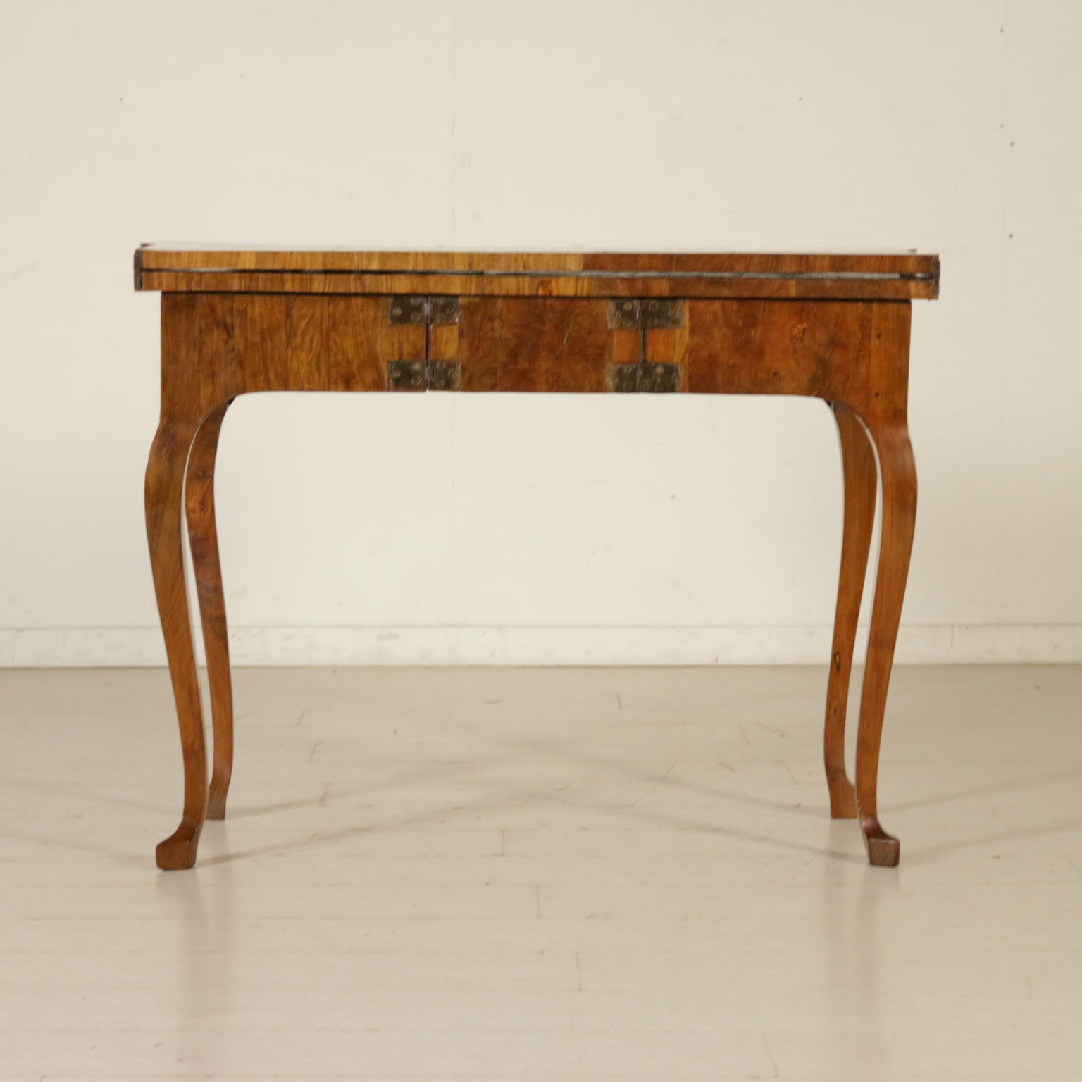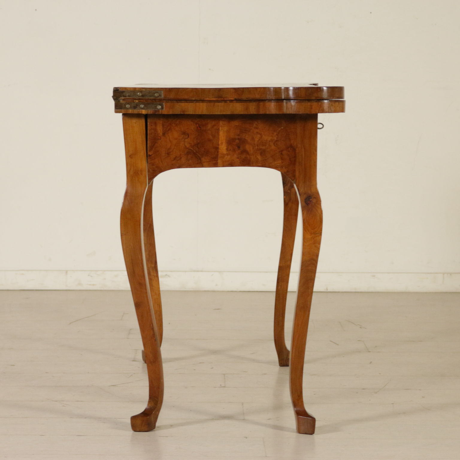 Elegante tavolo da gioco retto da gambe mosse terminanti con piede a biscia. Un cassetto nella fascia. Piano sagomato apribile. Gambe posteriori apribili a cancello a reggere anta apribile. Sul piano filettatura intarsiata in palissandro e legni esotici.