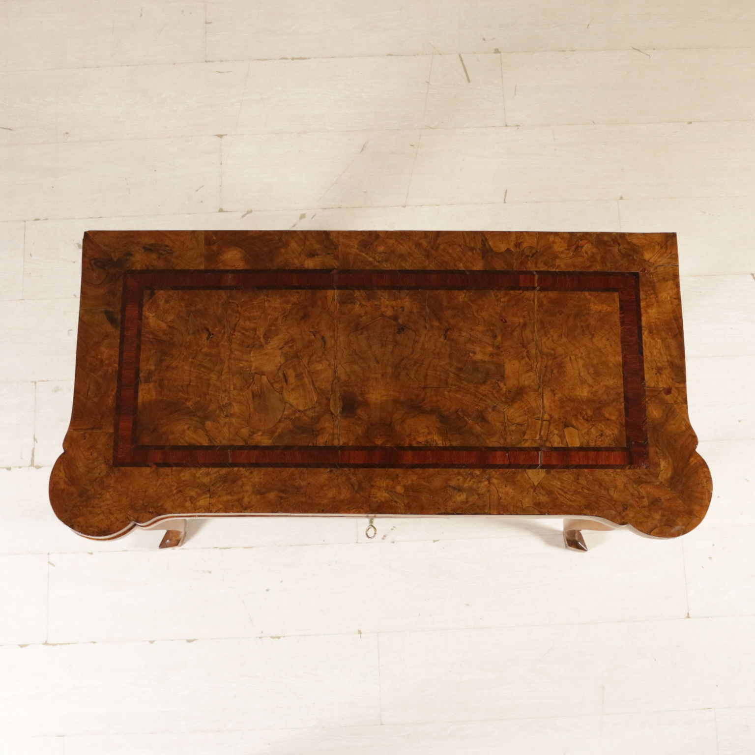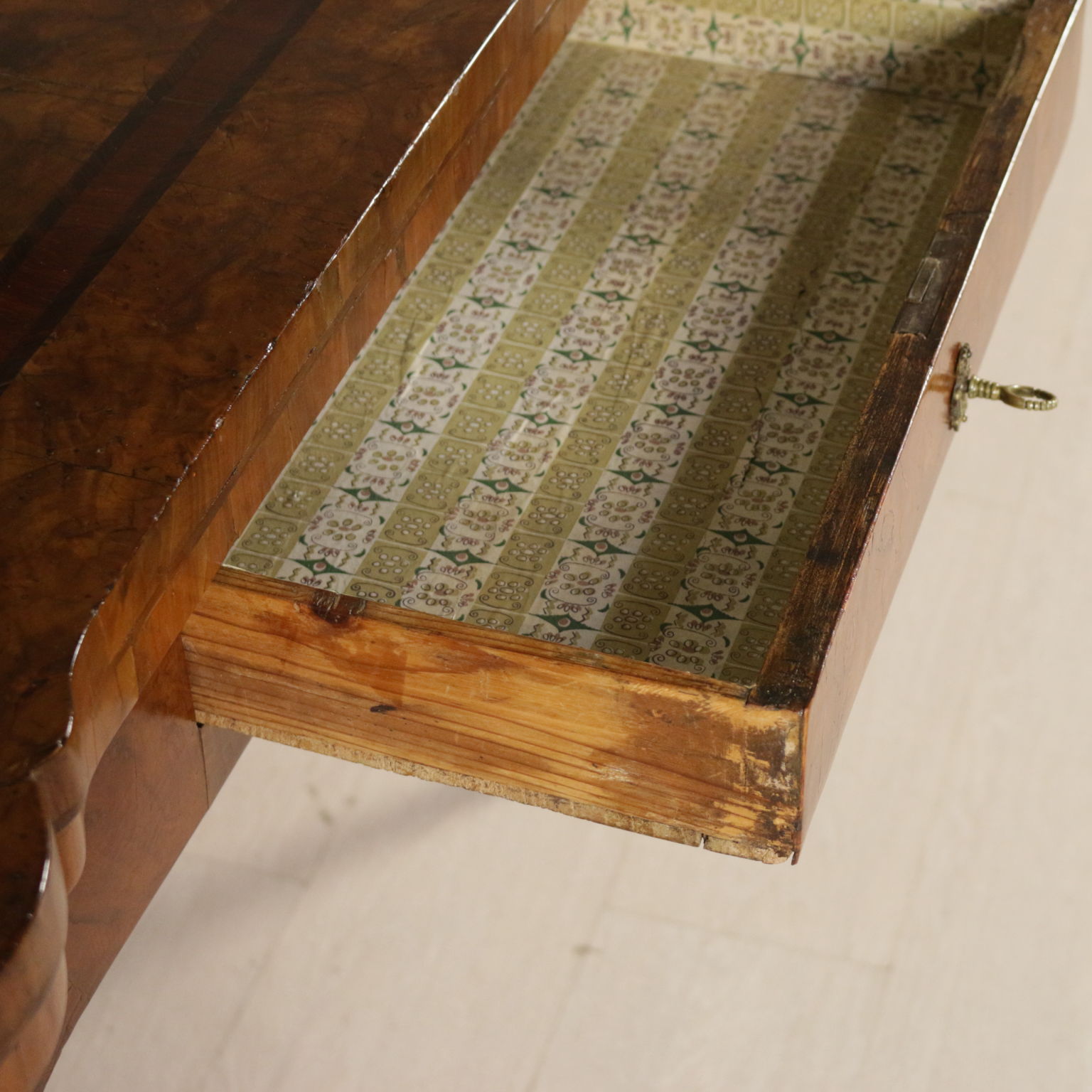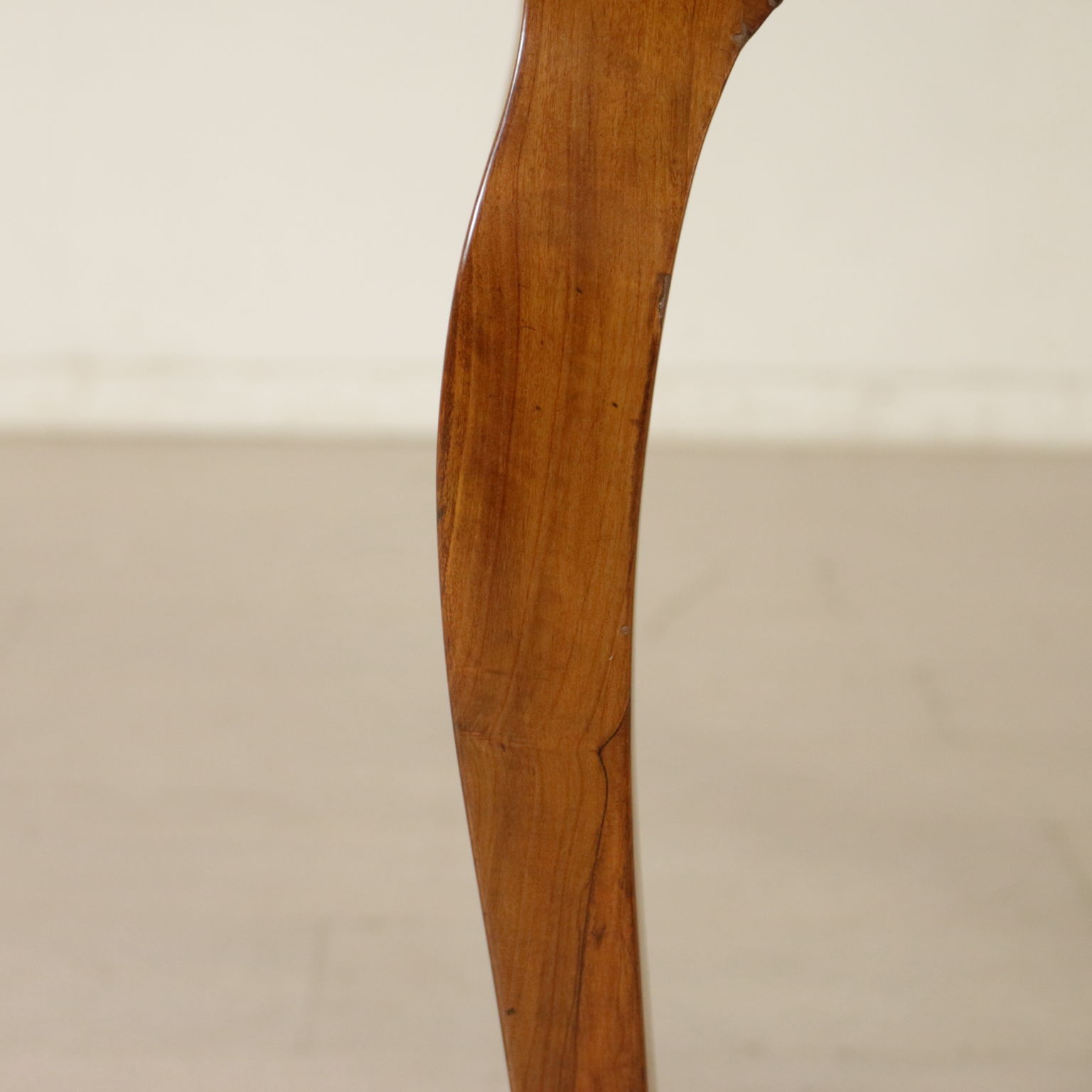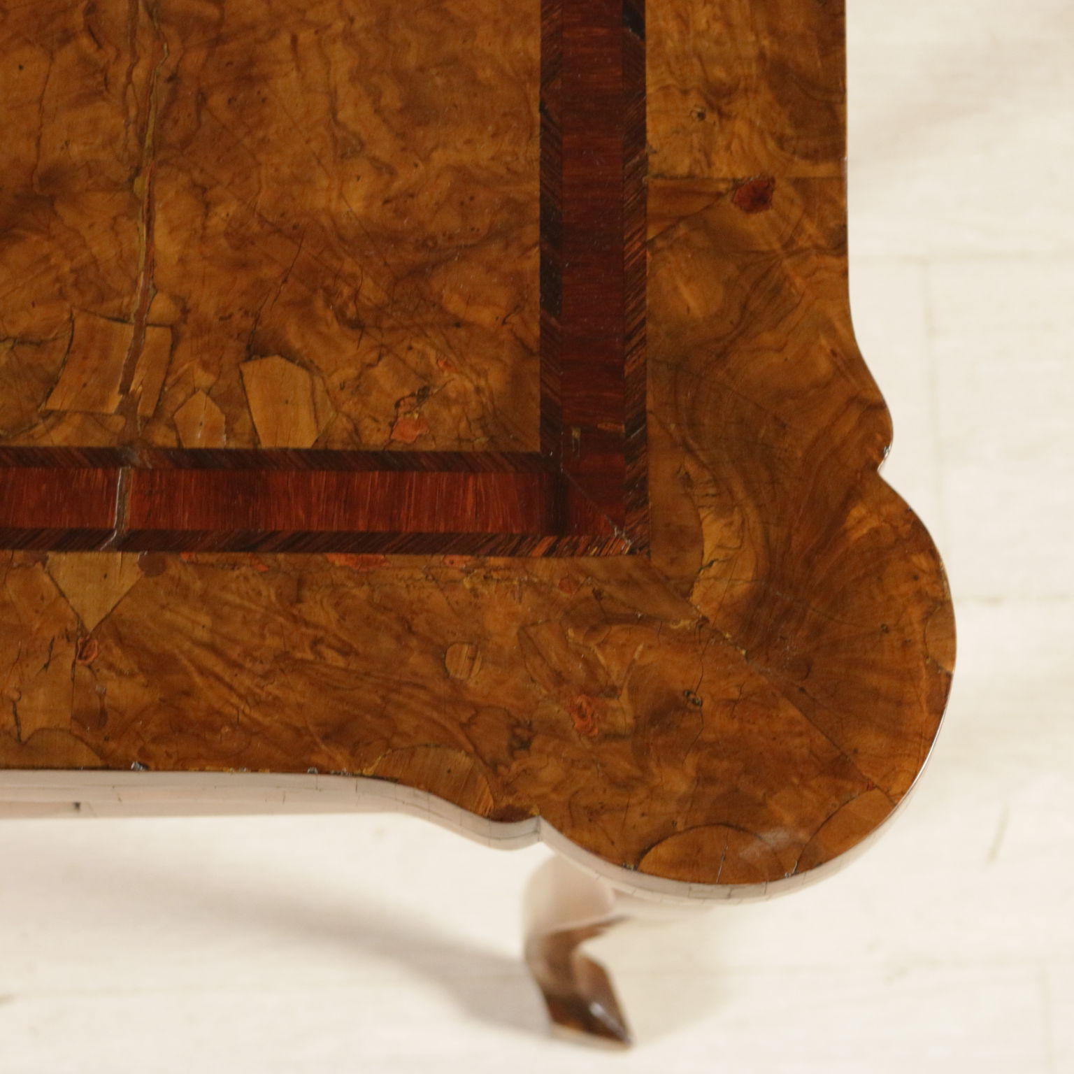 Elegante tavolo da gioco retto da gambe mosse terminanti con piede a biscia. Un cassetto nella fascia. Piano sagomato apribile. Gambe posteriori apribili a cancello a reggere anta apribile. Sul piano filettatura intarsiata in palissandro e legni esotici.