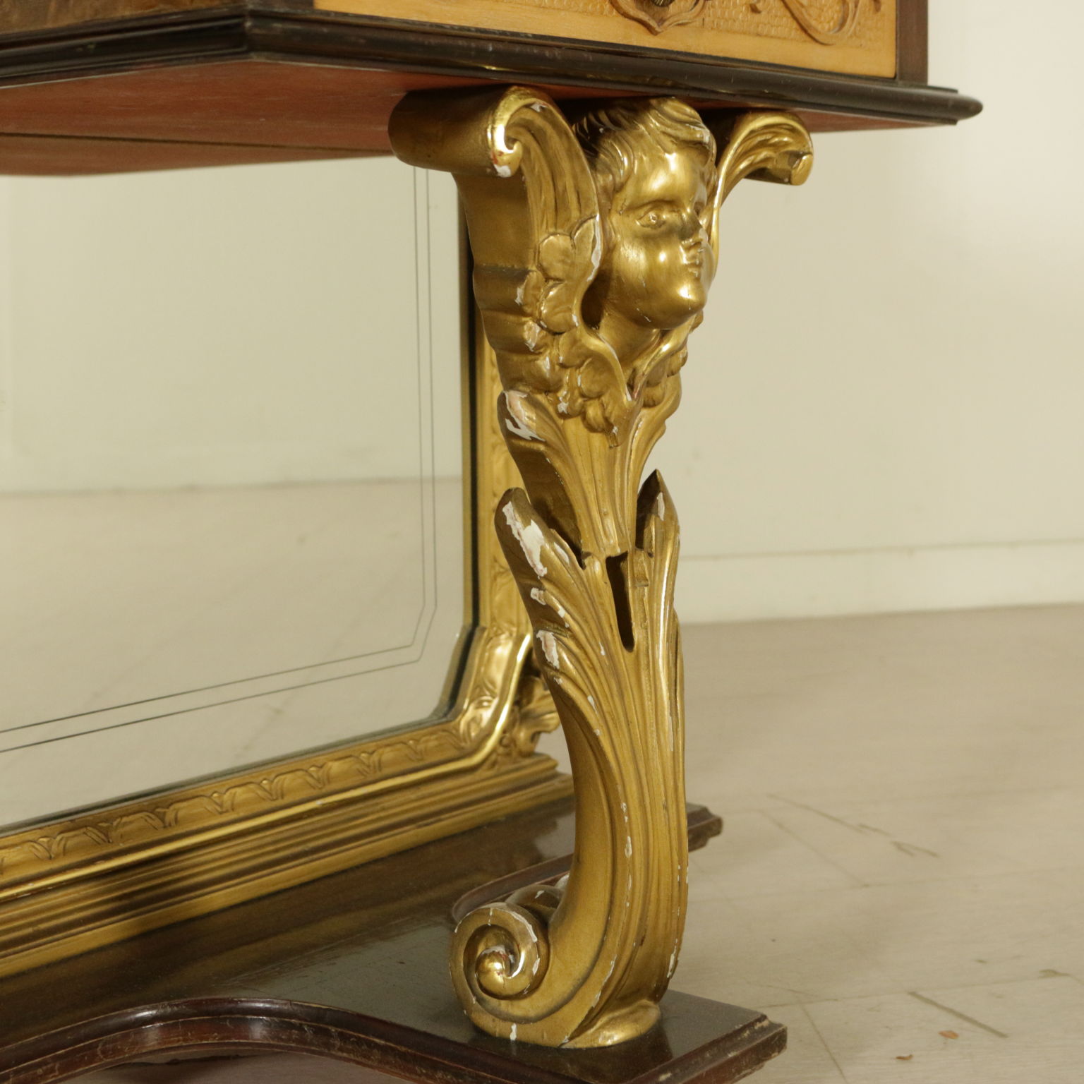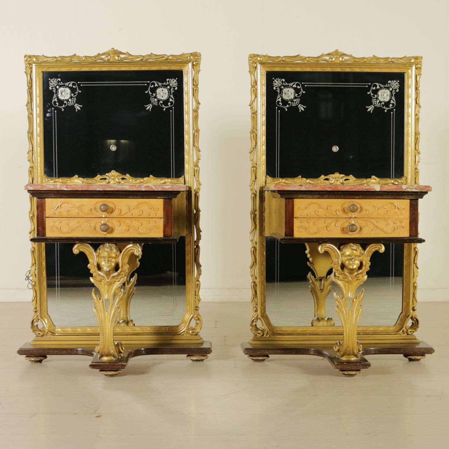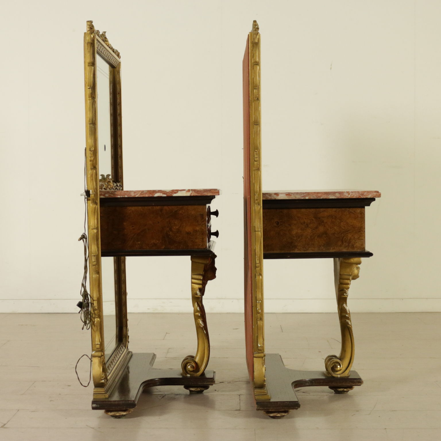Retti da lesene intagliate e dorate con volto di putto. Presentano coppia di cassetti e pannello posteriore con specchi decorati ad acido con cornice intagliata e dorata.