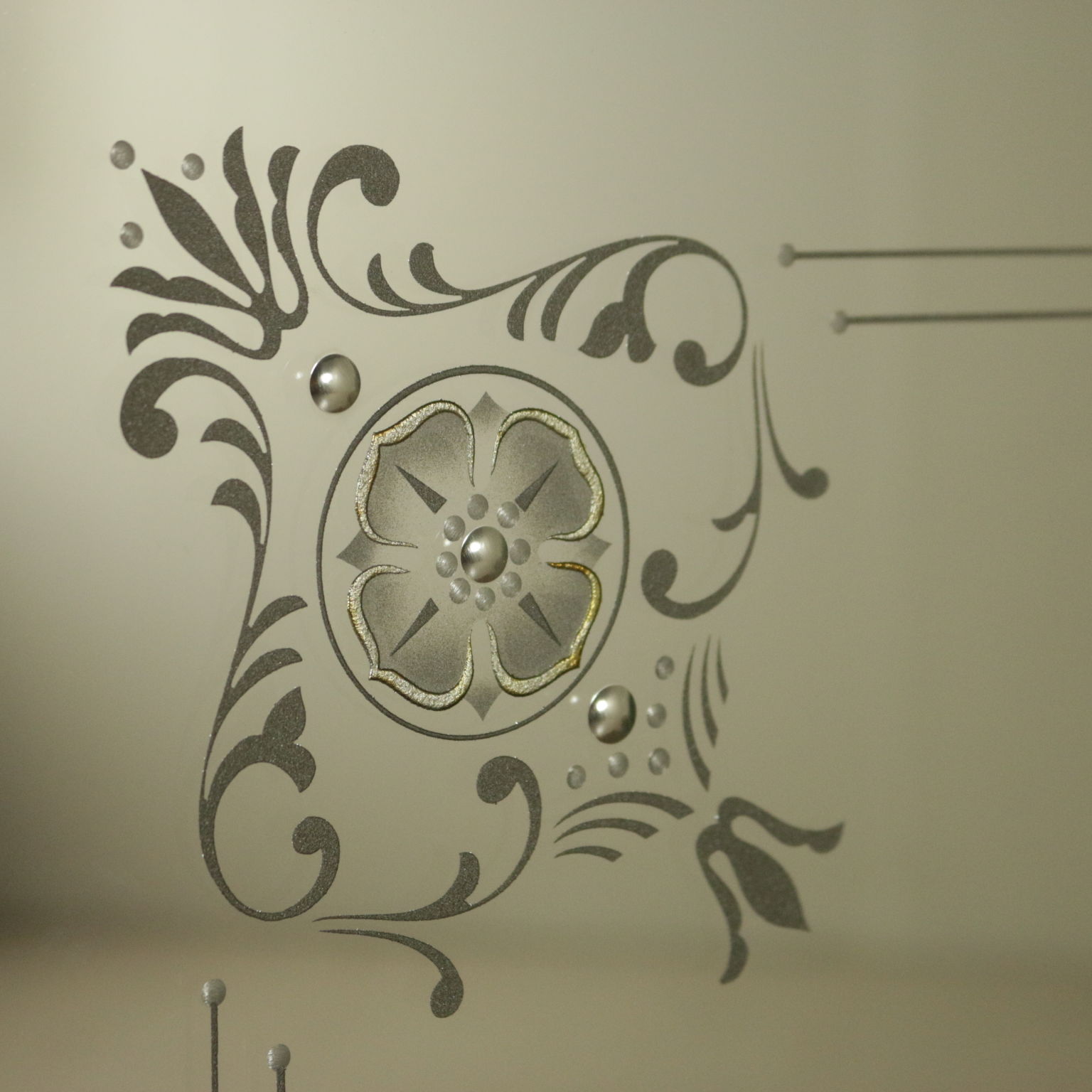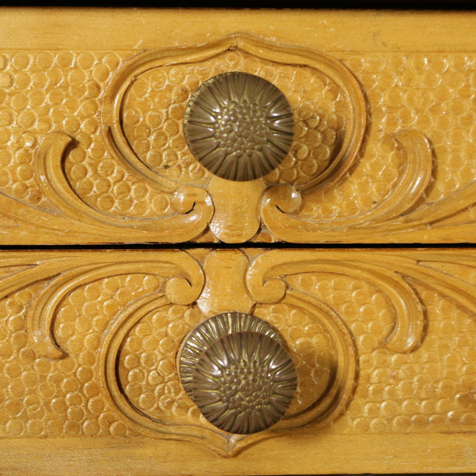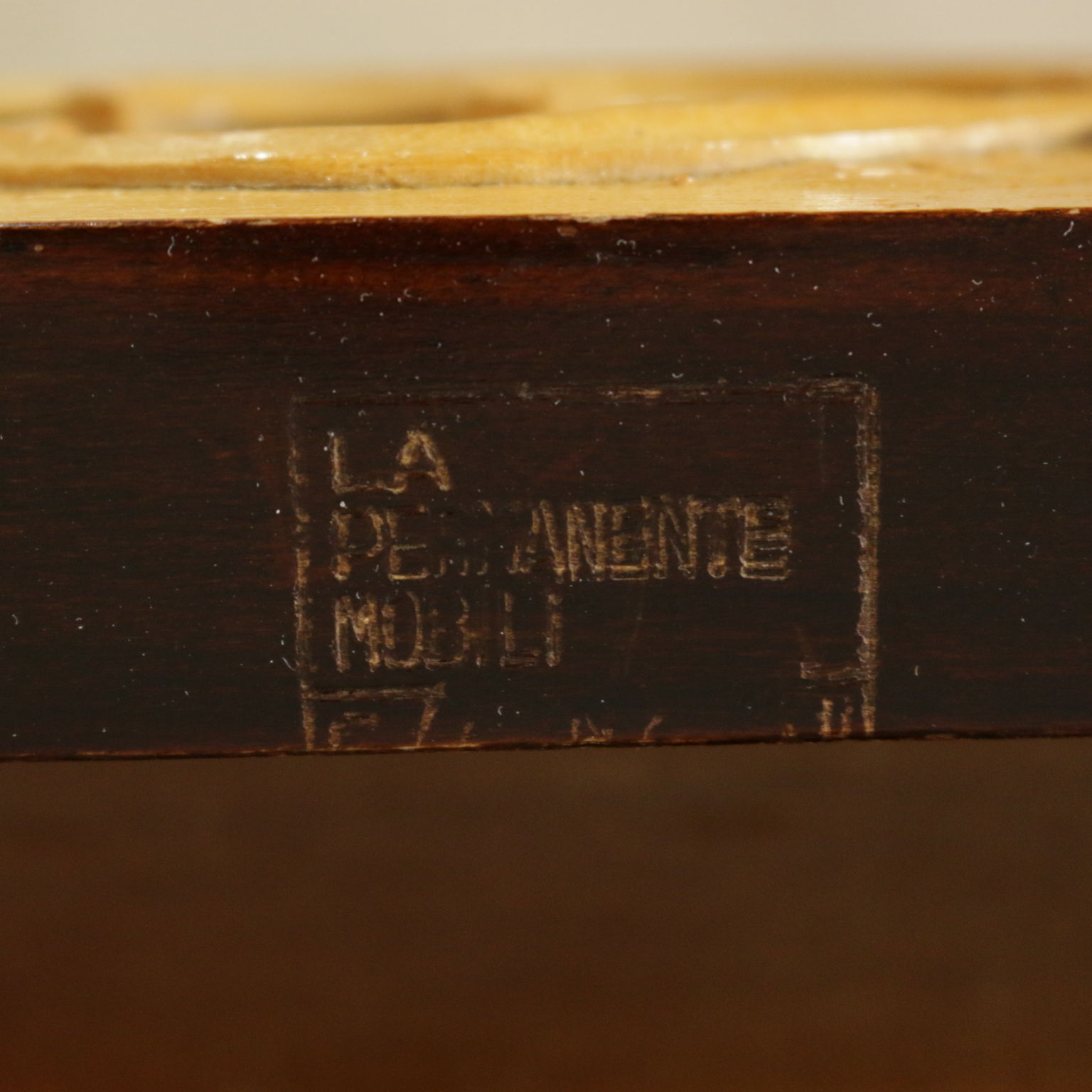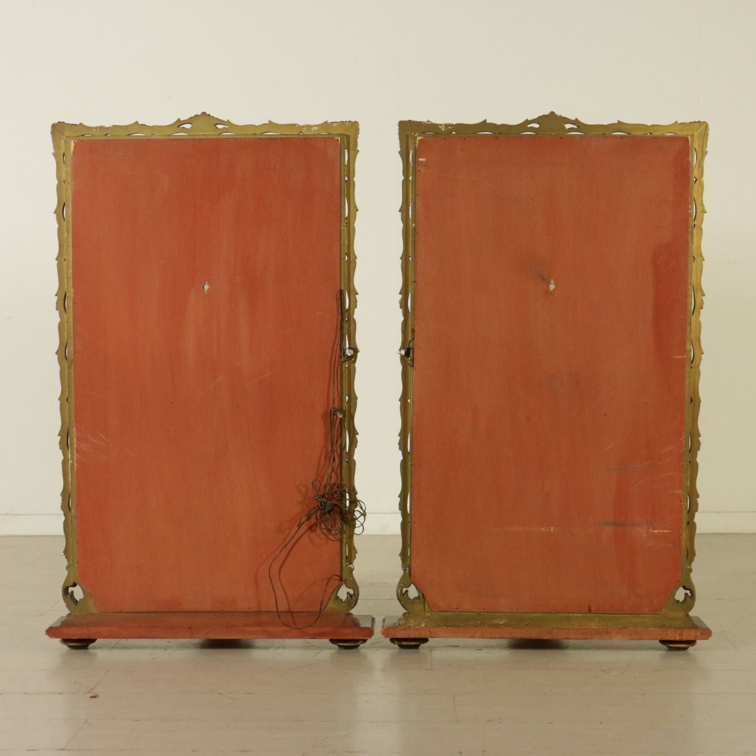 Retti da lesene intagliate e dorate con volto di putto. Presentano coppia di cassetti e pannello posteriore con specchi decorati ad acido con cornice intagliata e dorata.