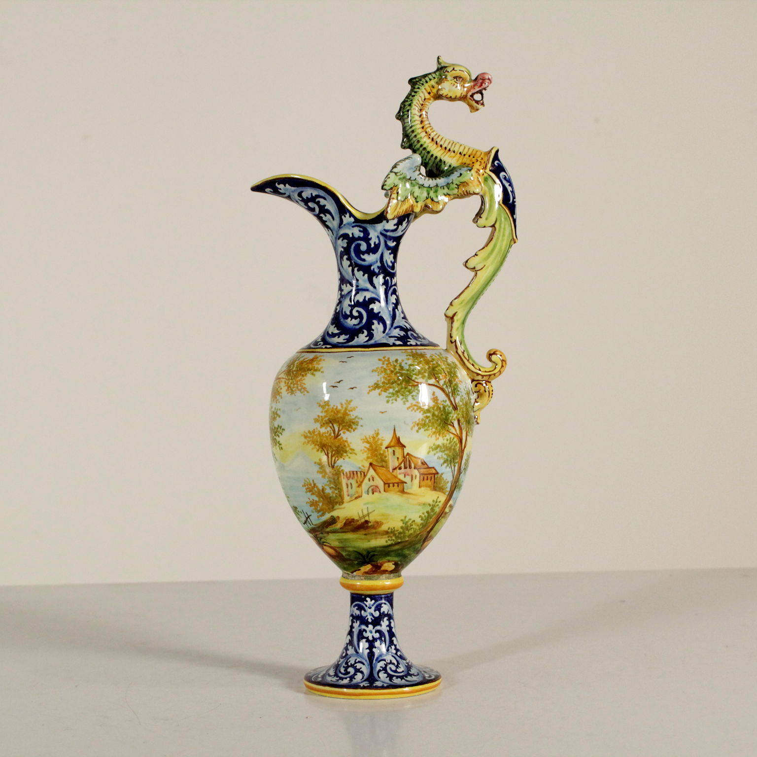 Anfora in terracotta maiolicata con ansa a foggia di grifone e corpo decorato in policromia a paesaggio. Firmato sotto la base.