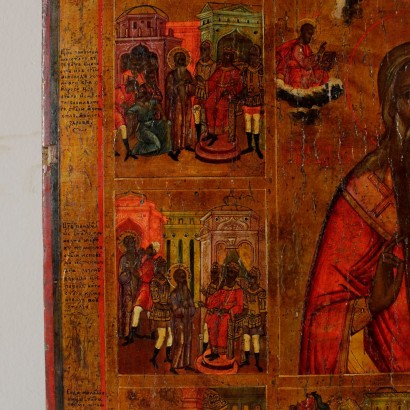 Tempera su tavola.Il Santo, noto come San Nicola di Myra o San Nicola di Bari o il Taumaturgo, è raffigurato nel riquadro centrale, contornato da scene della sua vita. Della vita del santo l'iconografia ha riprodotto numerose scene, che riguardano sia l'infanzia, che l'attività apostolica, con i miracoli e le opere di carità da lui compiuti, che la predicazione e le persecuzione di cui anch'egli fu vittima sotto Diocleziano.
