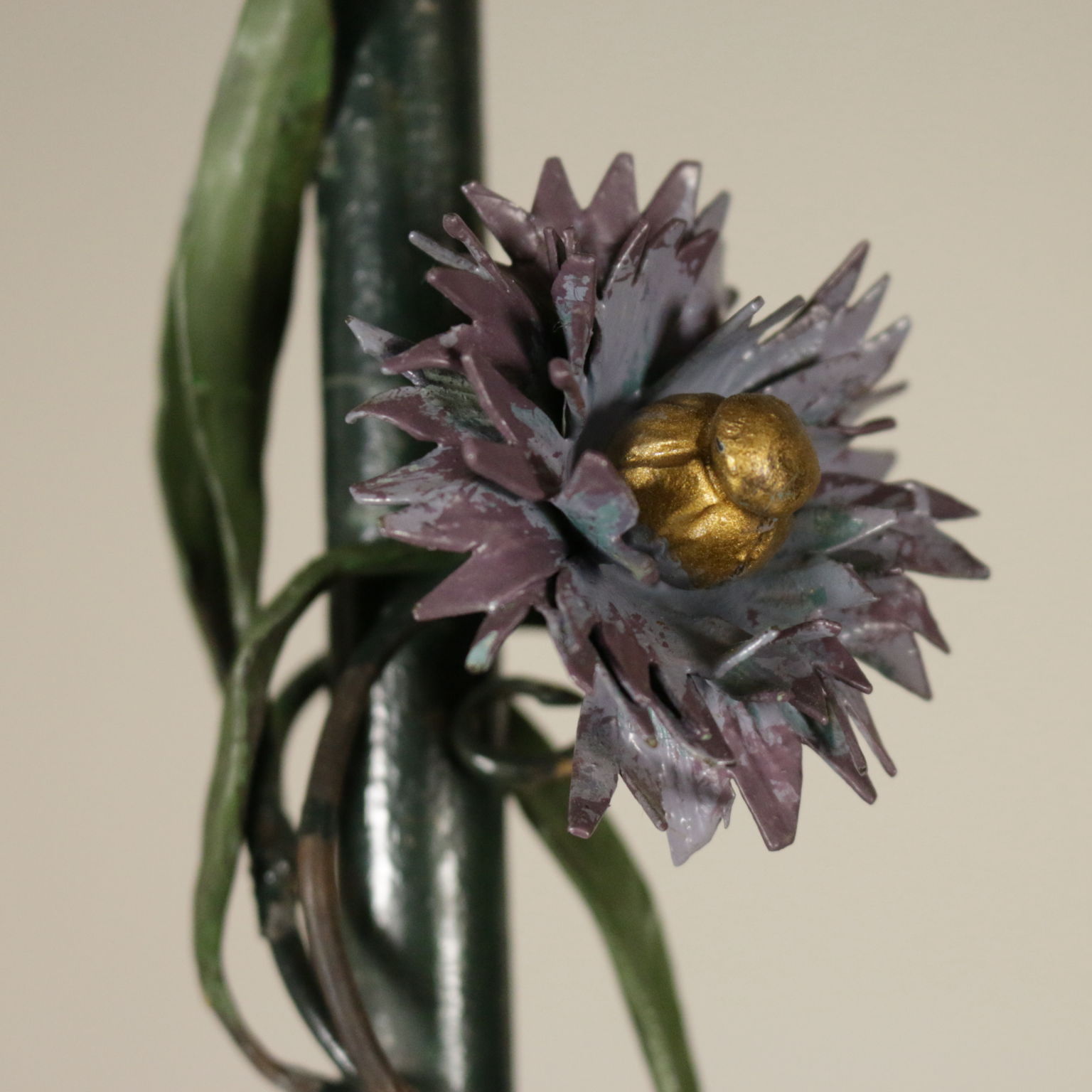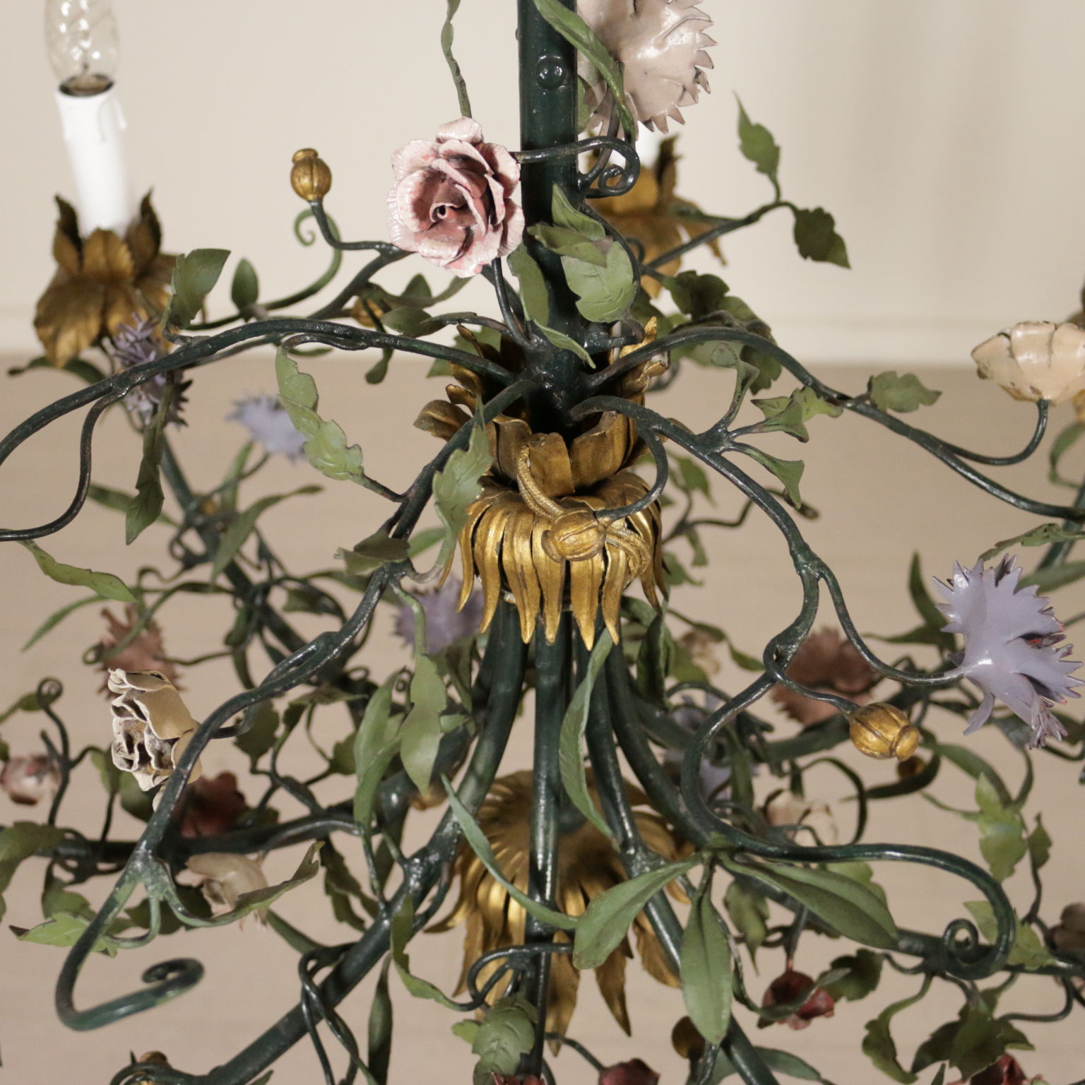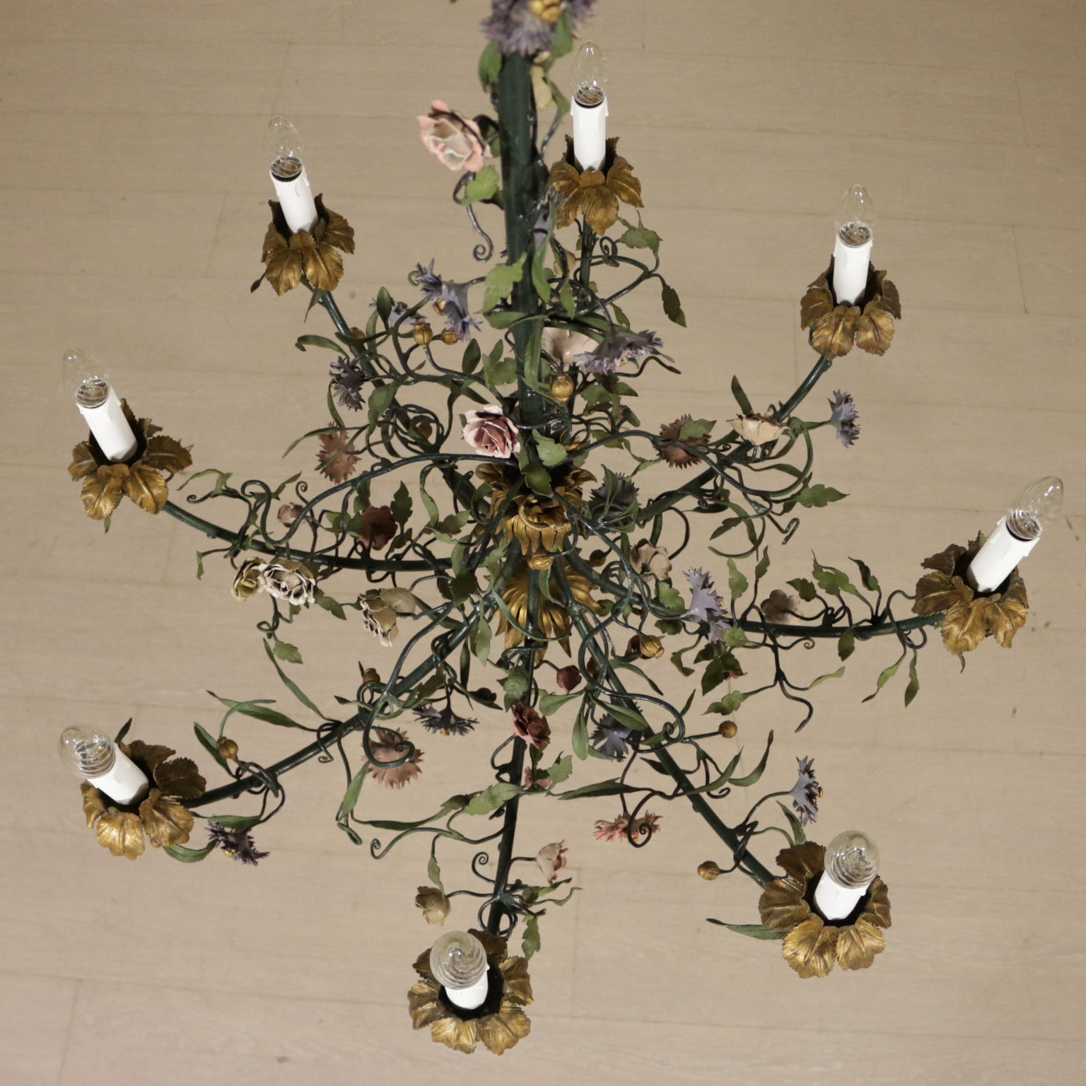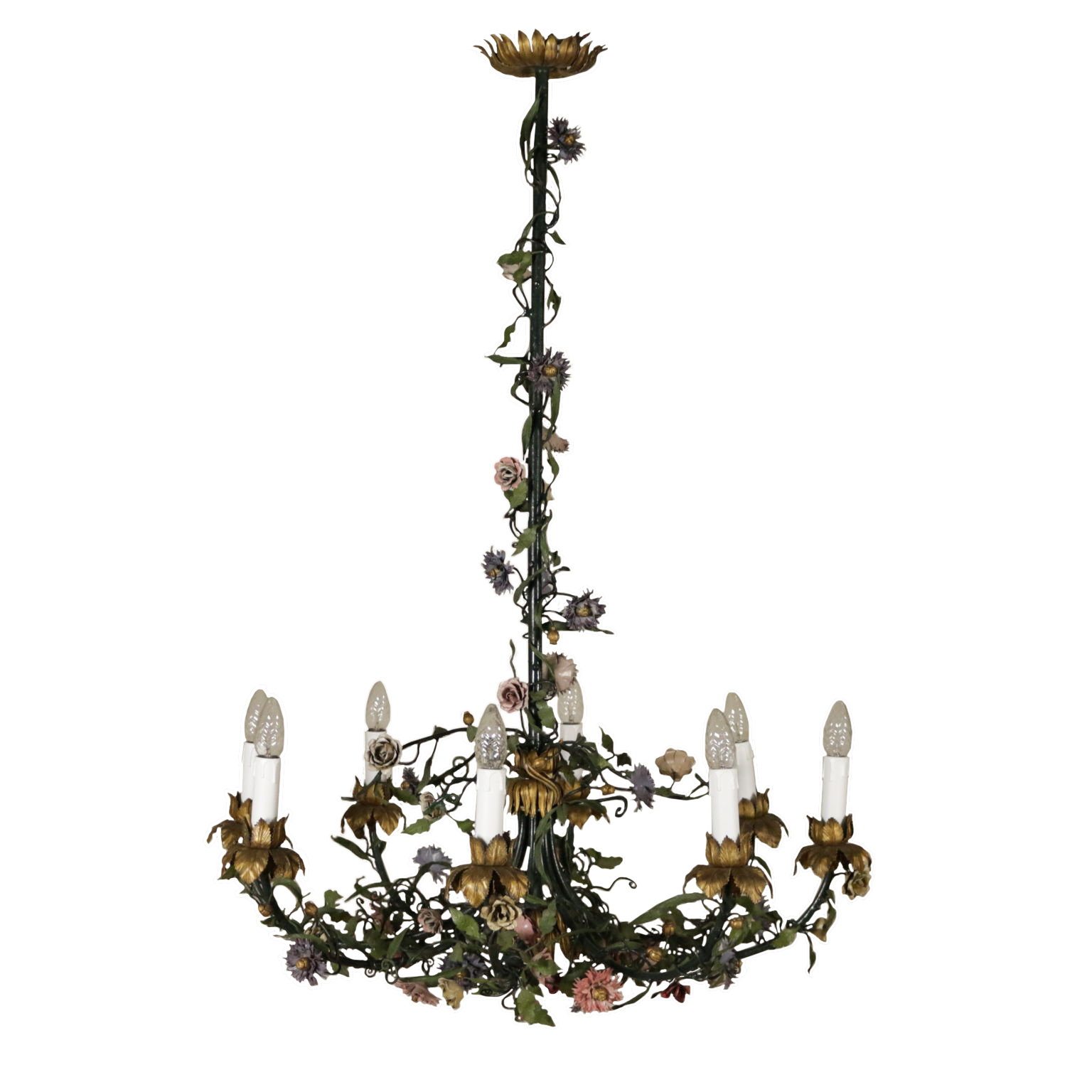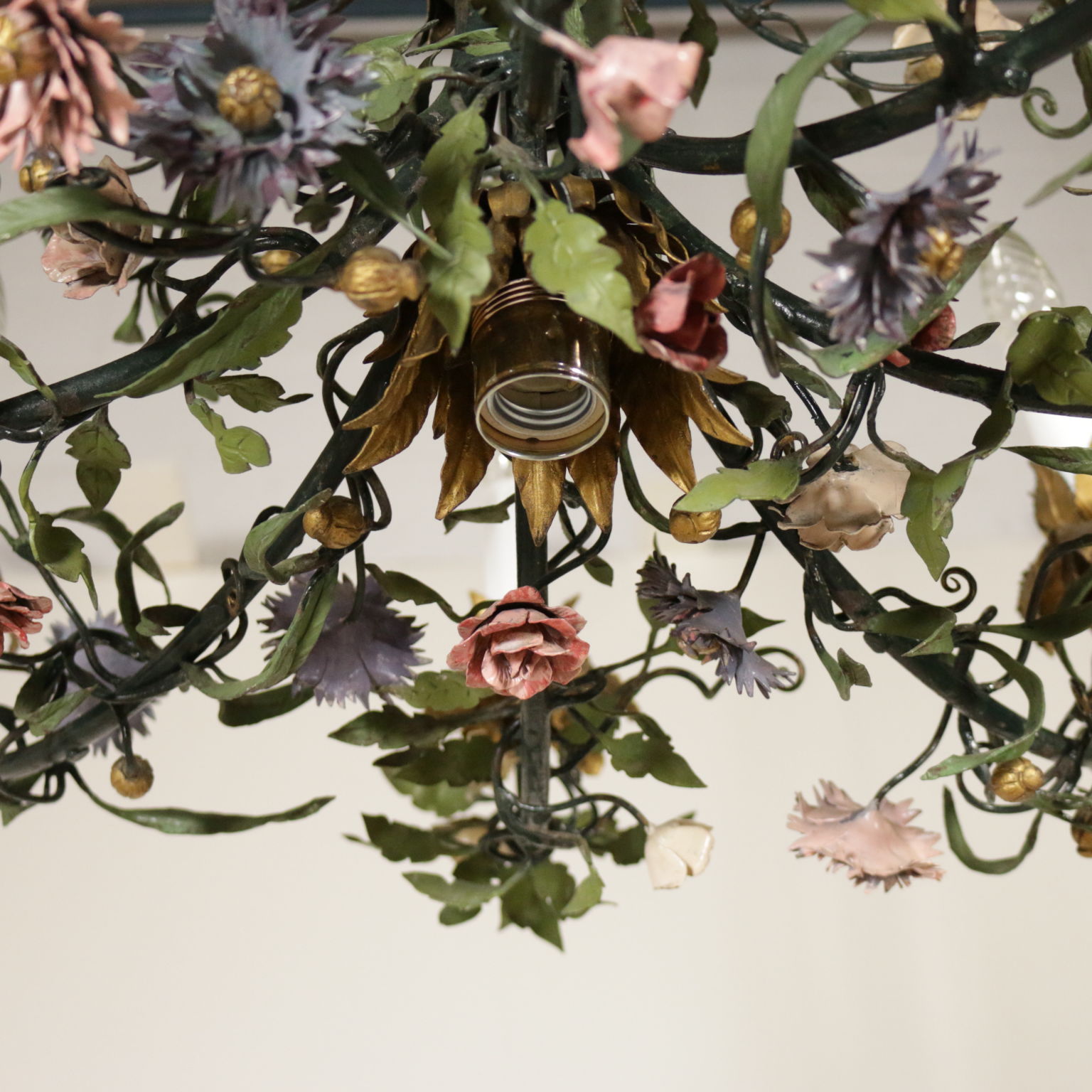 Lampadario otto bracci con decorazioni a foglie e fiori decorati in policromia. No elettrificato.