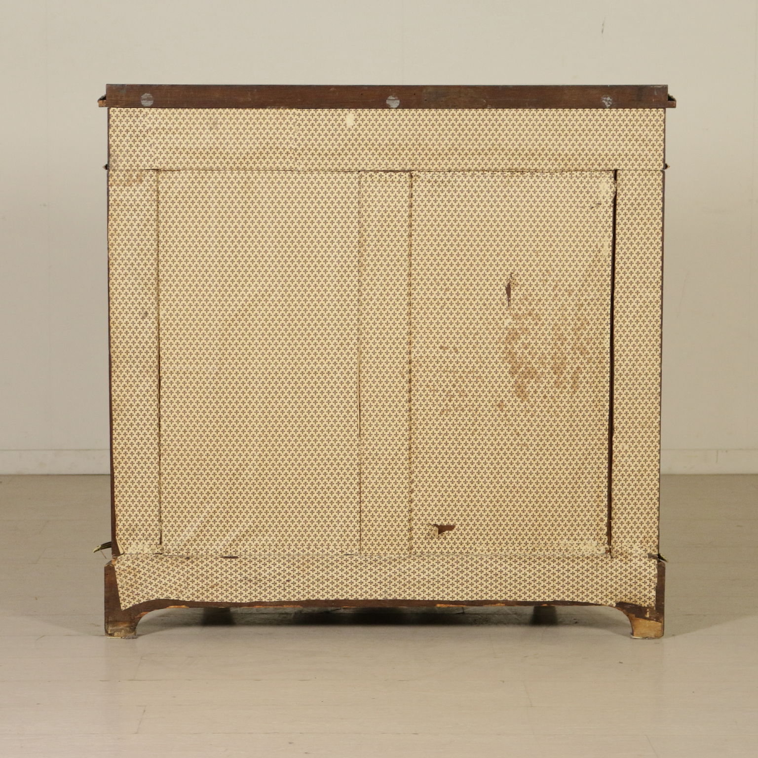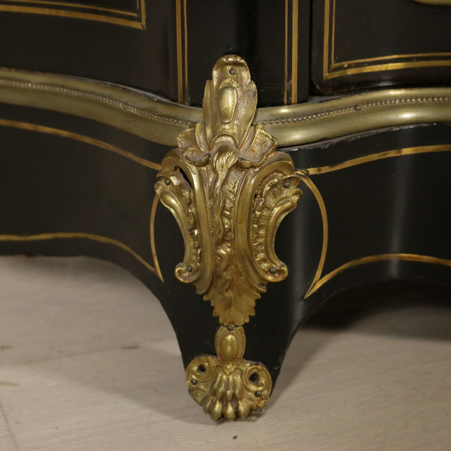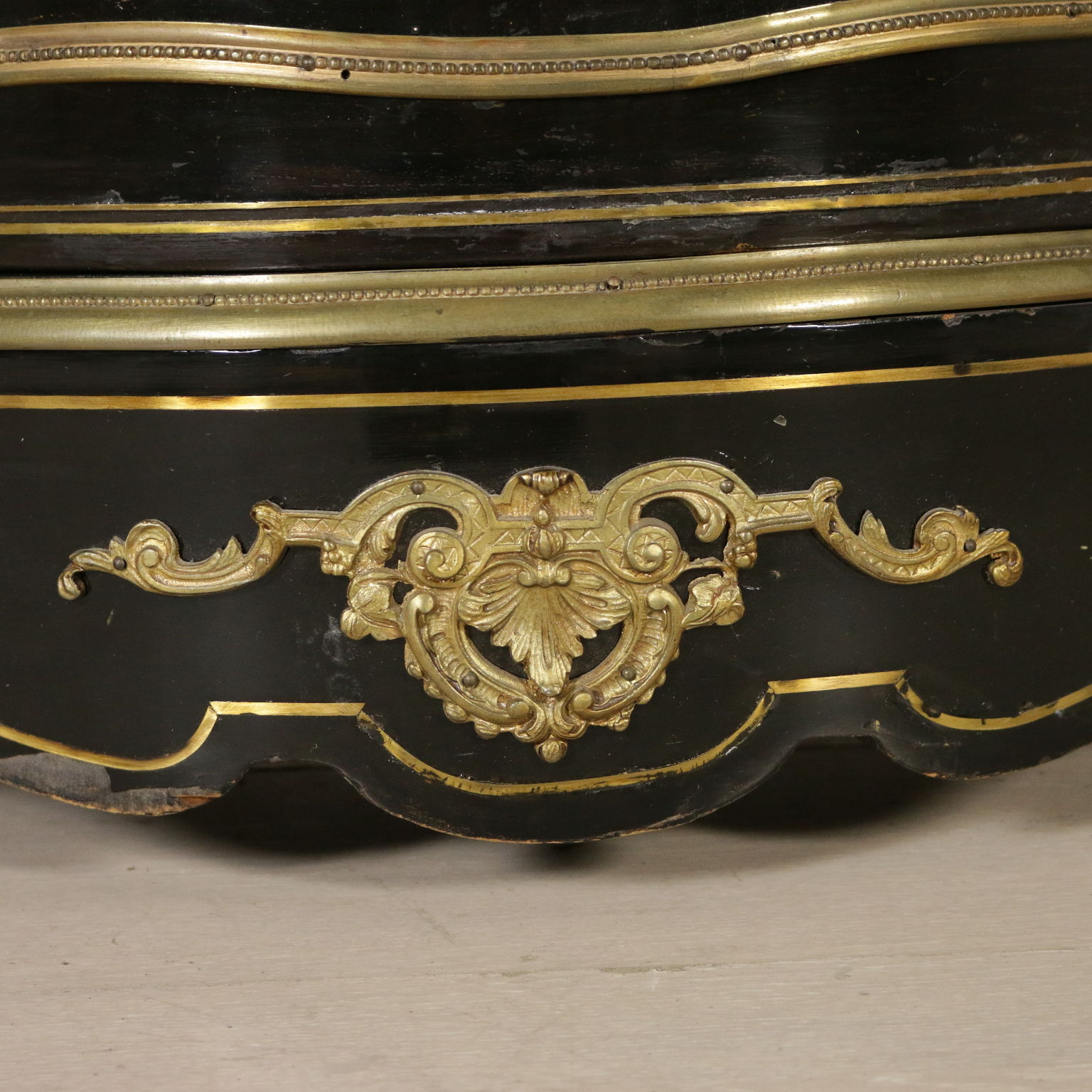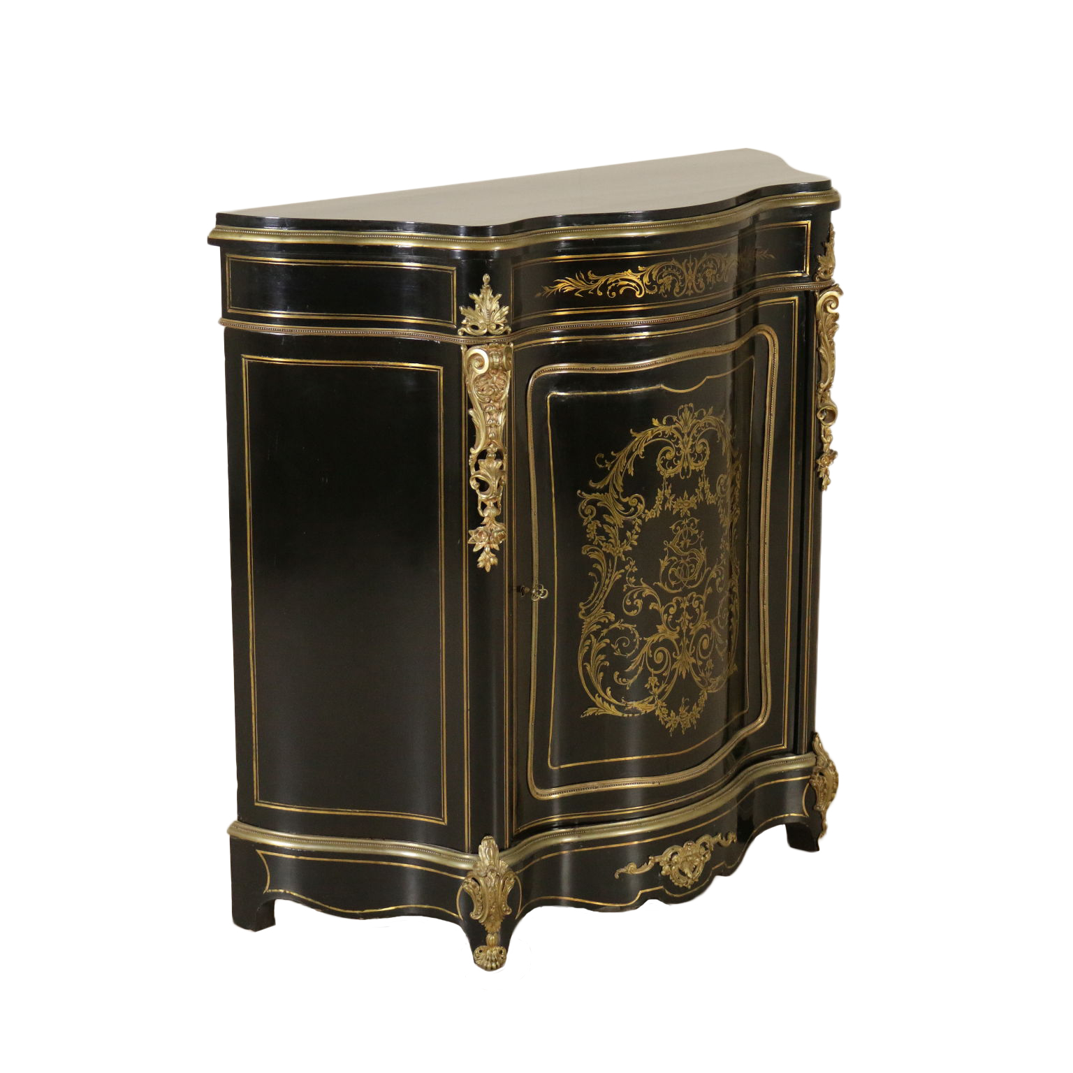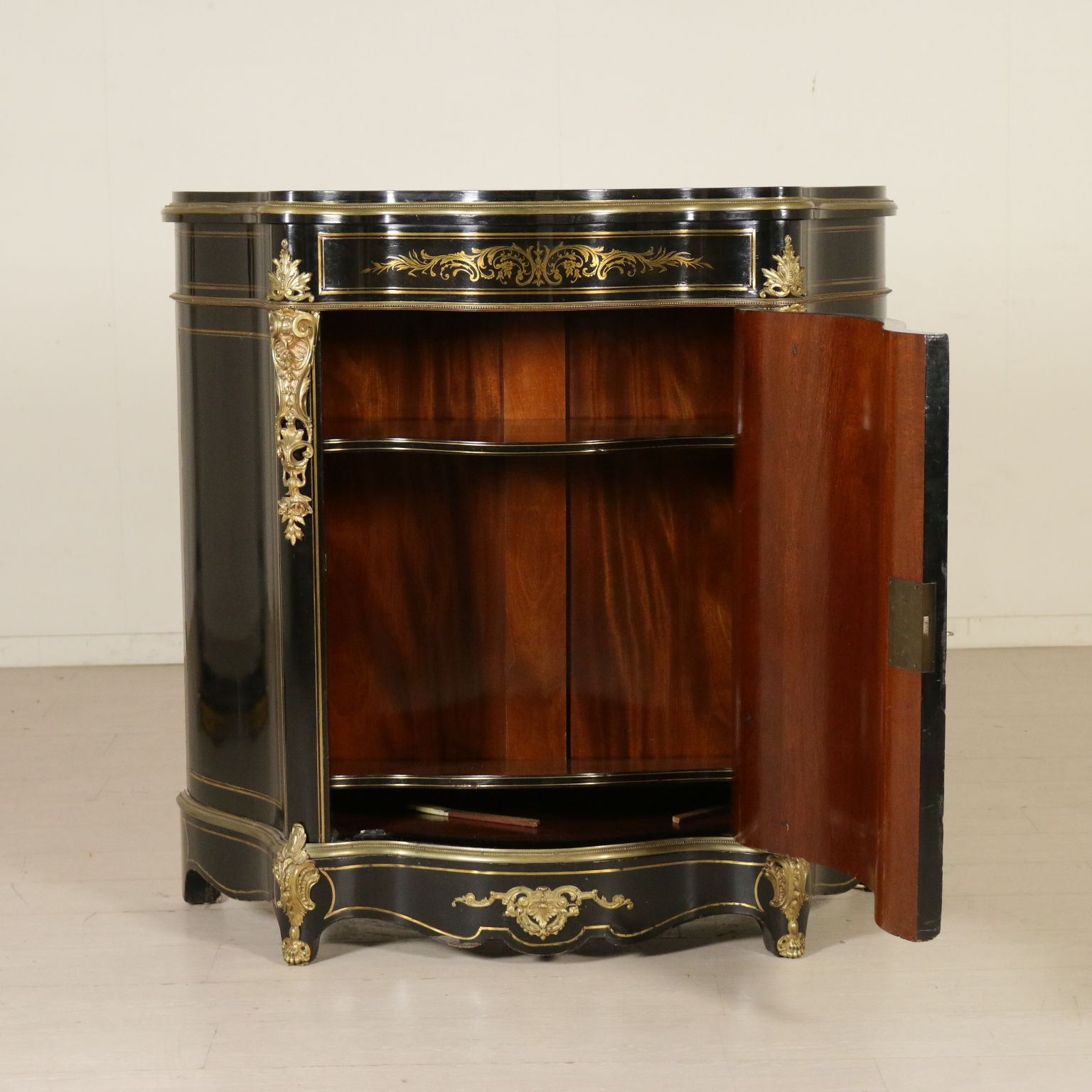 Piccola credenza Napoleone III scantonata, mossa su fronte e fianchi. Presenta un'anta e grembiale sagomato. Intarsi in ottone e arricchita da fregi e cornici in bronzo dorato. Ultimo quarto '800.