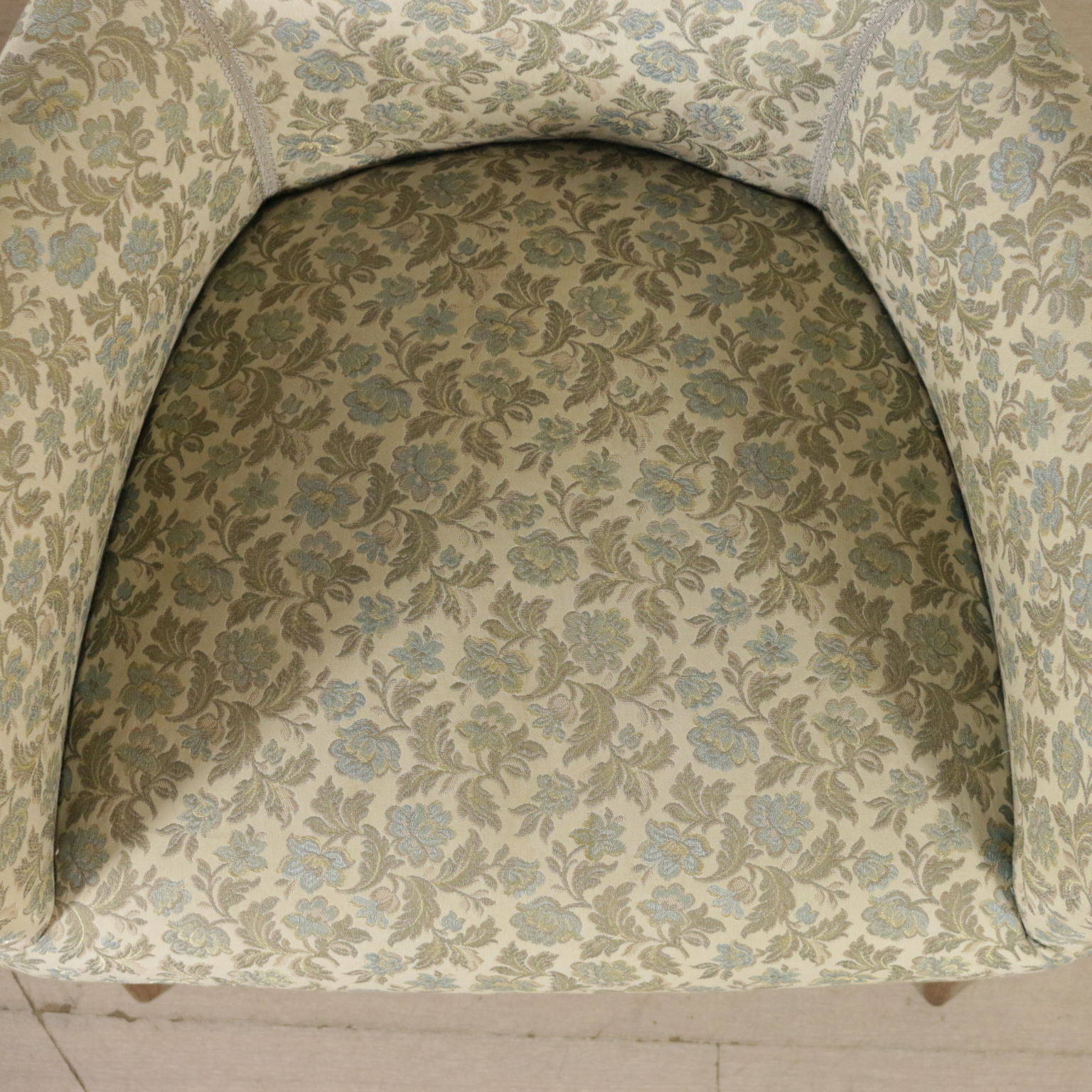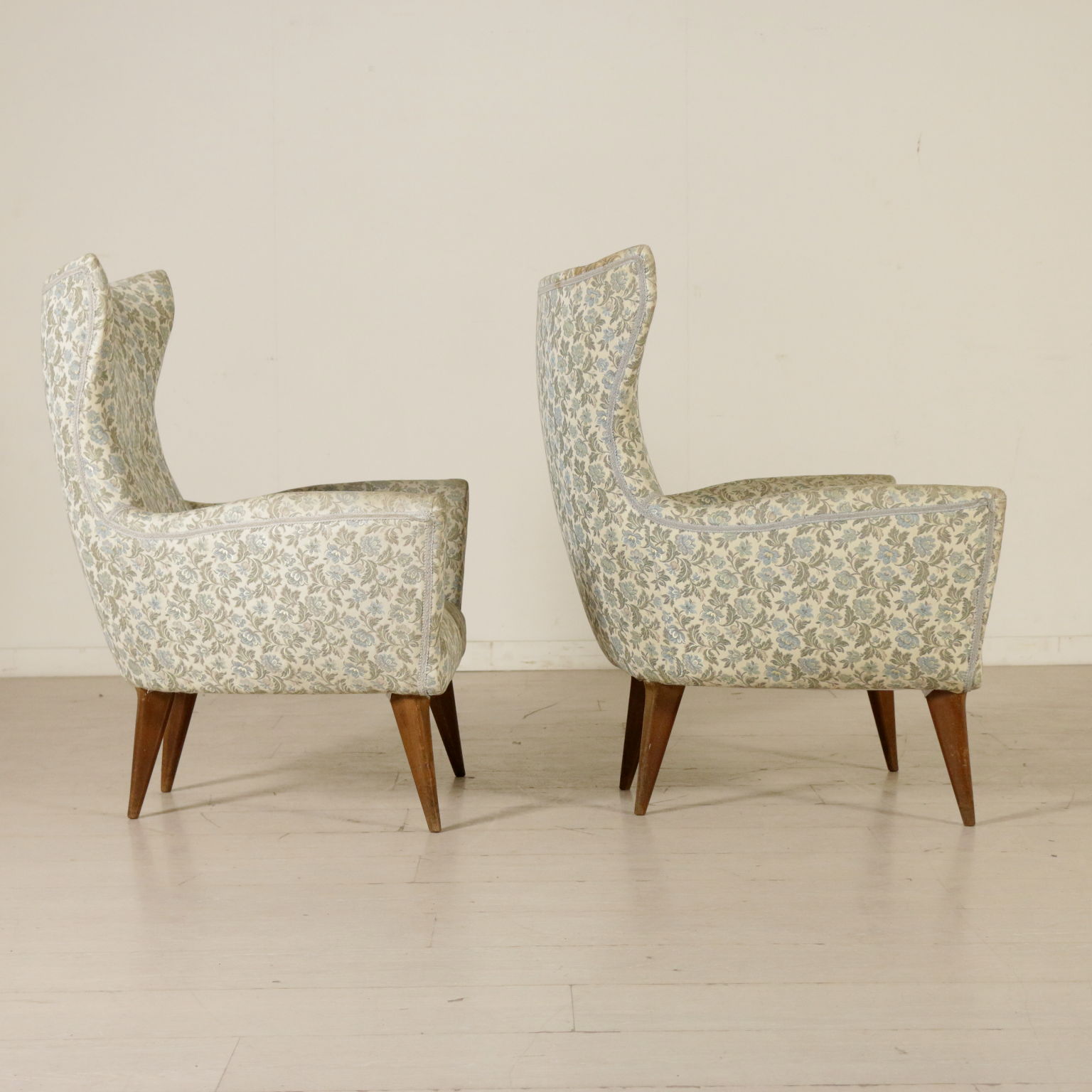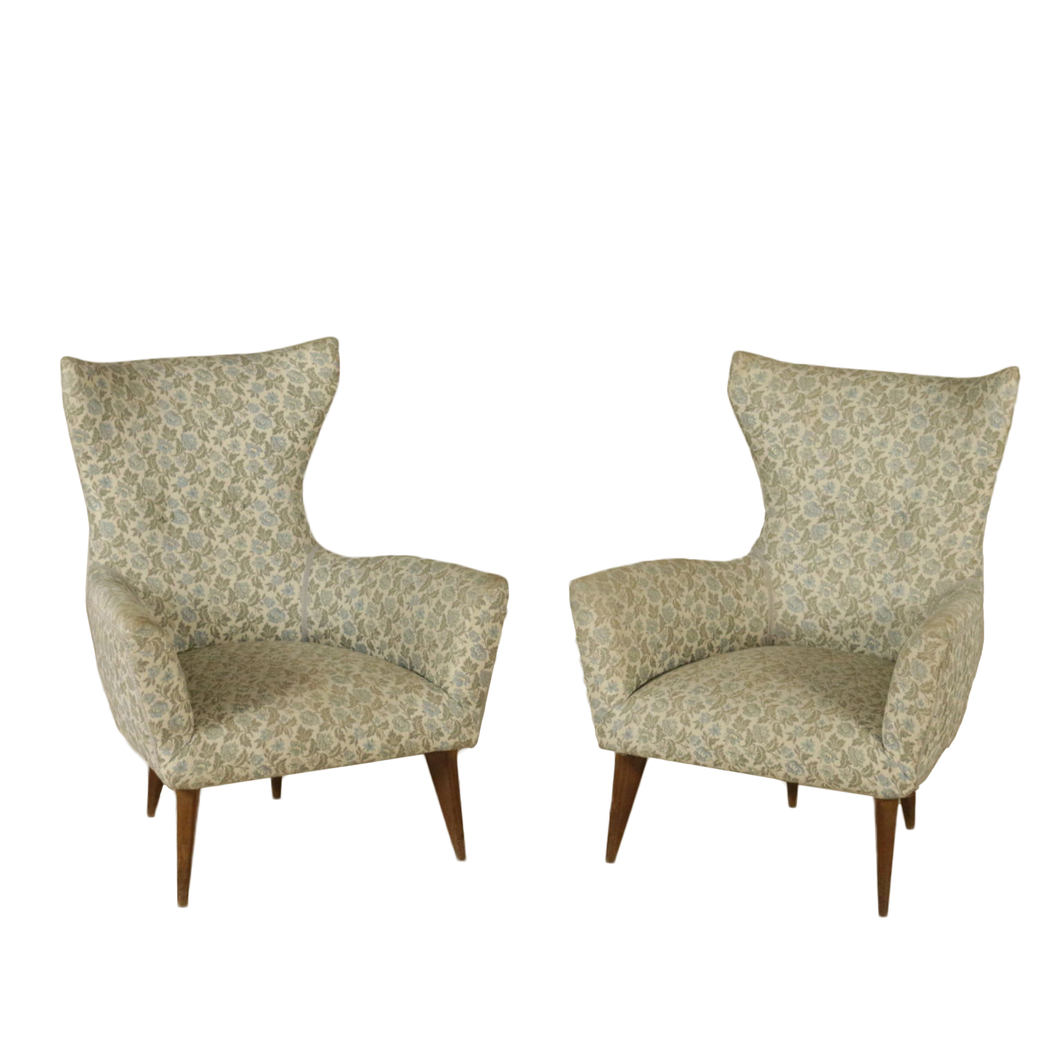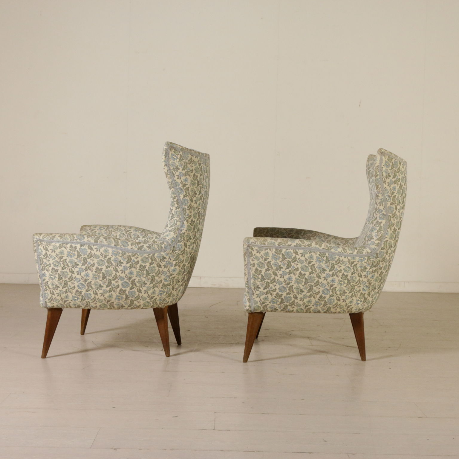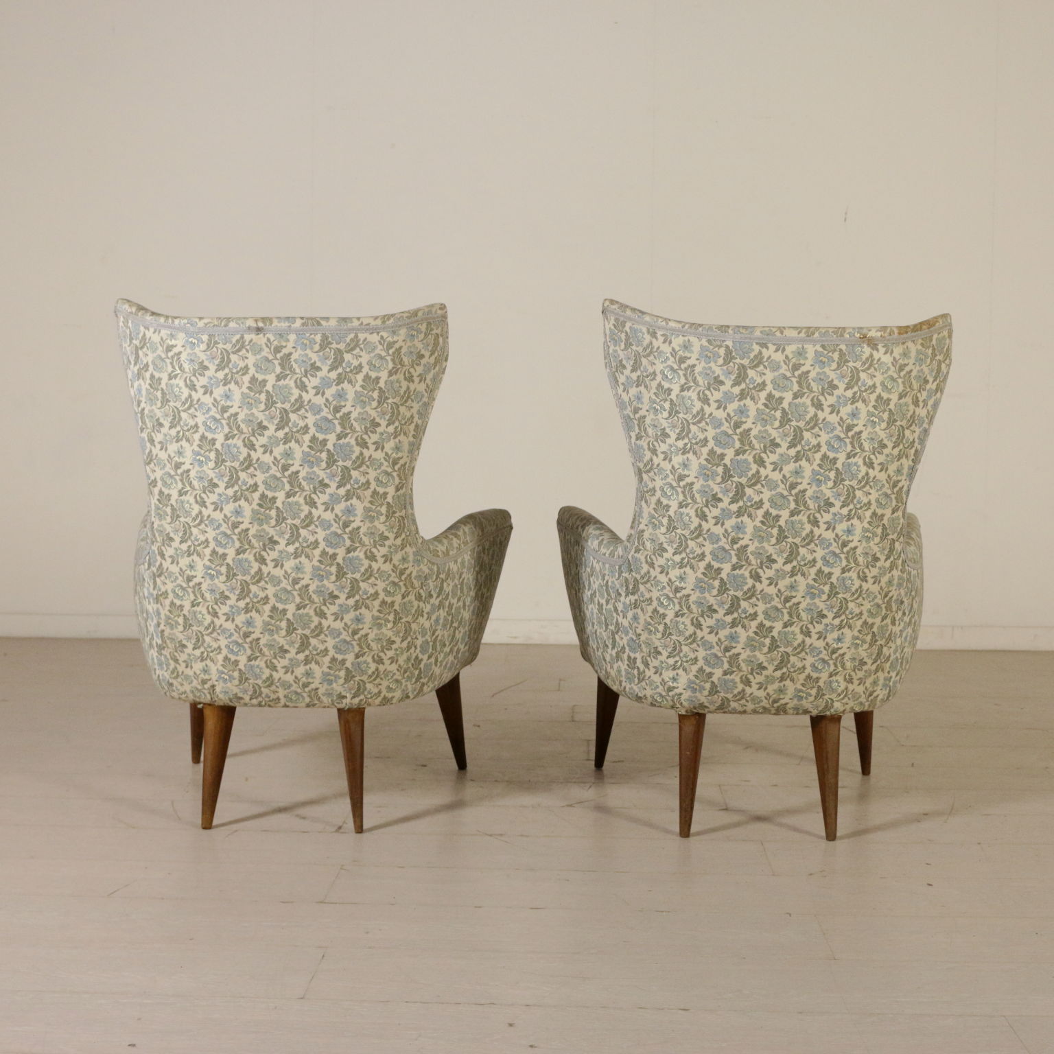 Coppia di poltrone; imbottitura a molle, rivestimento in tessuto, gambe in legno.