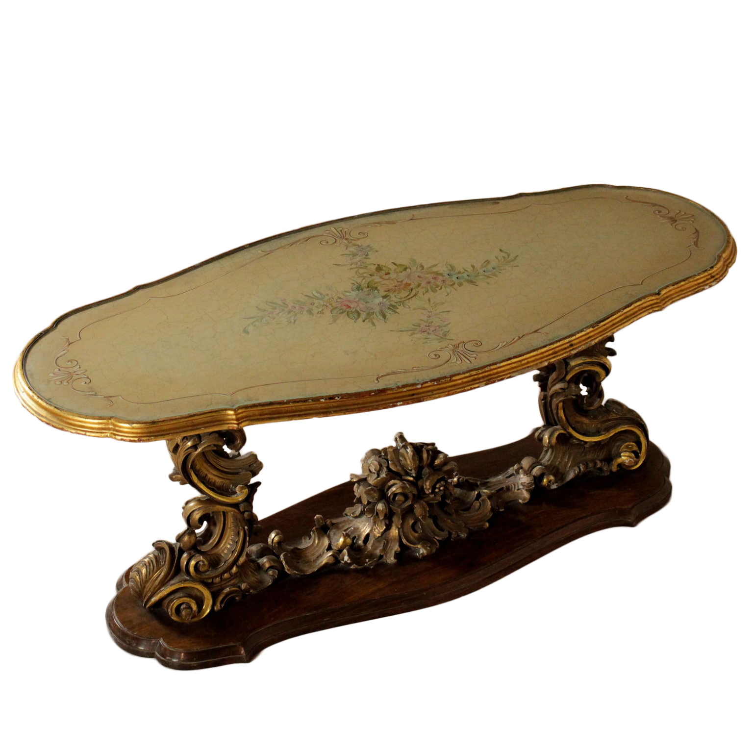 Tavolino da salotto. Retto da intagli su basamento sagomato. Piano laccato e decorato con vetro incassato.