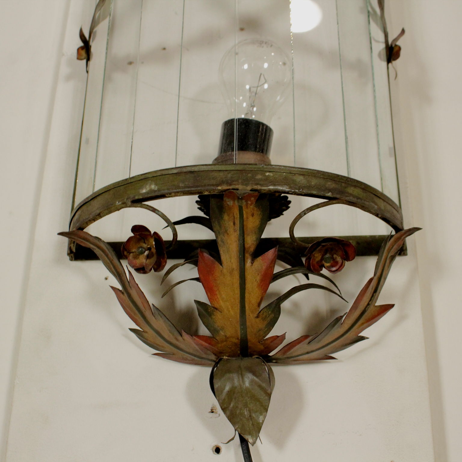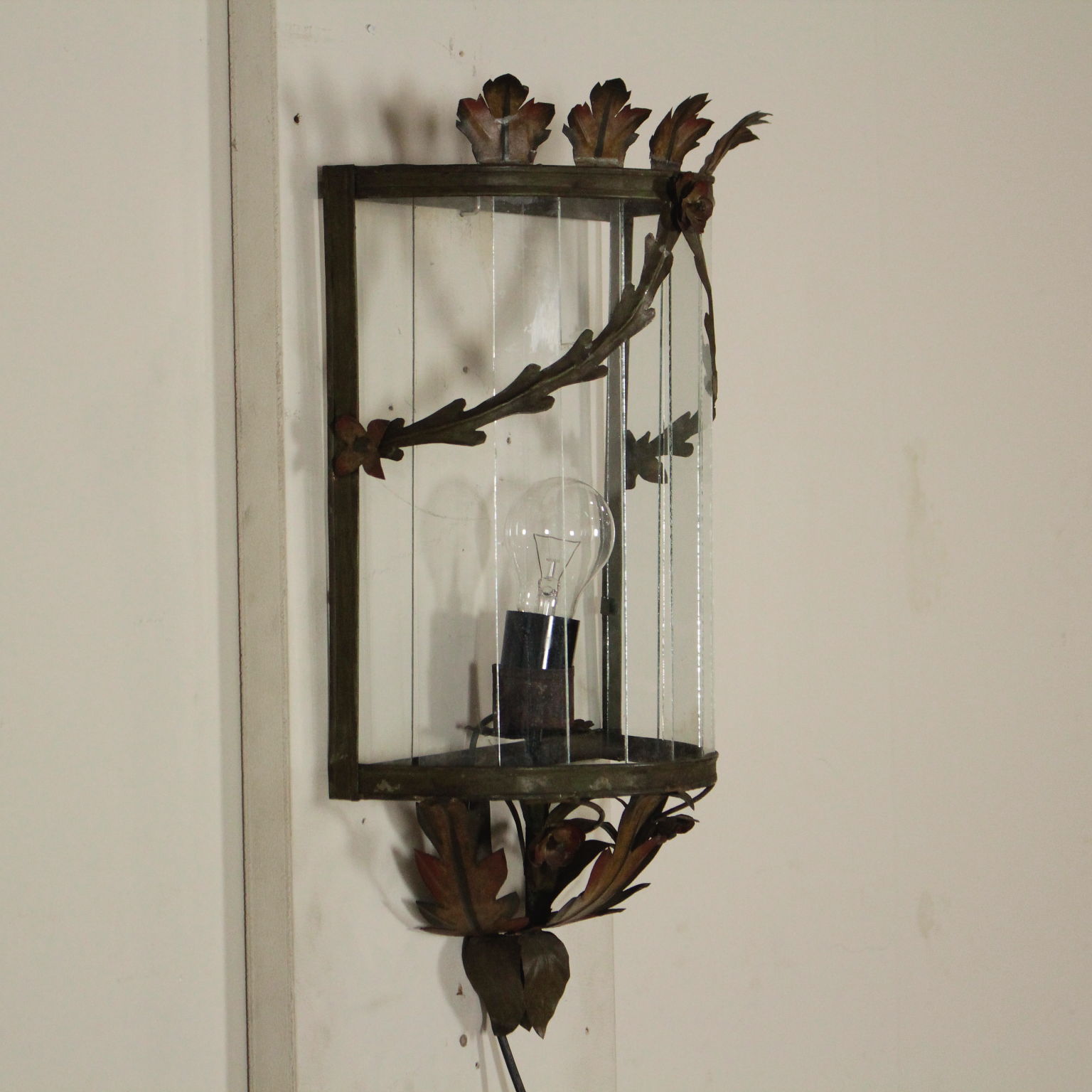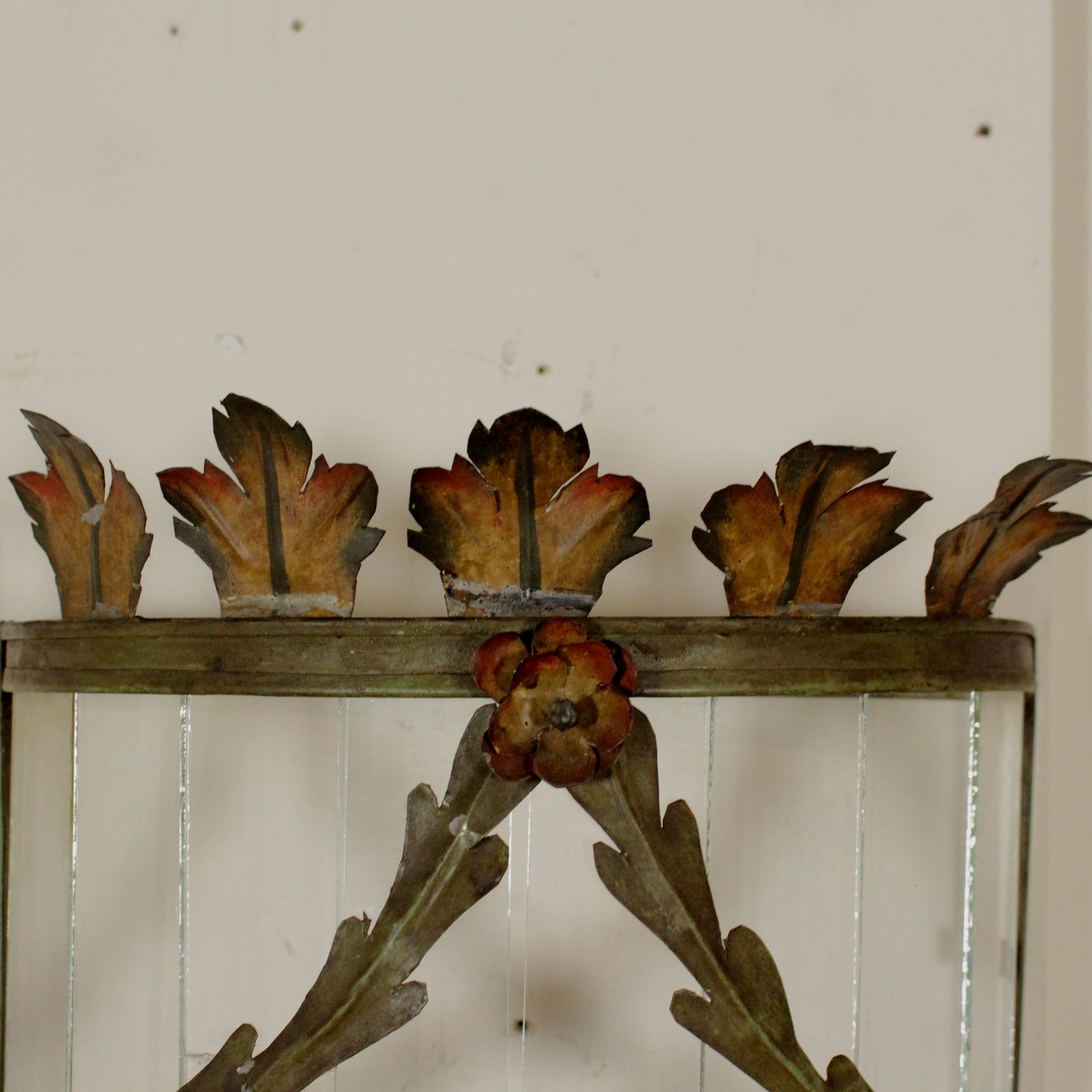 Applique semicircolare con volute fogliacee e fiori in lamierino decorato in policromia.
