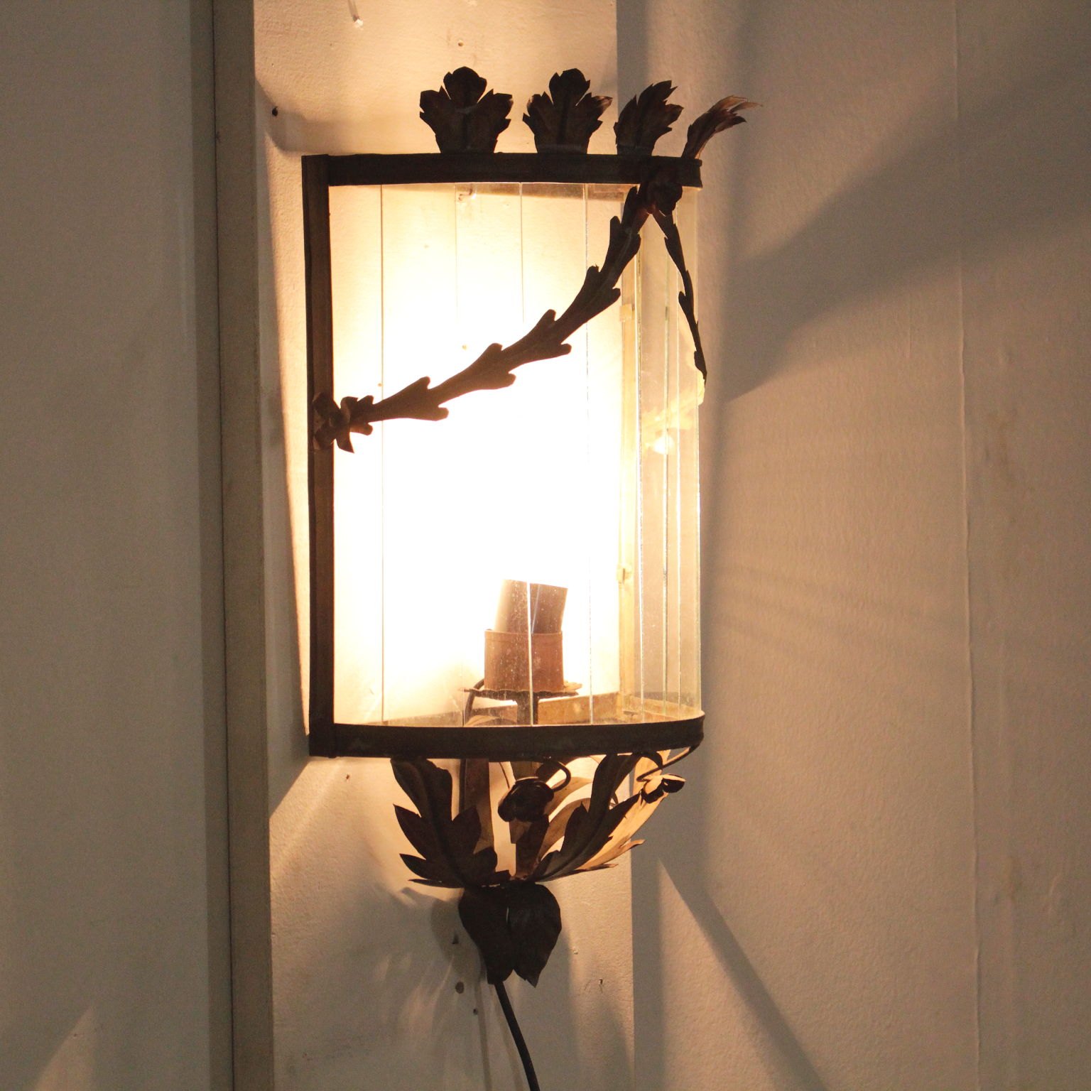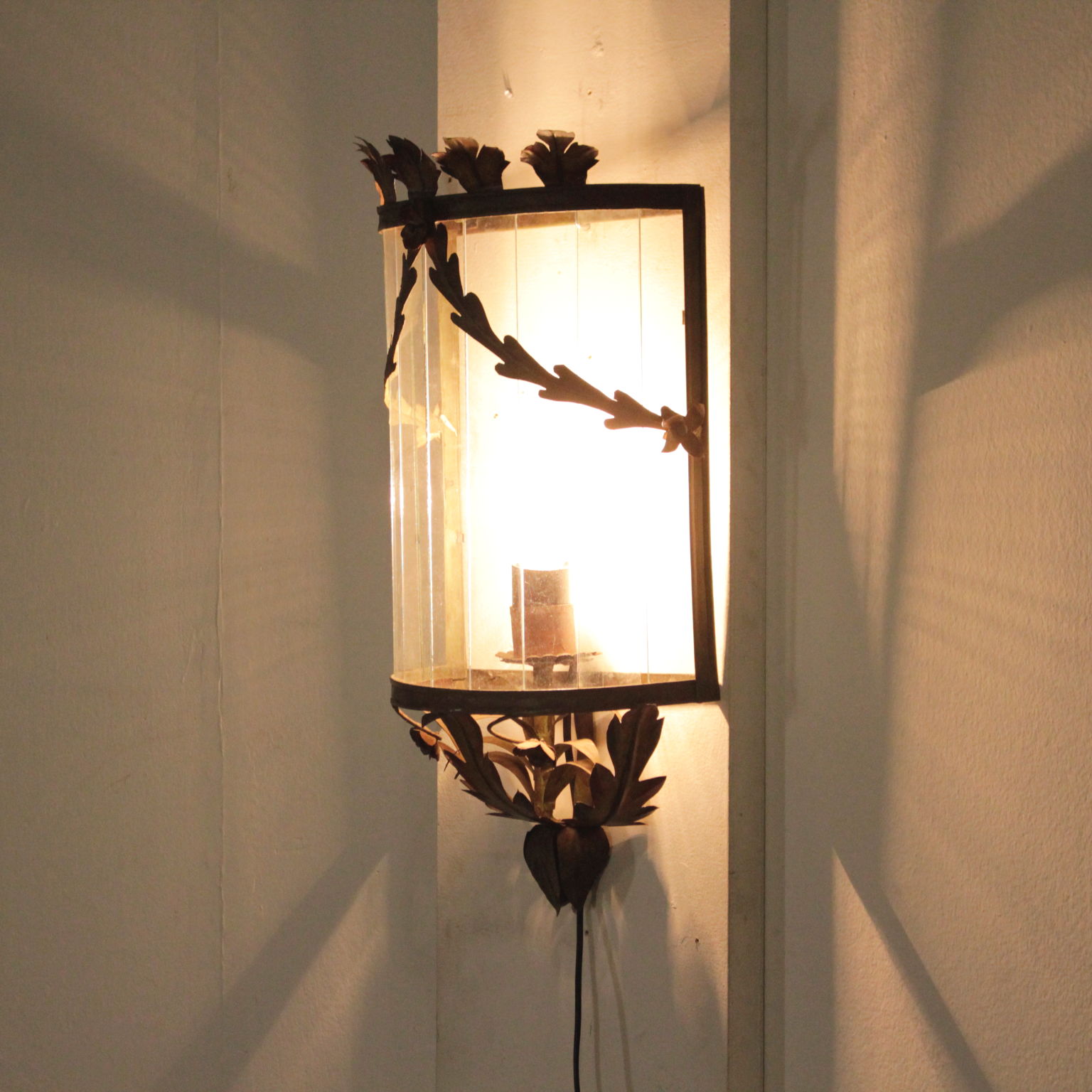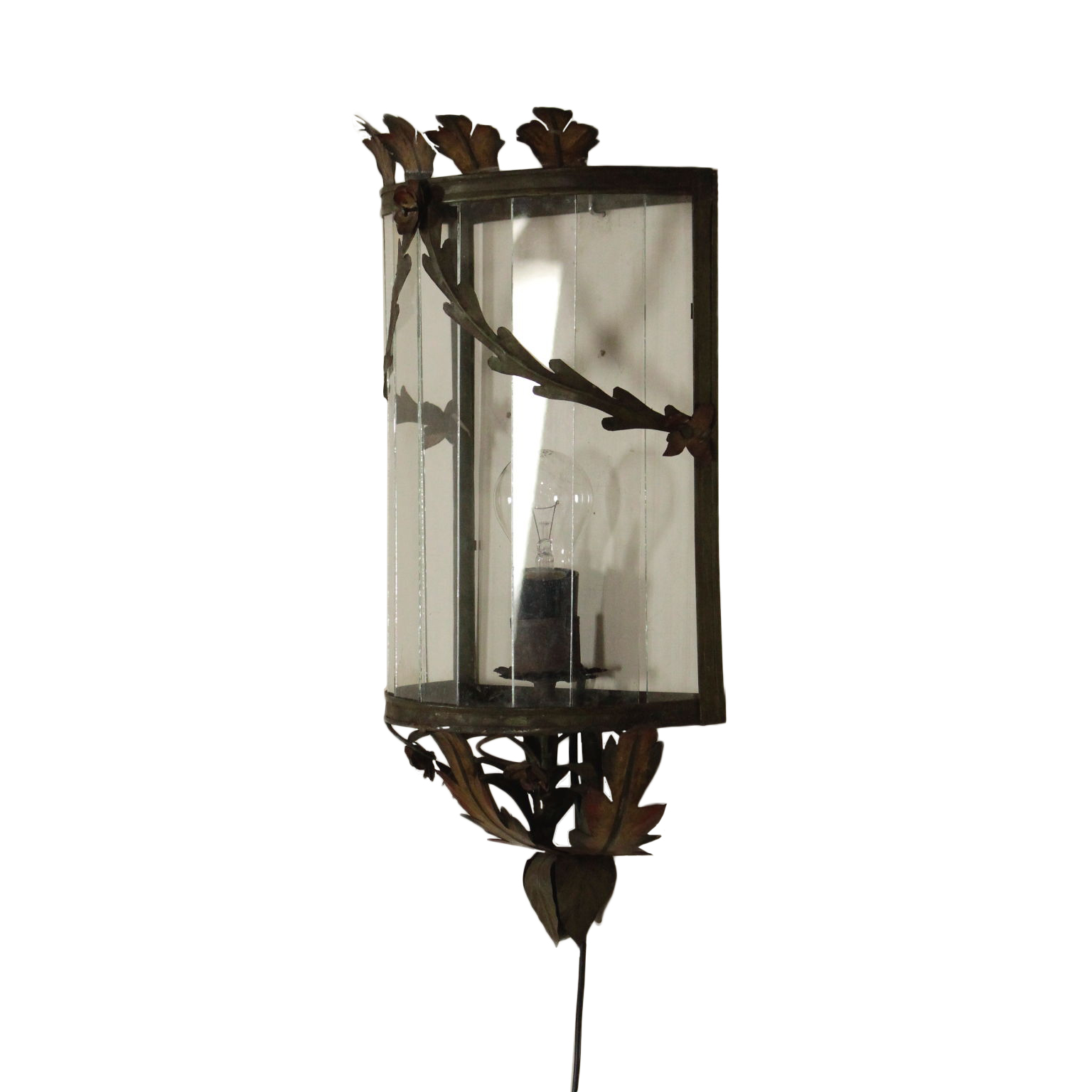Applique semicircolare con volute fogliacee e fiori in lamierino decorato in policromia.