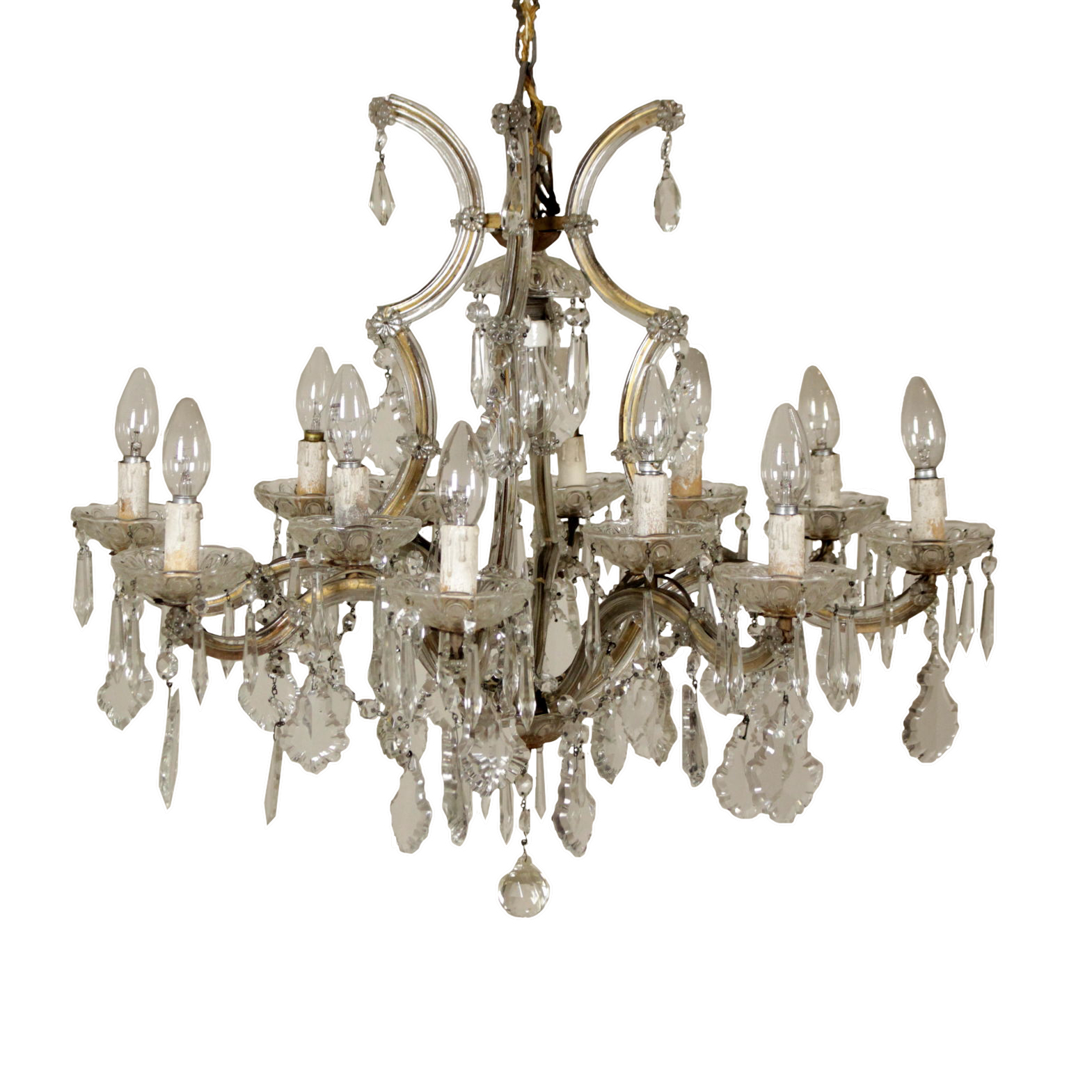 Lampadario ad otto bracci e tredici punti luce. Pendenti in cristallo. No revisionato.