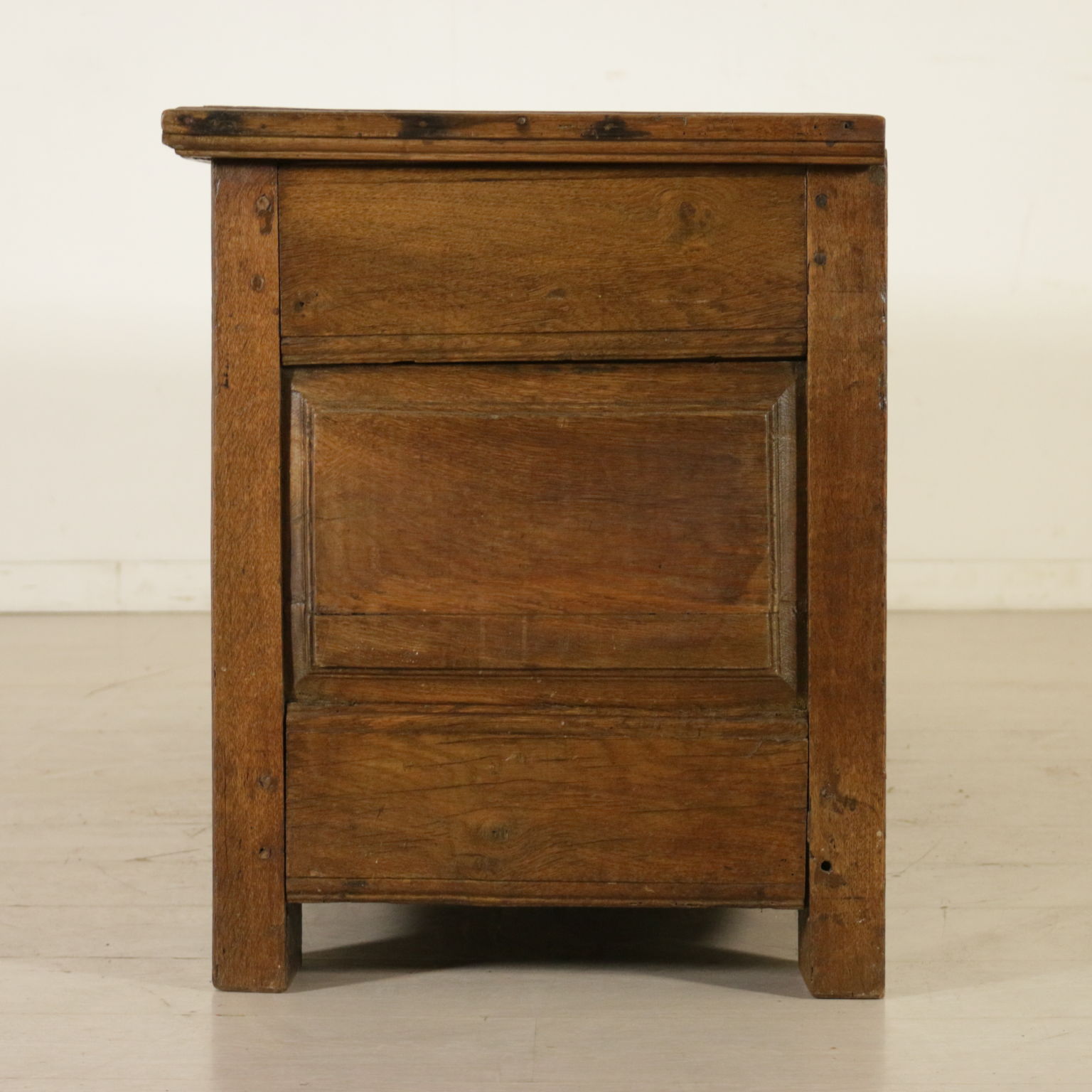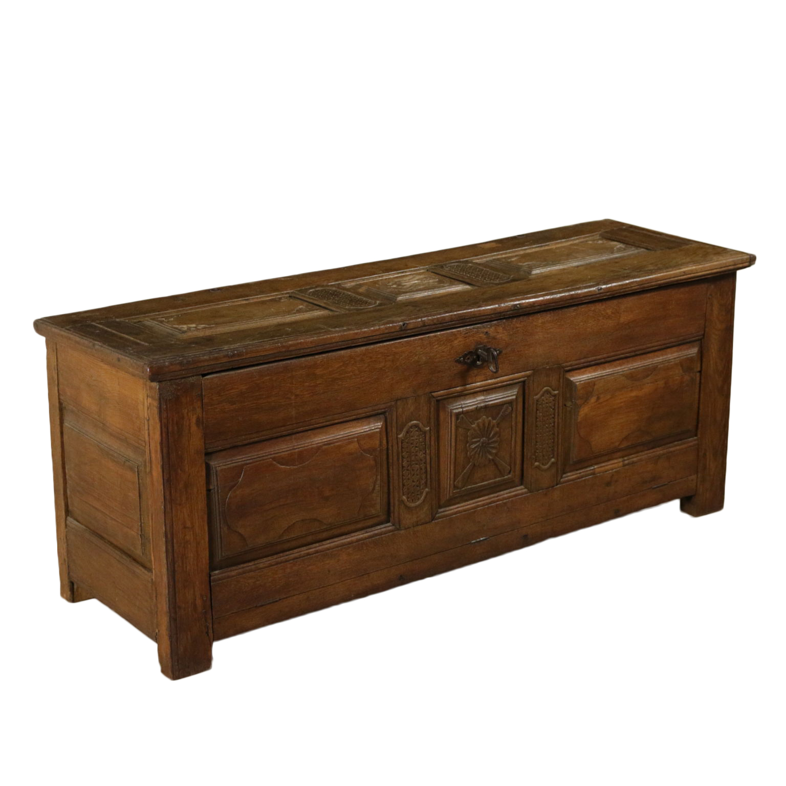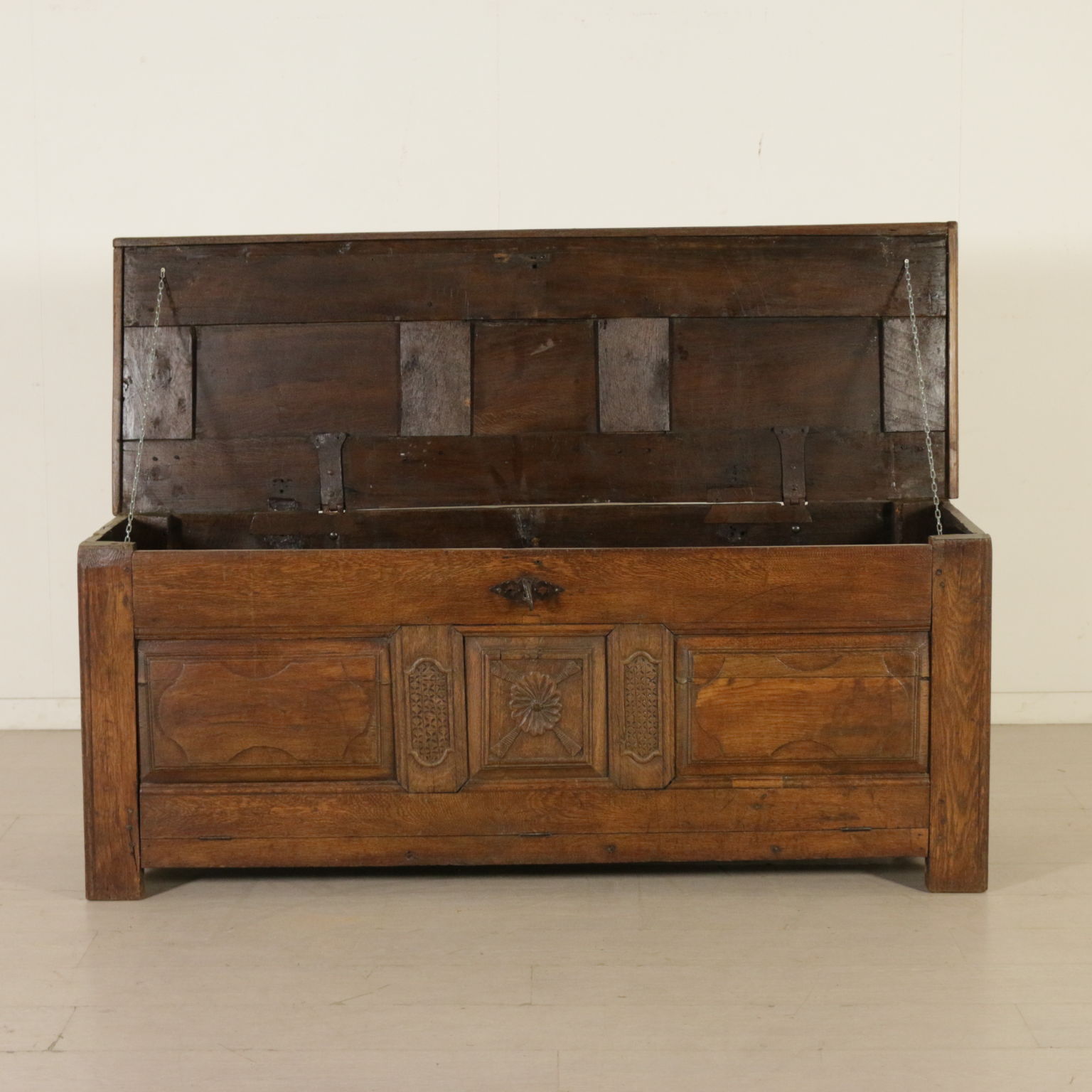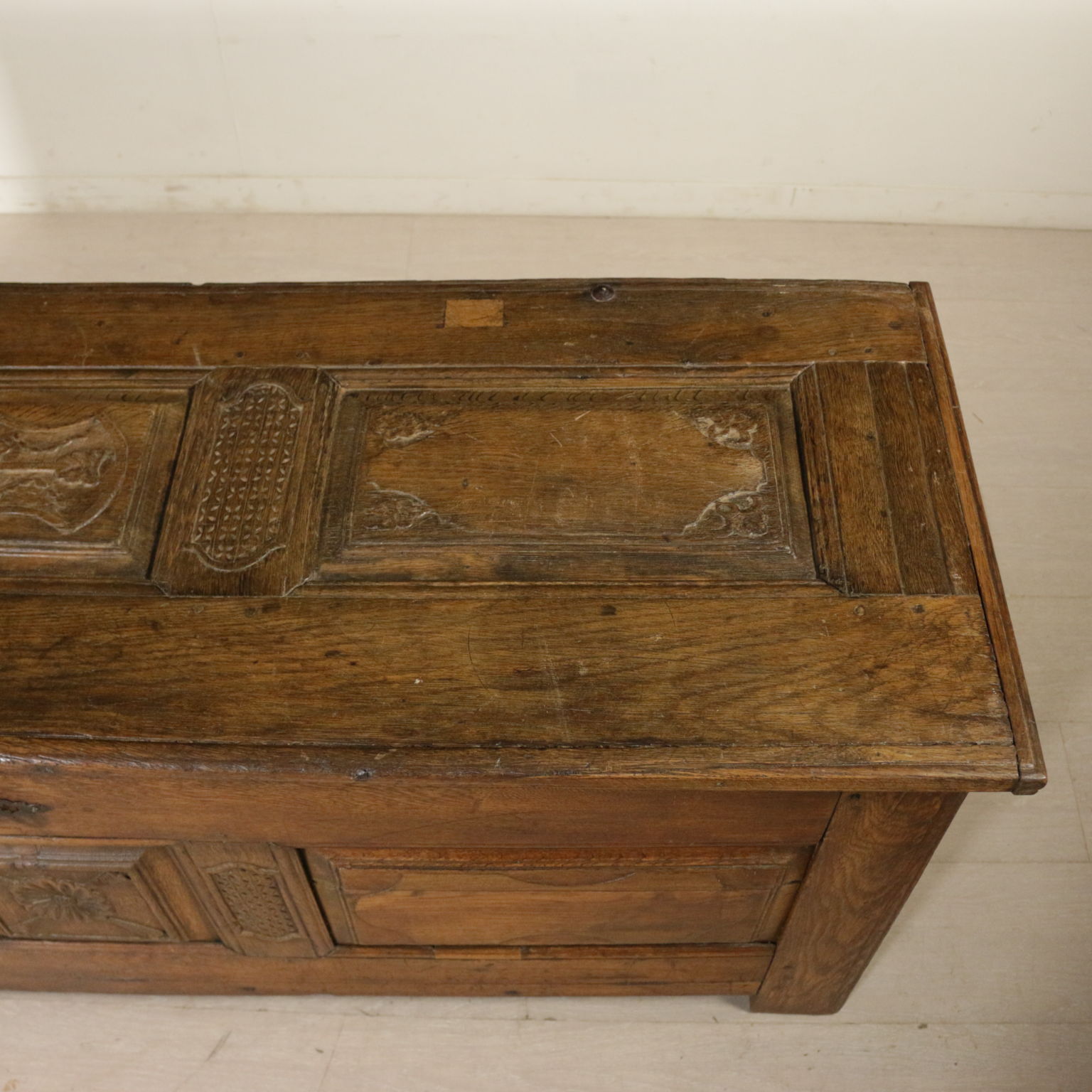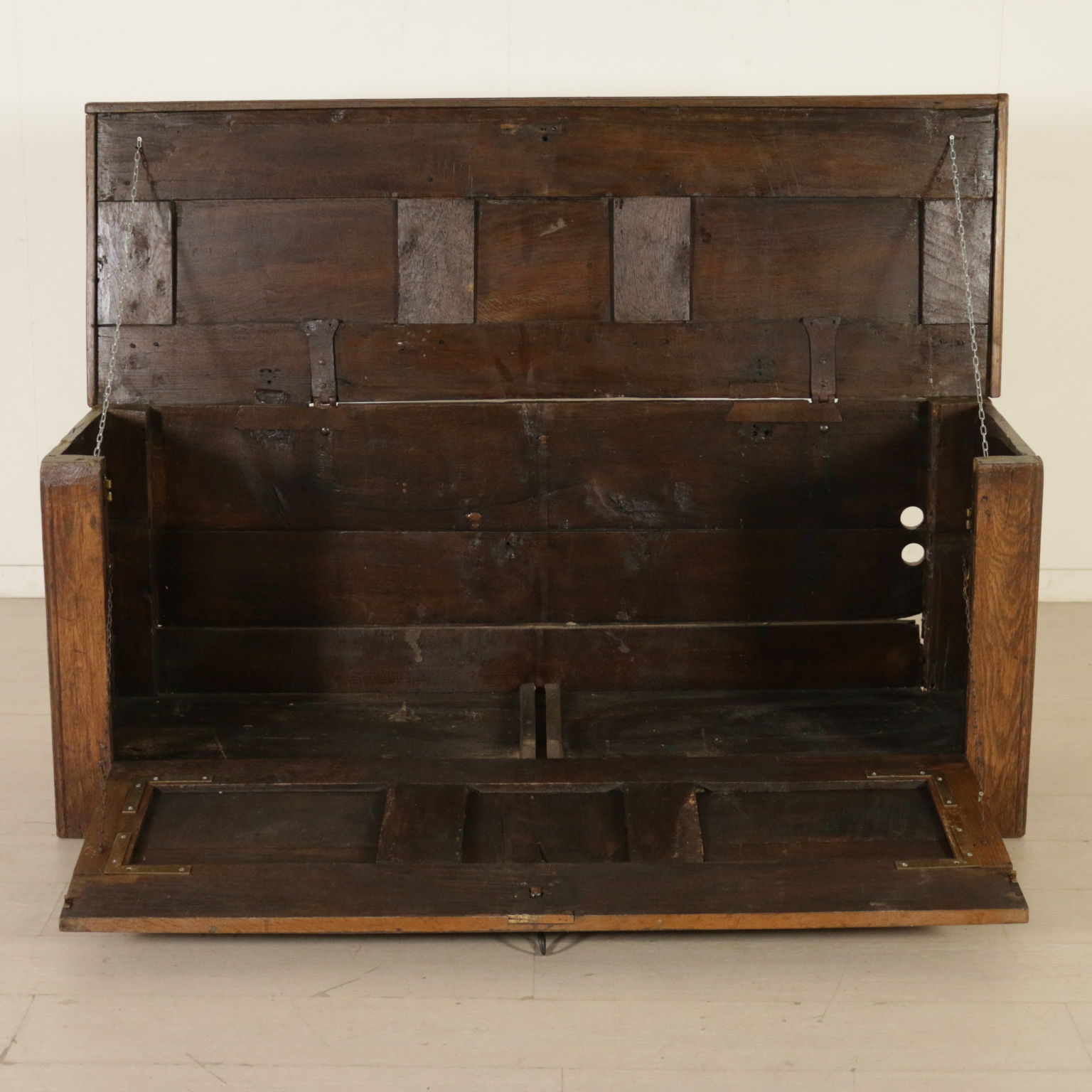 Cassapanca modificata ed ora apribile a ribalta anche sul fronte. Presenta formelle intagliate e piano apribile.