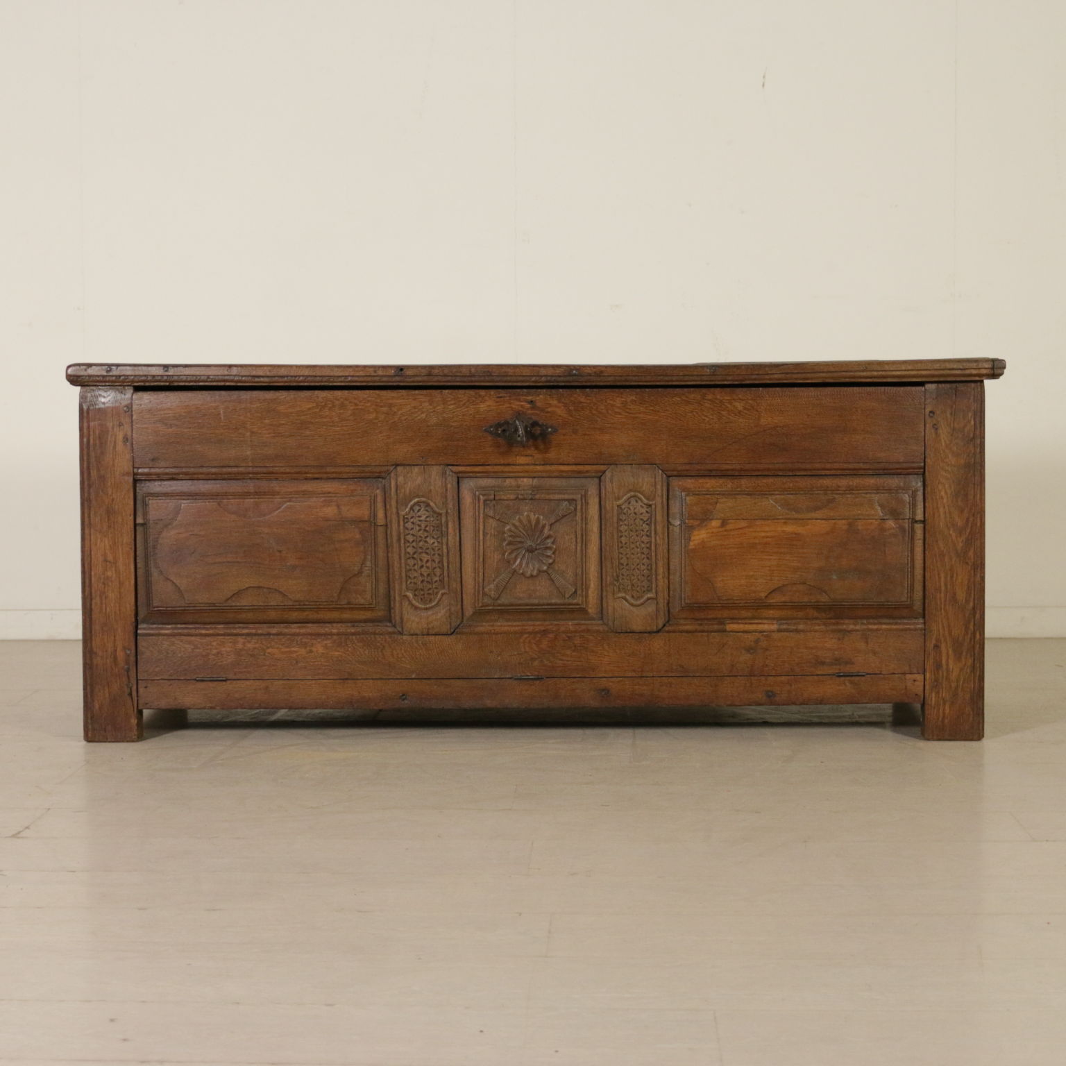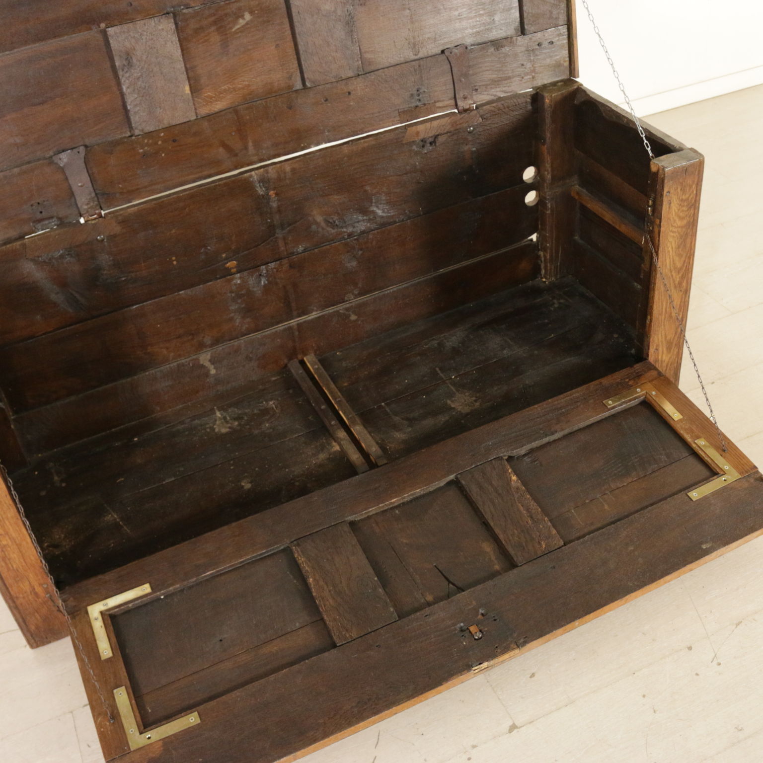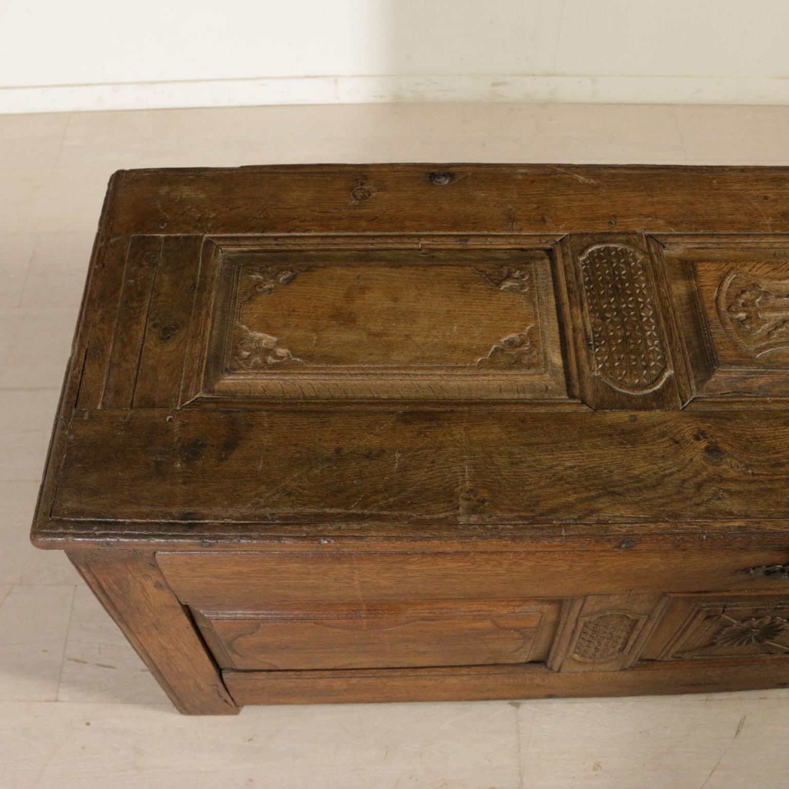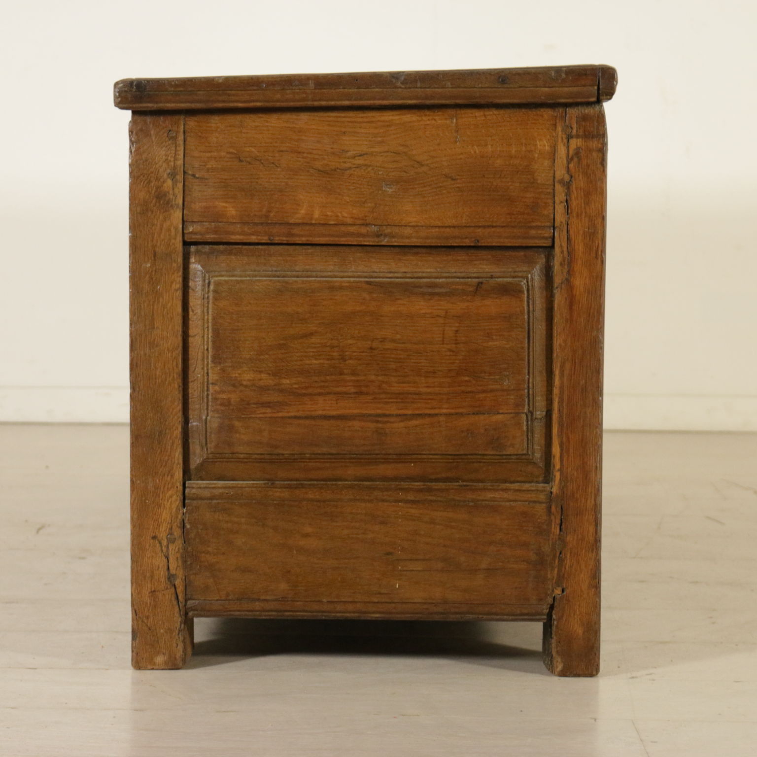 Cassapanca modificata ed ora apribile a ribalta anche sul fronte. Presenta formelle intagliate e piano apribile.