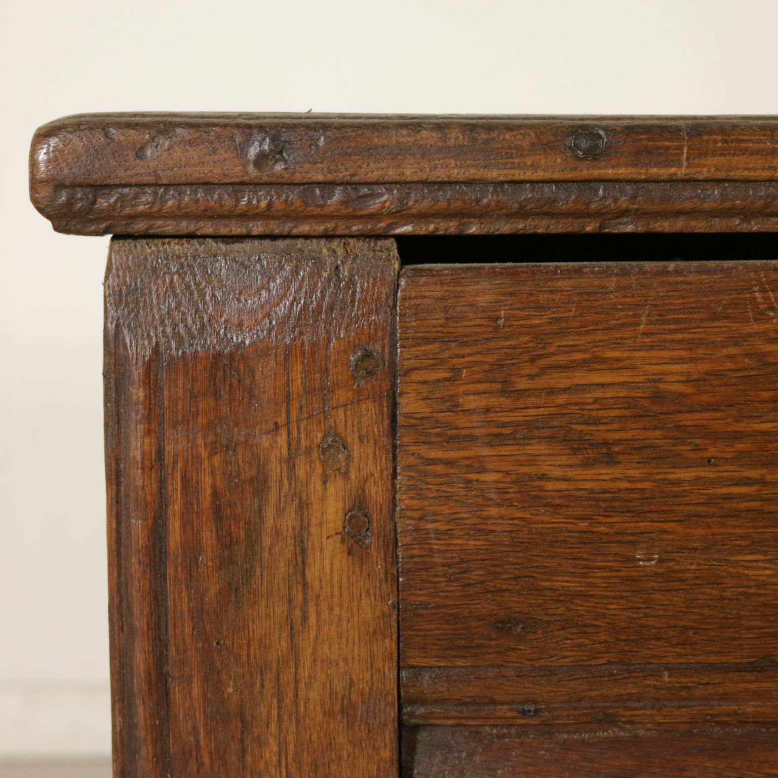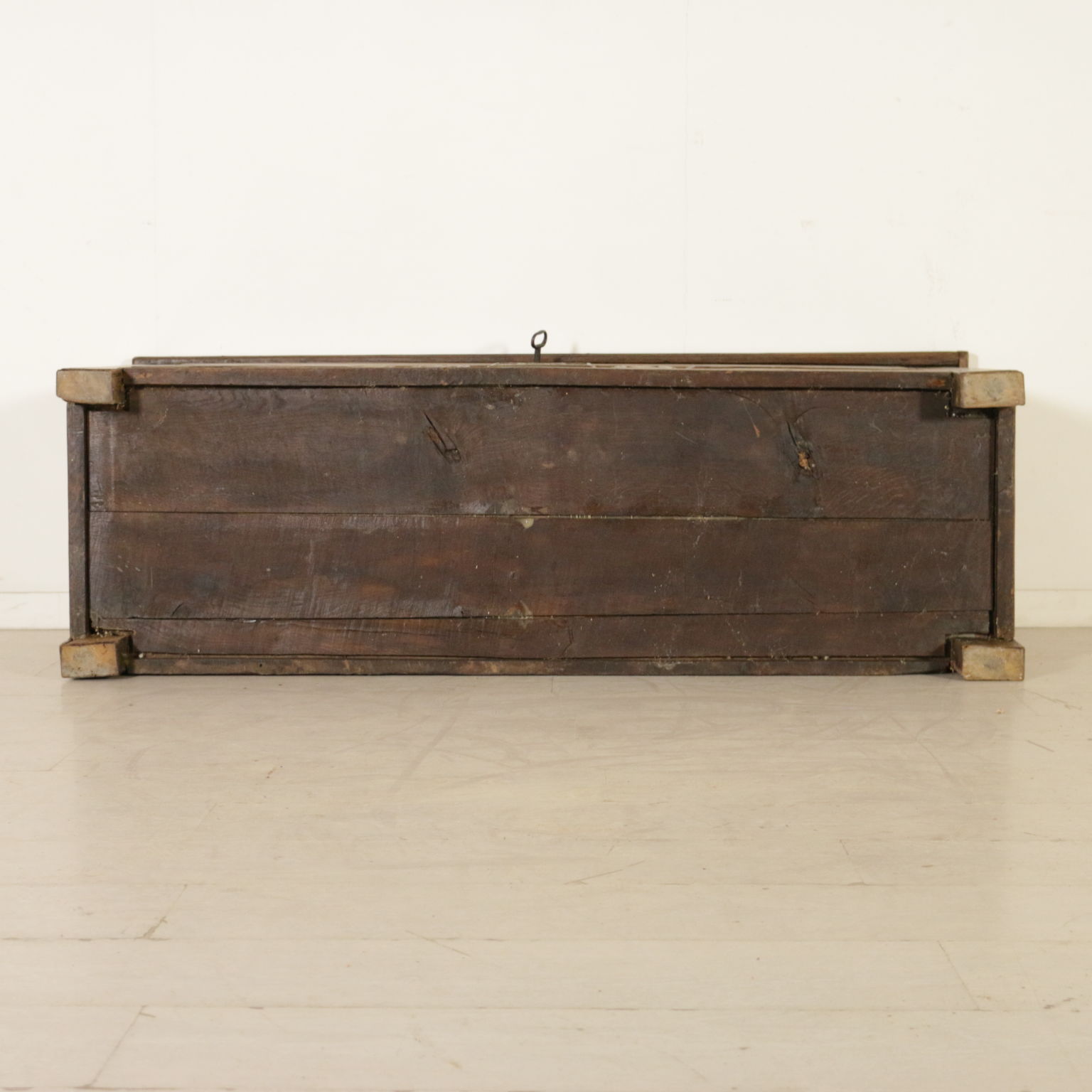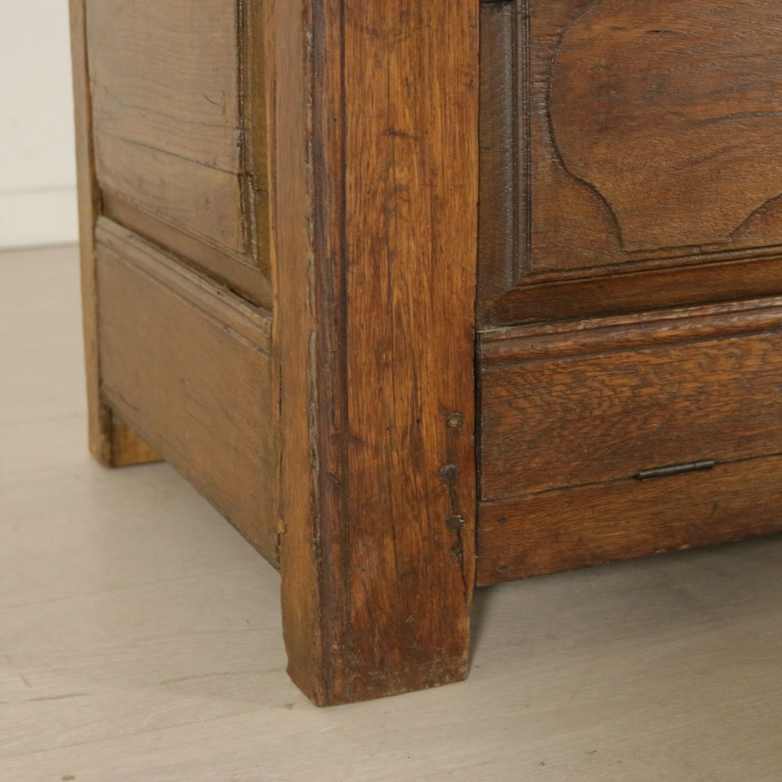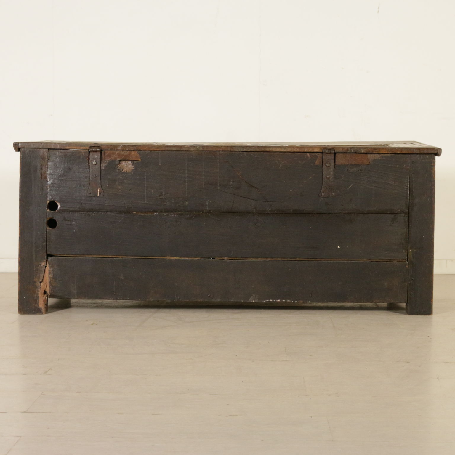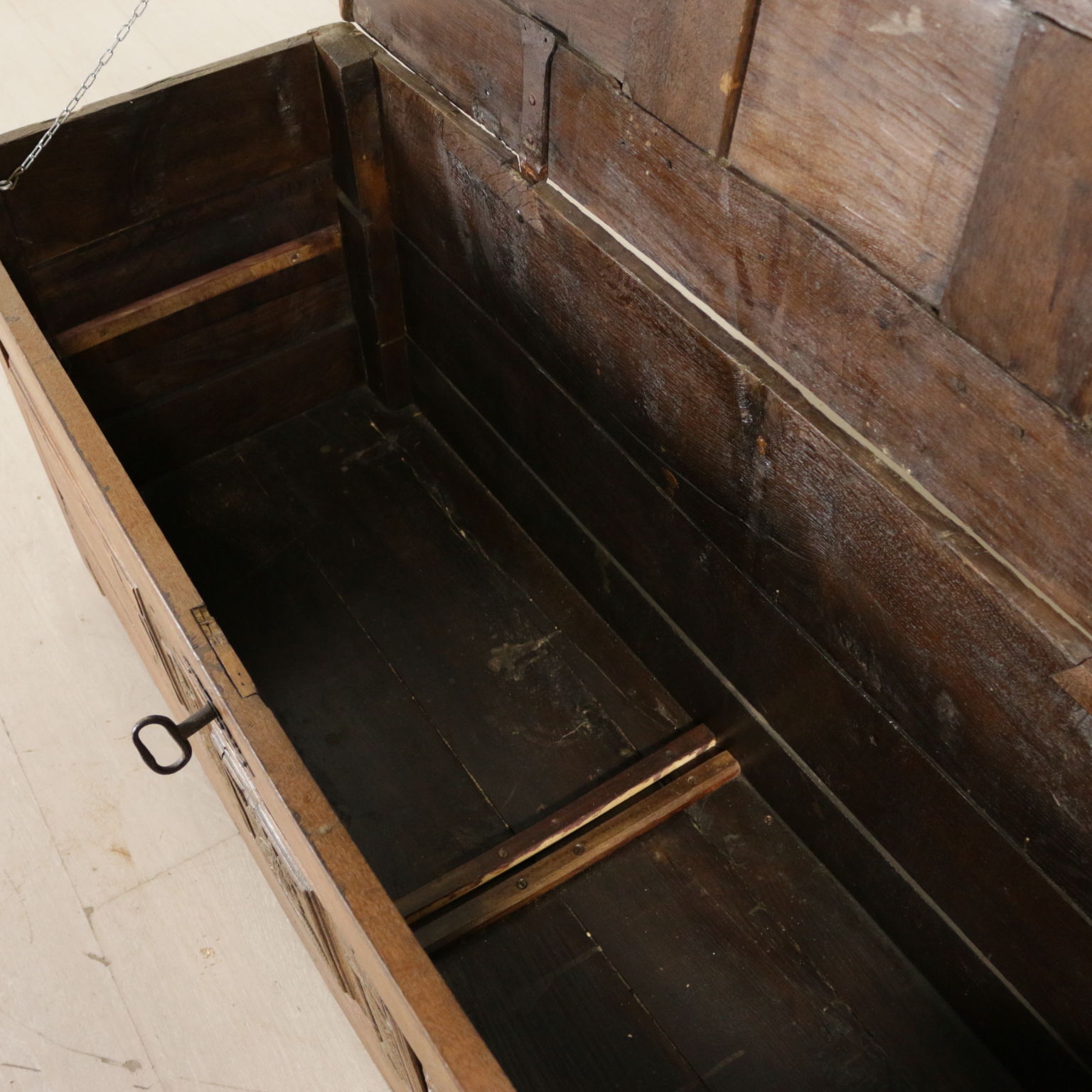 Cassapanca modificata ed ora apribile a ribalta anche sul fronte. Presenta formelle intagliate e piano apribile.