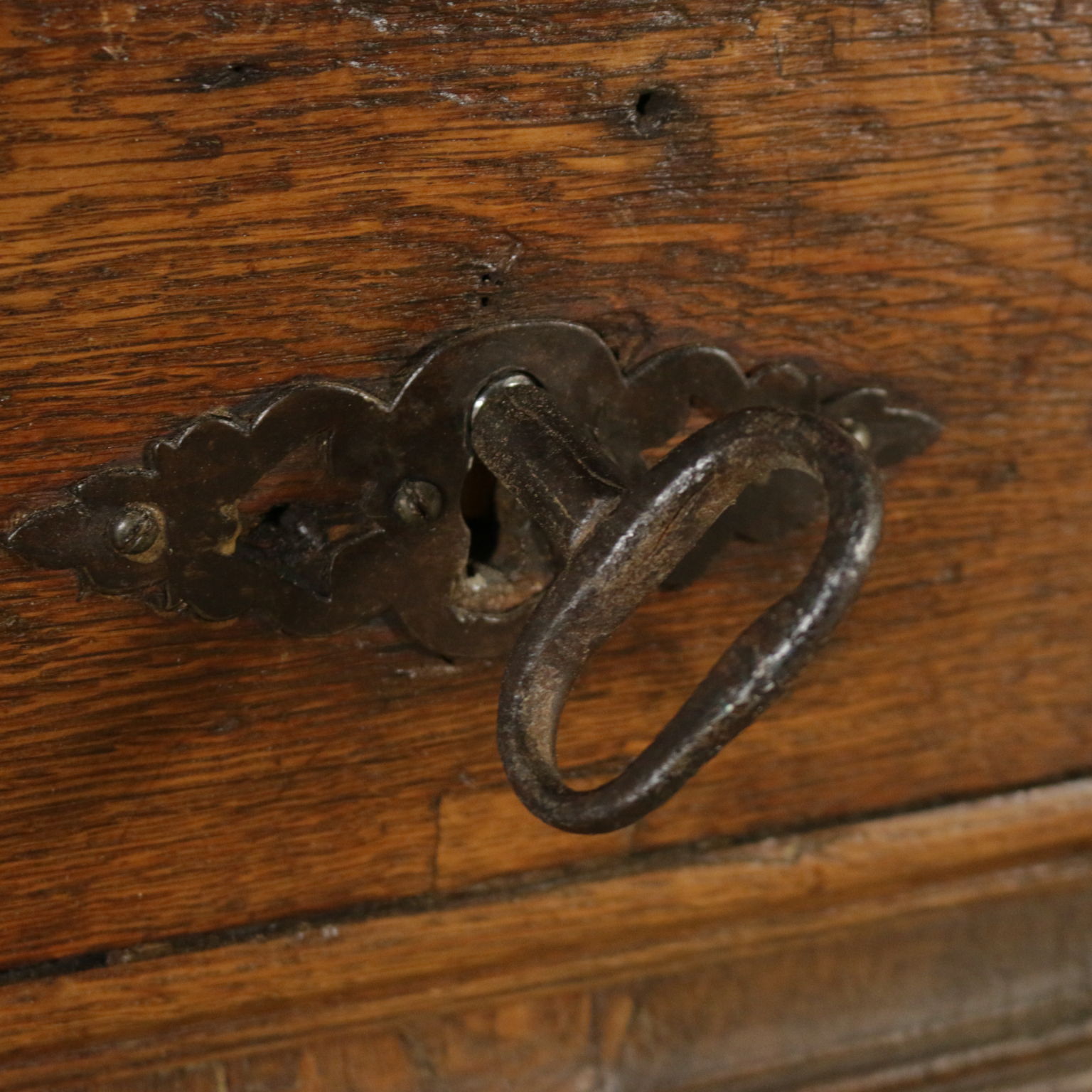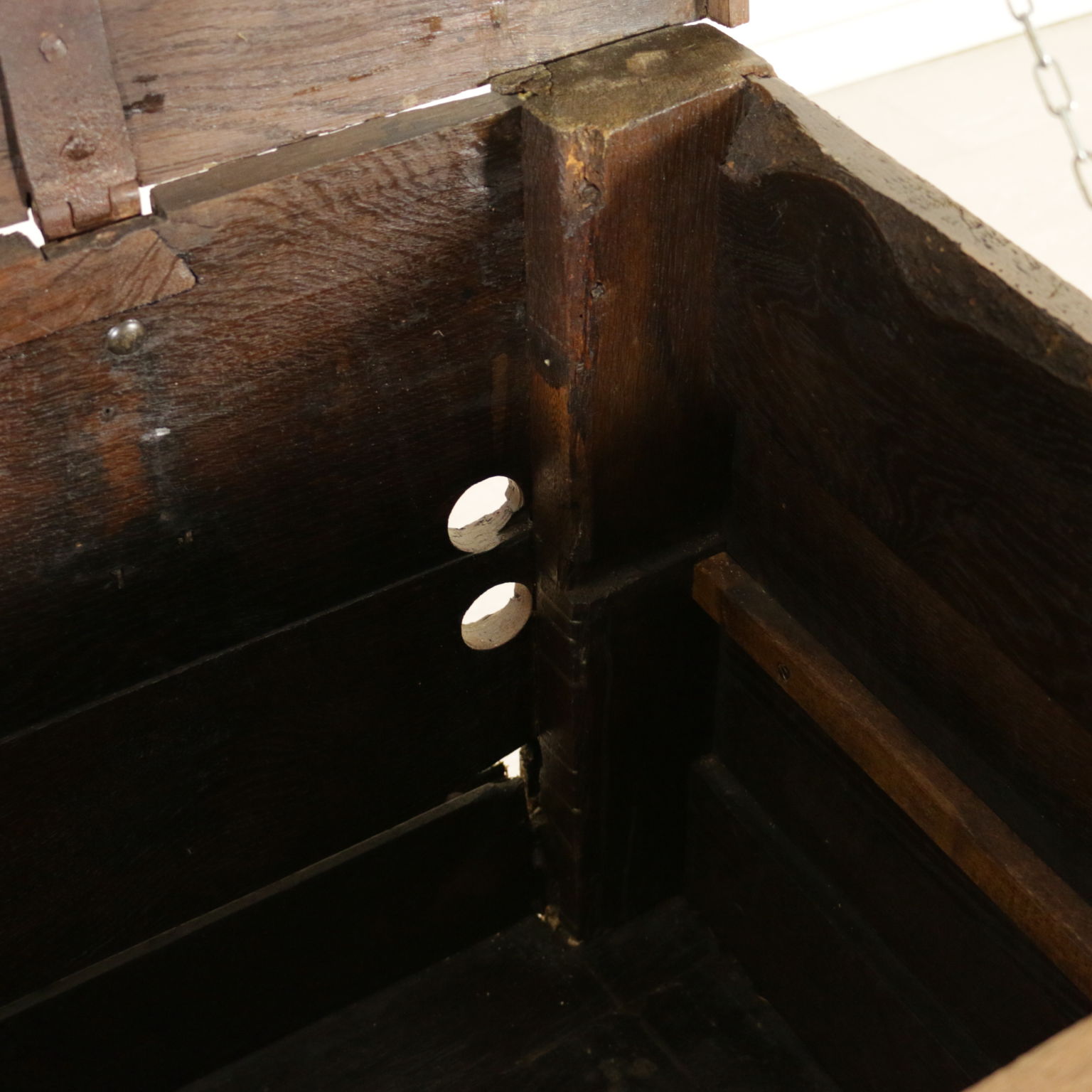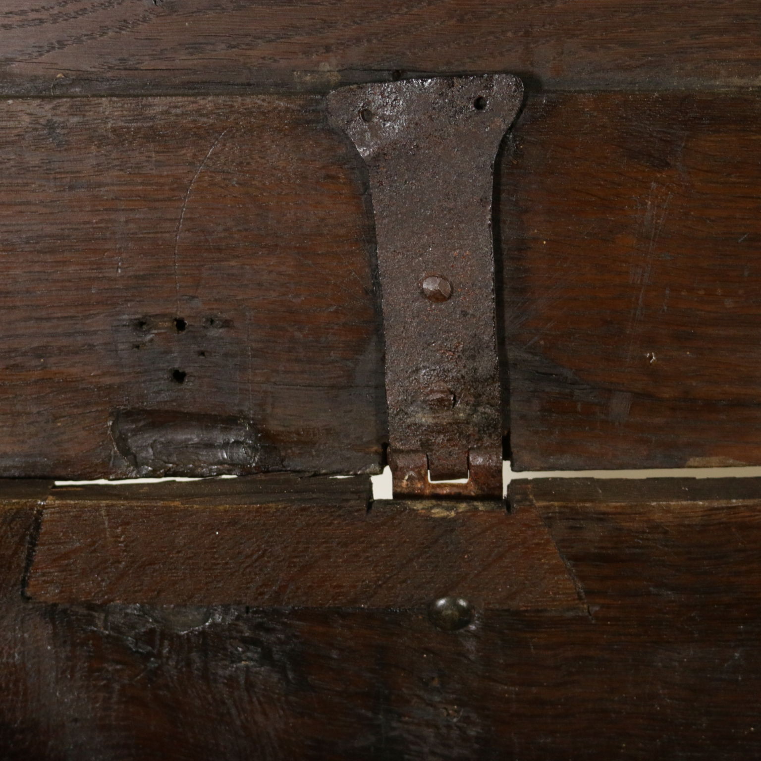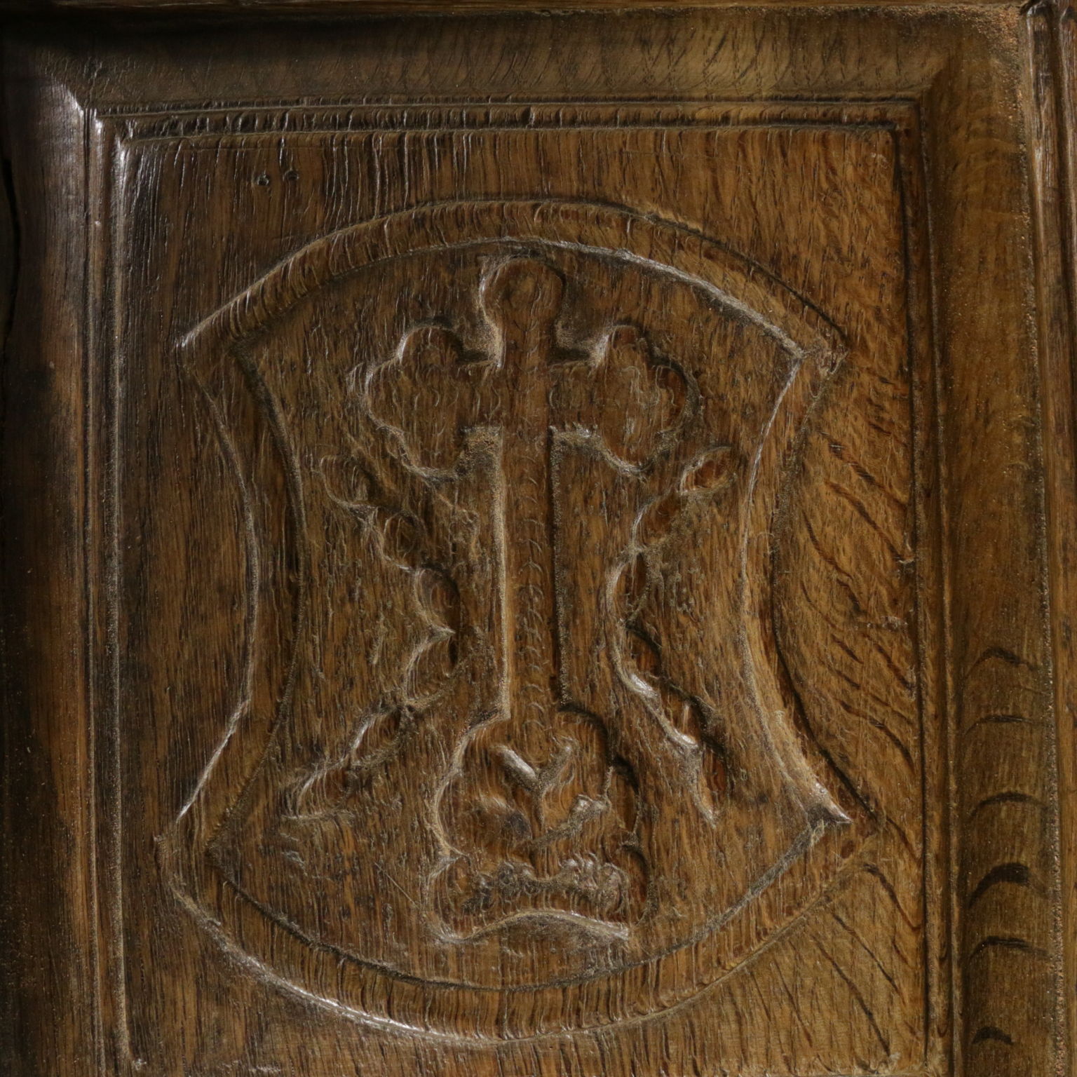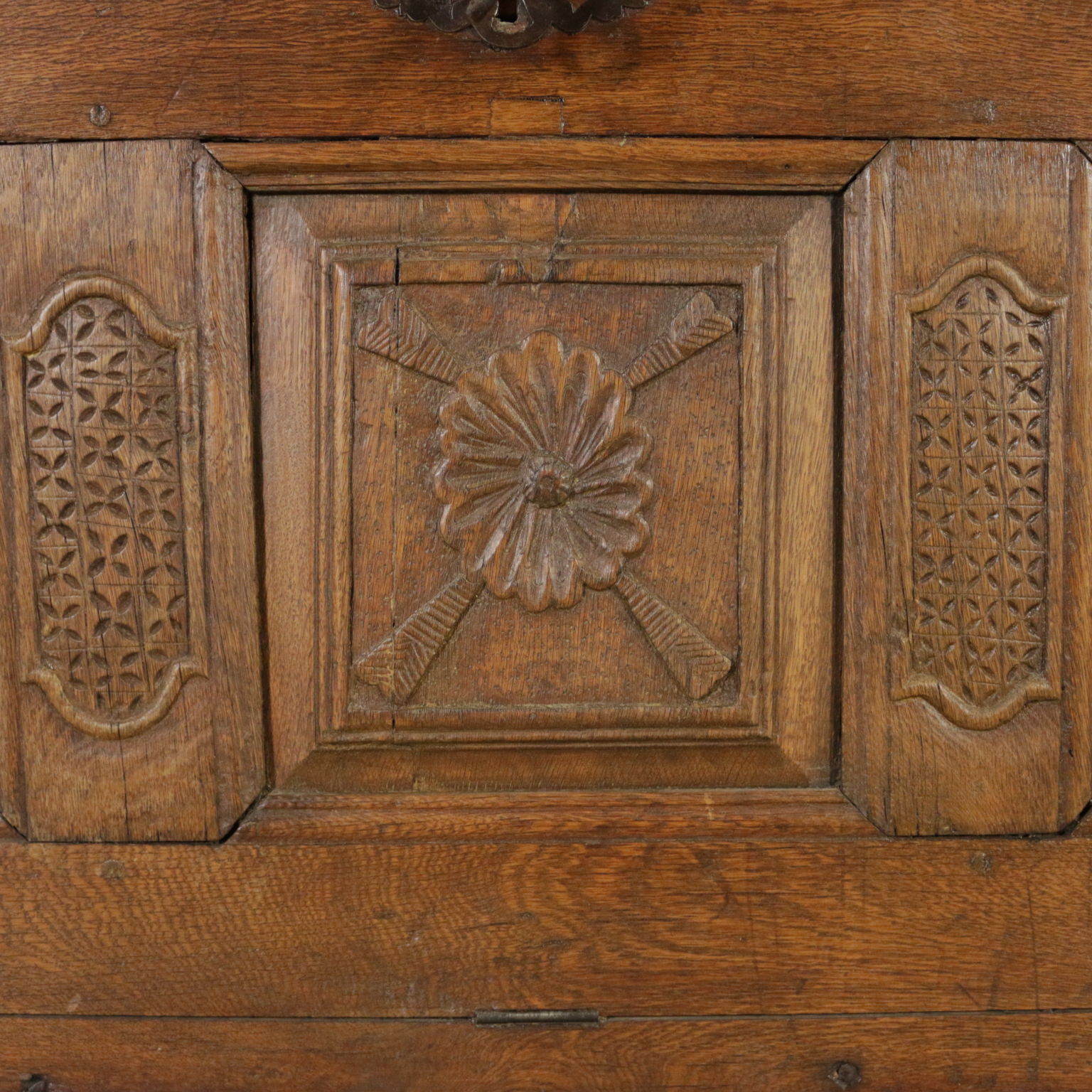 Cassapanca modificata ed ora apribile a ribalta anche sul fronte. Presenta formelle intagliate e piano apribile.