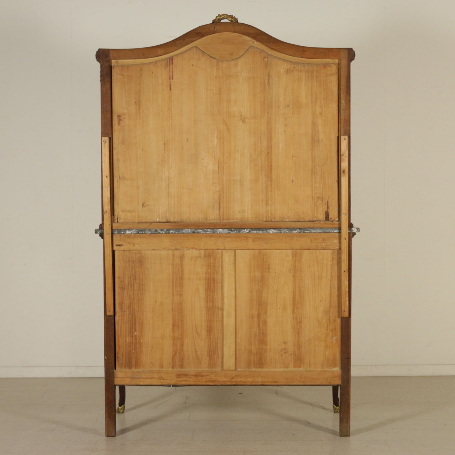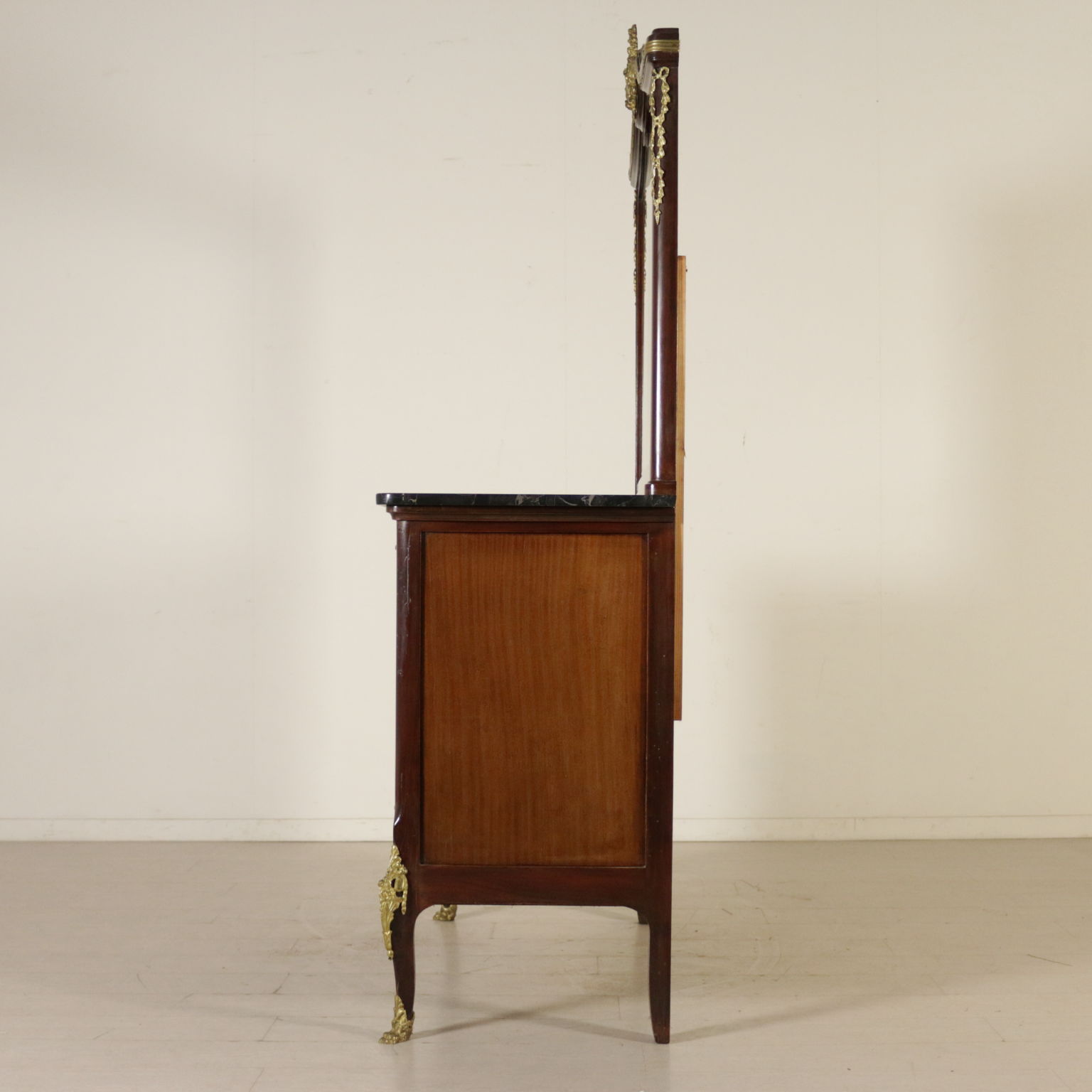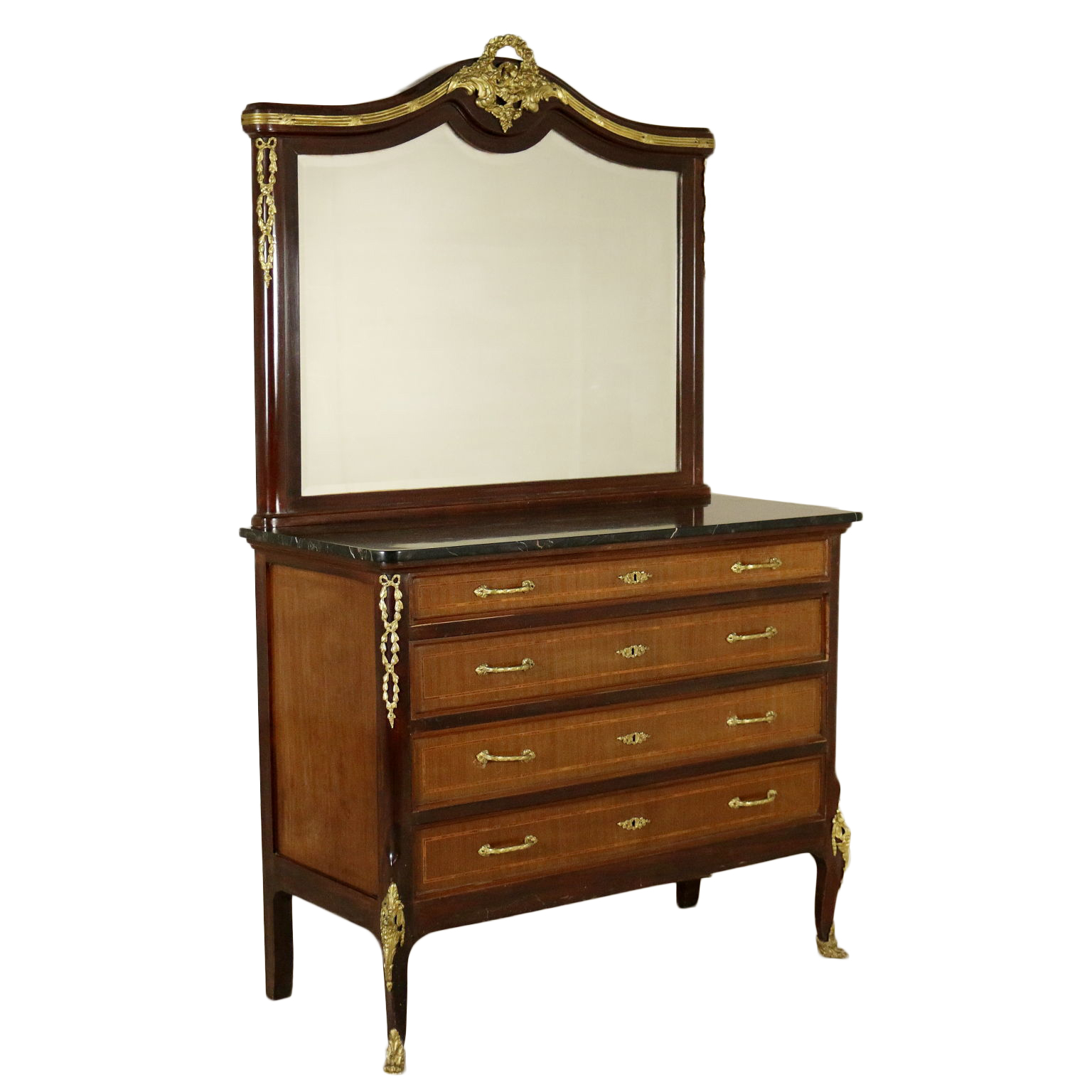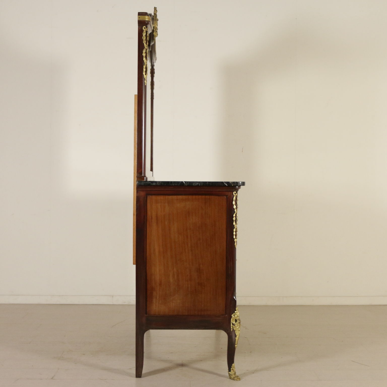 Presenta quattro cassetti e piedi mossi. Piano in marmo e specchiera. Fregi in bronzo dorato.