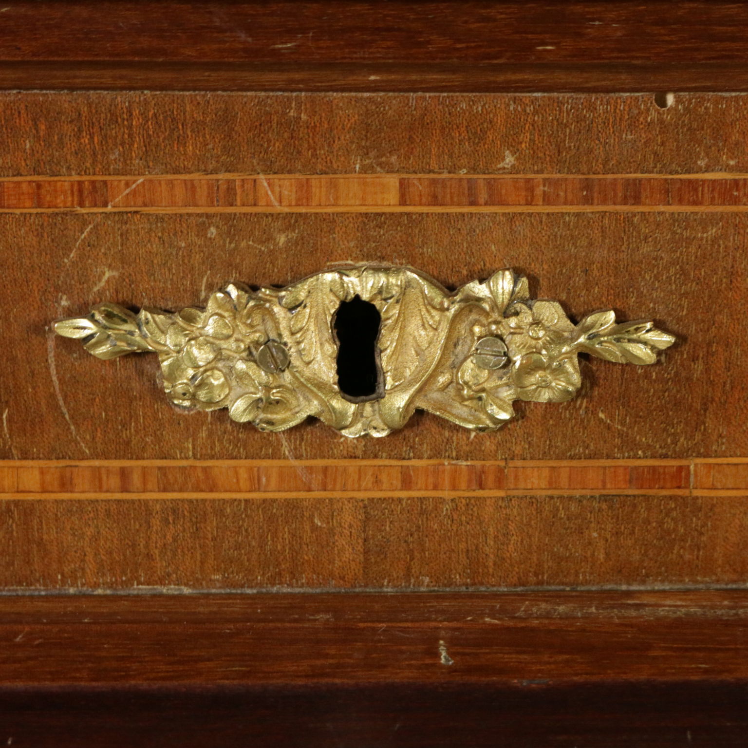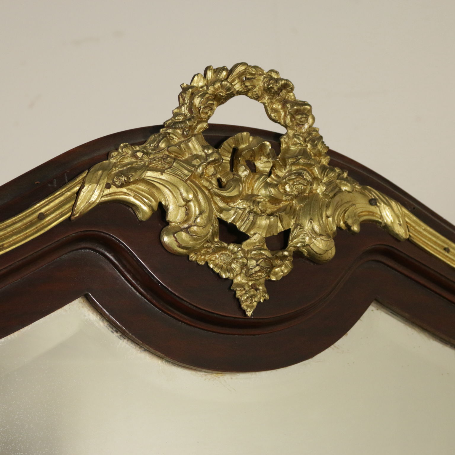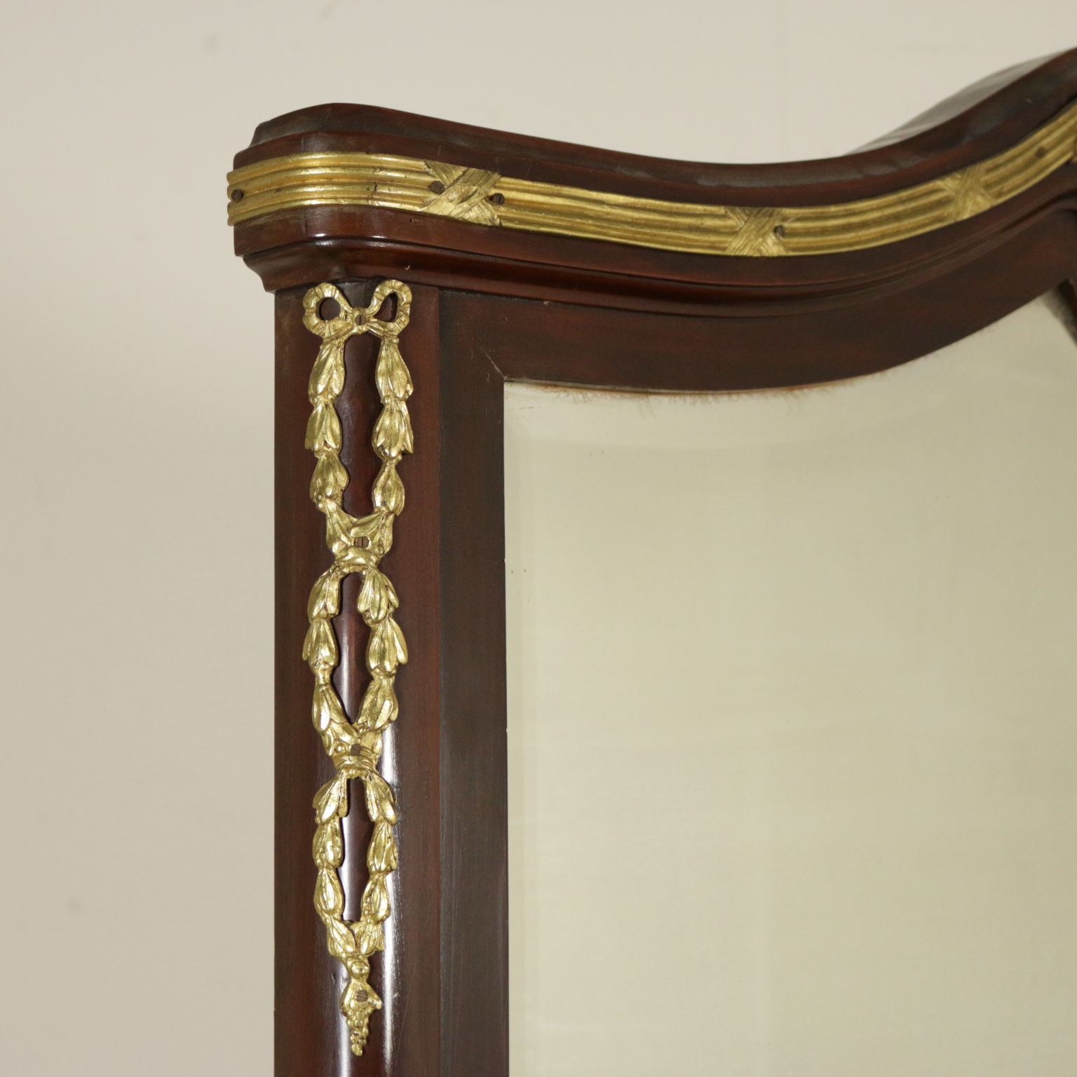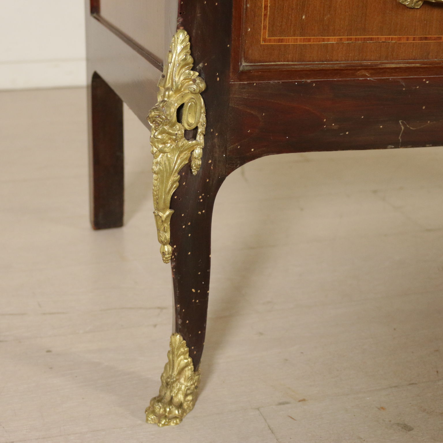 Presenta quattro cassetti e piedi mossi. Piano in marmo e specchiera. Fregi in bronzo dorato.
