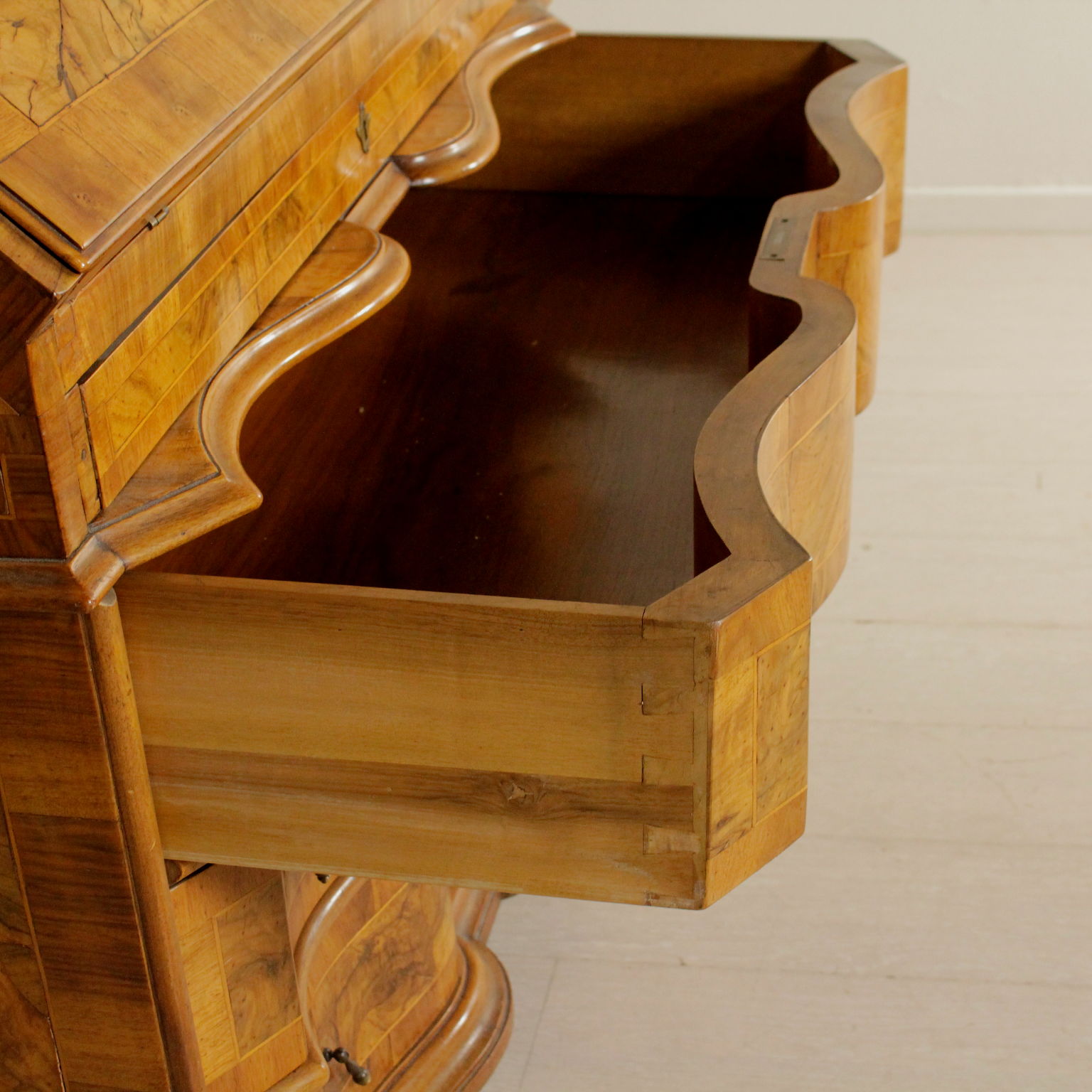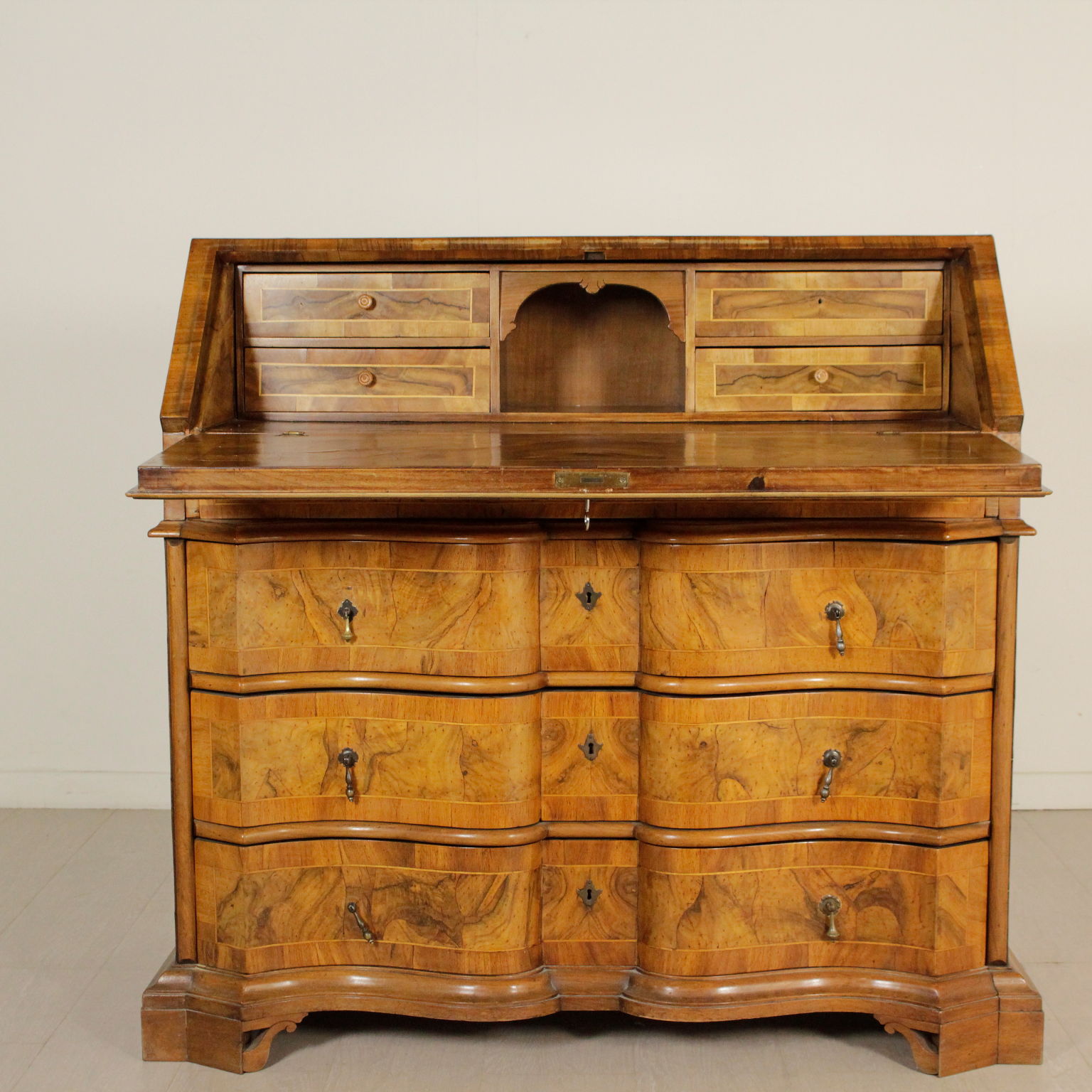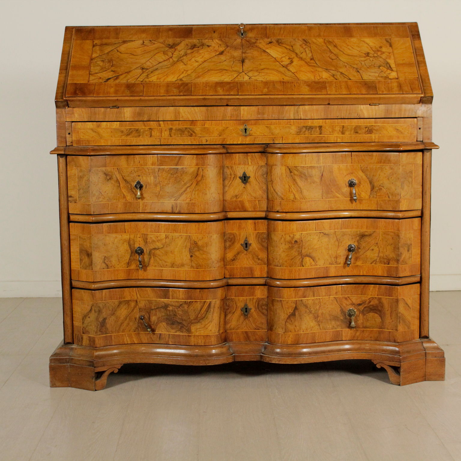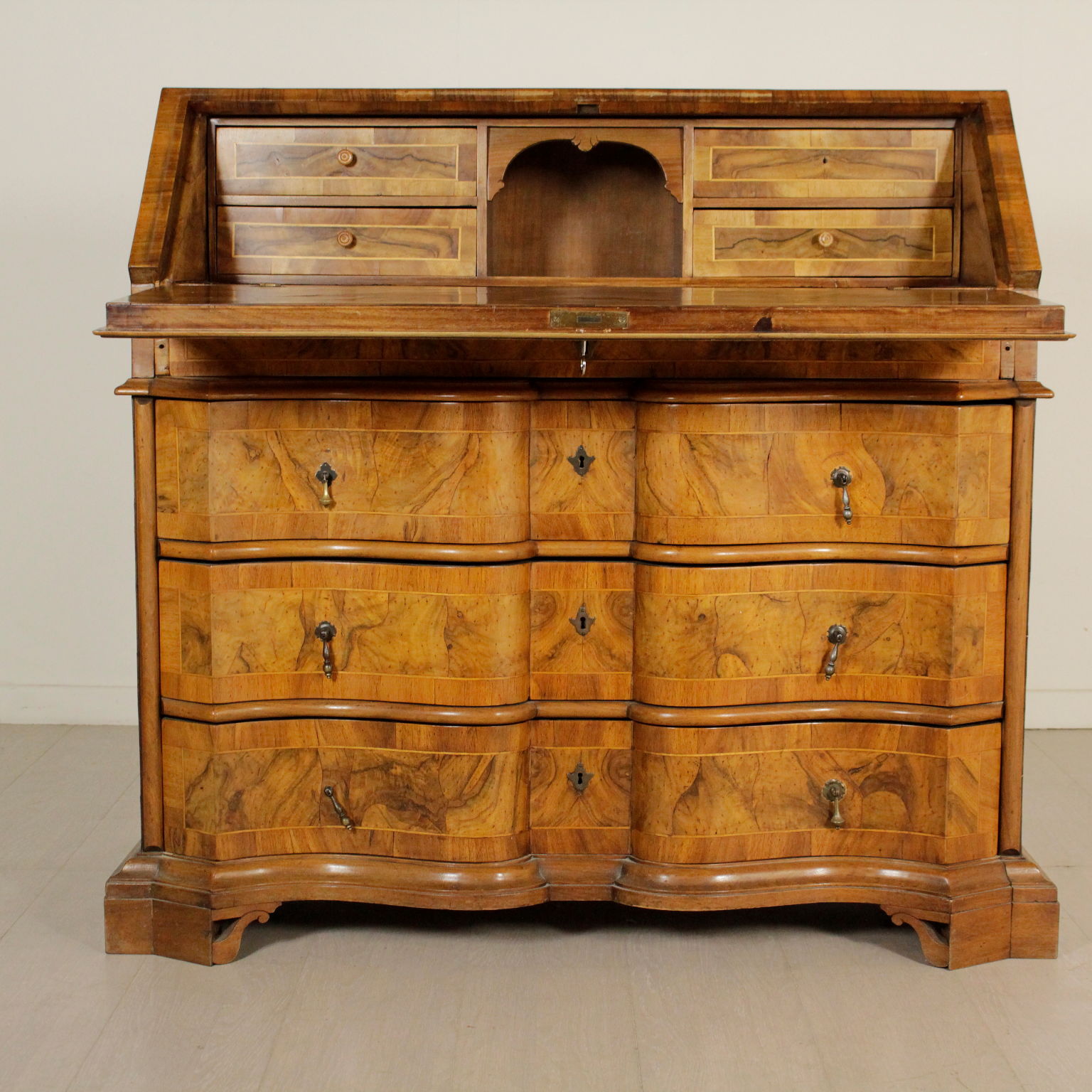 Mossa sul fronte presenta tre cassetti ed anta a ribalta. All'interno quattro cassetti e vano a giorno. Riserve in radica.