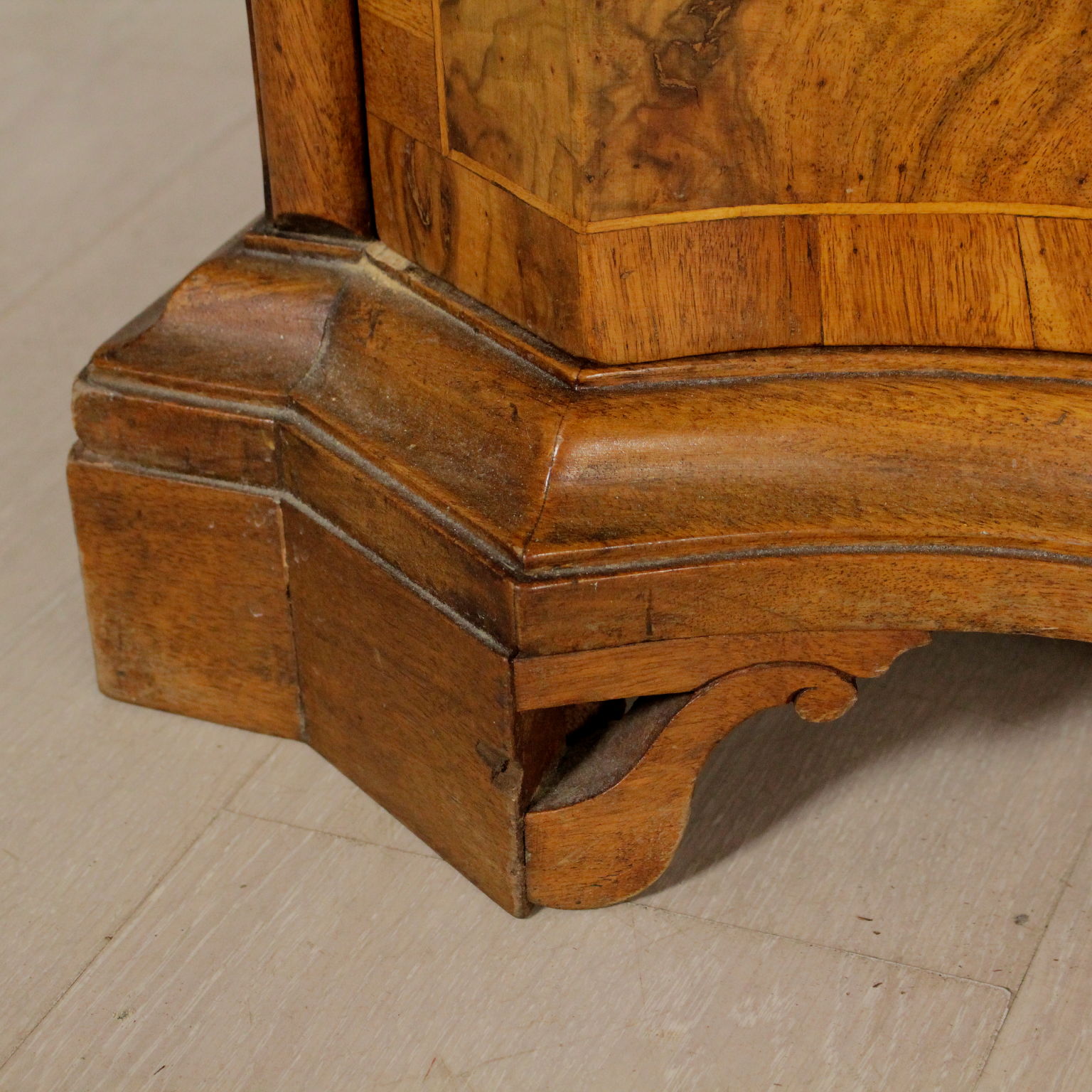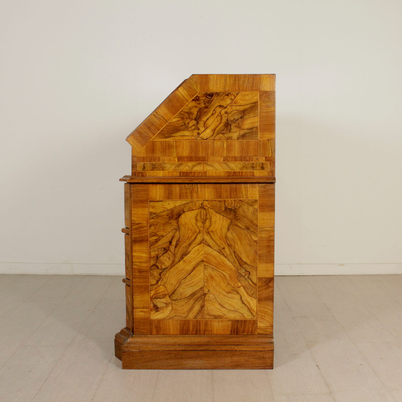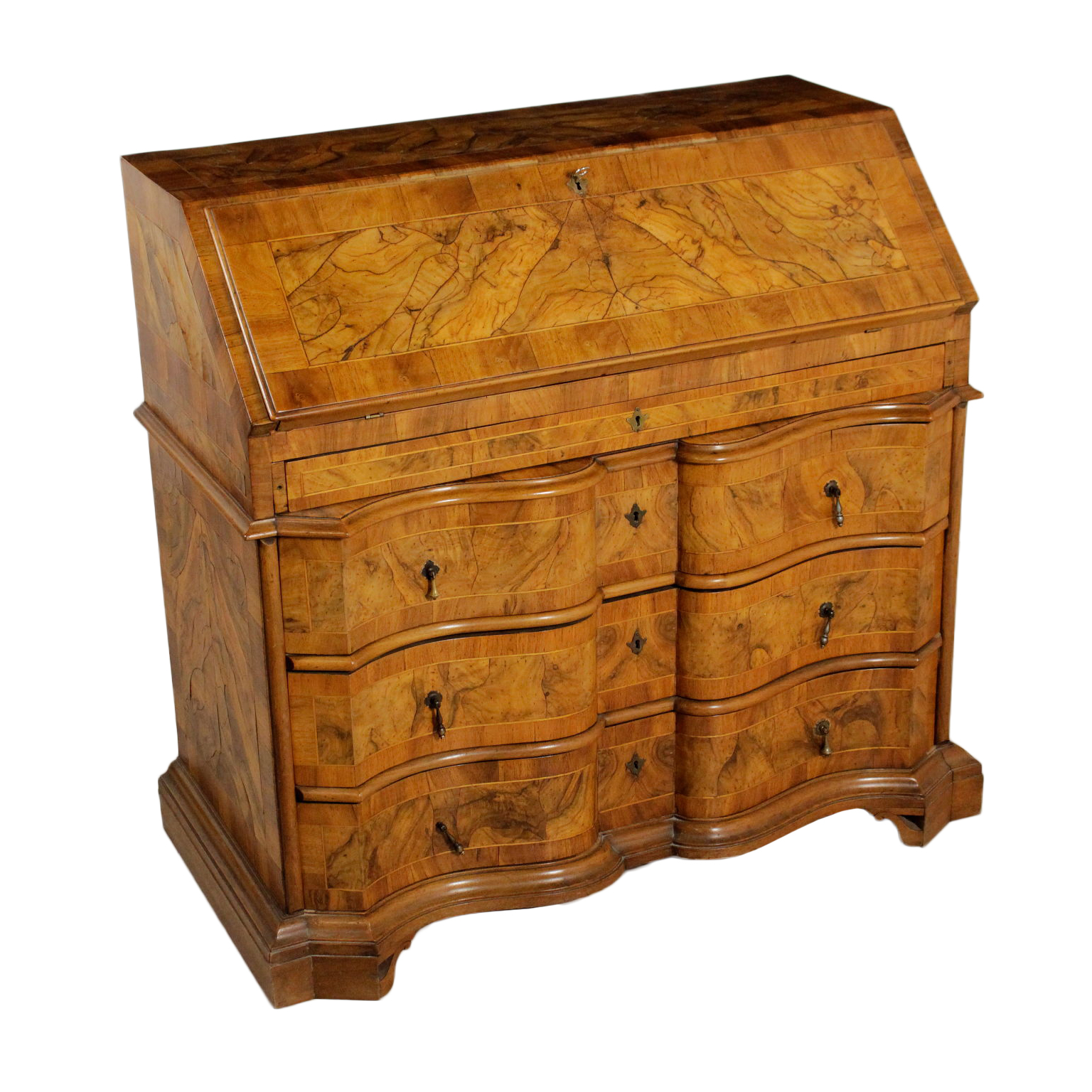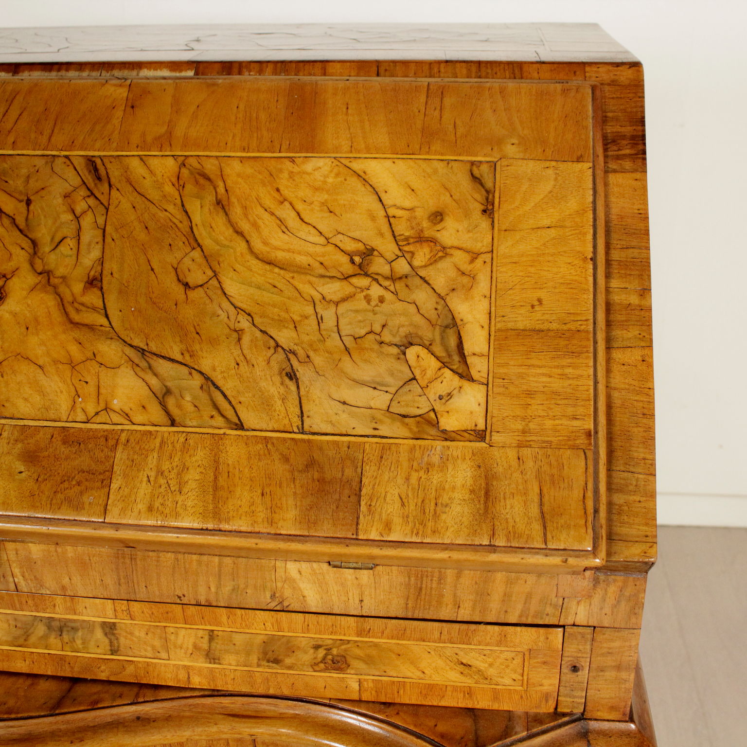 Mossa sul fronte presenta tre cassetti ed anta a ribalta. All'interno quattro cassetti e vano a giorno. Riserve in radica.