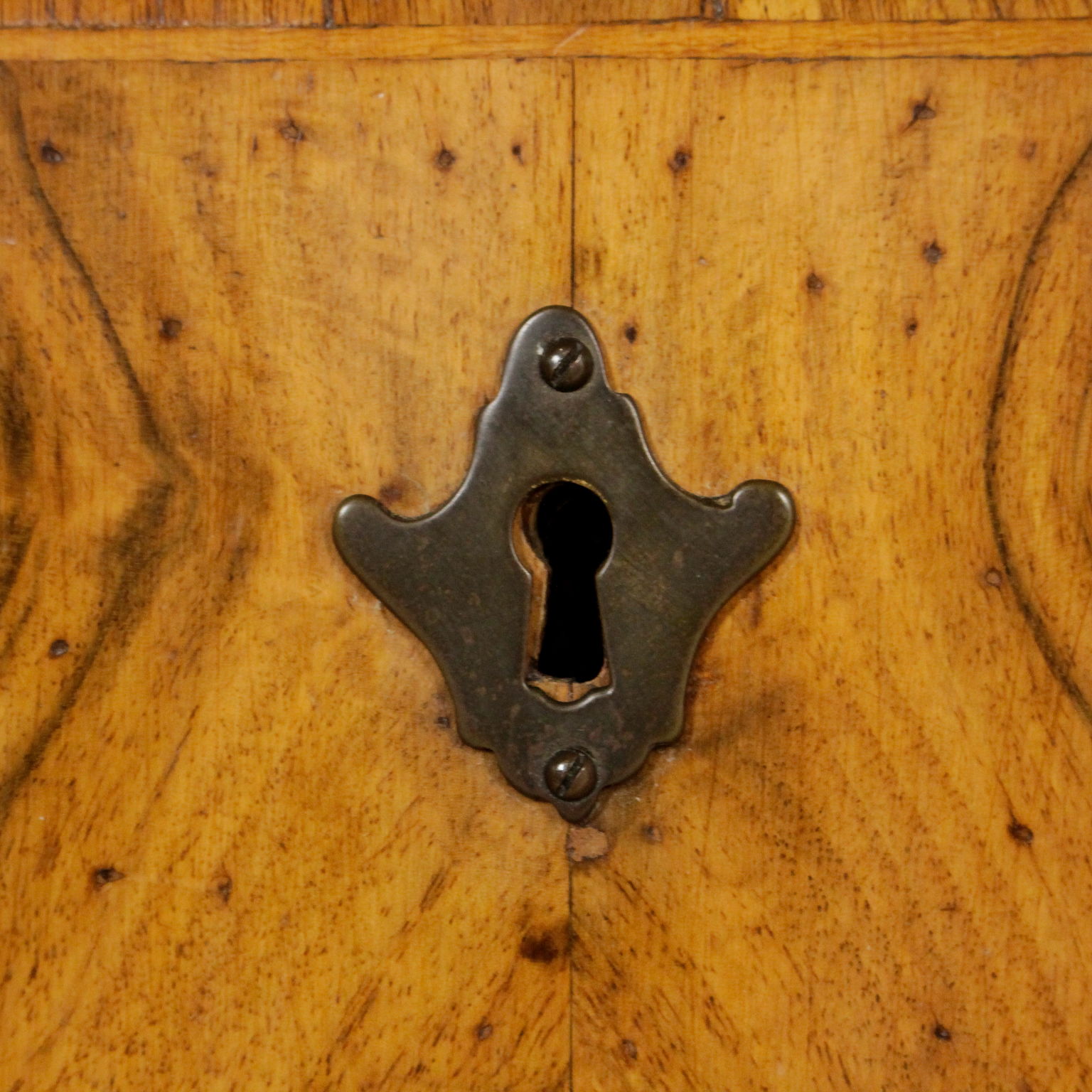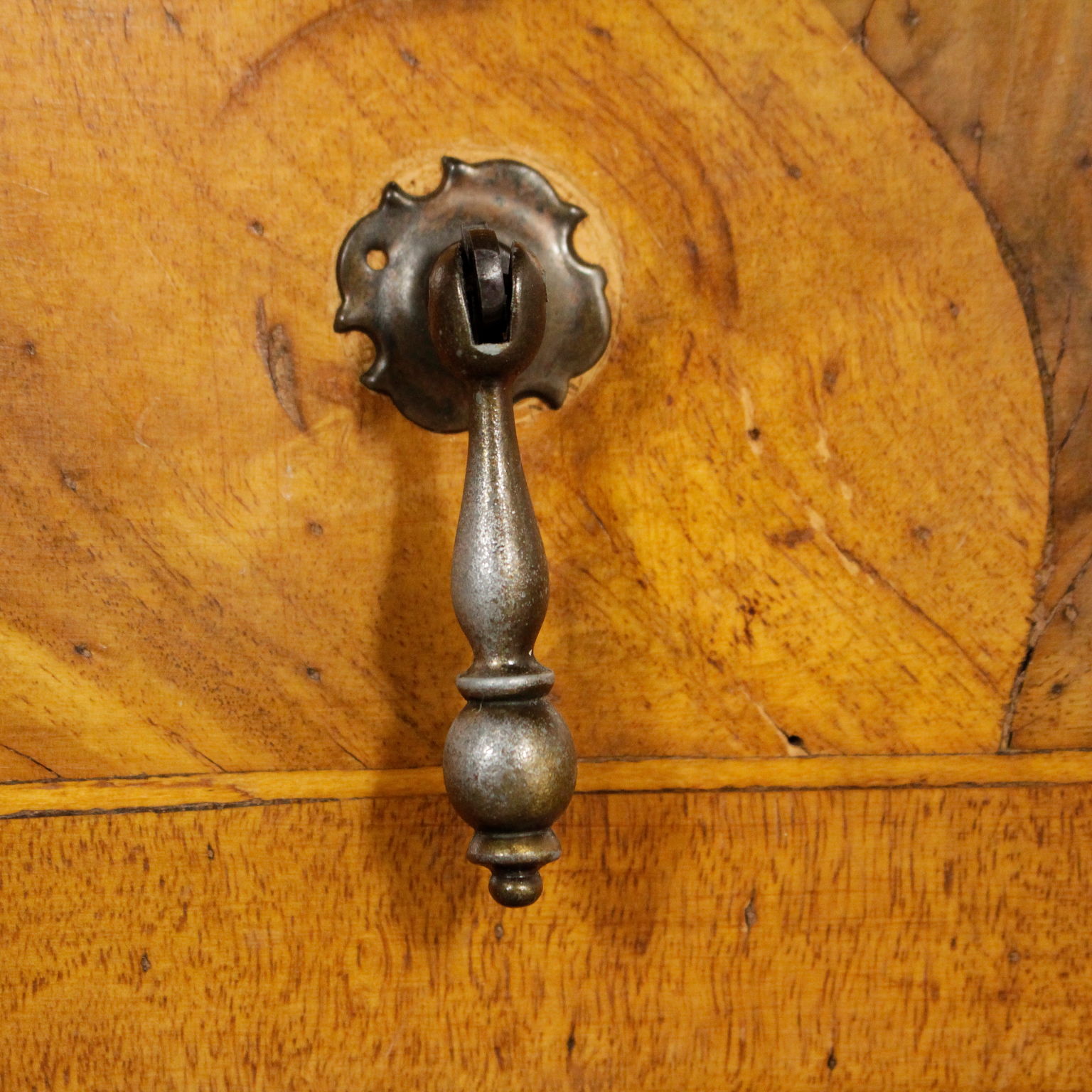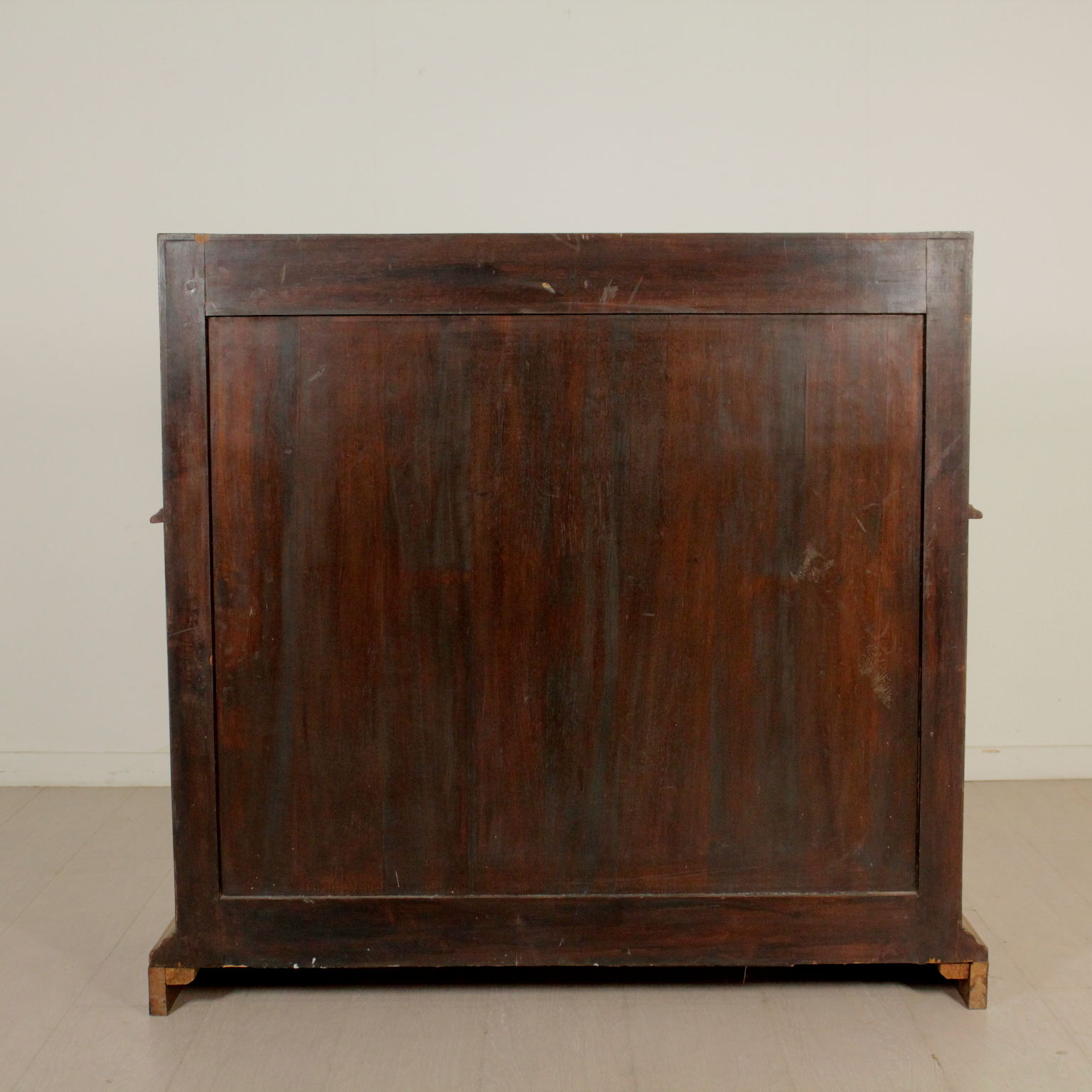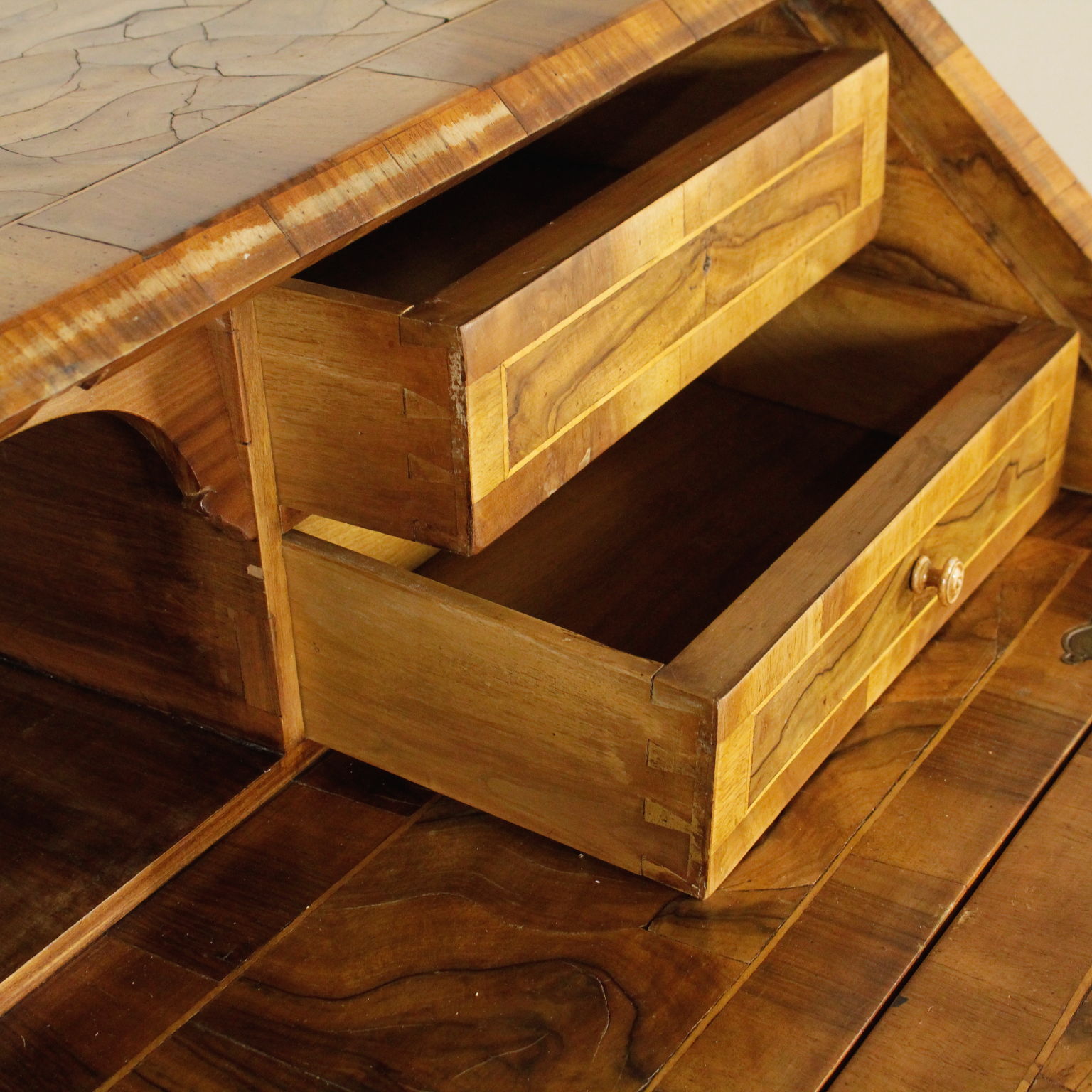 Mossa sul fronte presenta tre cassetti ed anta a ribalta. All'interno quattro cassetti e vano a giorno. Riserve in radica.