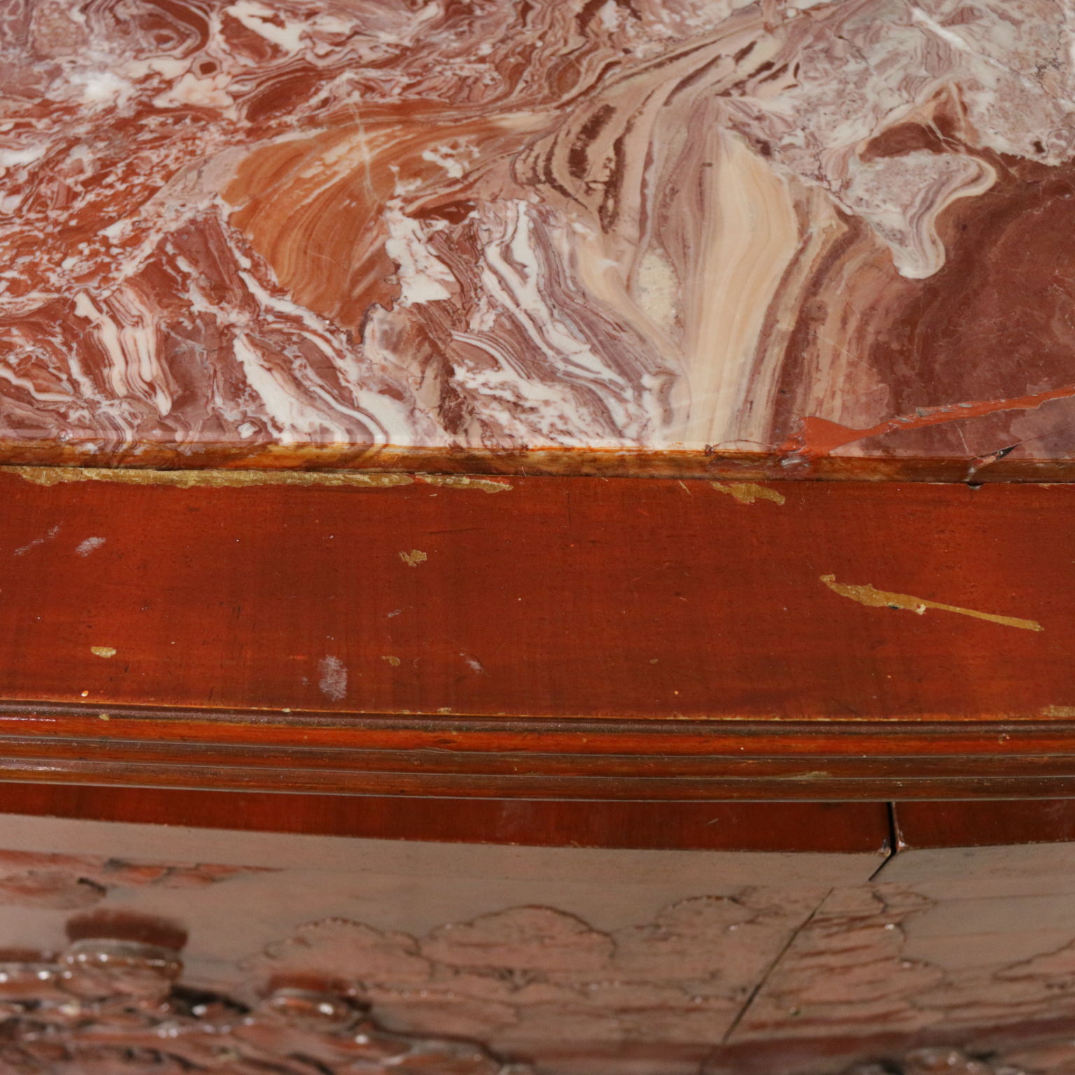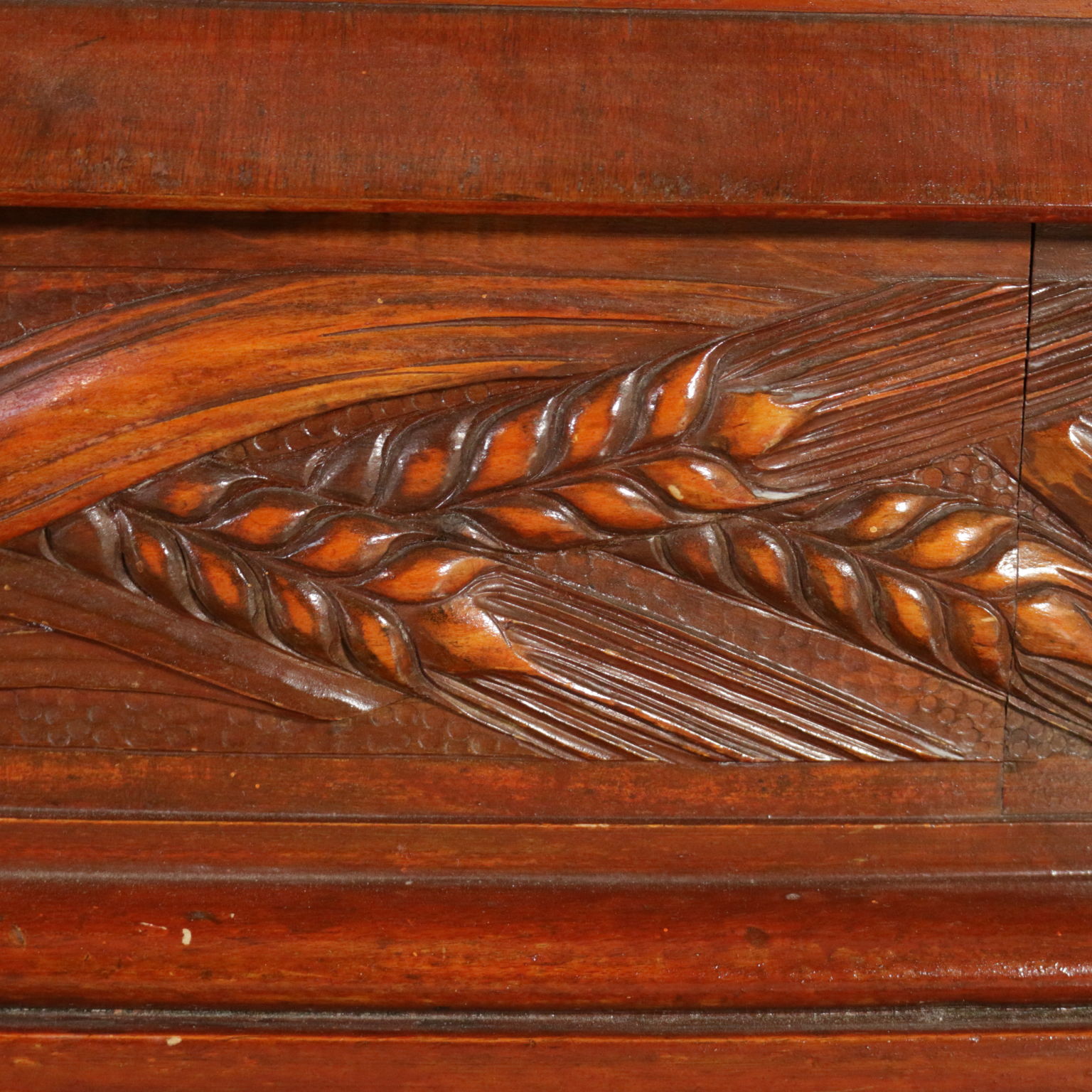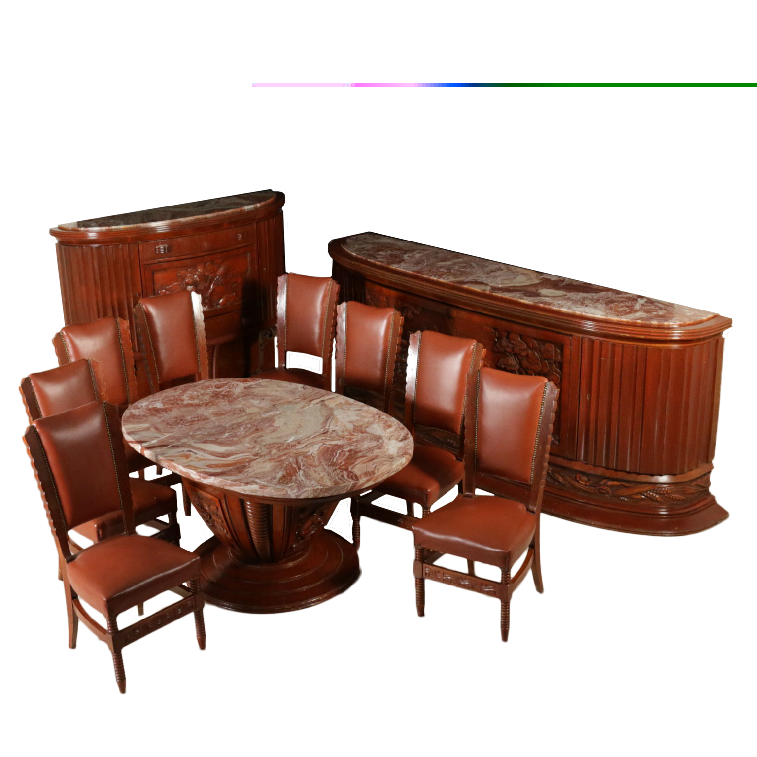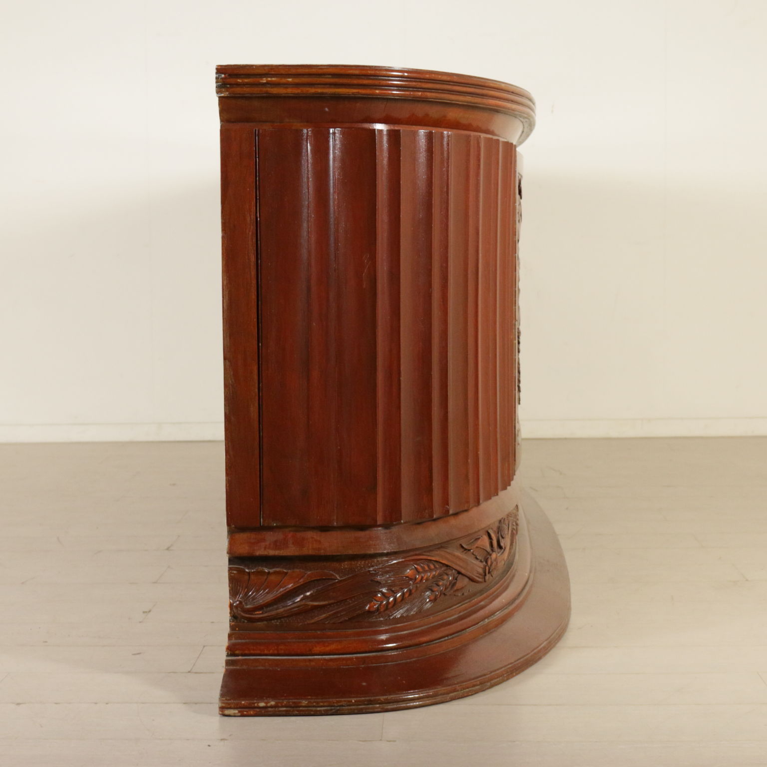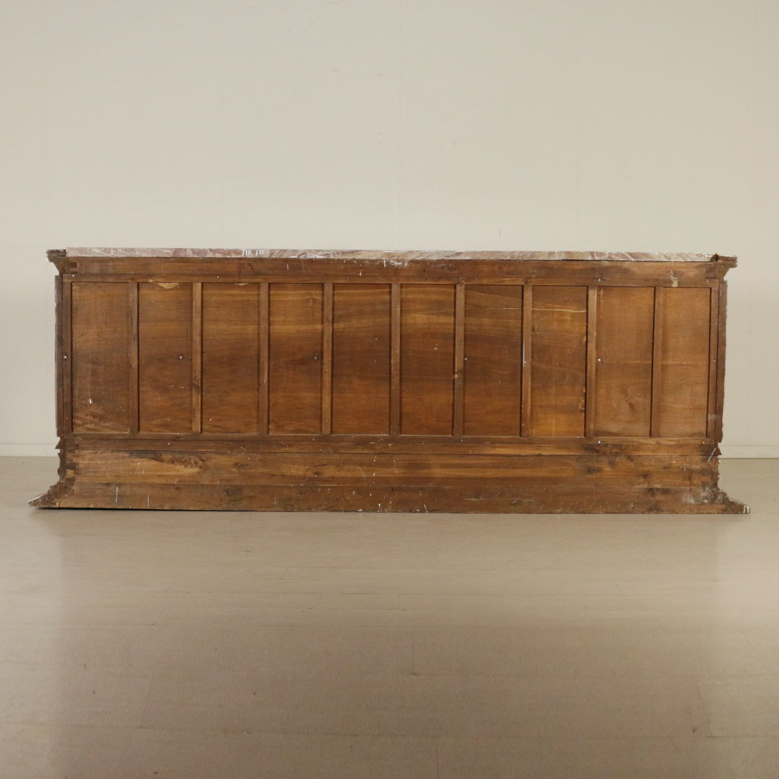 Mobile buffet; ante battenti con disegni intagliati e scanalature, piano in marmo, legno massello ed impiallacciatura di noce semi-laccato, interni impiallacciati in radica.