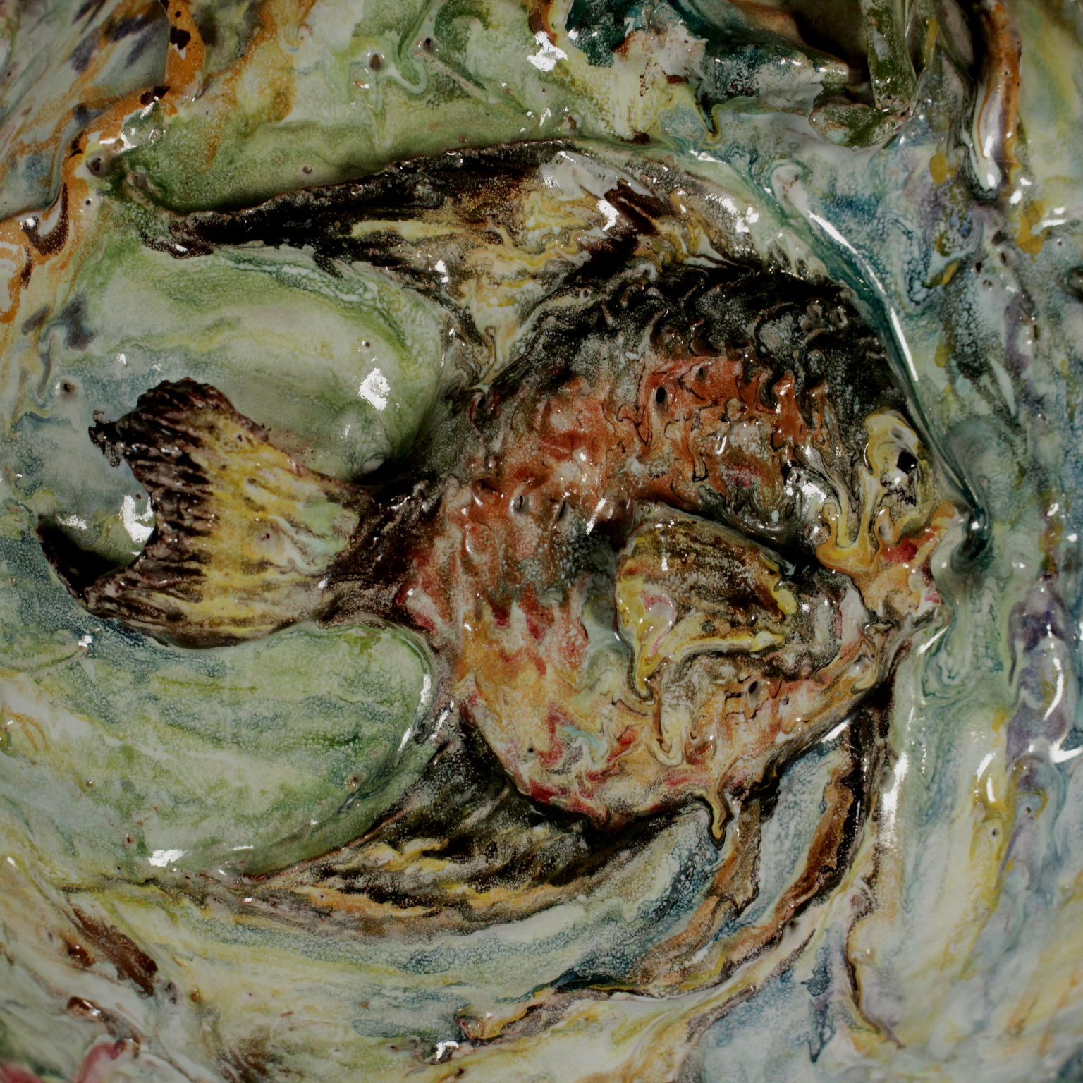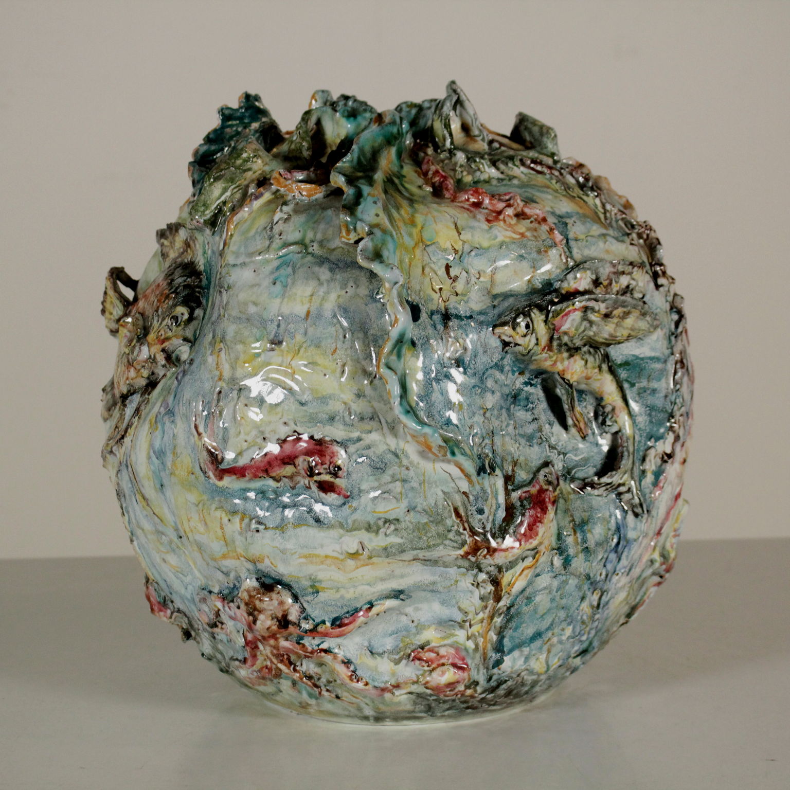Vaso in ceramica maiolica policroma. Decori a rilievo a tuttotondo raffigurante paesaggio marino. Marchio della manifattura "C.A.F. Albisola" e firma dell'artista sotto la base.