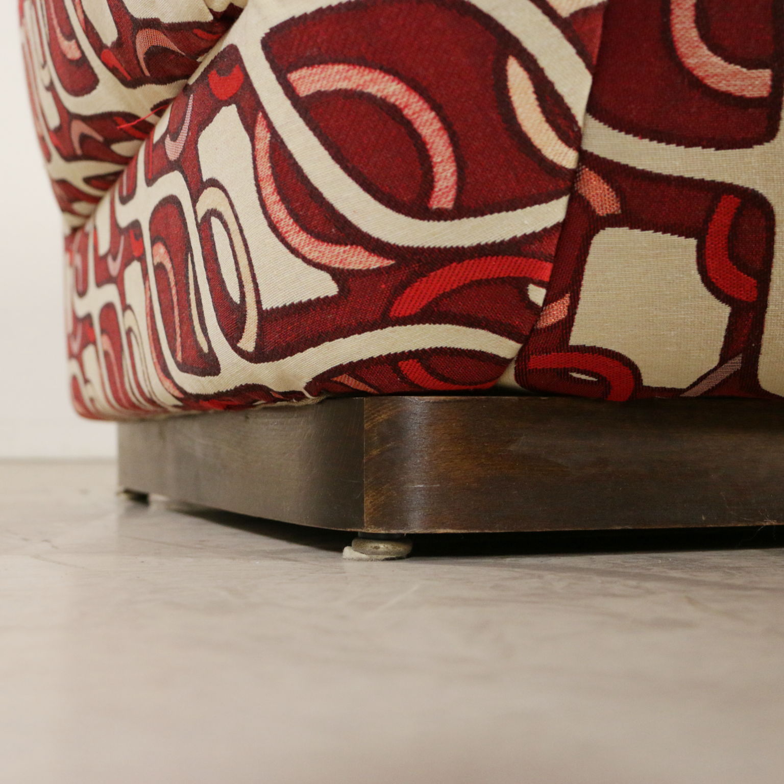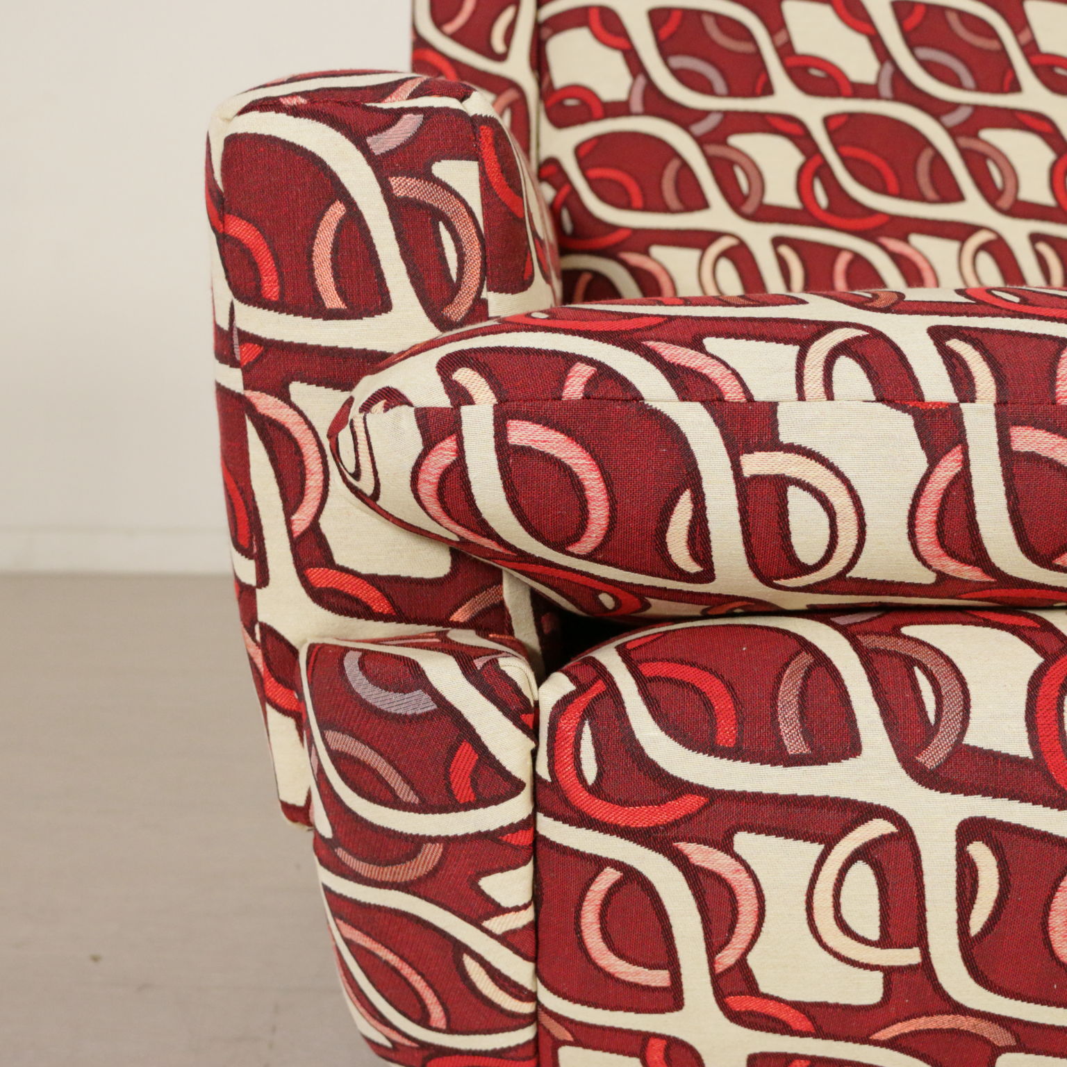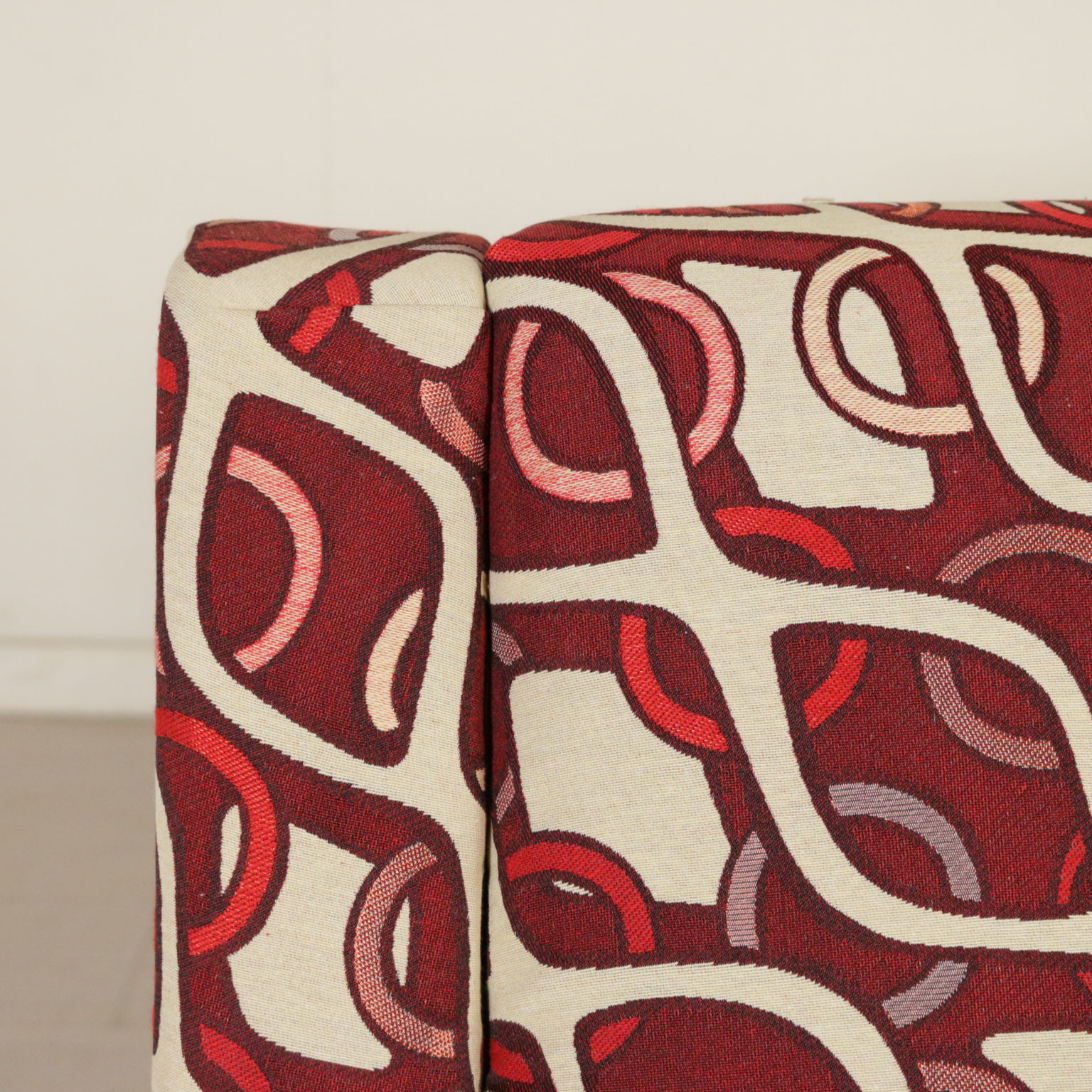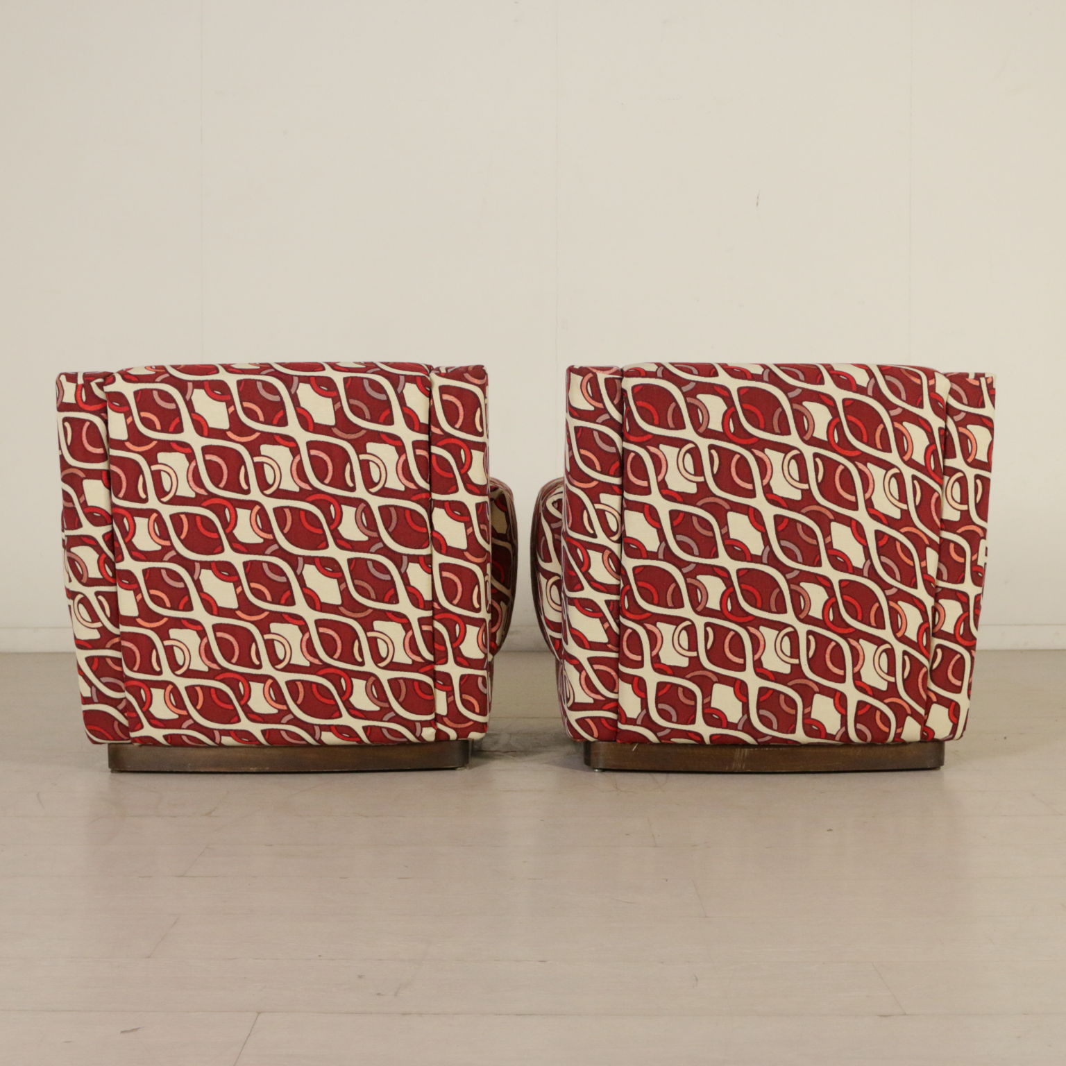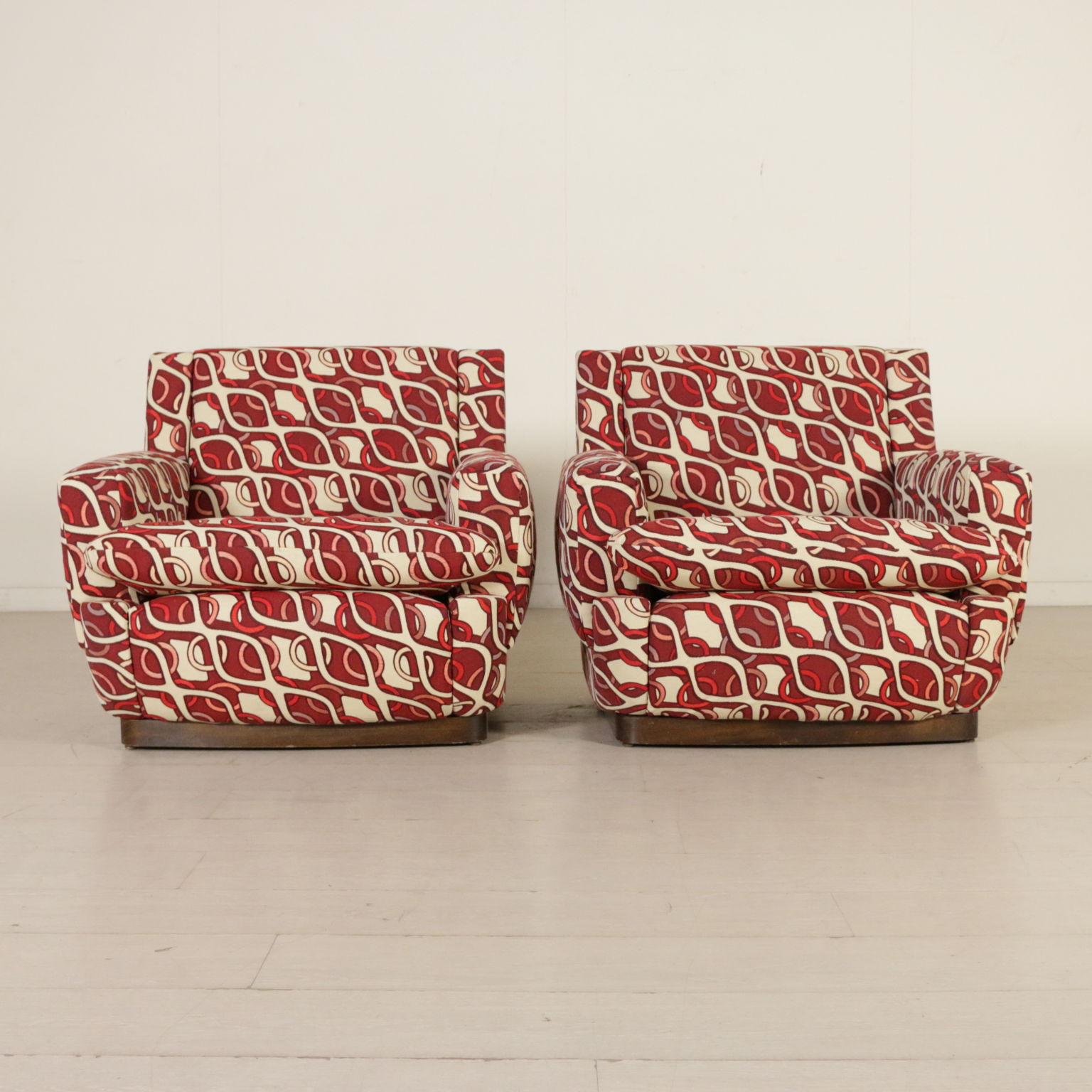 Coppia di poltrone; imbottitura in espanso, rivestimento in tessuto.