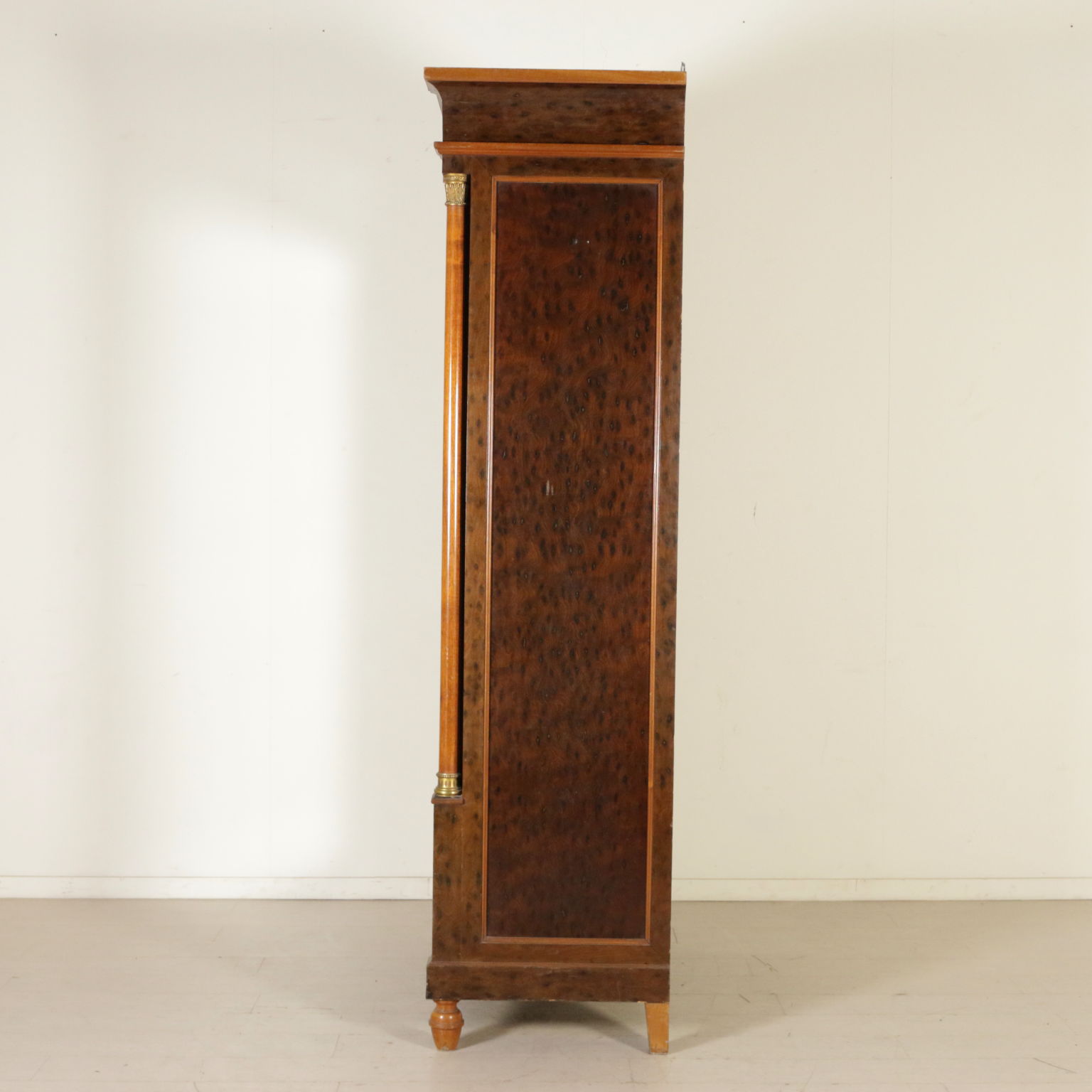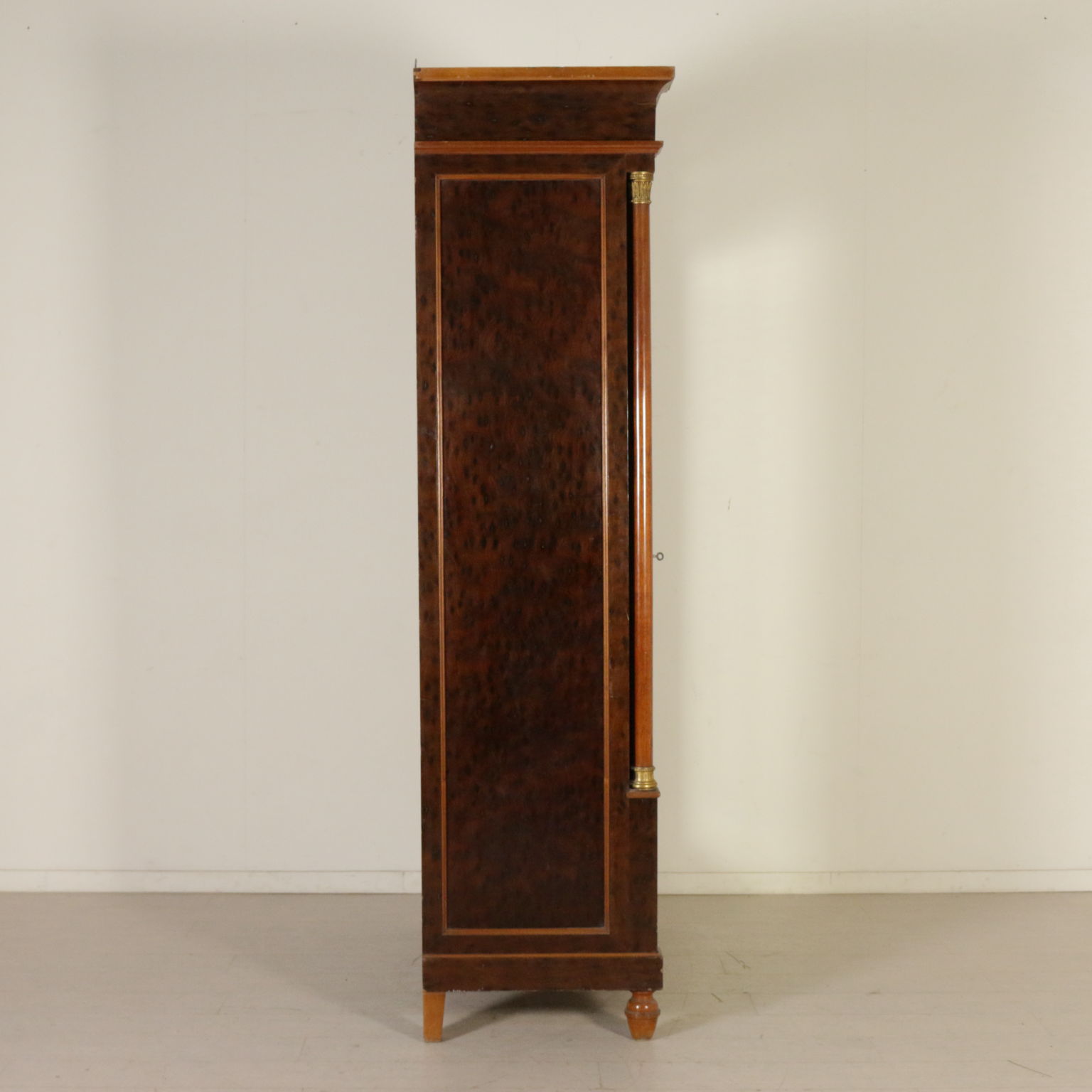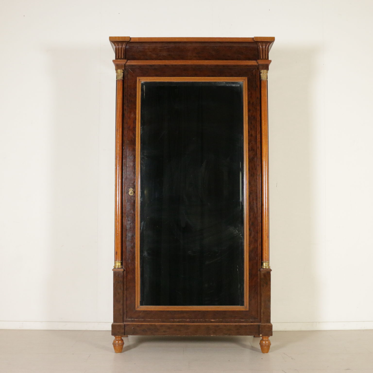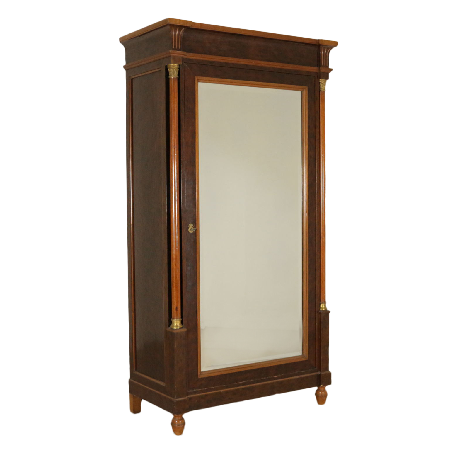 Elegante armadio ad un'anta con specchio bisellato. Montanti con colonne intere con capitelli in ottone. Piedi torniti.