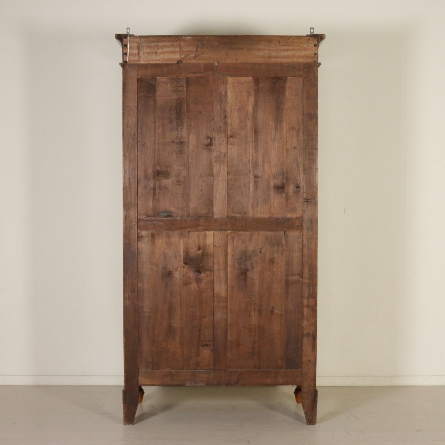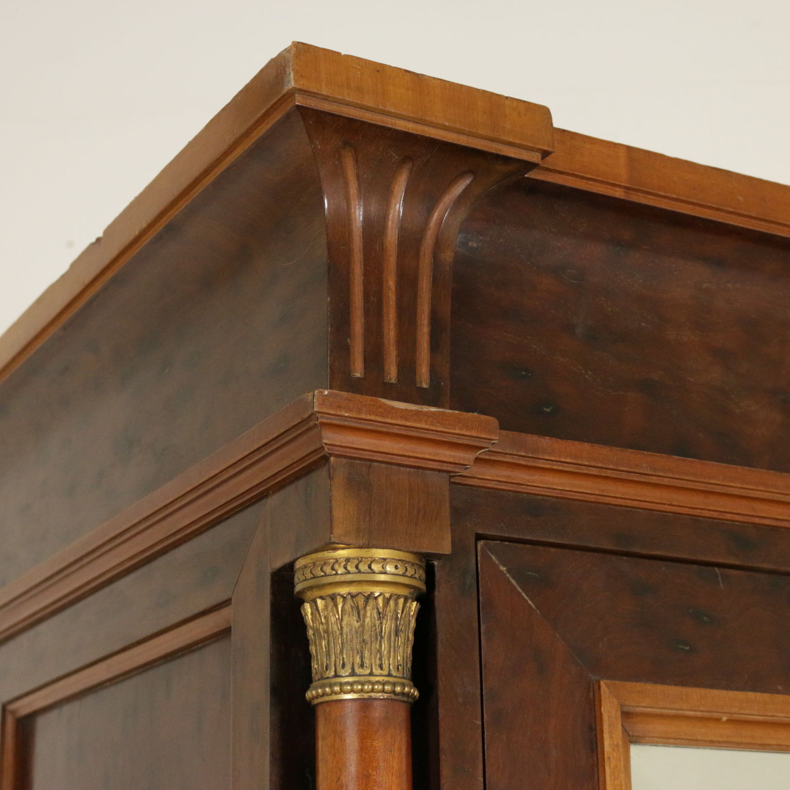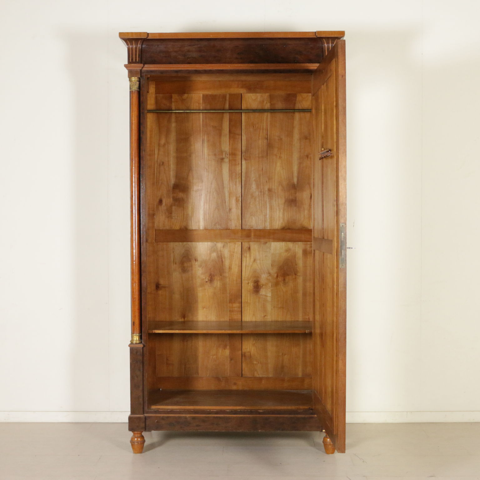 Elegante armadio ad un'anta con specchio bisellato. Montanti con colonne intere con capitelli in ottone. Piedi torniti.