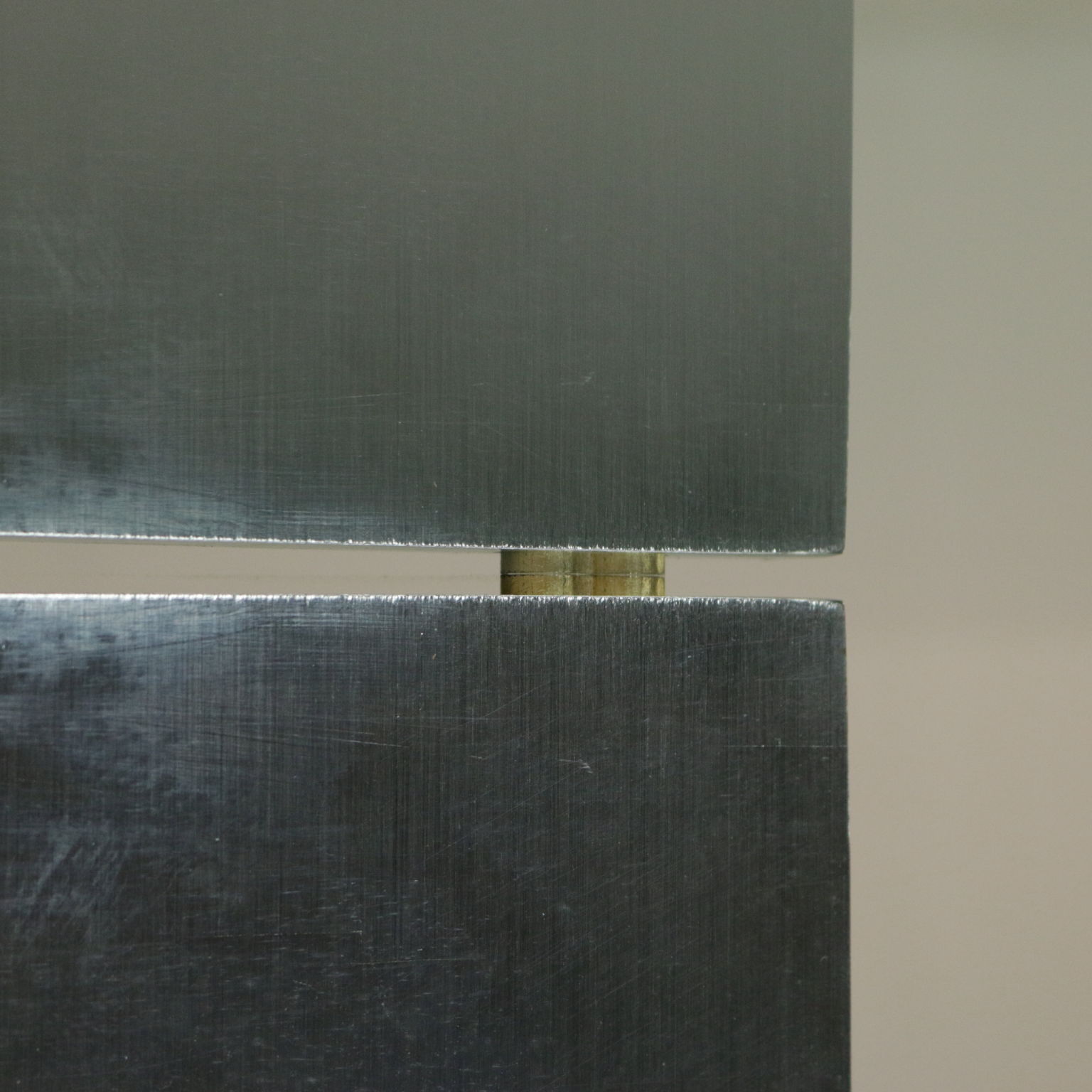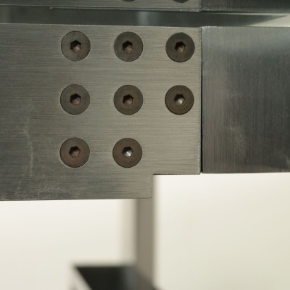 Tavolo; struttura in acciaio con distanziali in ottone, piano in vetro.