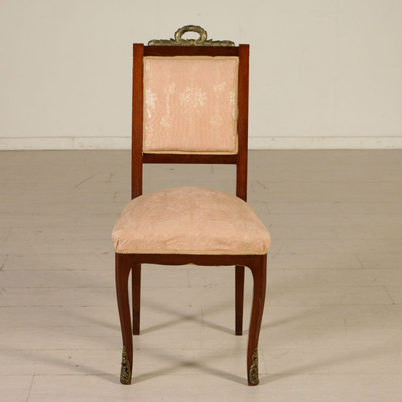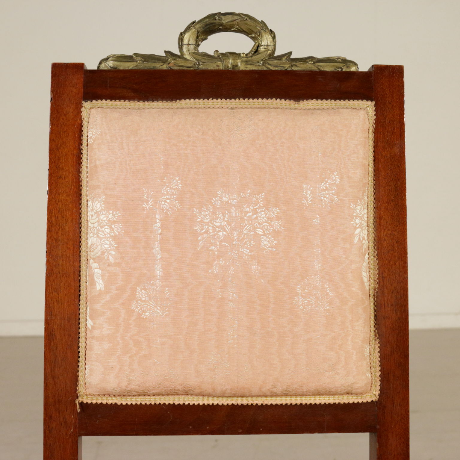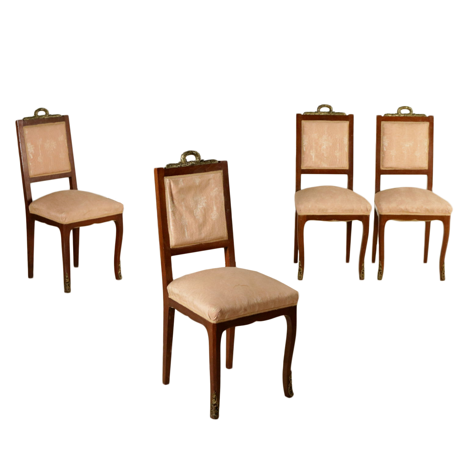 Gruppo di sedie con cimasa intagliata e dorata. Seduta e schienale imbottiti.