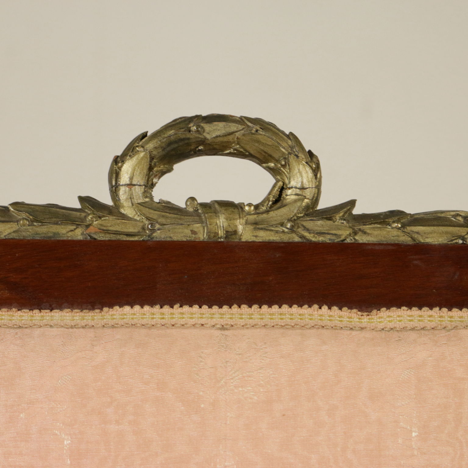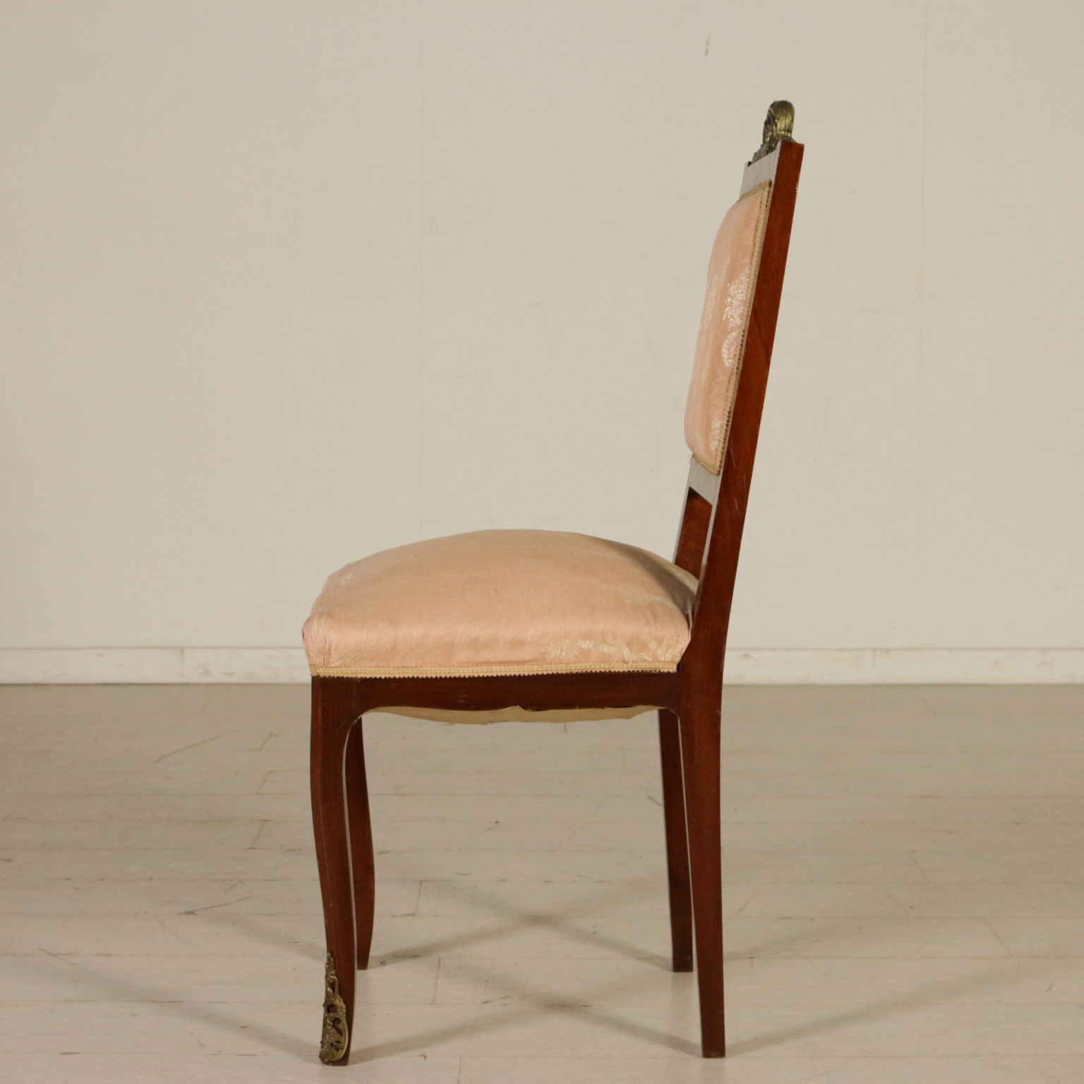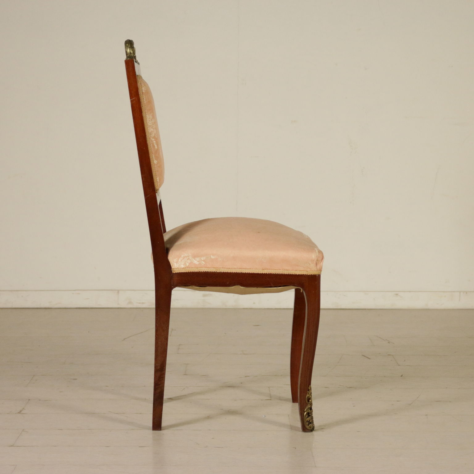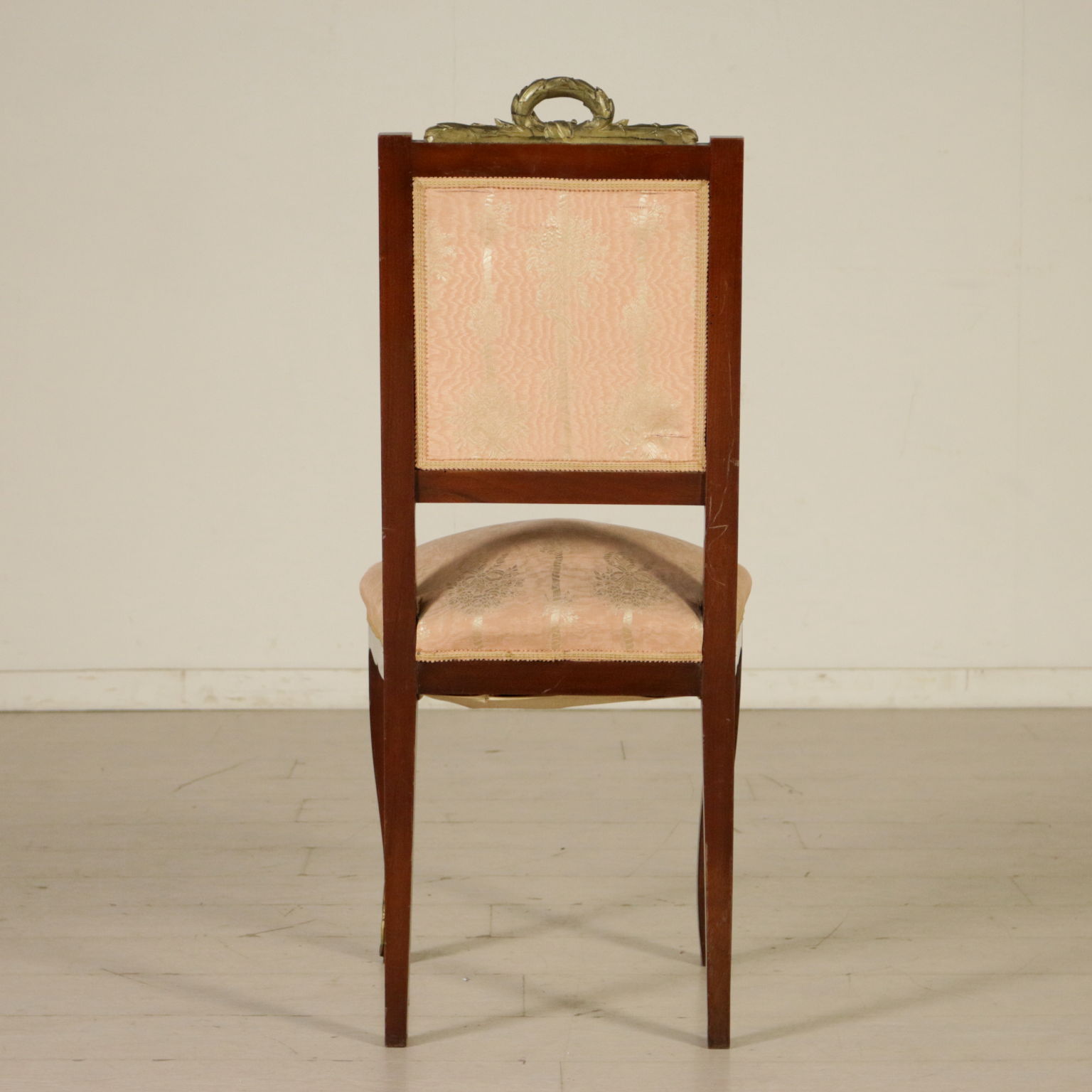 Gruppo di sedie con cimasa intagliata e dorata. Seduta e schienale imbottiti.