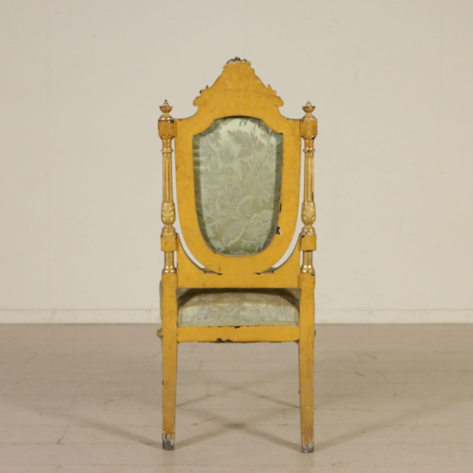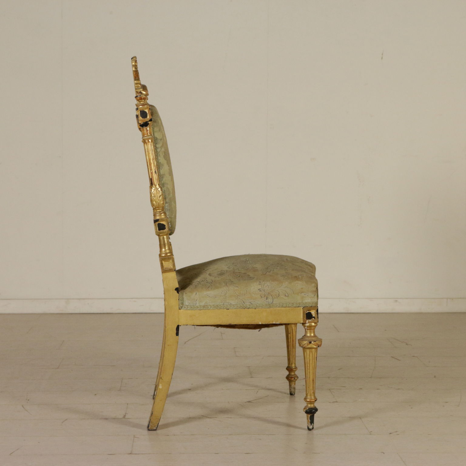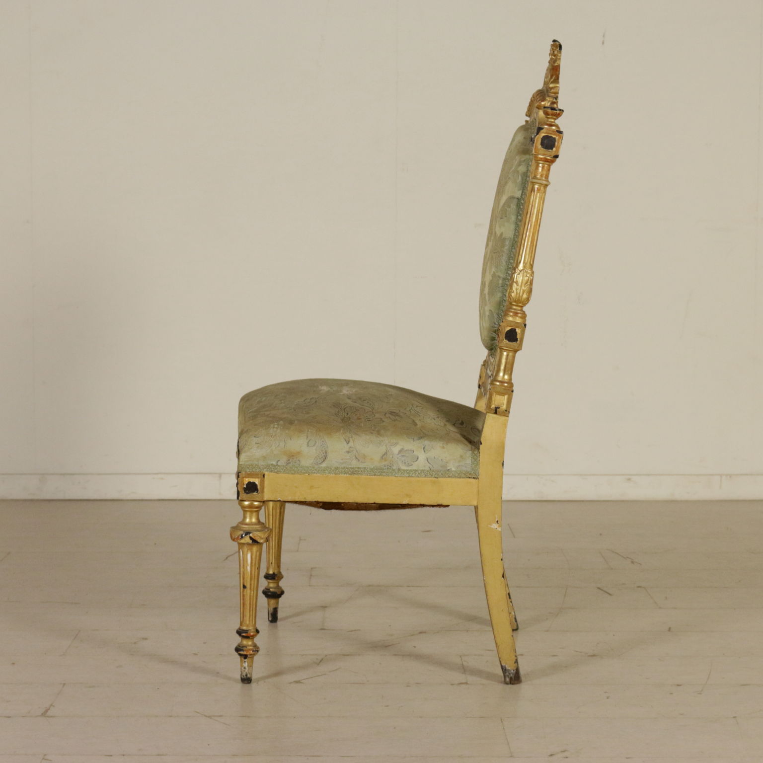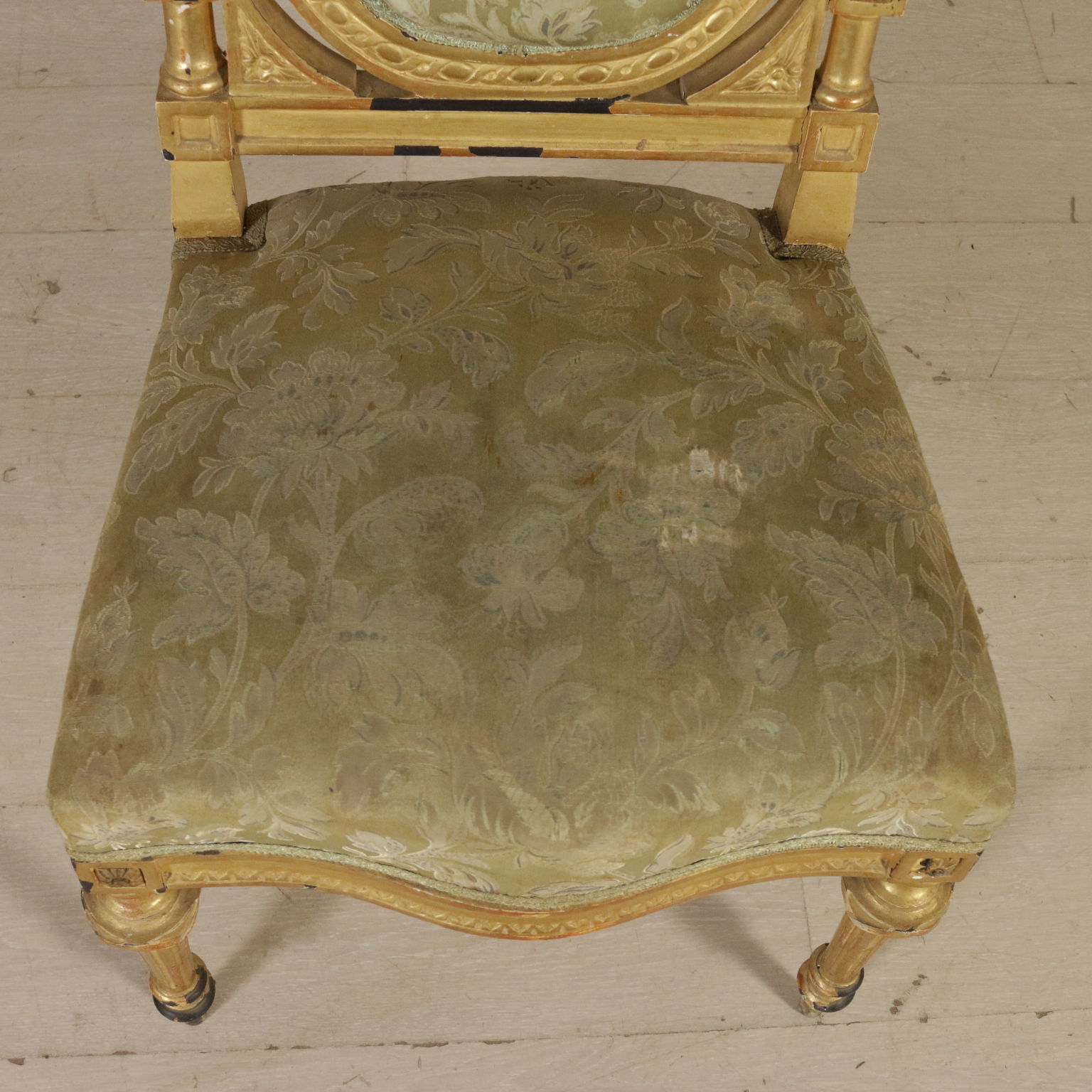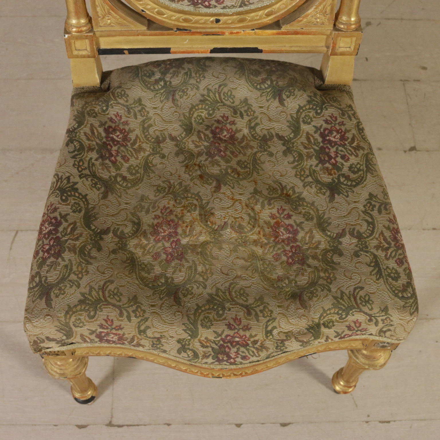 Gruppo di 4 sedie. Finemente intagliate, presentano schienale e seduta imbottiti.