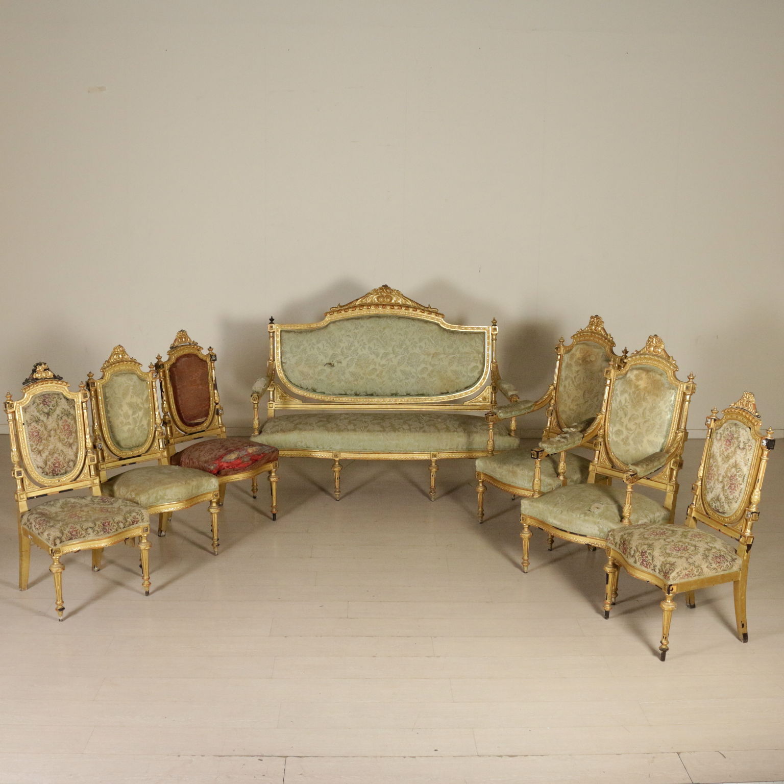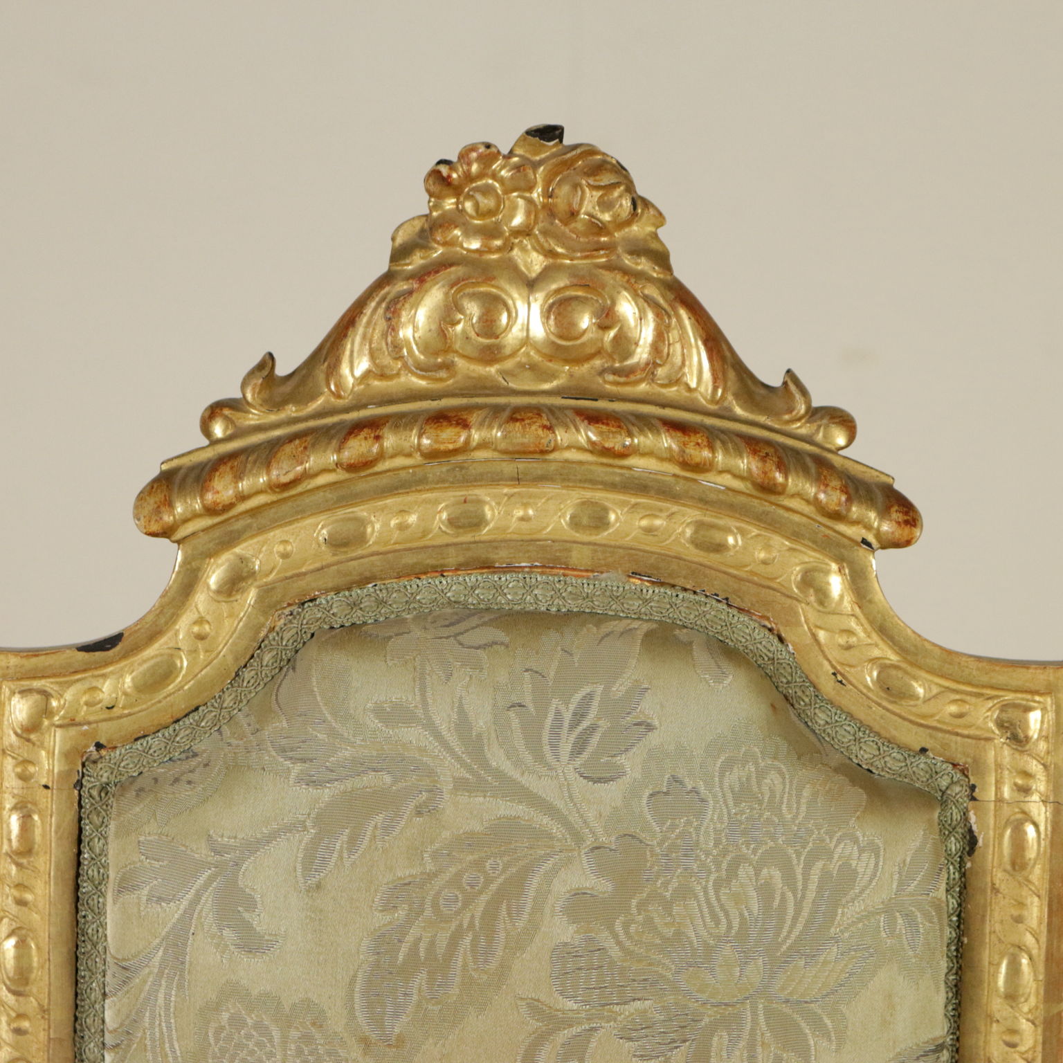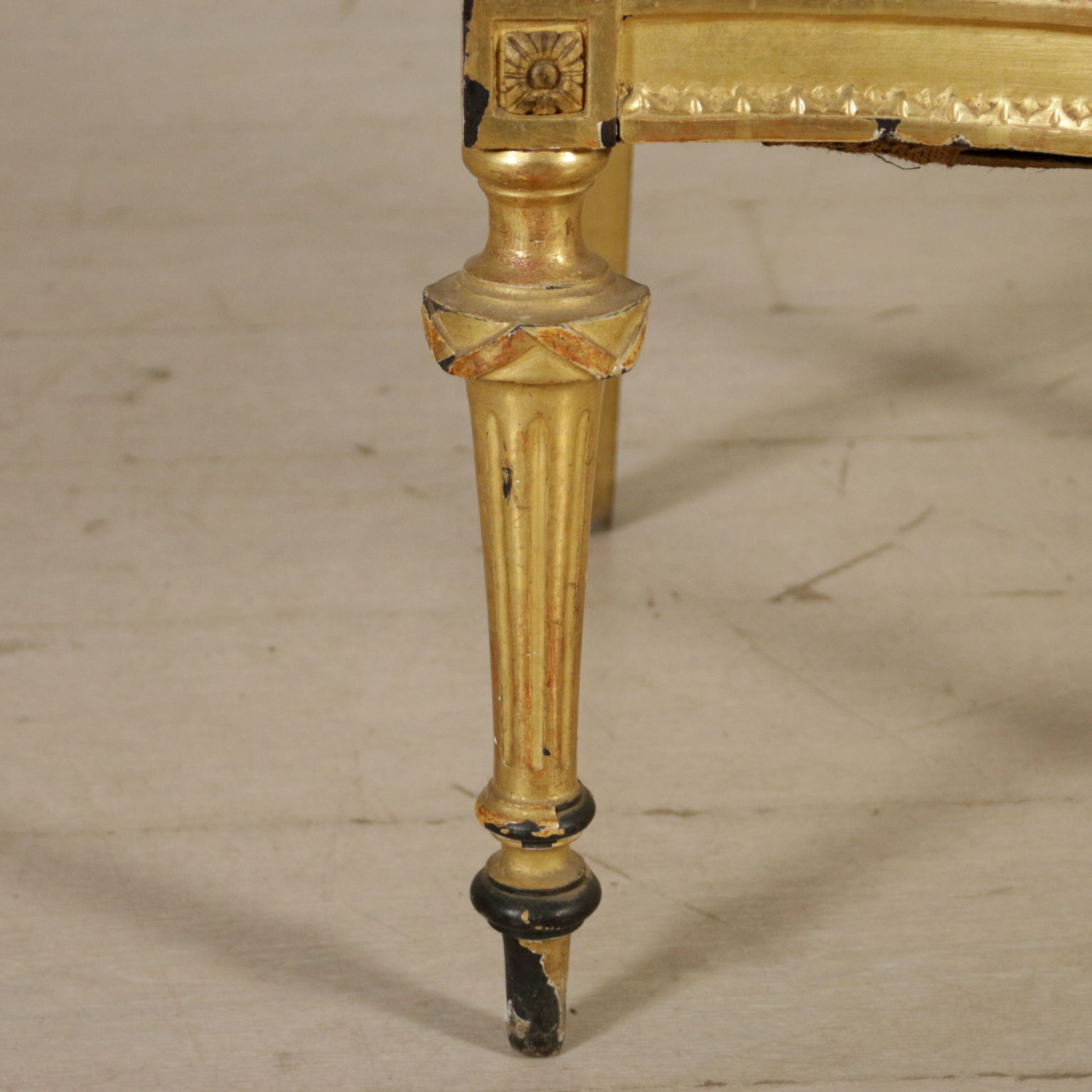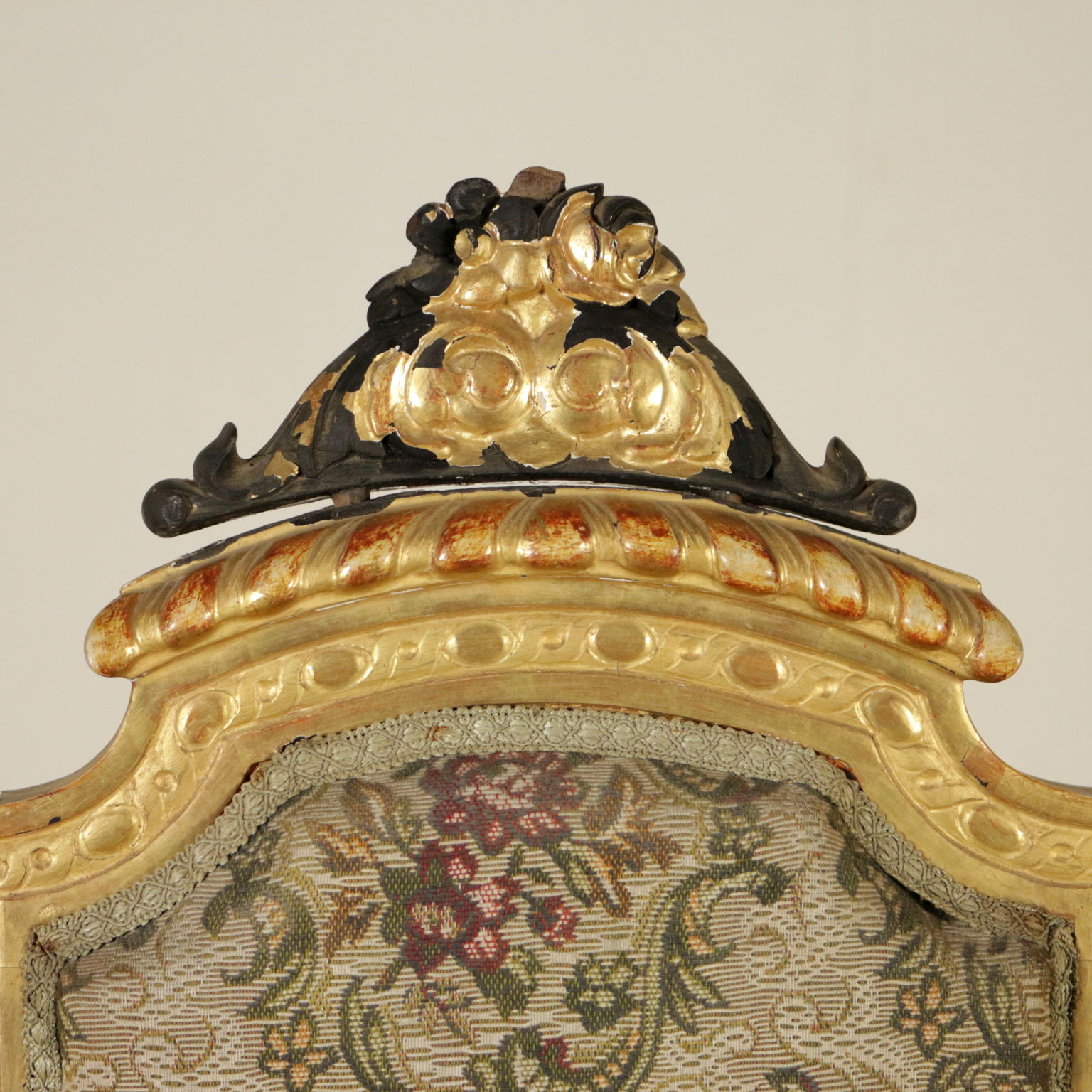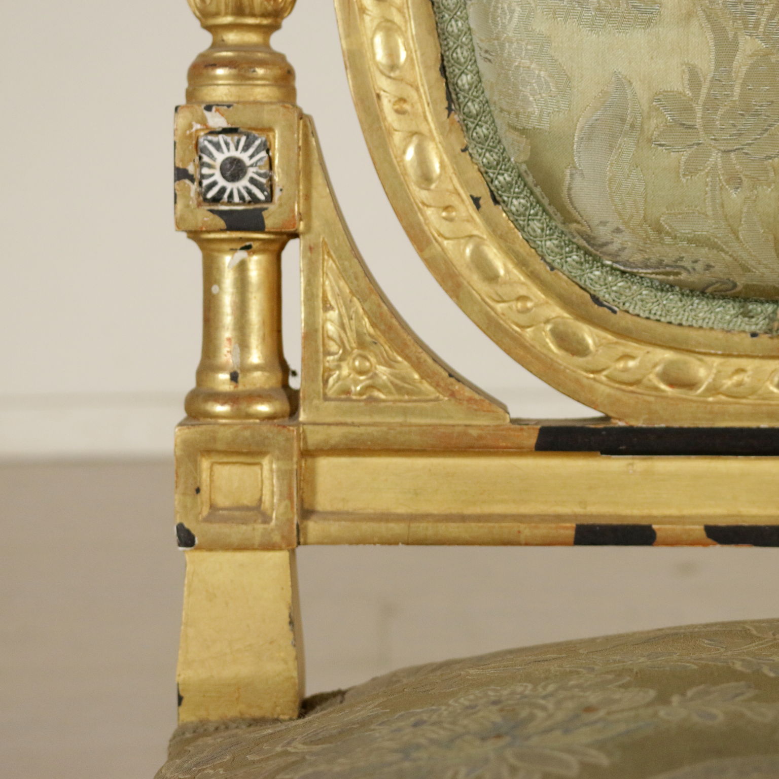 Gruppo di 4 sedie. Finemente intagliate, presentano schienale e seduta imbottiti.