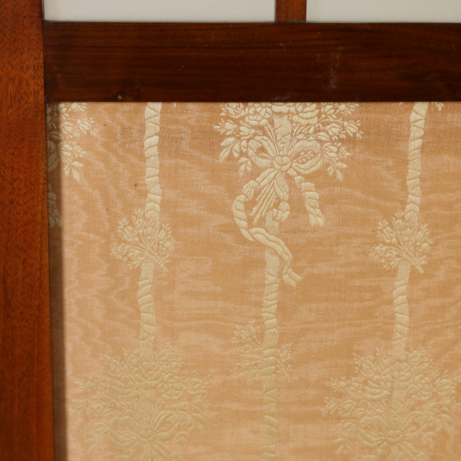 Paravento con pannello in stoffa e vetri satinati. Festoni intagliati e dorati.