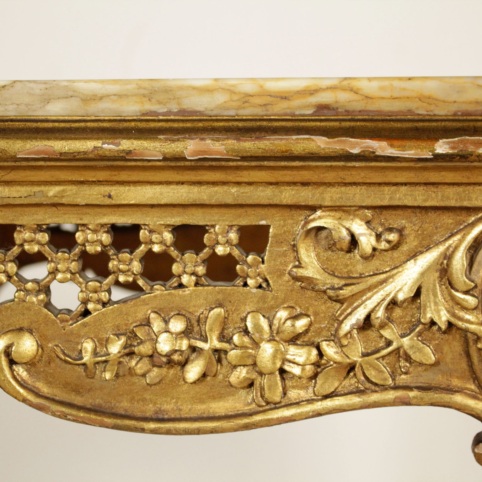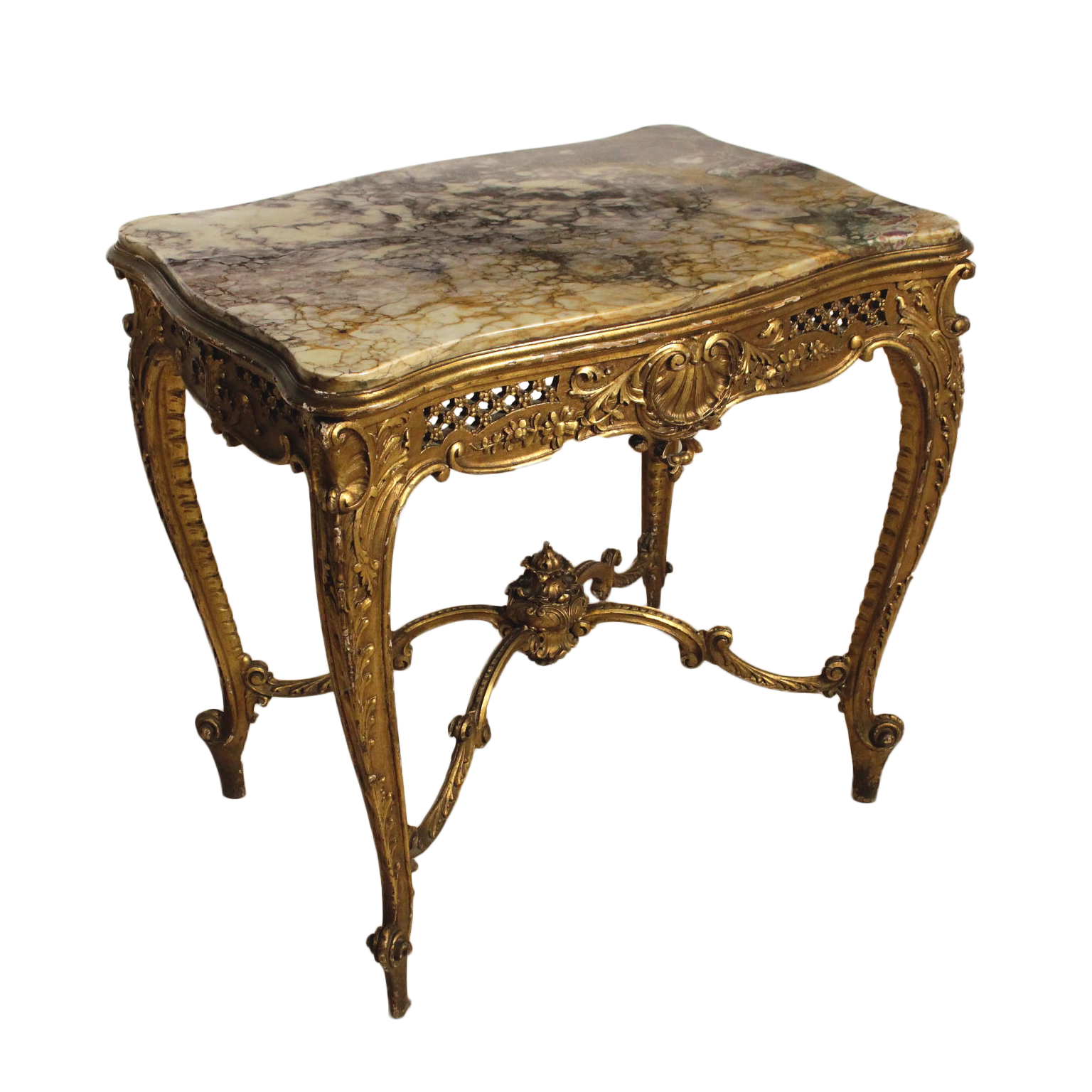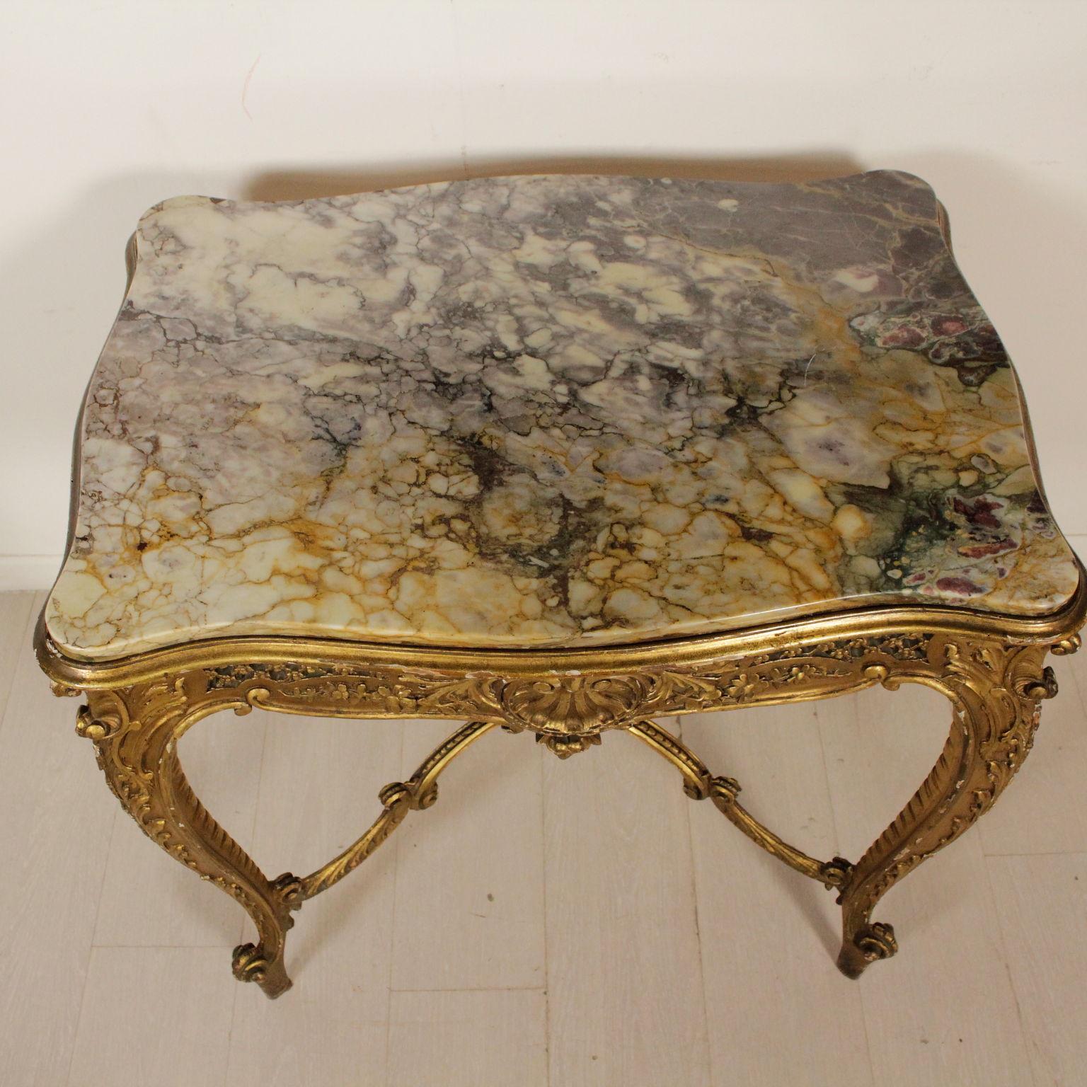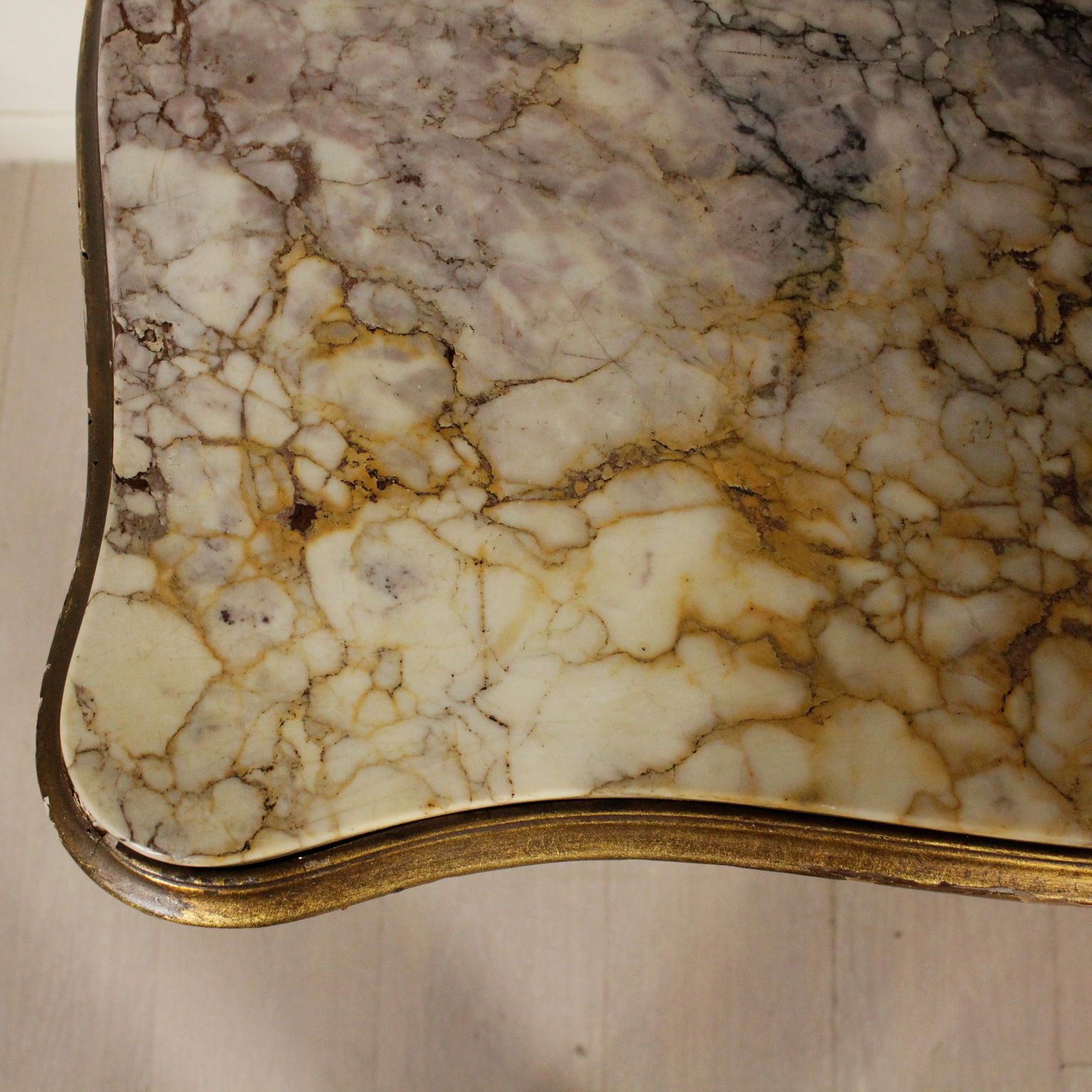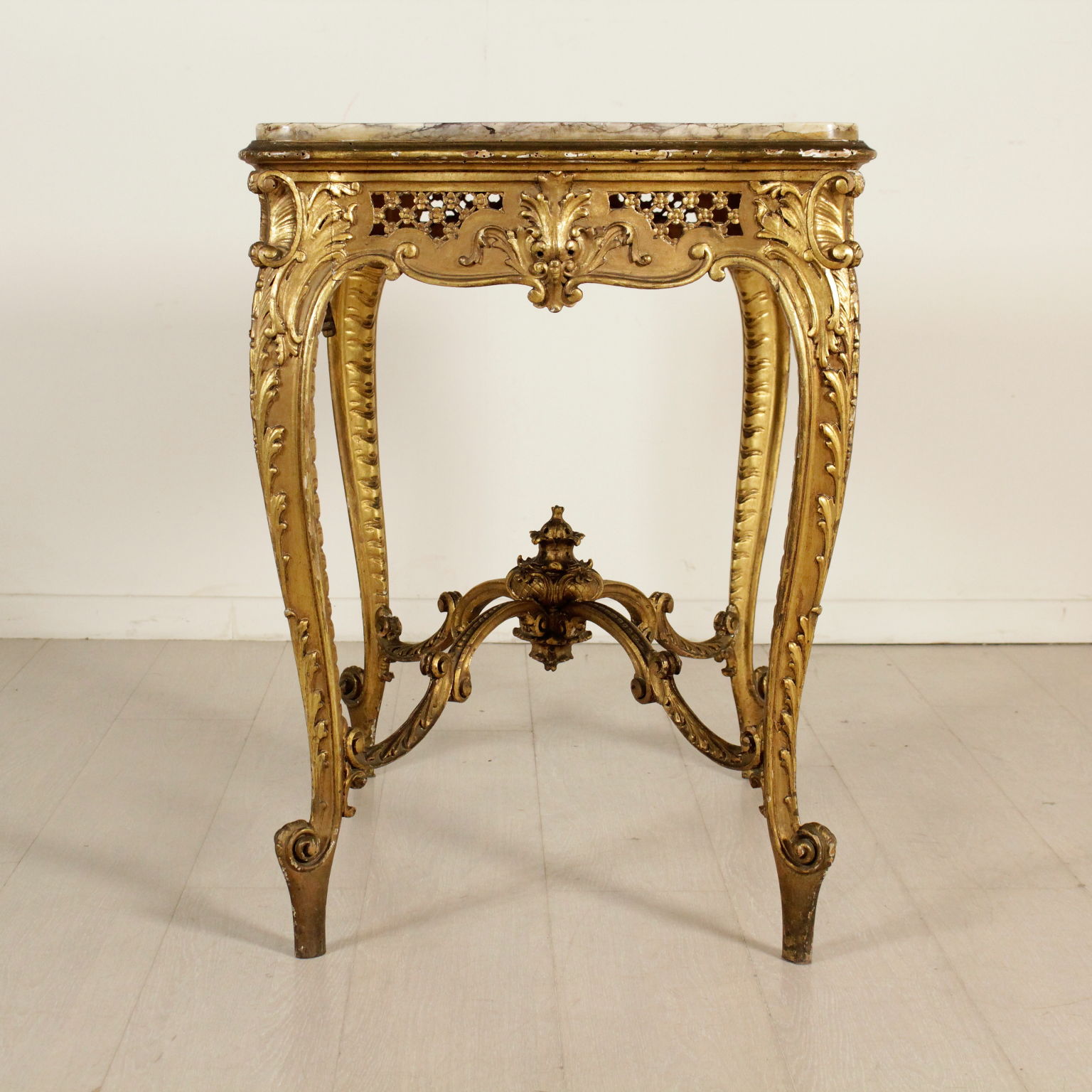 Tavolo dalla linea mossa finemente intagliato e traforato. Gambe raccordate da elegante crociera. Piano in marmo.