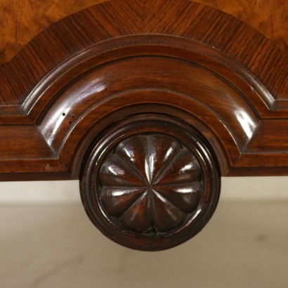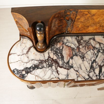 Elegante credenza dai fianchi arrotondati, presenta due ante con rilievi impiallacciati in radica alternati a cornici ebanizzate. Piano in marmo, alzata con colonnine e fregi in ferro lavorato.