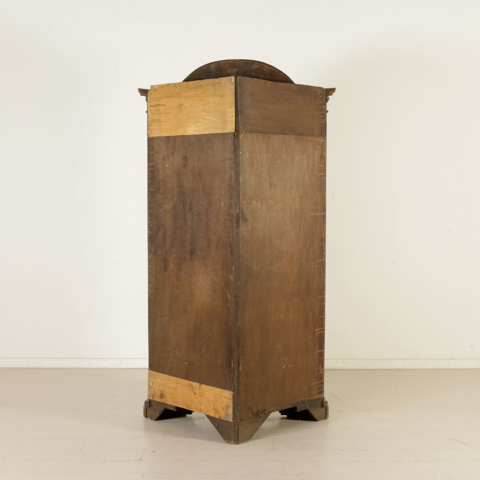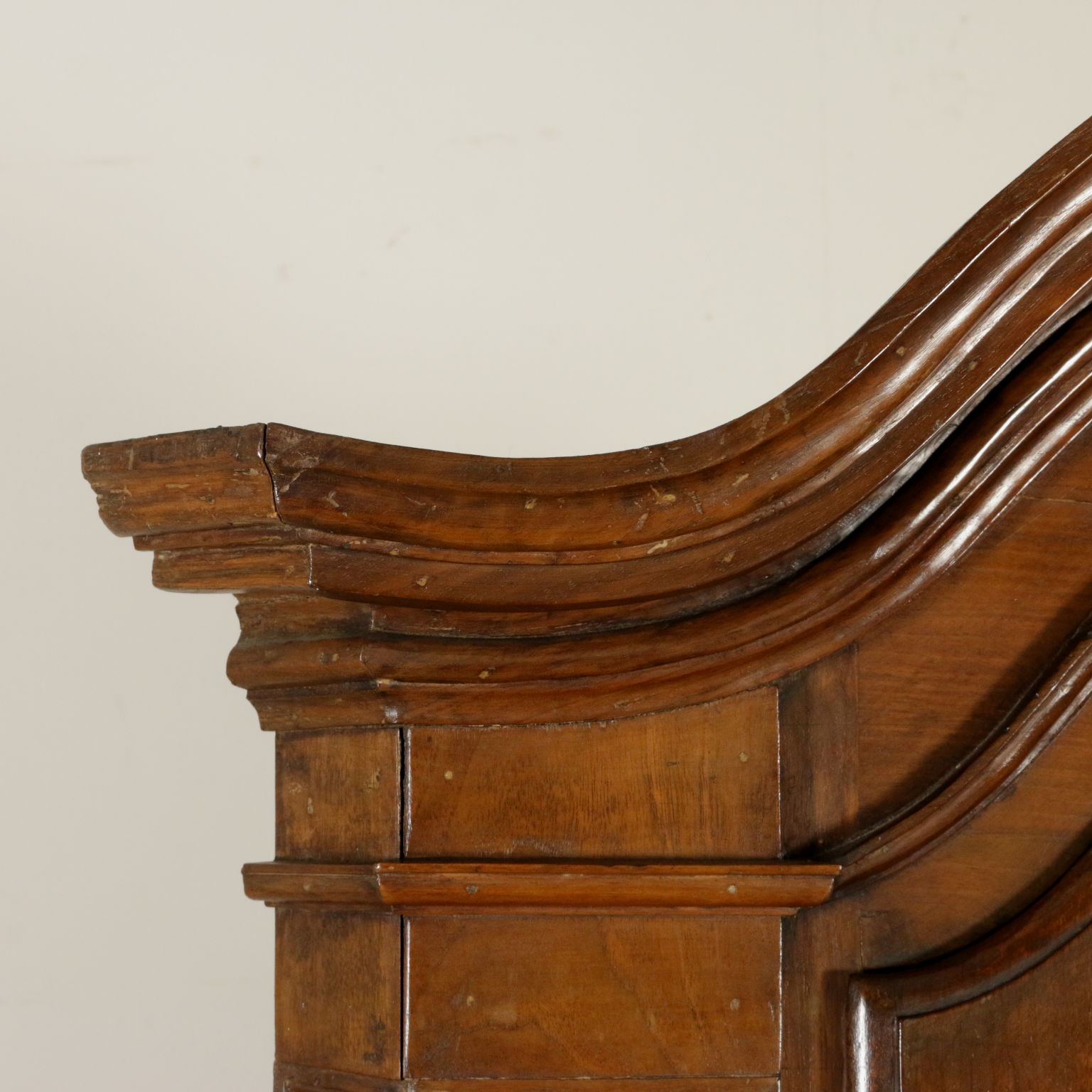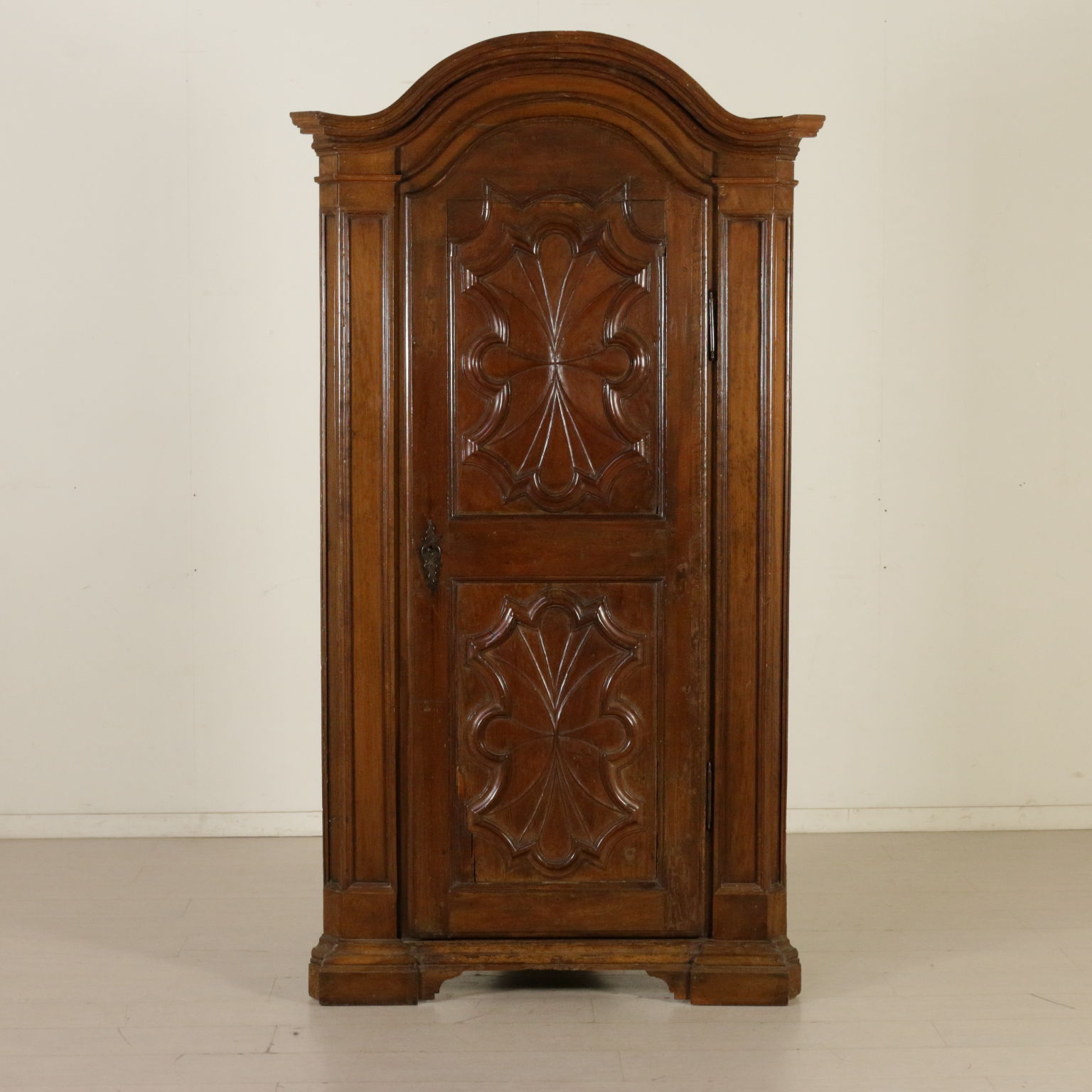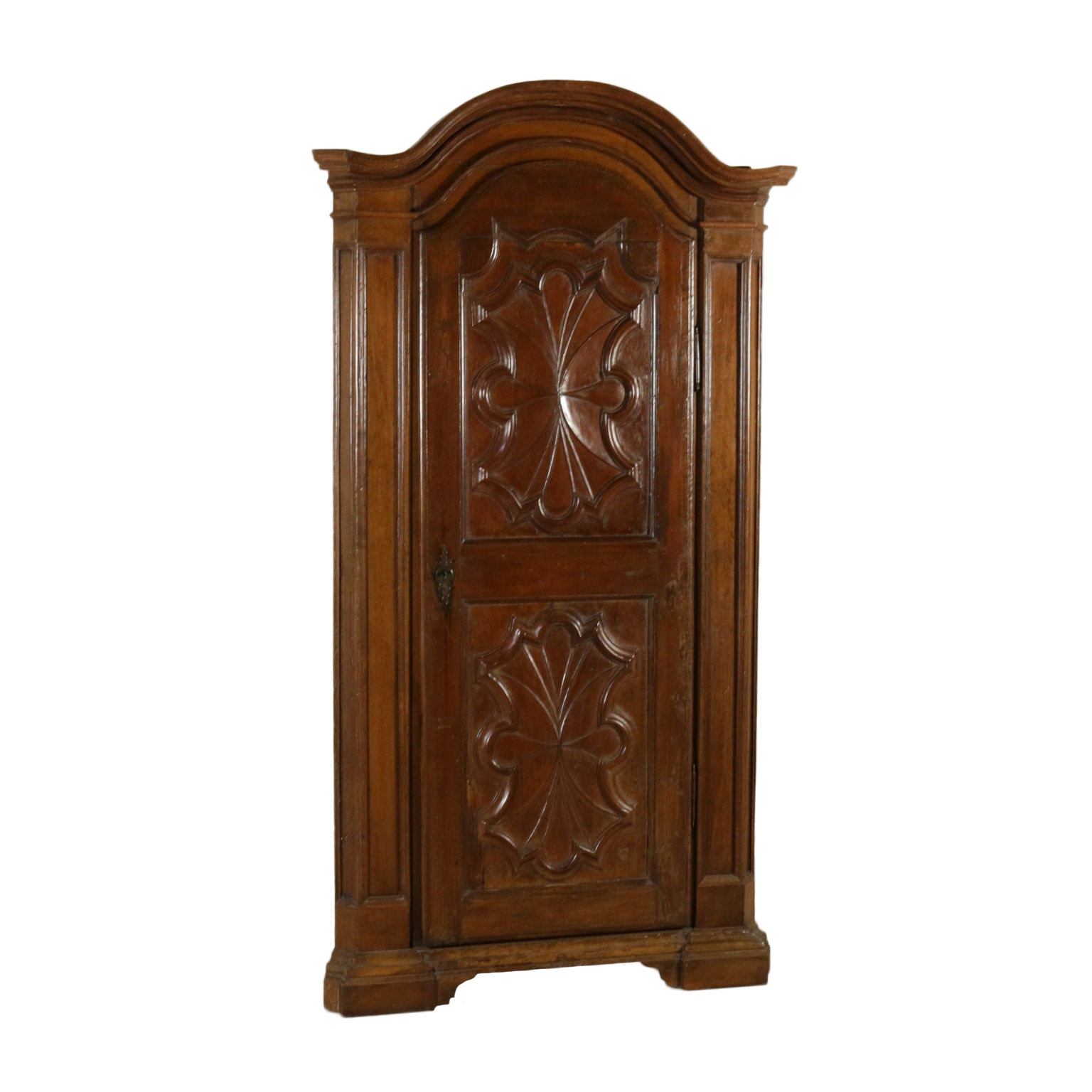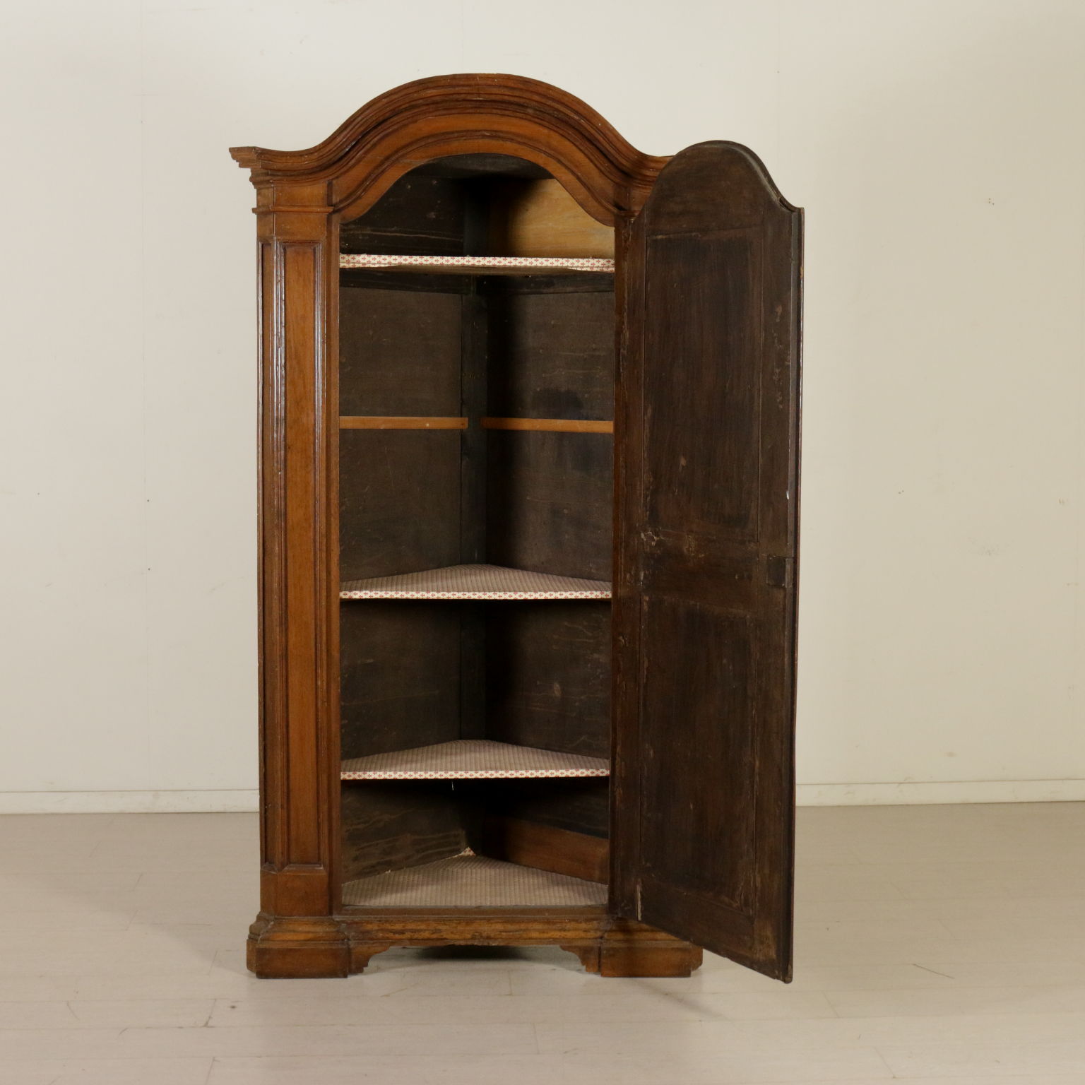 Angoliera retta da piedi a mensola, presenta un'anta originale del XVIII secolo con intaglio "a ragnatela". Riassemblata nella prima metà del '900. Cimasa centinata.