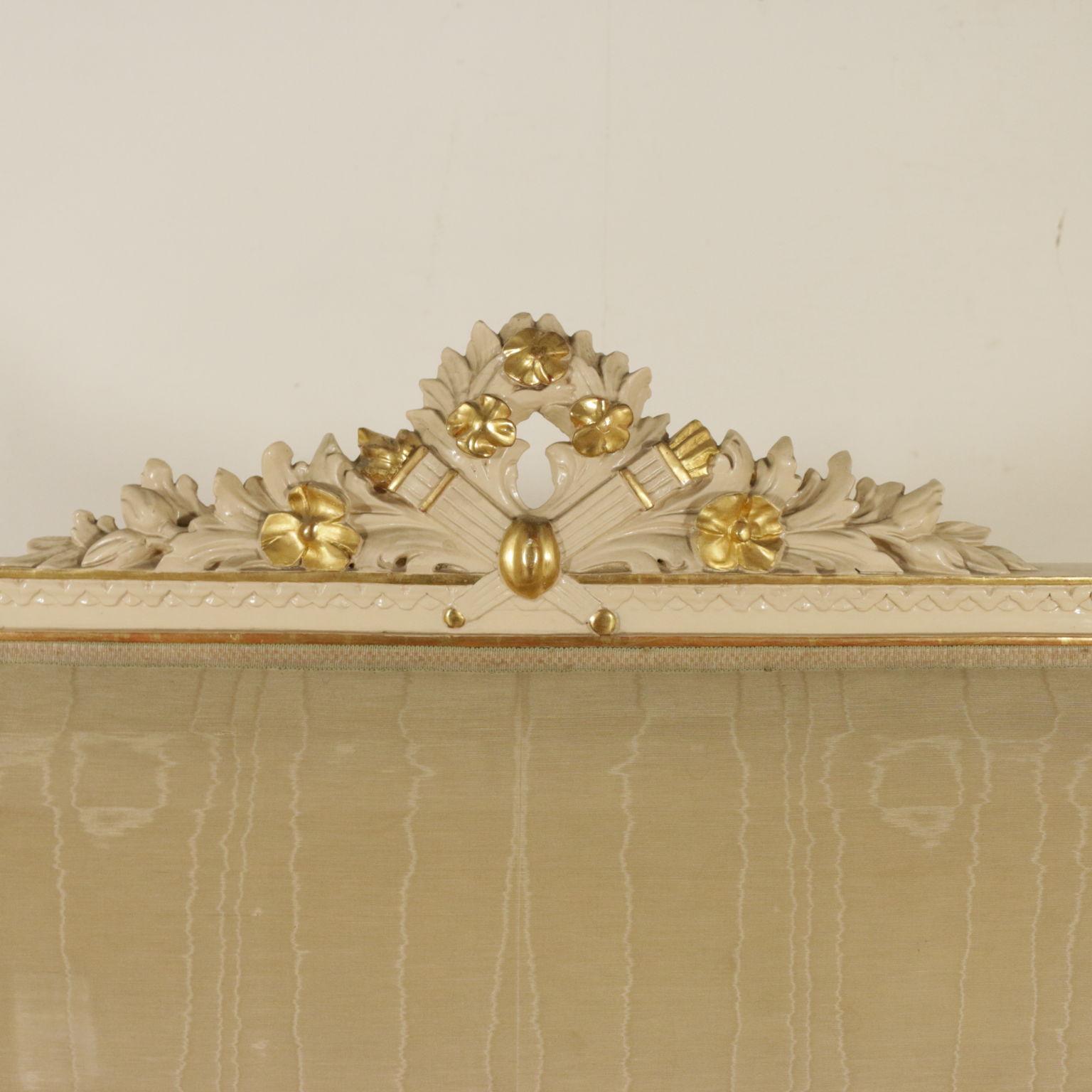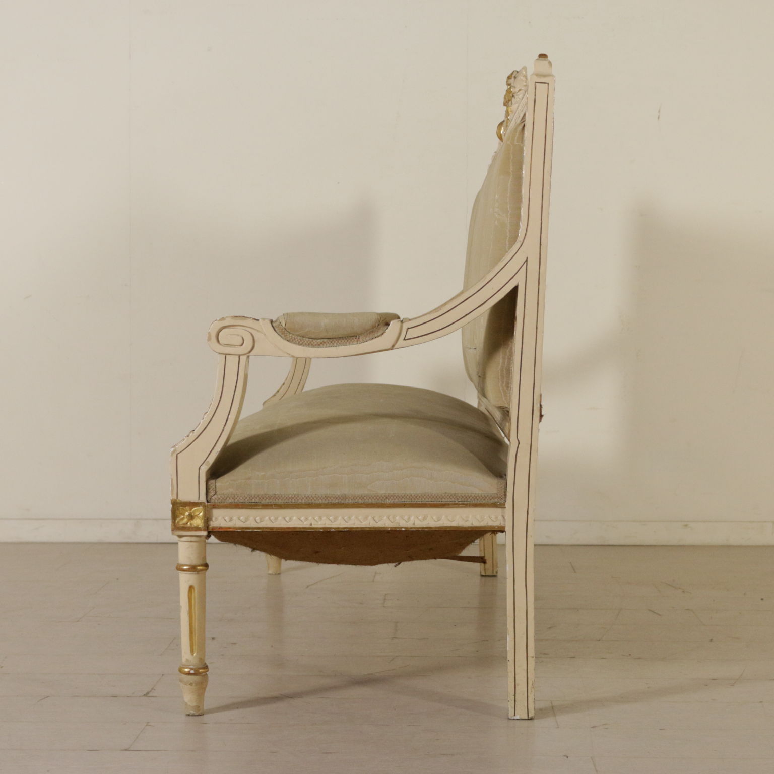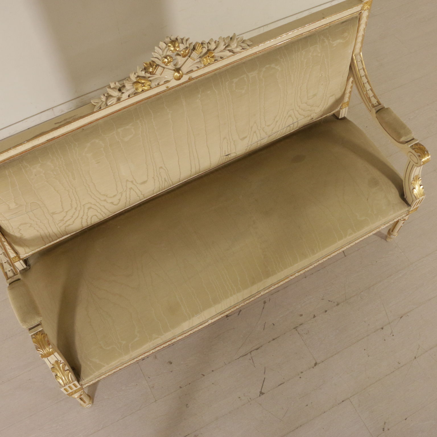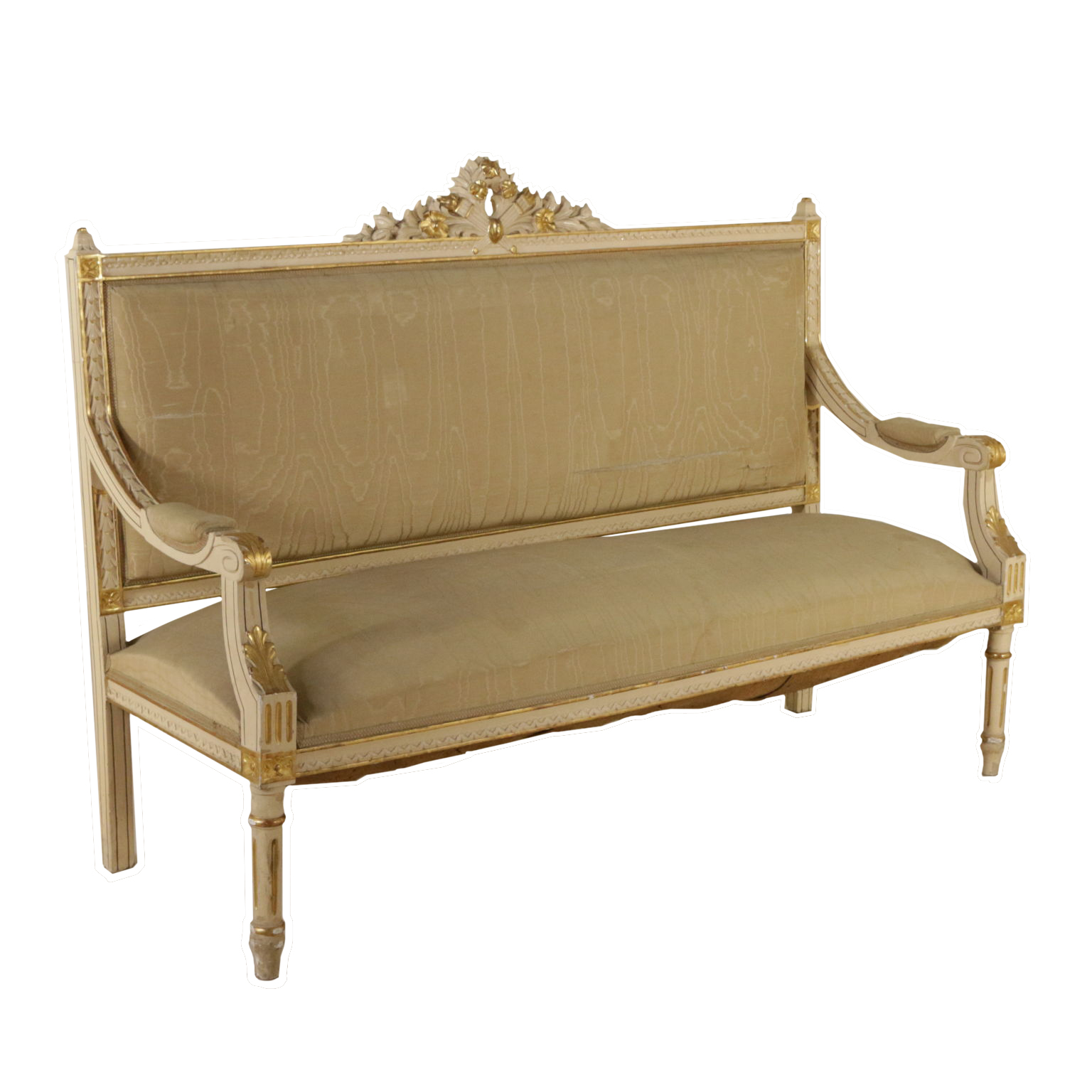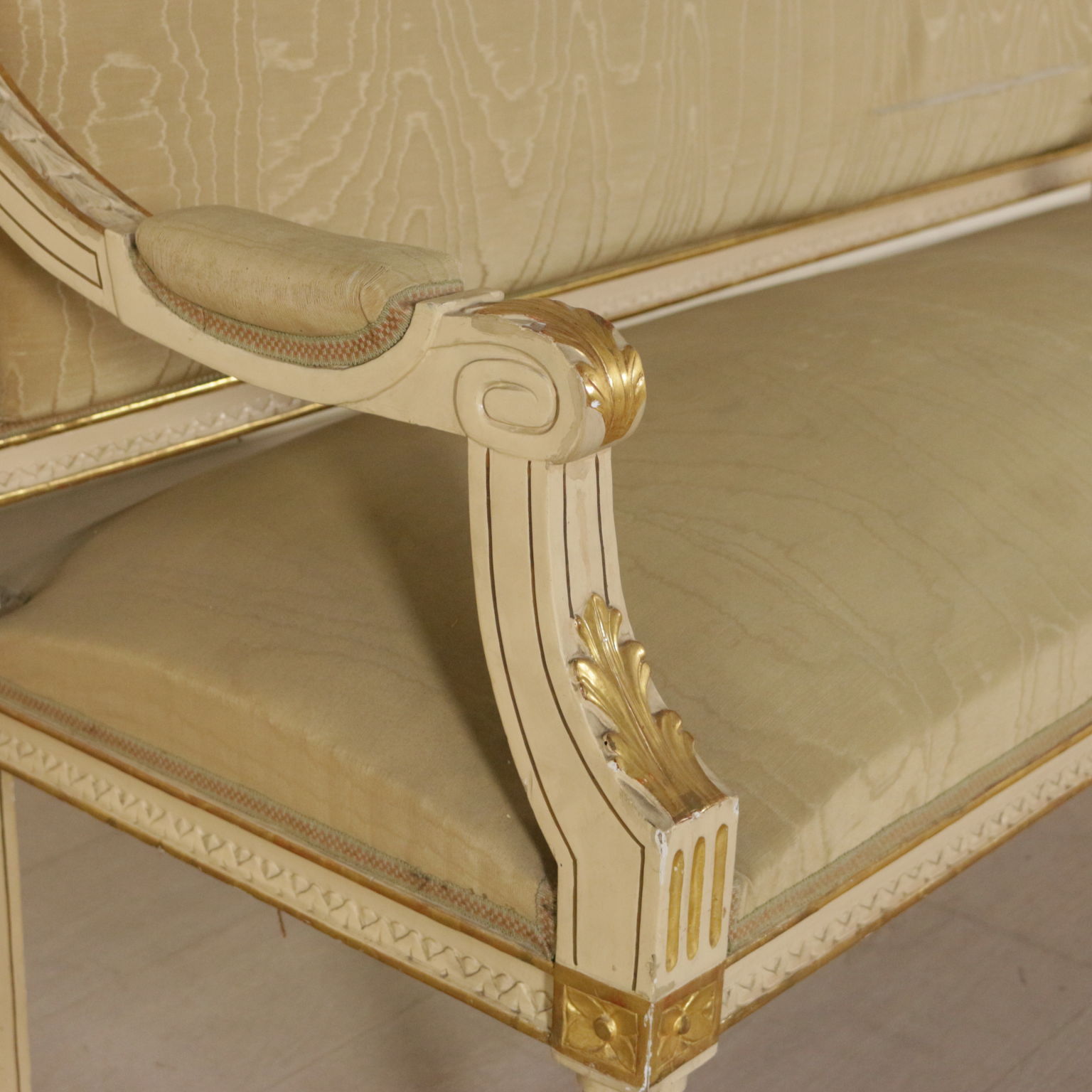 Divano in stile Neoclassico finemente intagliato. Seduta e schienale imbottiti. Laccato e dorato.