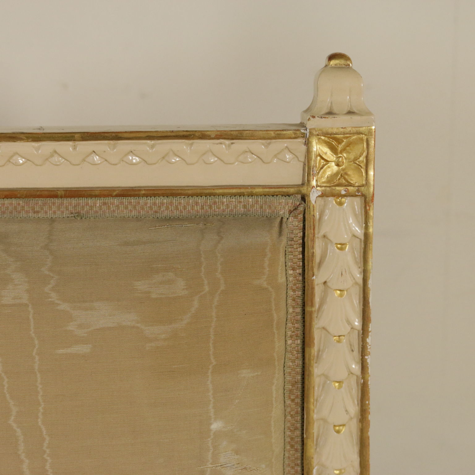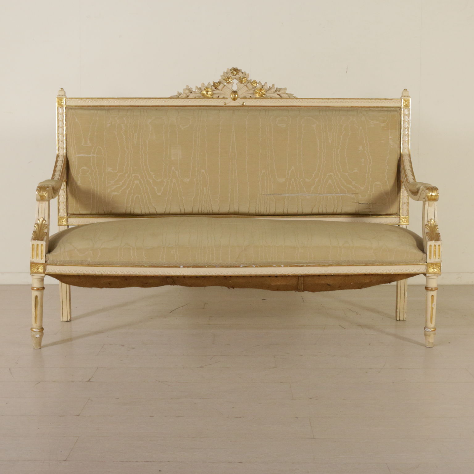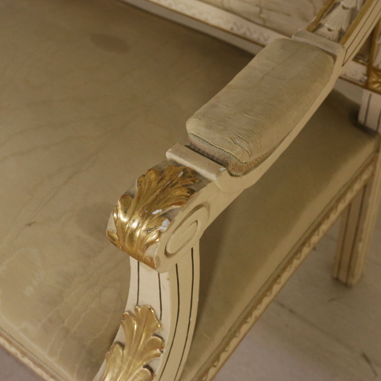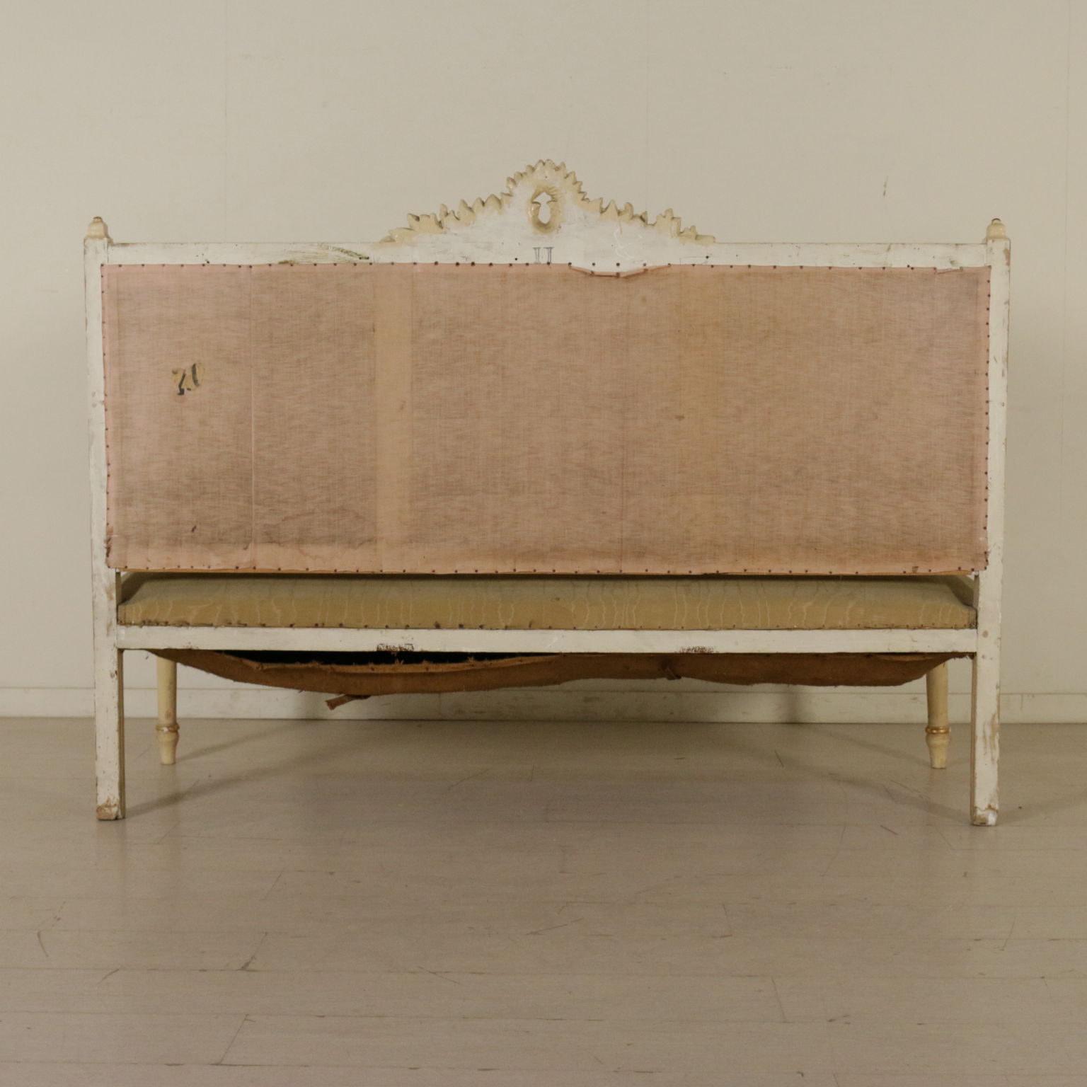 Divano in stile Neoclassico finemente intagliato. Seduta e schienale imbottiti. Laccato e dorato.