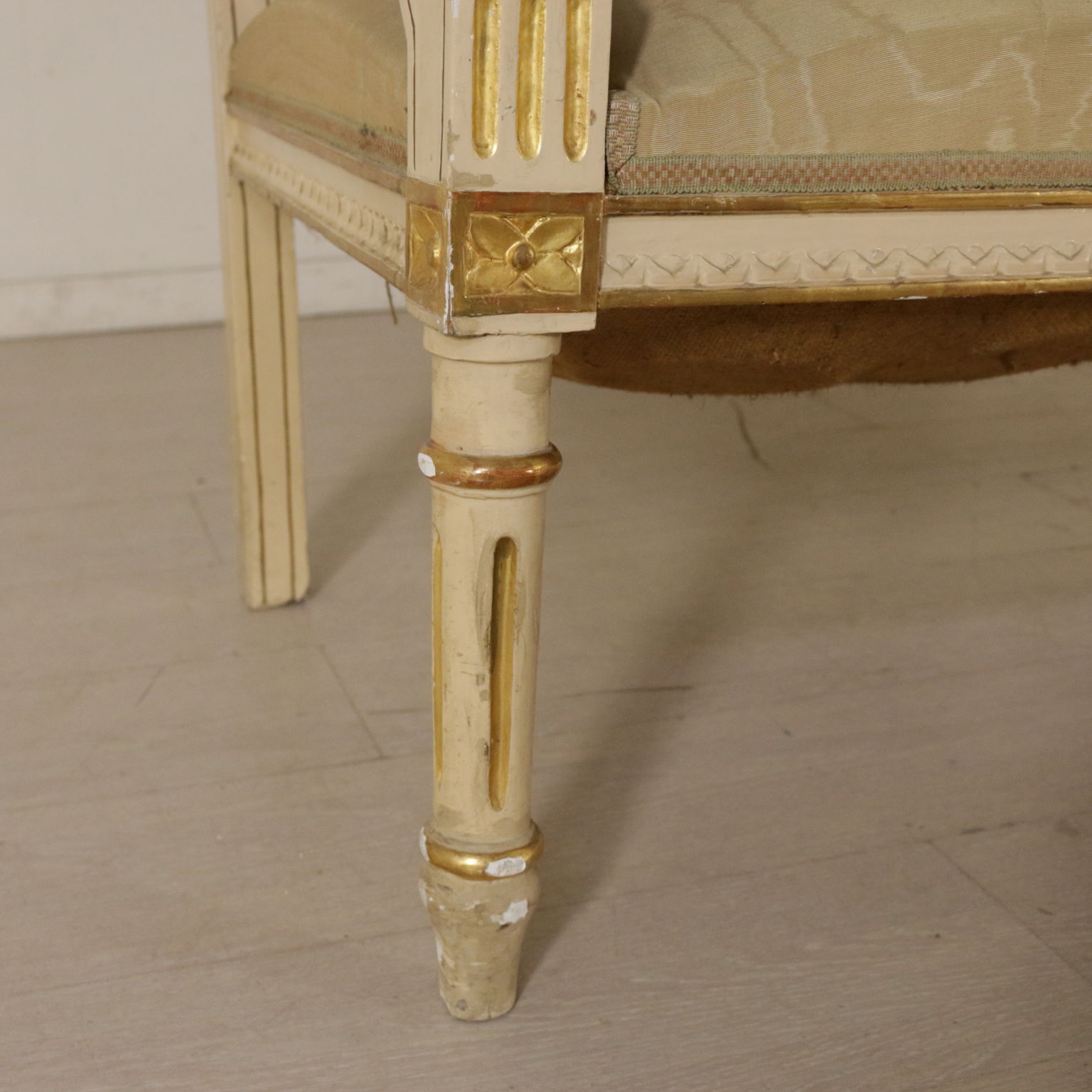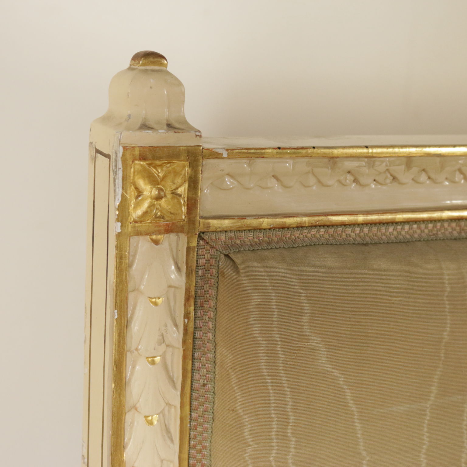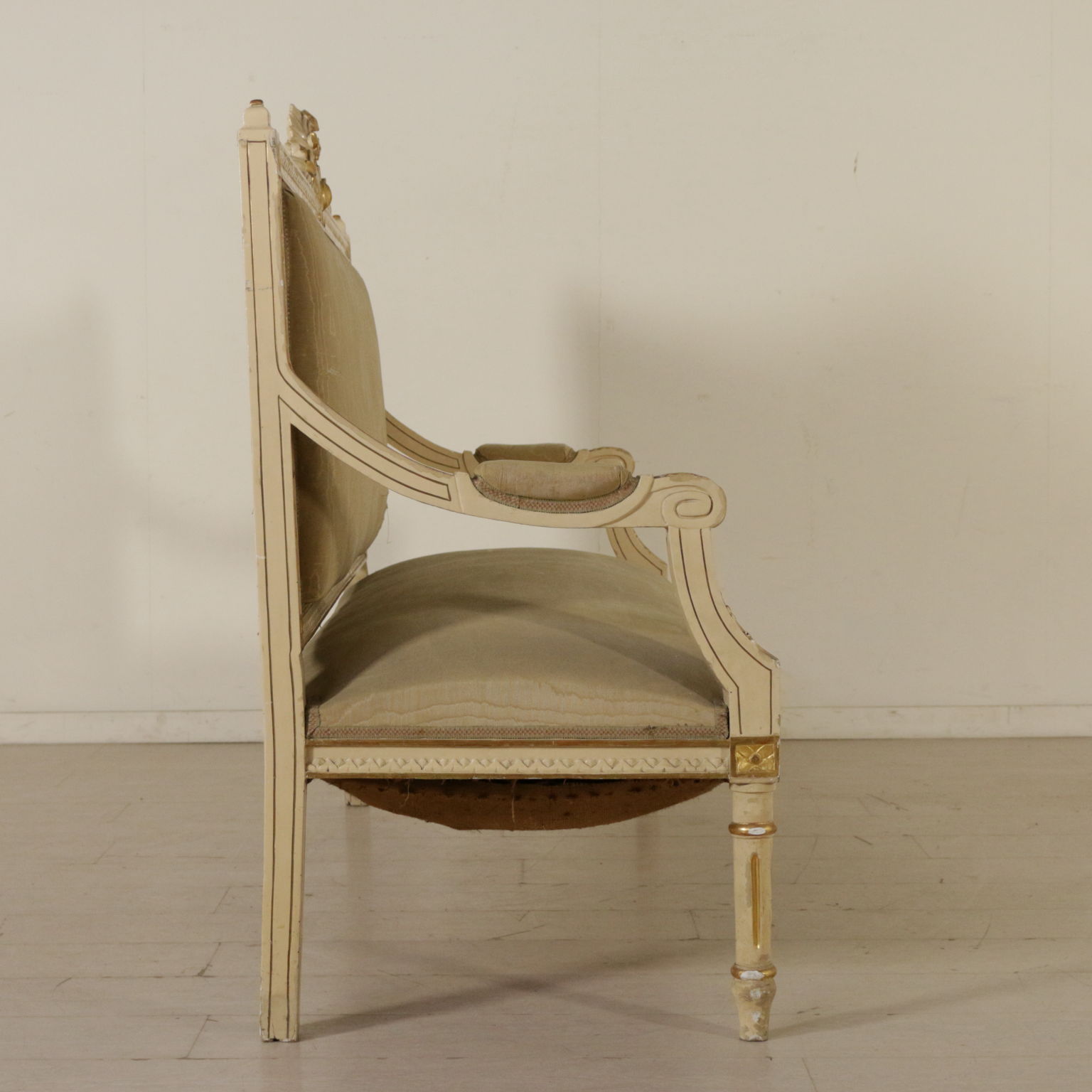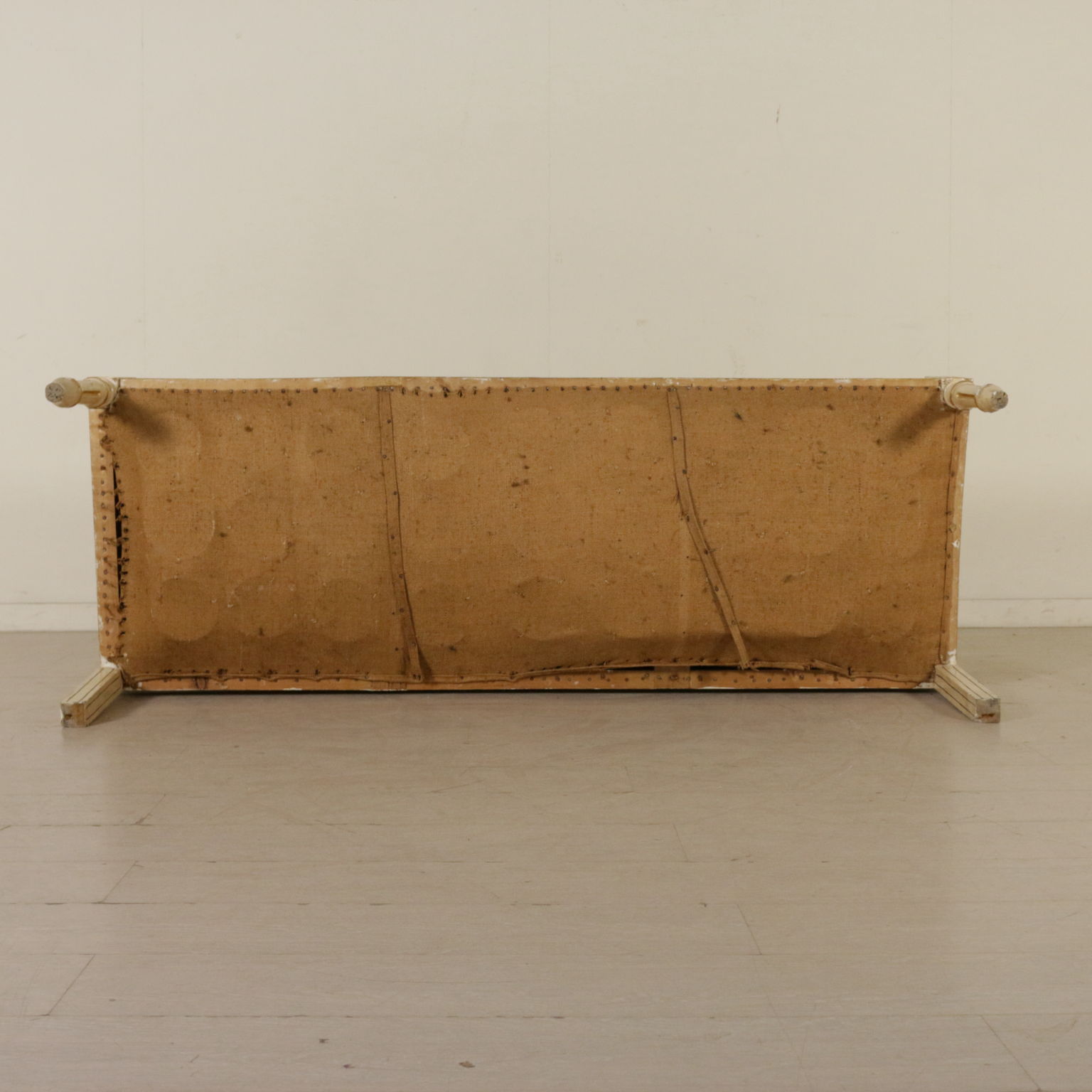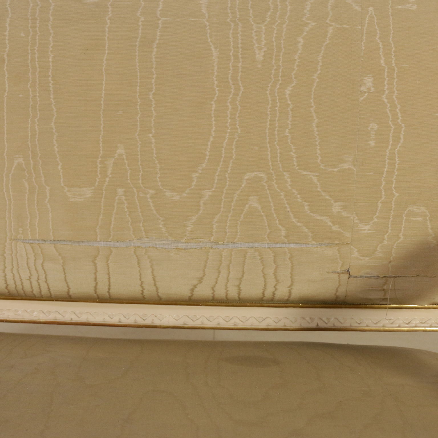 Divano in stile Neoclassico finemente intagliato. Seduta e schienale imbottiti. Laccato e dorato.
