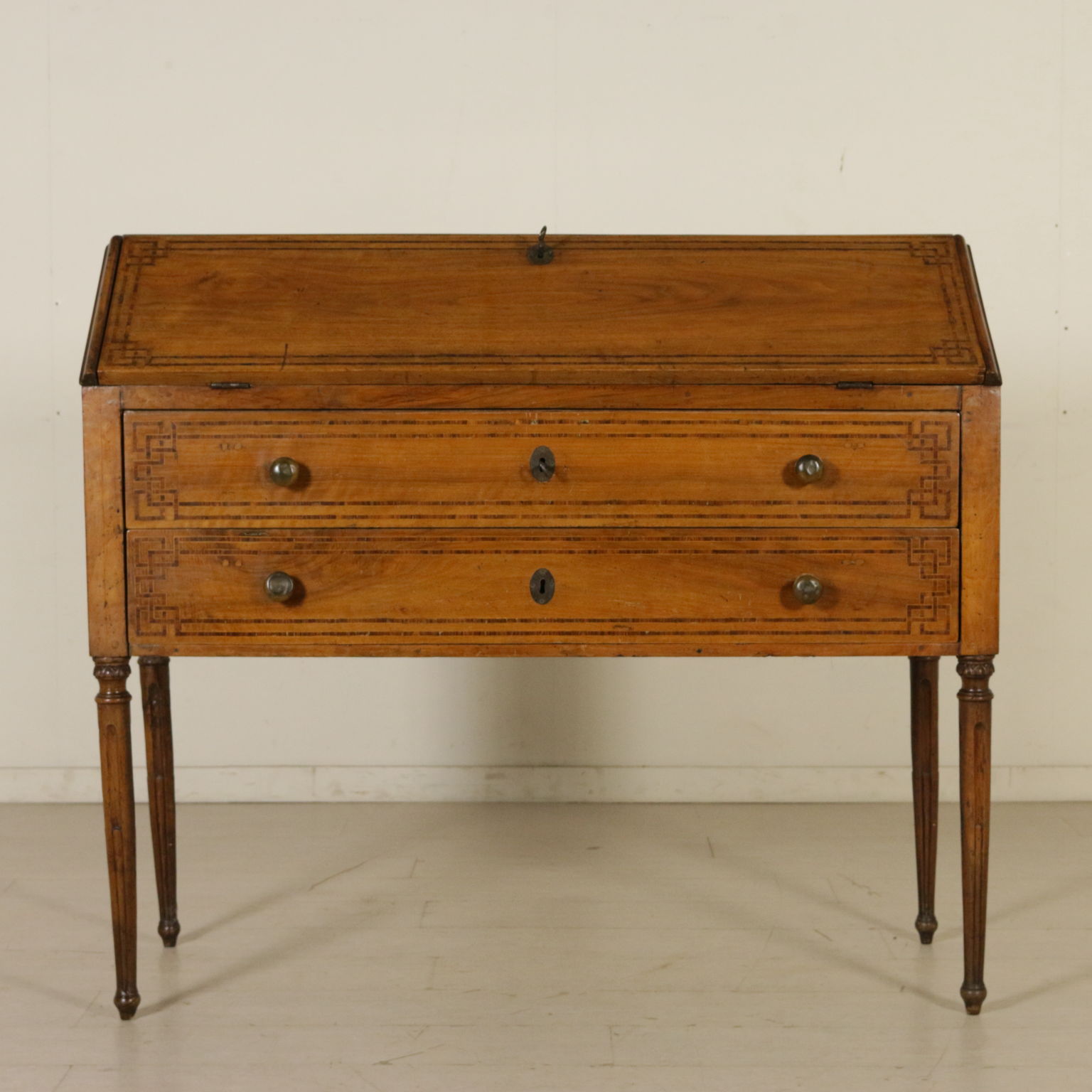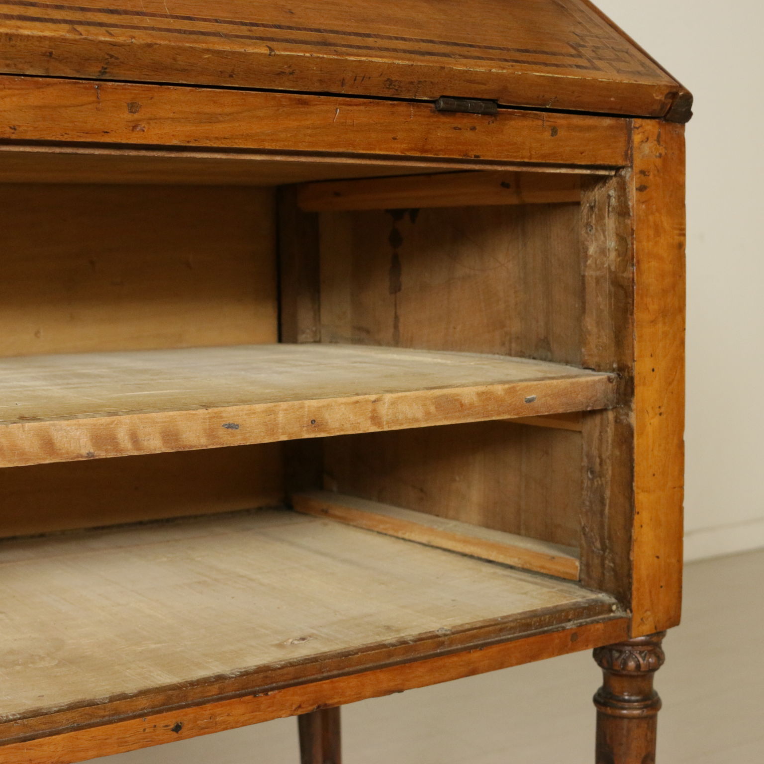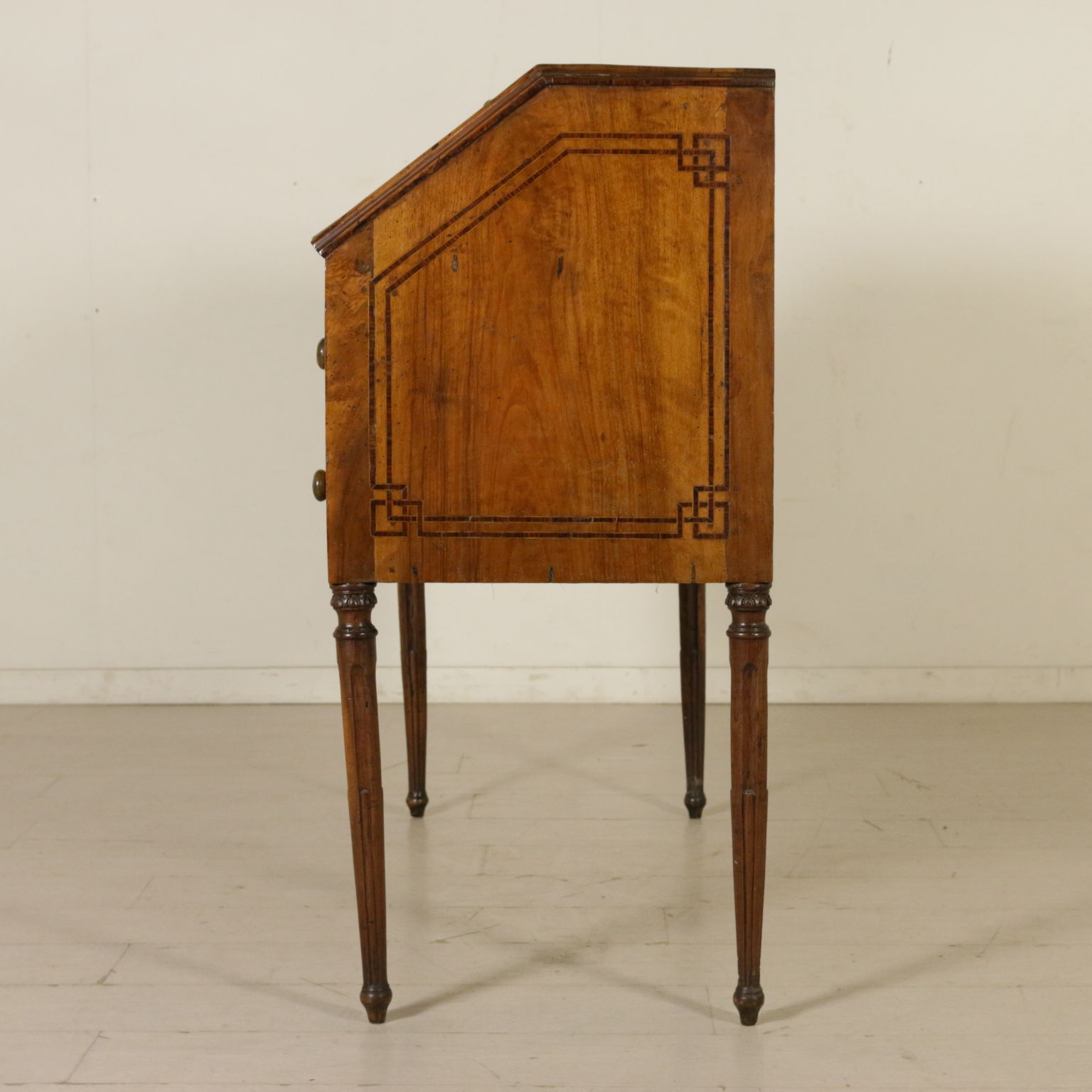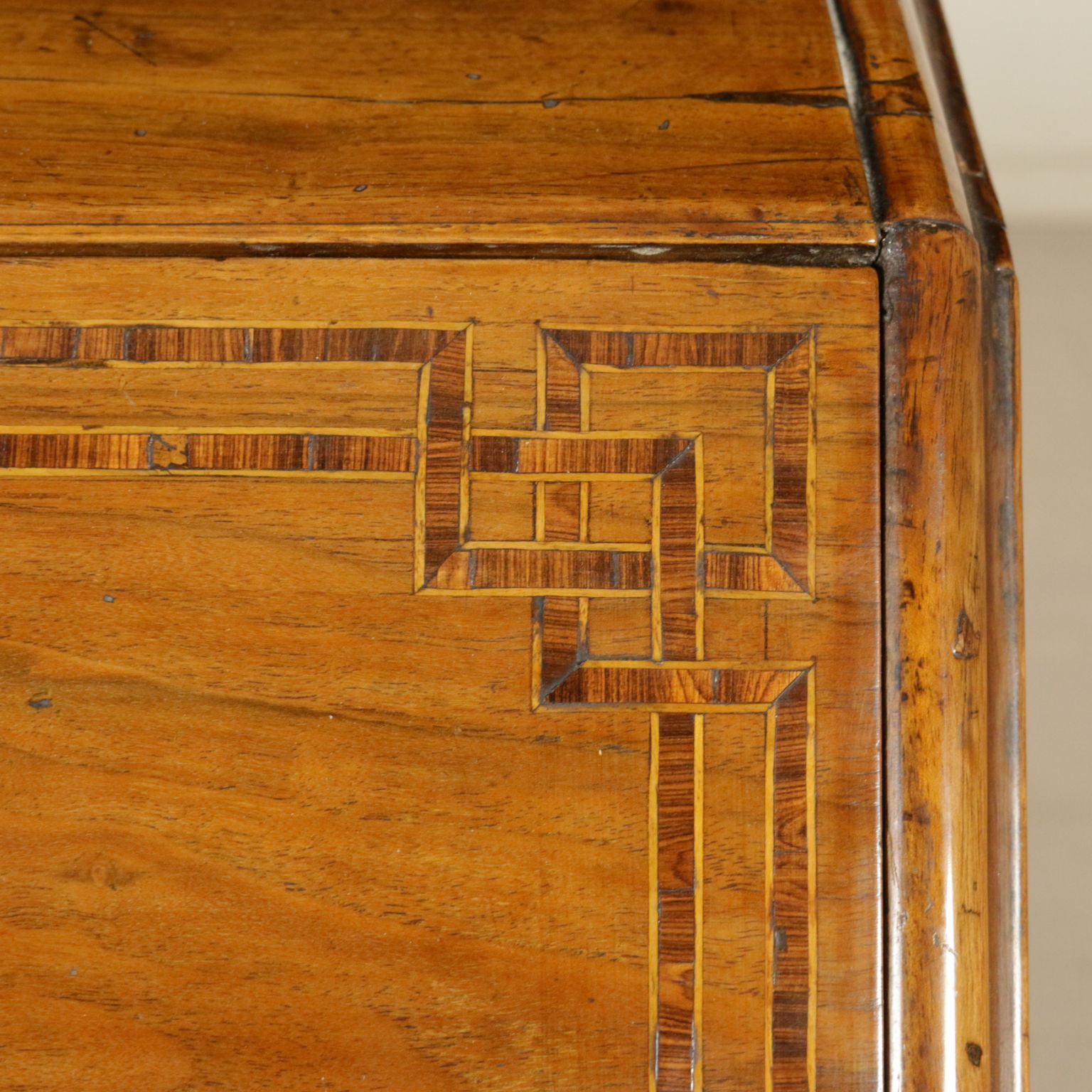 Retta da gambe troncoconiche rudentate con capitelli intagliati presenta coppia di cassetti con anta a ribalta. All'interno scarabattolo con quattro cassetti e vano a giorno. Doppia filettatura intarsiata a tappo con greche.