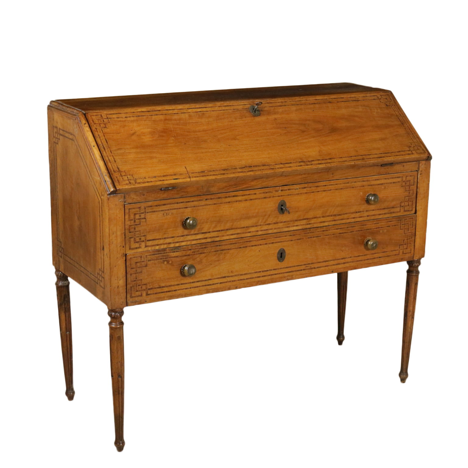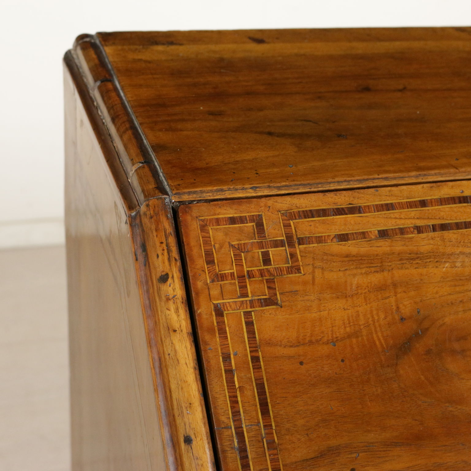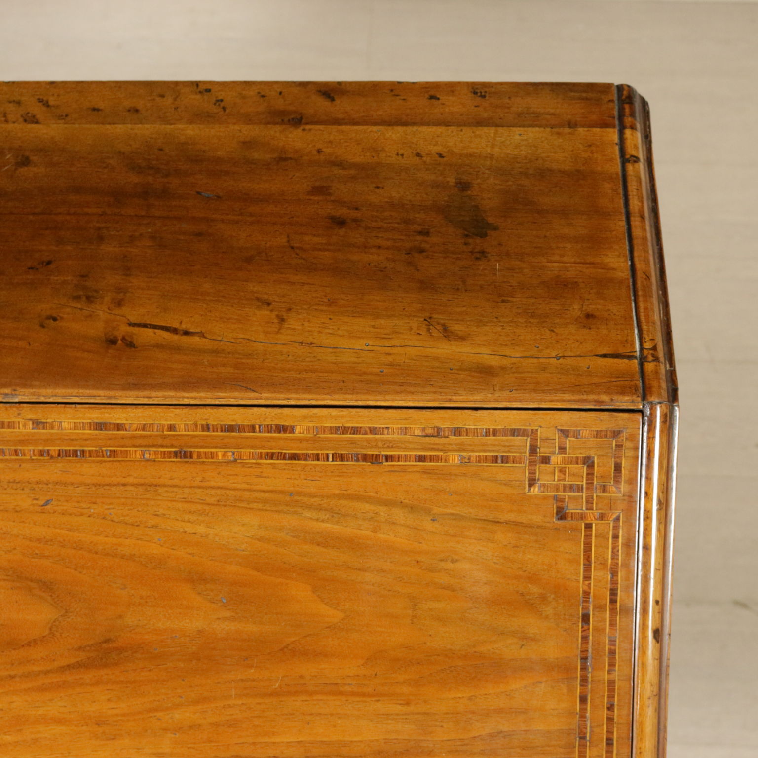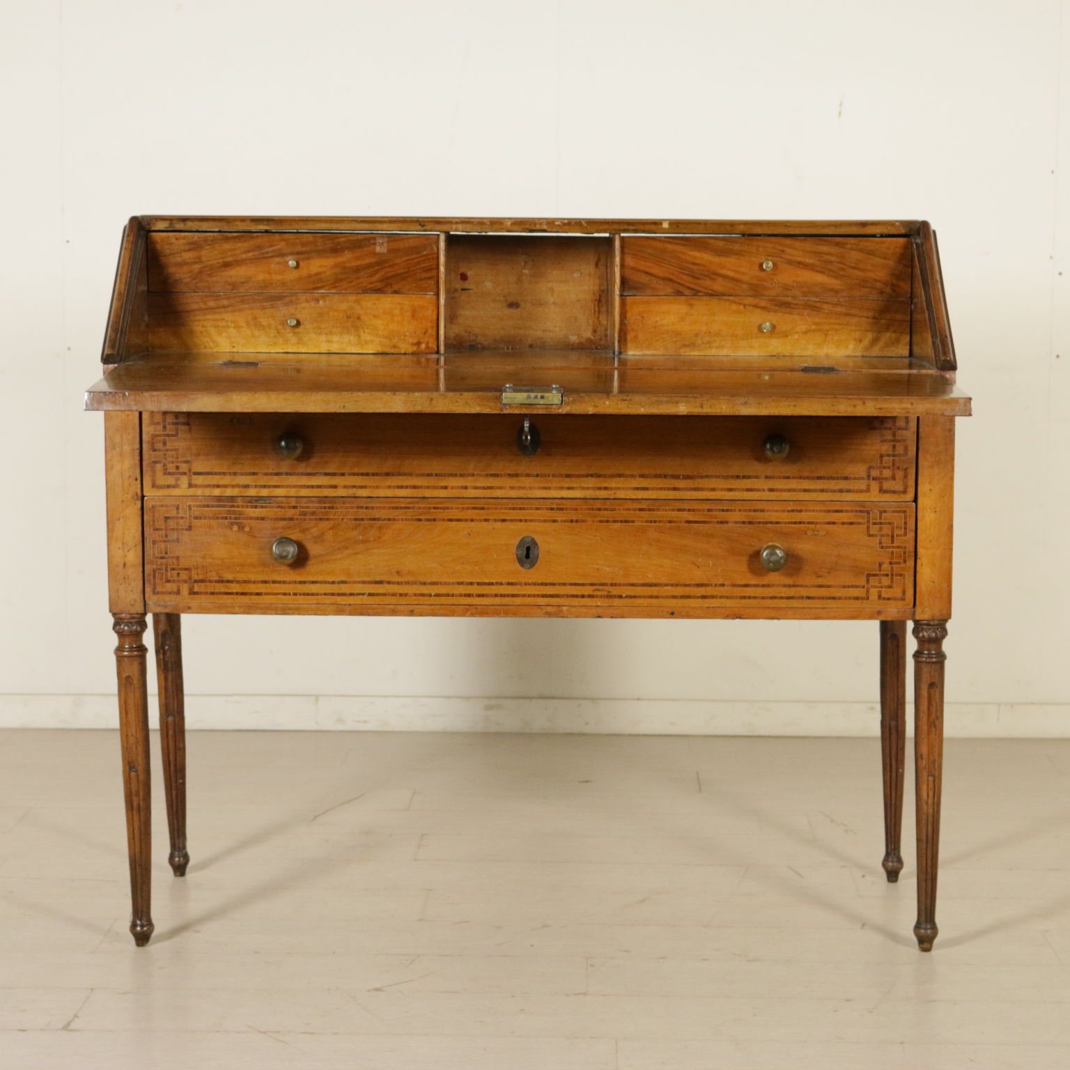 Retta da gambe troncoconiche rudentate con capitelli intagliati presenta coppia di cassetti con anta a ribalta. All'interno scarabattolo con quattro cassetti e vano a giorno. Doppia filettatura intarsiata a tappo con greche.