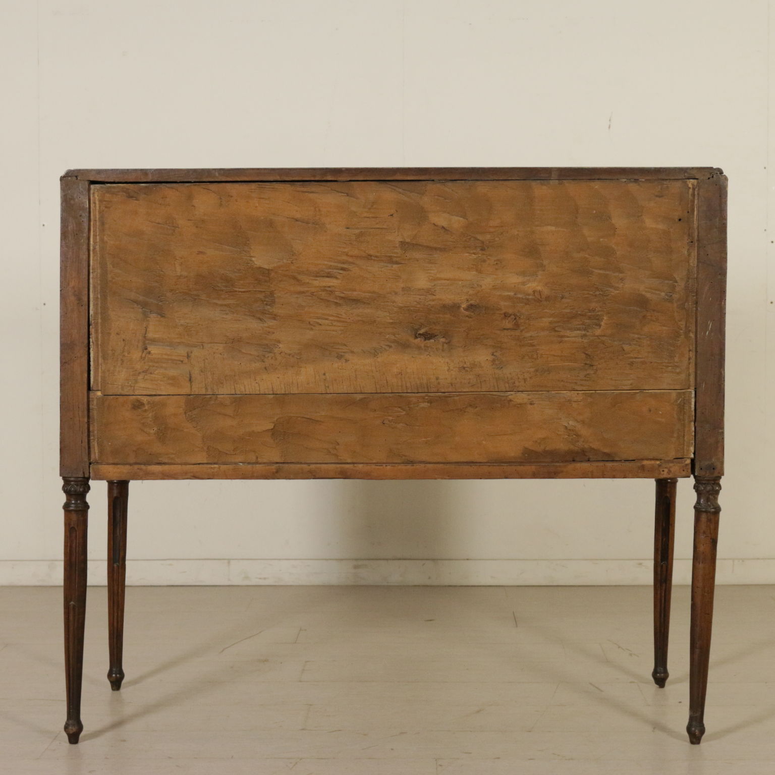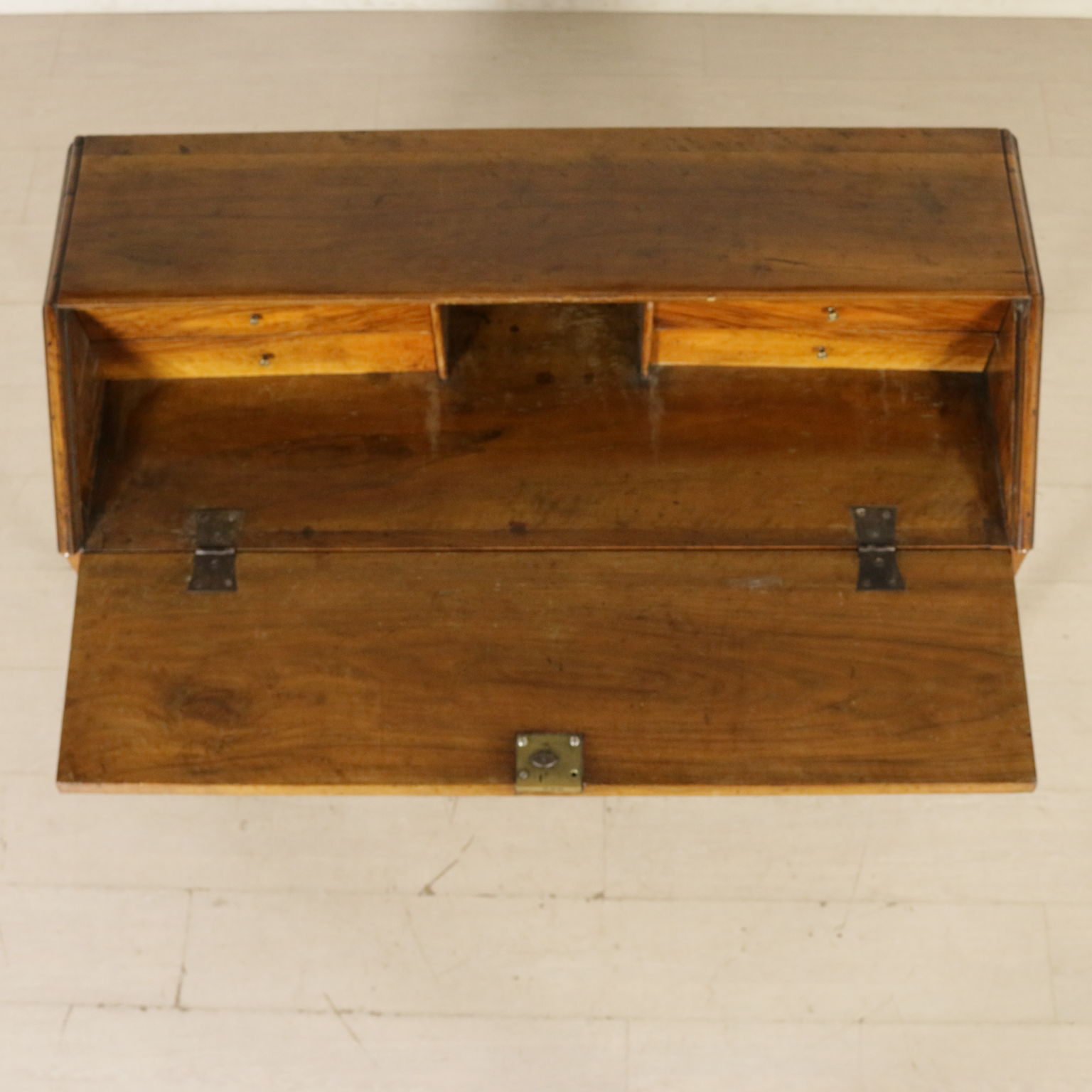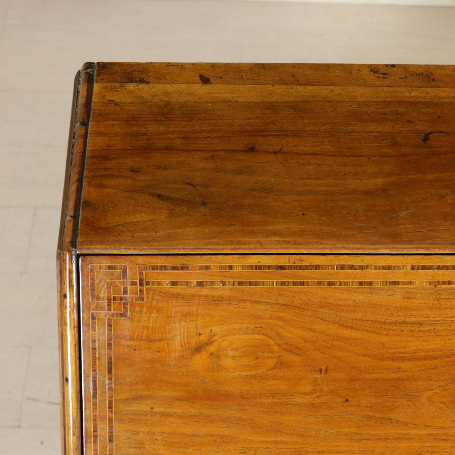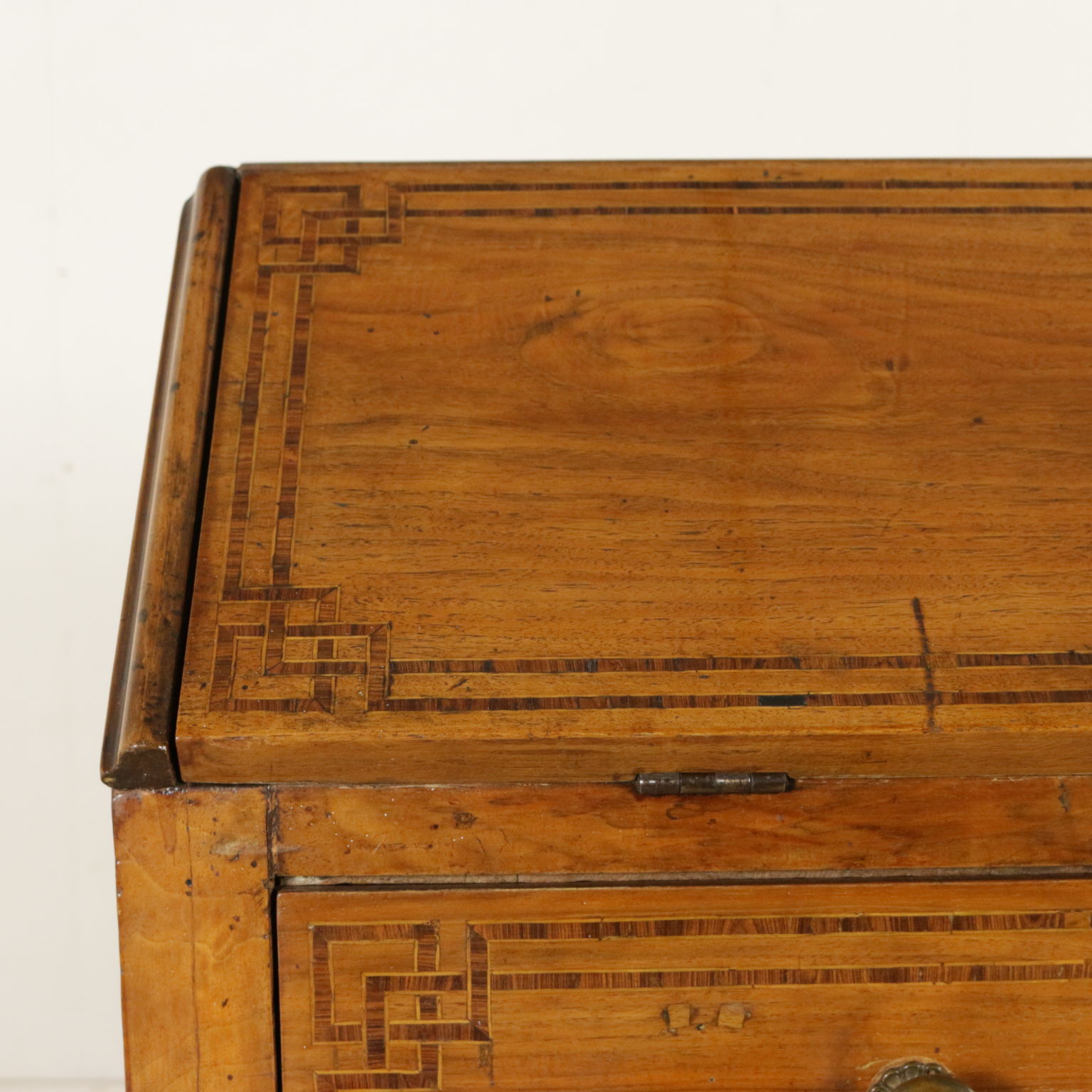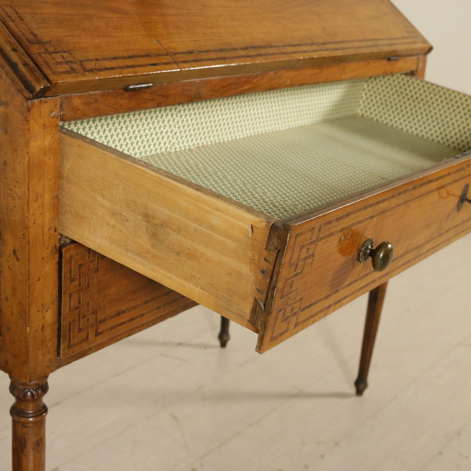 Retta da gambe troncoconiche rudentate con capitelli intagliati presenta coppia di cassetti con anta a ribalta. All'interno scarabattolo con quattro cassetti e vano a giorno. Doppia filettatura intarsiata a tappo con greche.